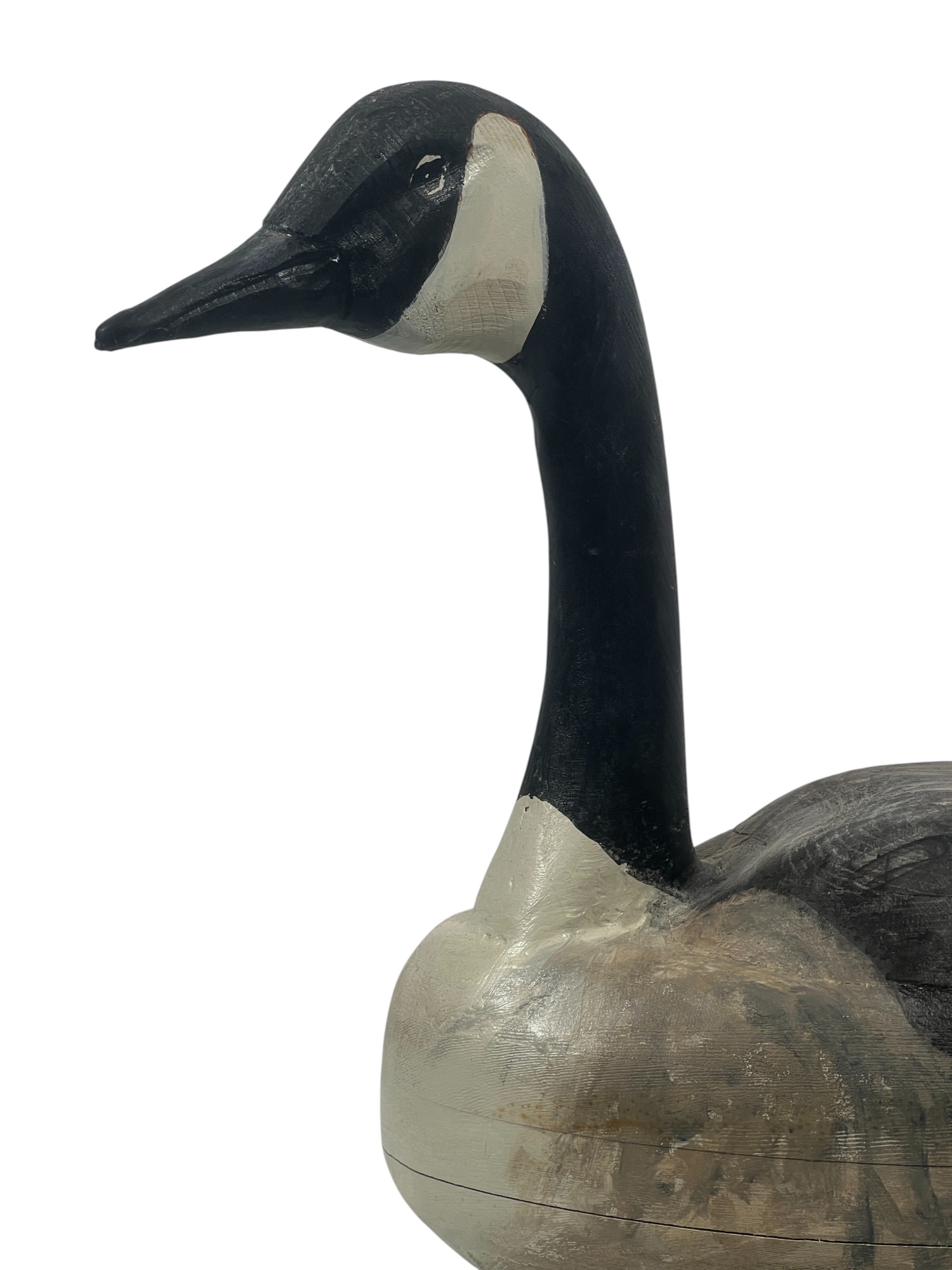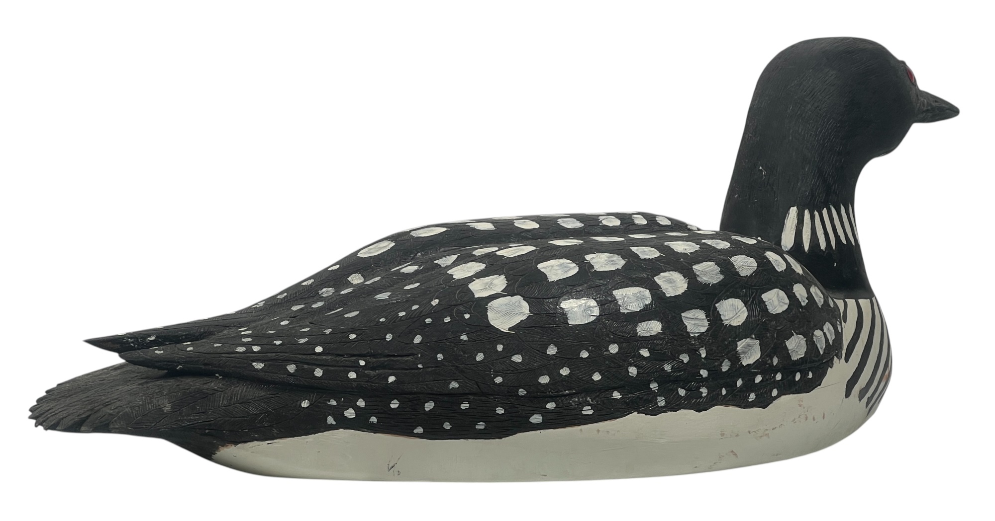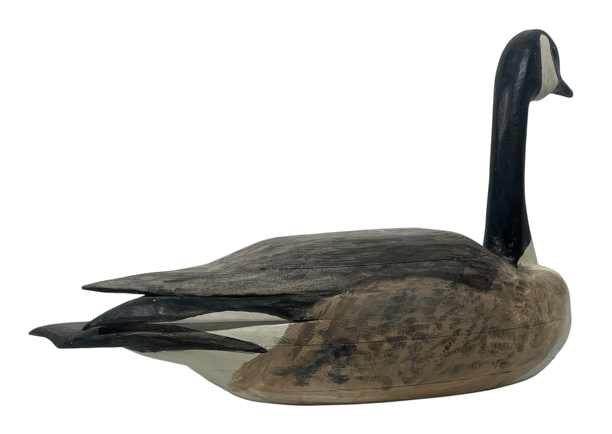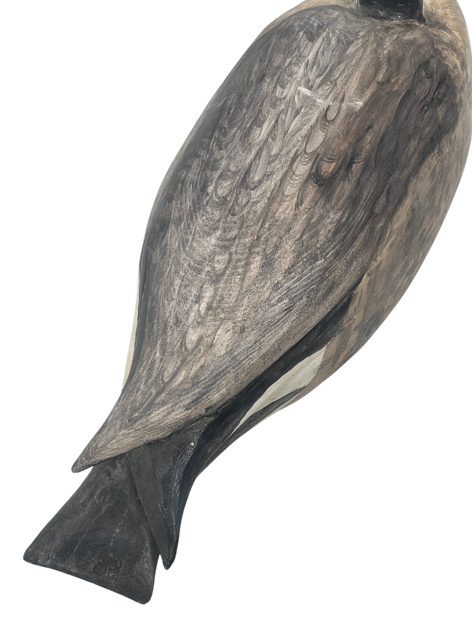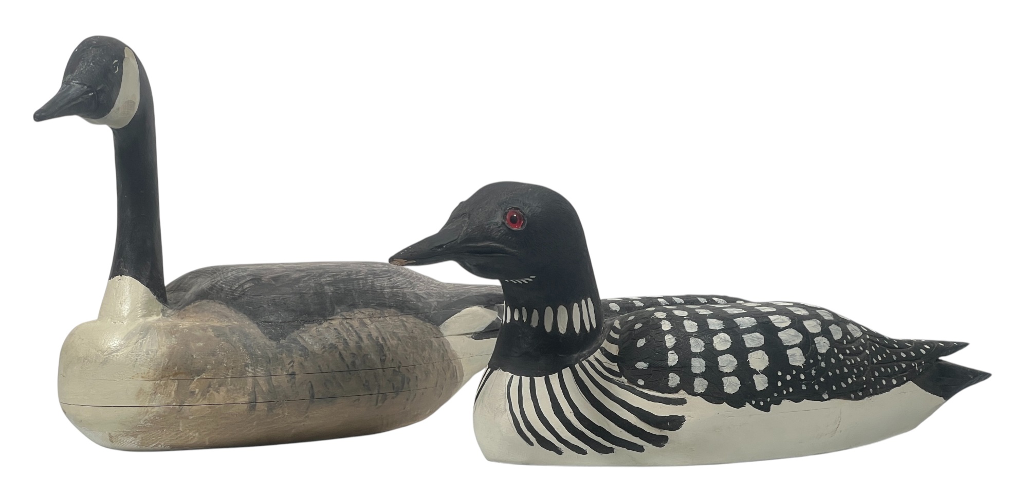 Carved & painted Canada goose signed & personalized under base. Along with a large carved & painted Common loon. 12 x 6 x 21 inches. Condition: Loss to loon bill. Temp No 8752