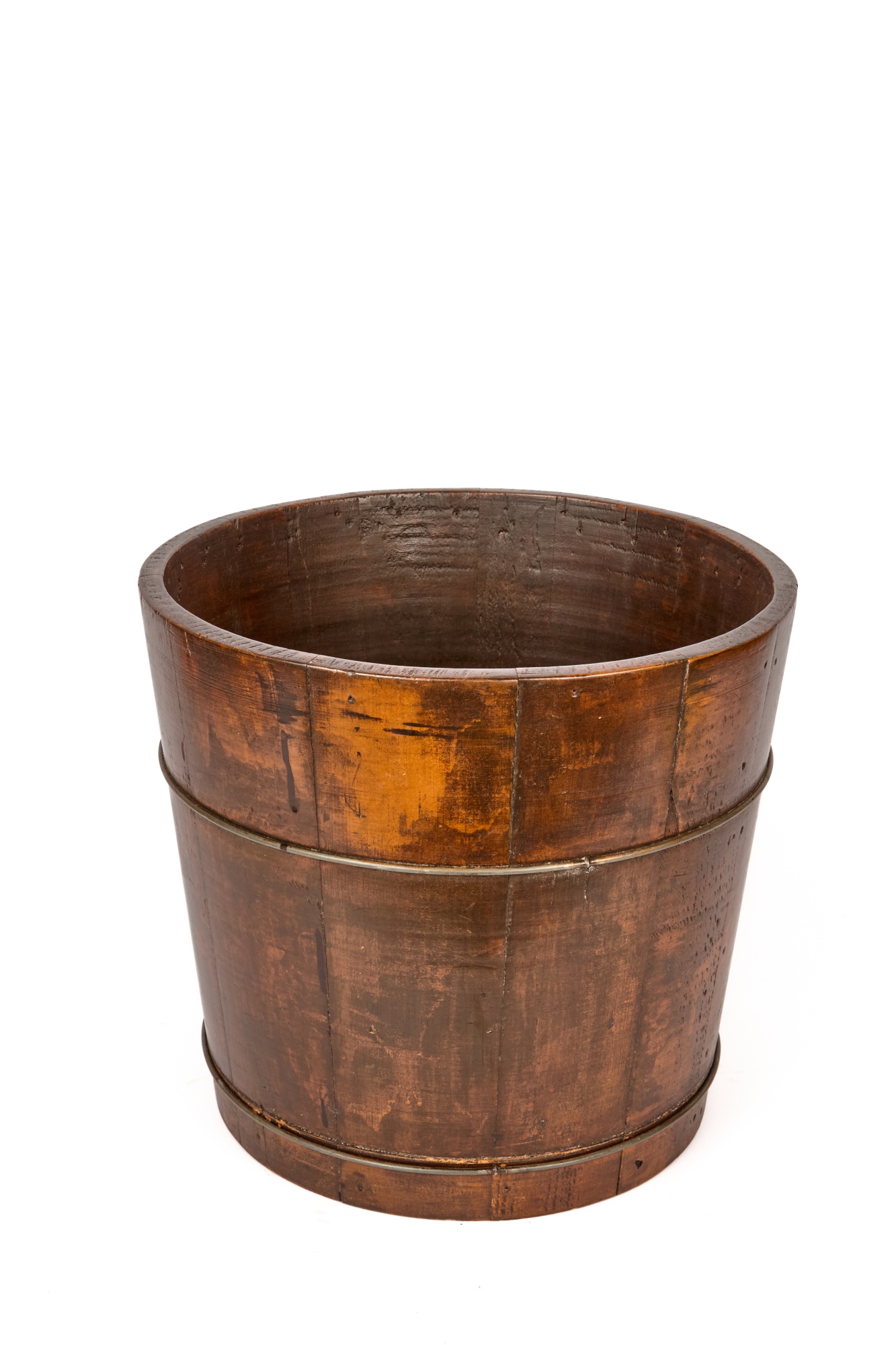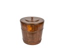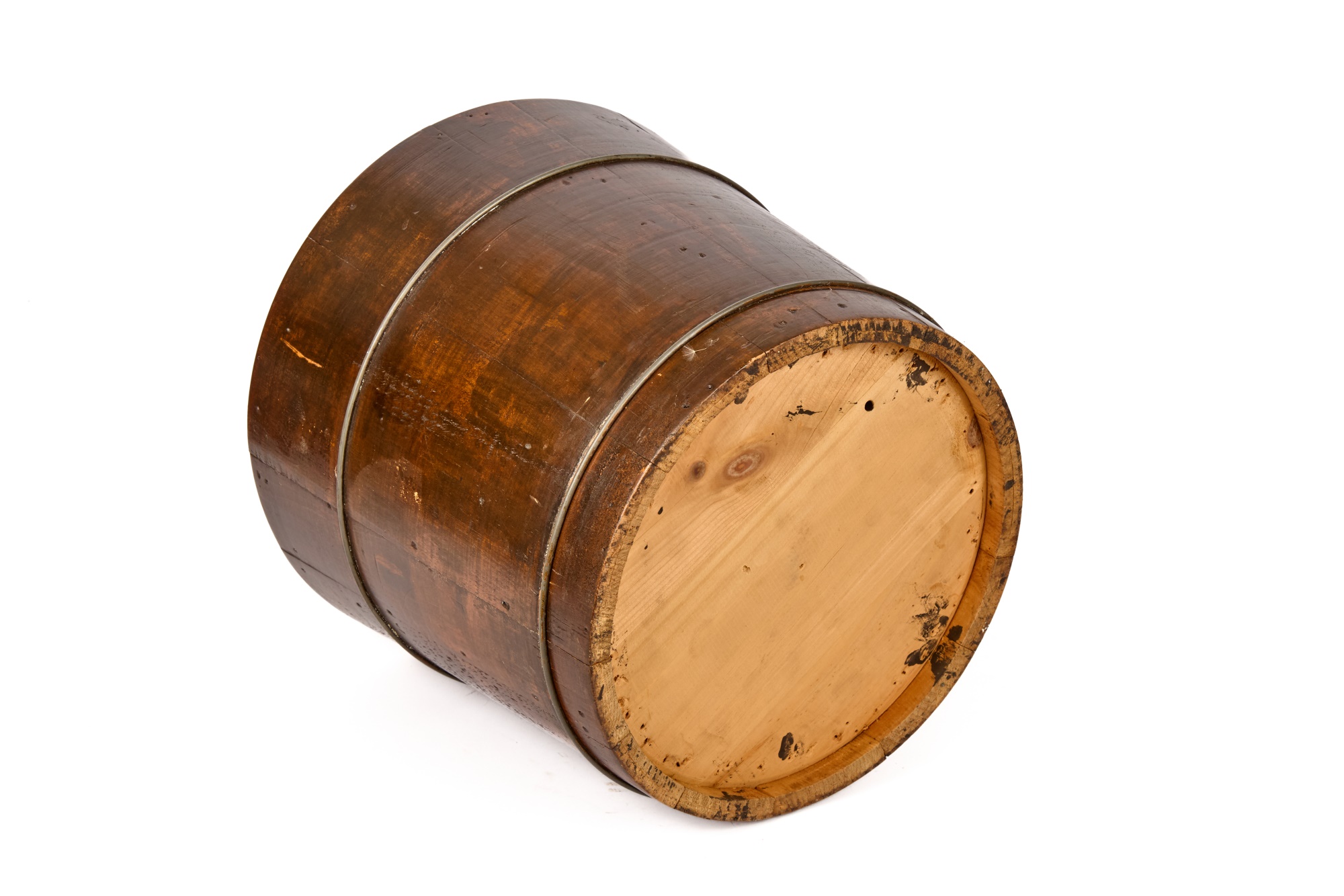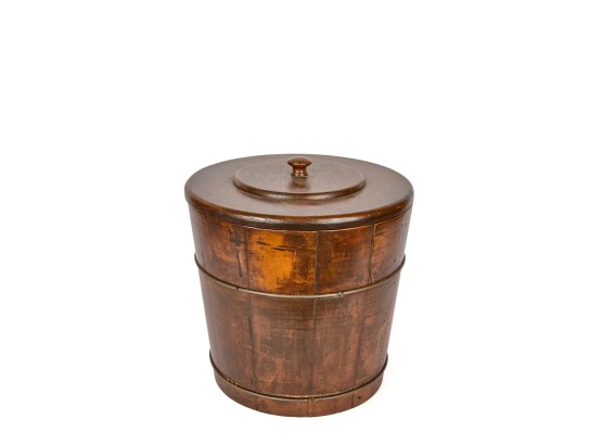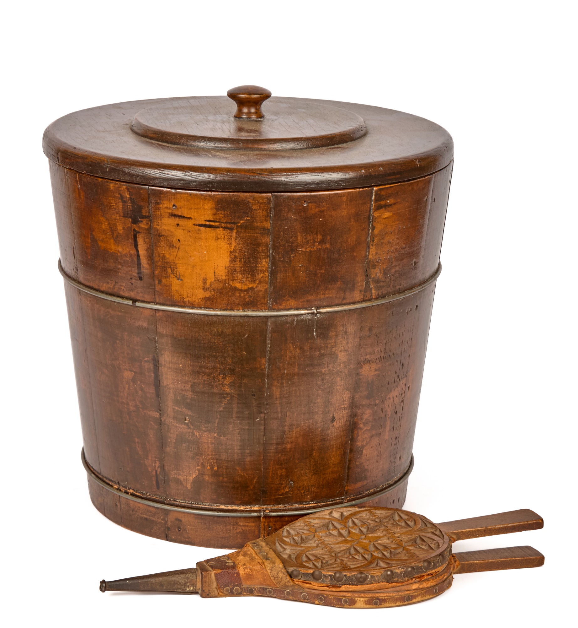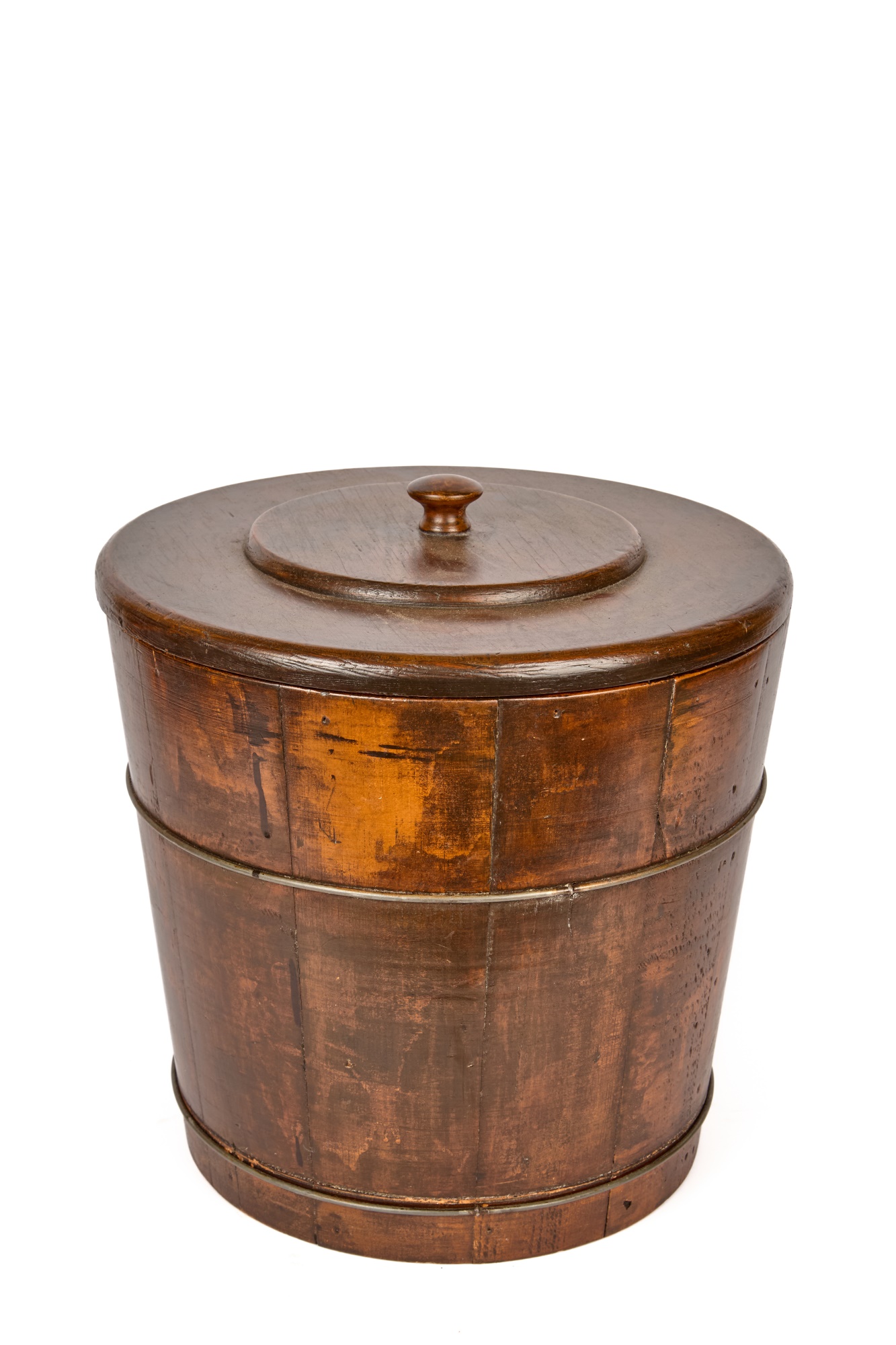 Bucket with lid is of pipe stave construction. 14 x 14 inches and 15 inches Condition: Bellow's leather has failed Temp No 6070