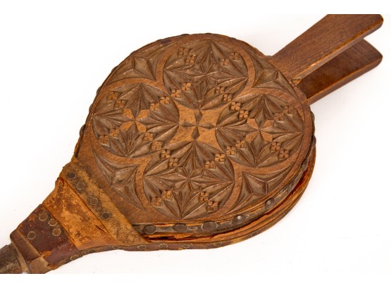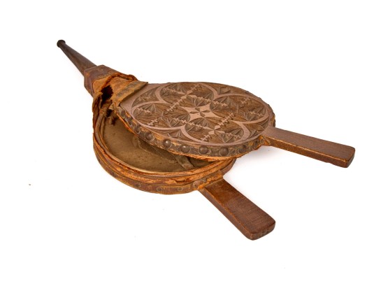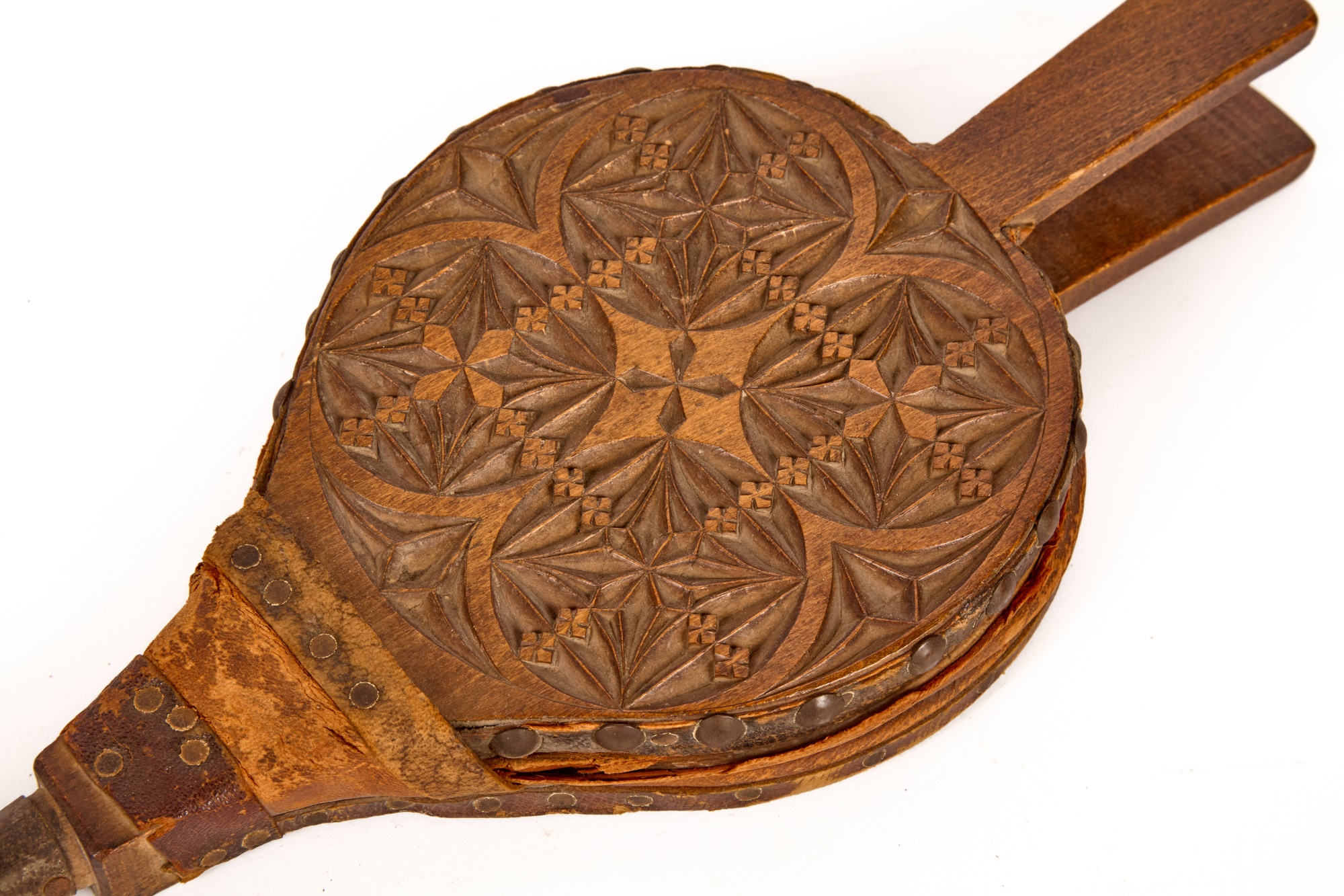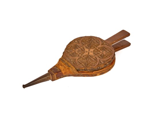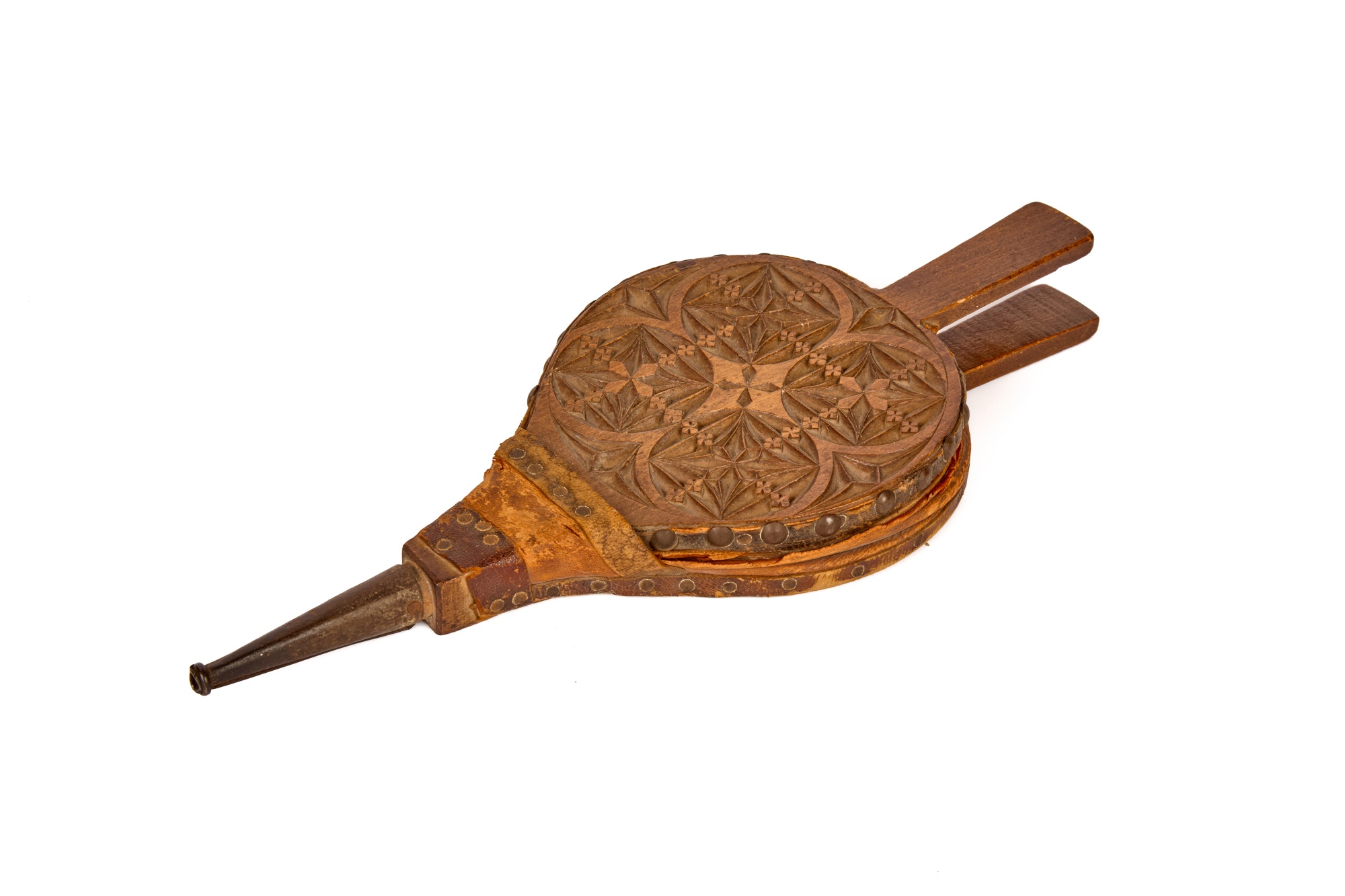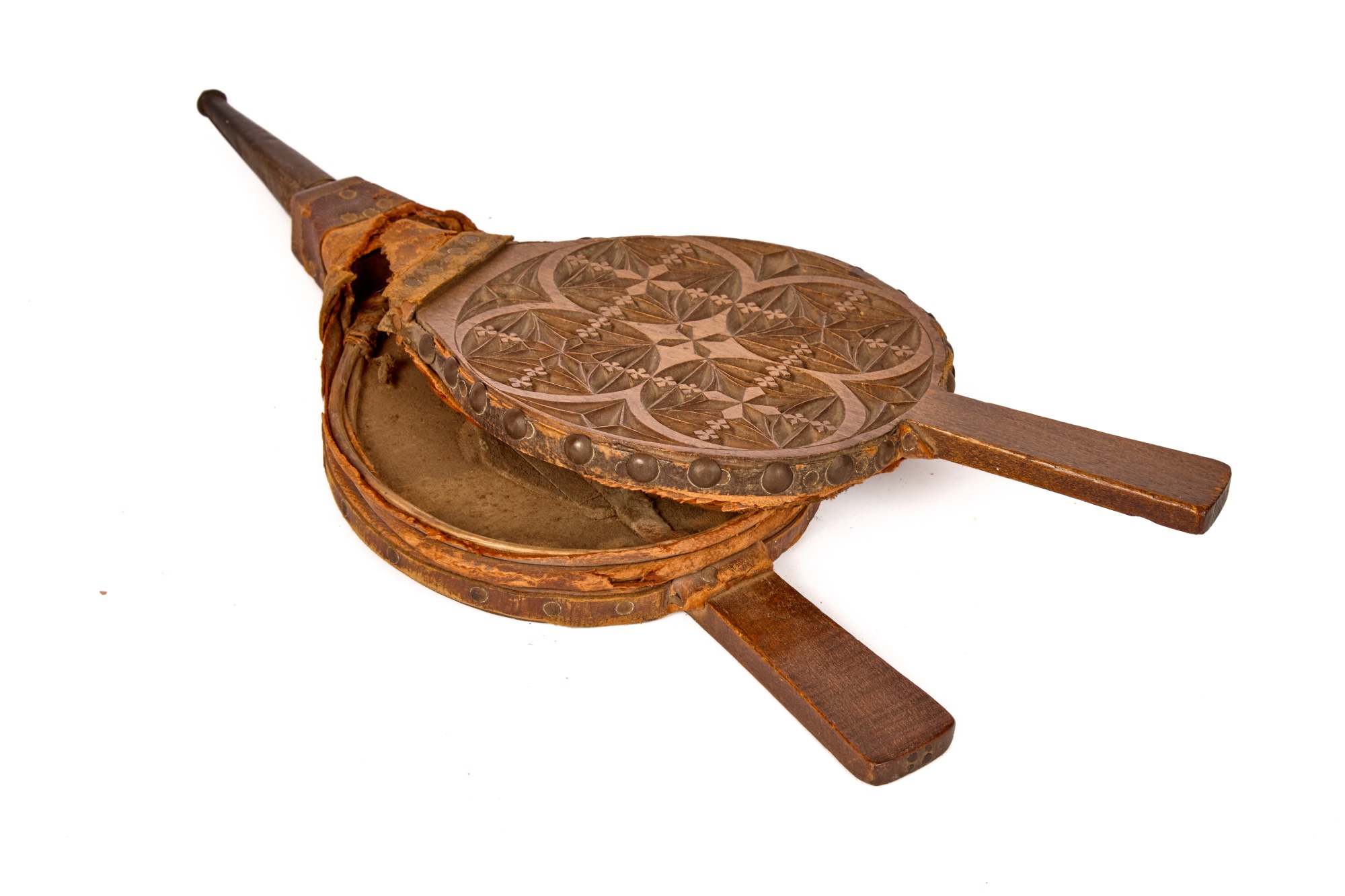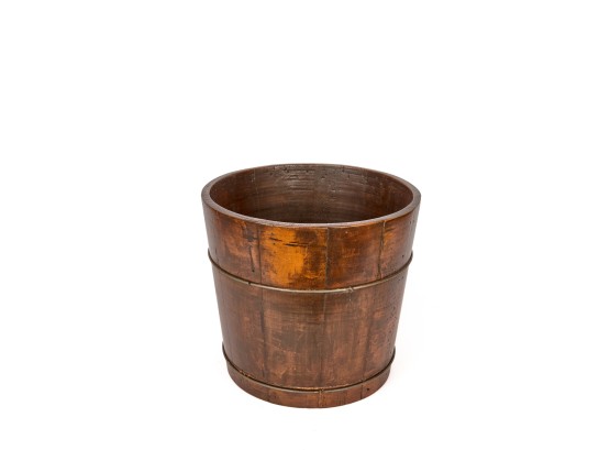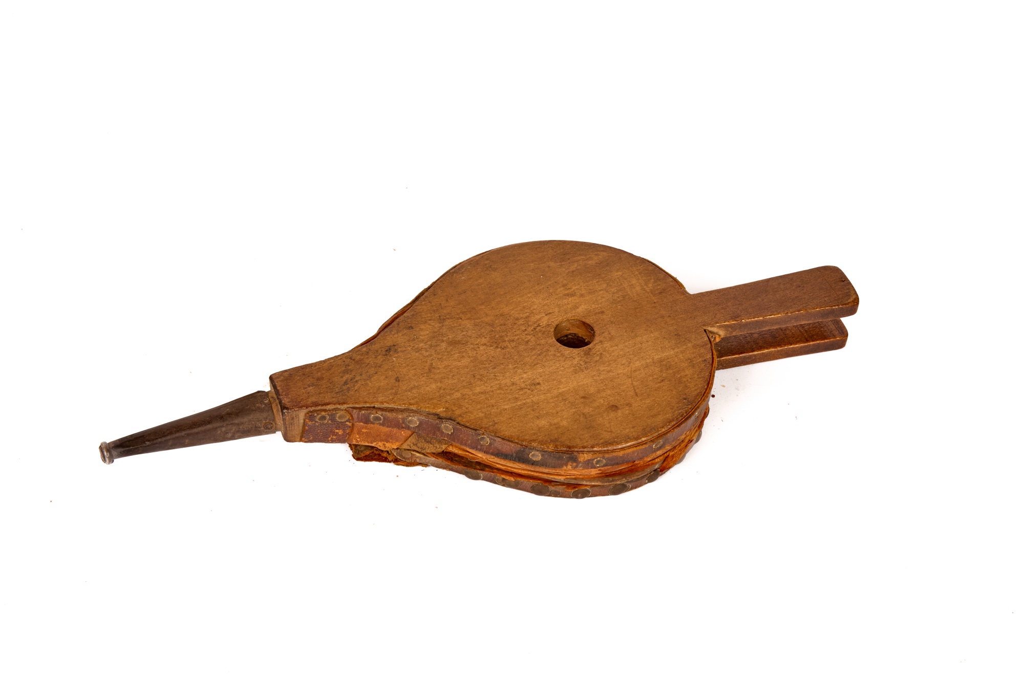 Bucket with lid is of pipe stave construction. 14 x 14 inches and 15 inches Condition: Bellow's leather has failed Temp No 6070