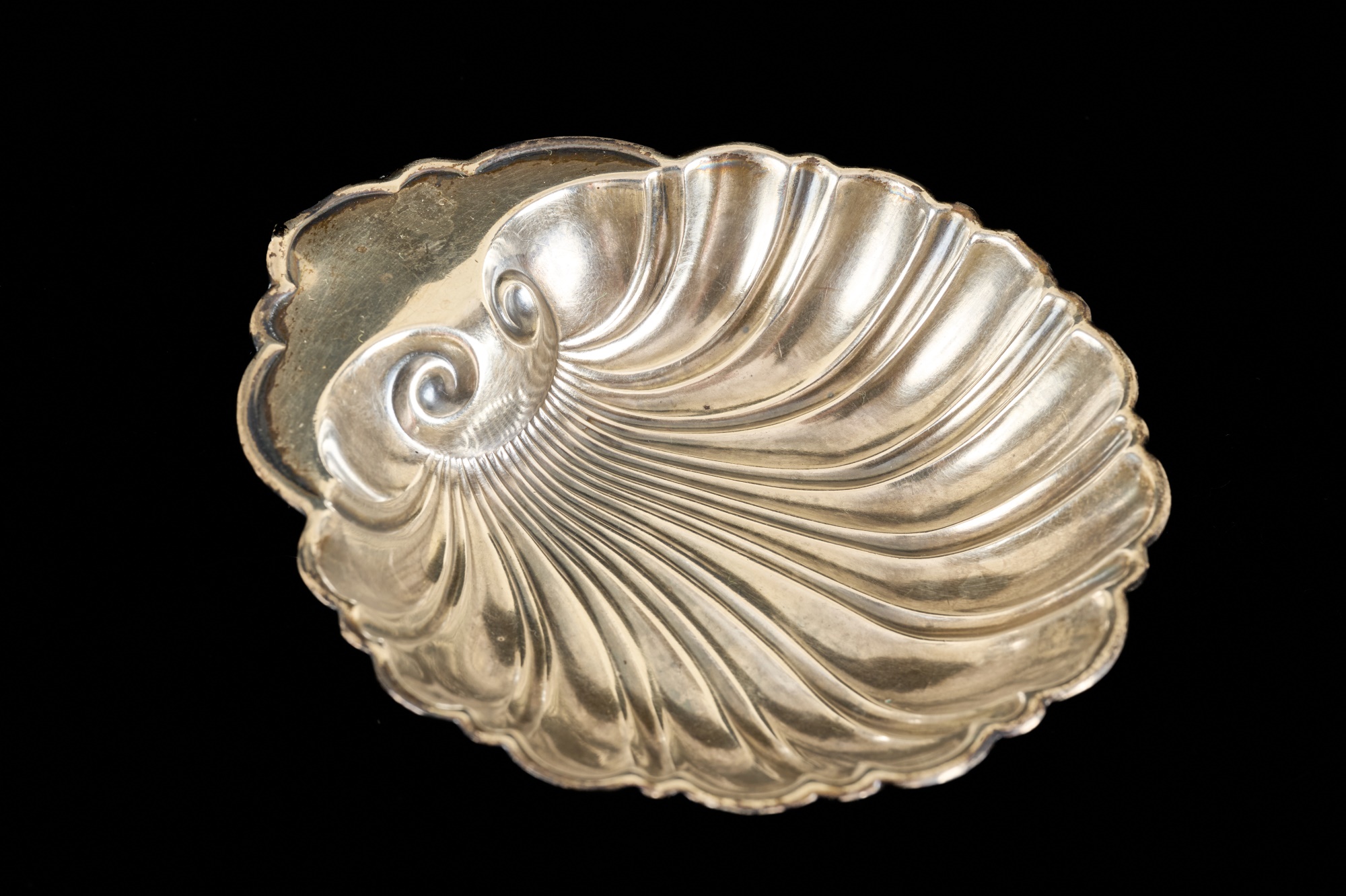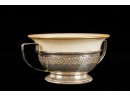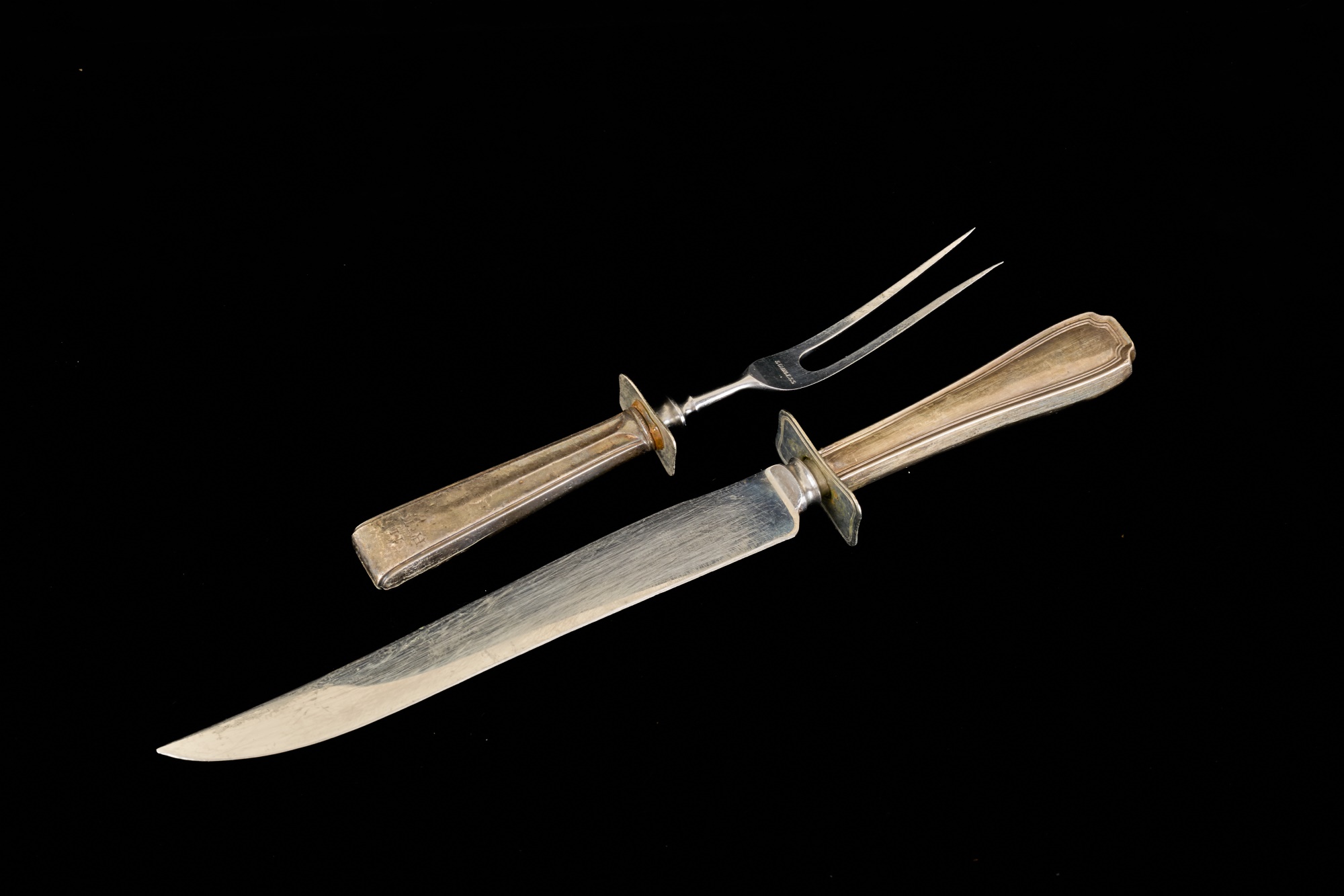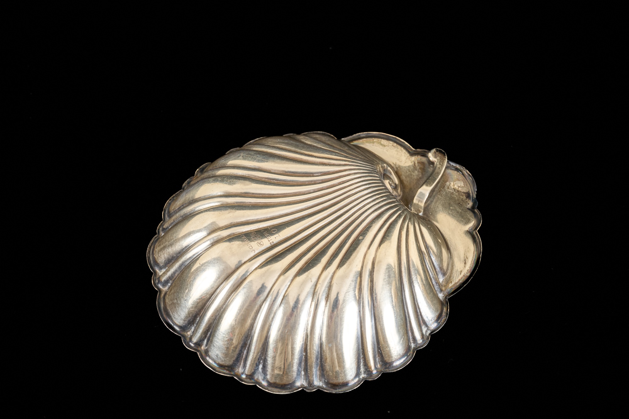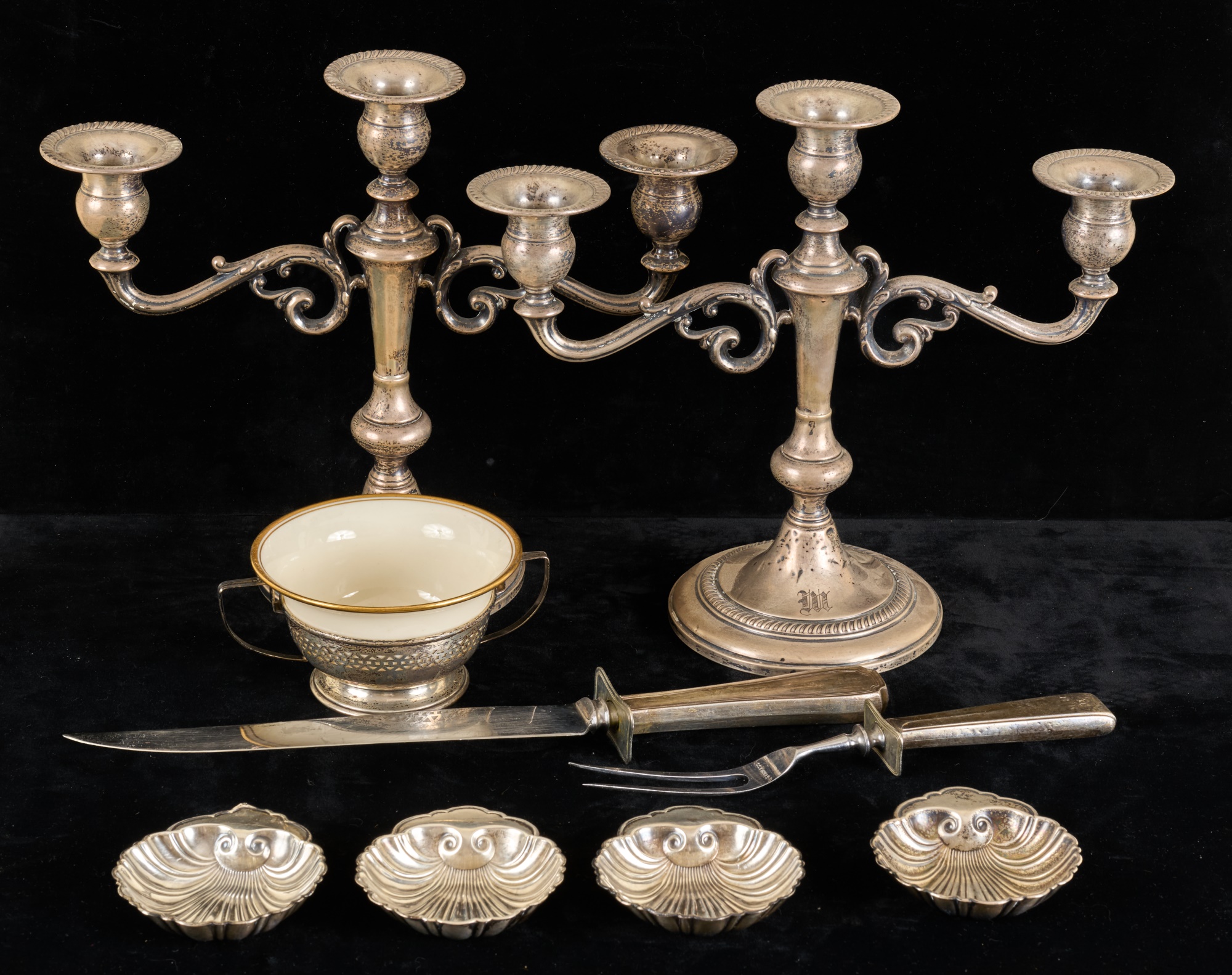 Gorham sterling scallop-form nut trays with arm for place seating card, reticulated cup holder and carving set. Weighted 9 x 11 inches. 5.3 troy ounces (not weighted) Condition: Monogramed, bends and creases to bases