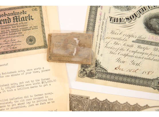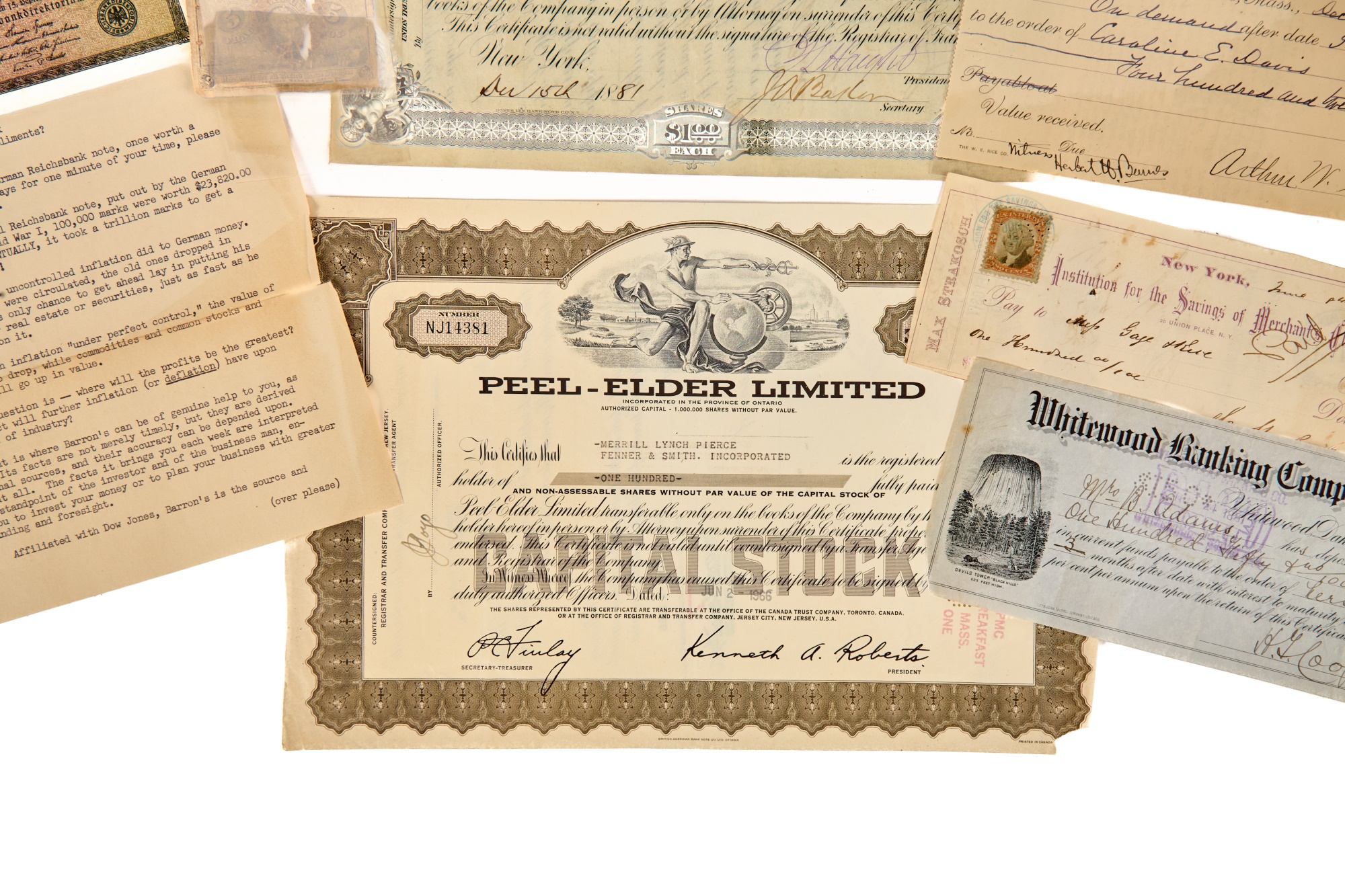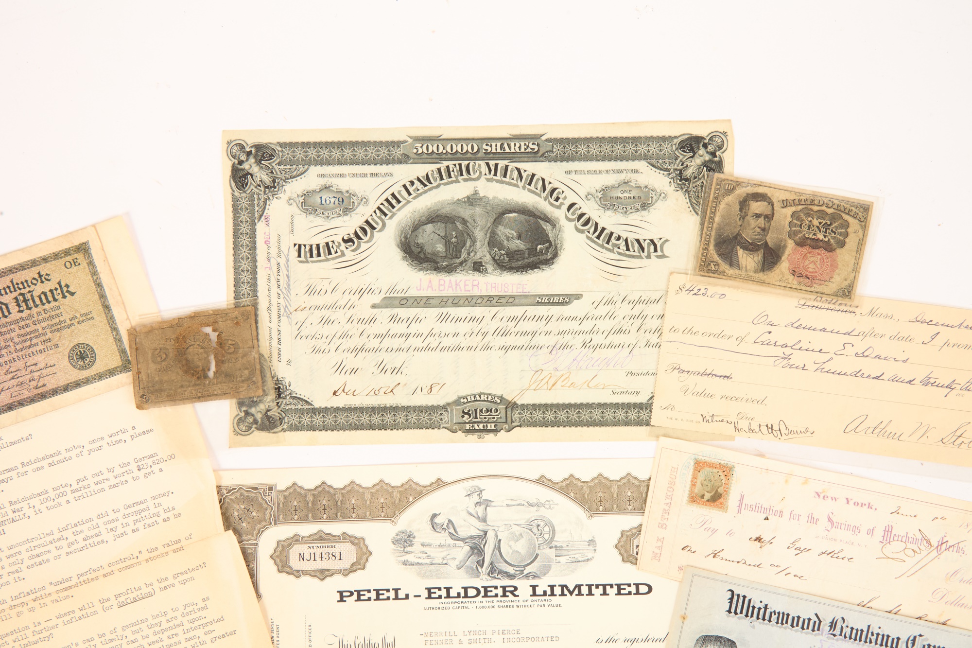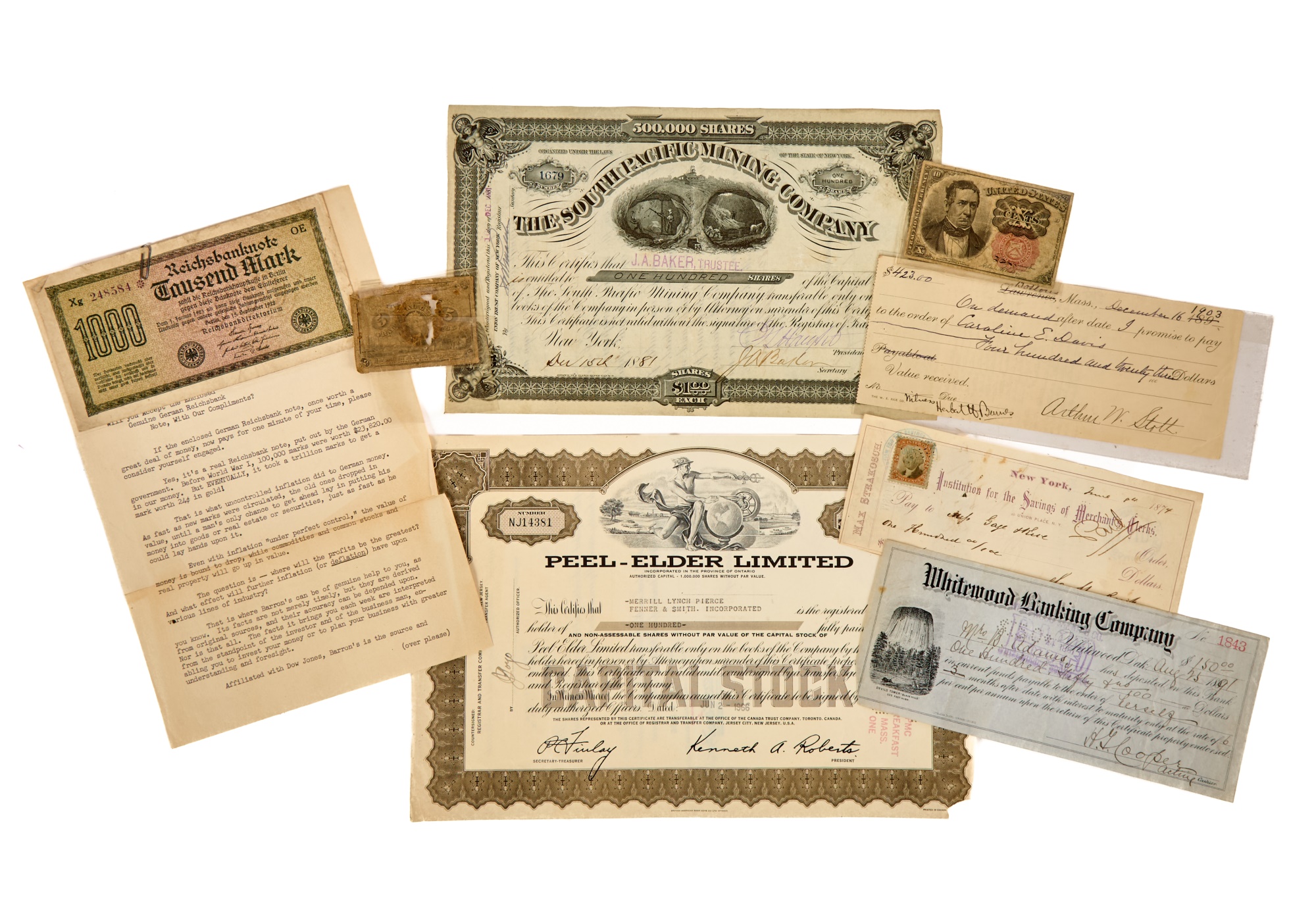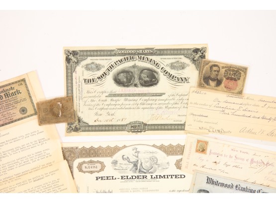 Including: 500,000 shares of 1881 South Pacific Mining Company, 100 share of 1868 Peel-Elder Limited, (3) Checks, (2) fractional currency notes and a 1922 Tausend Mark