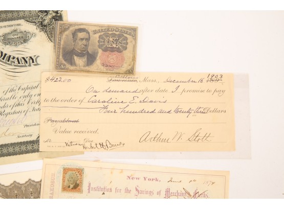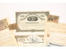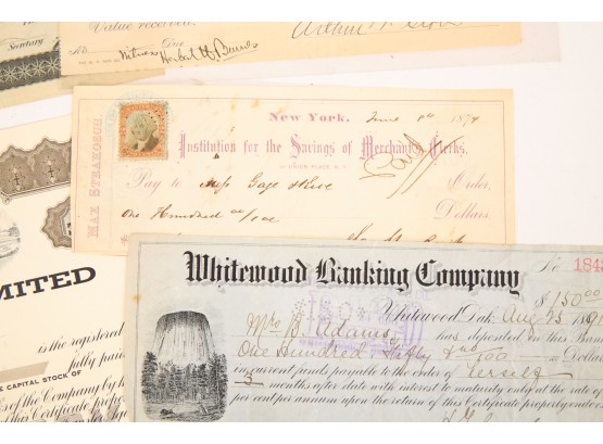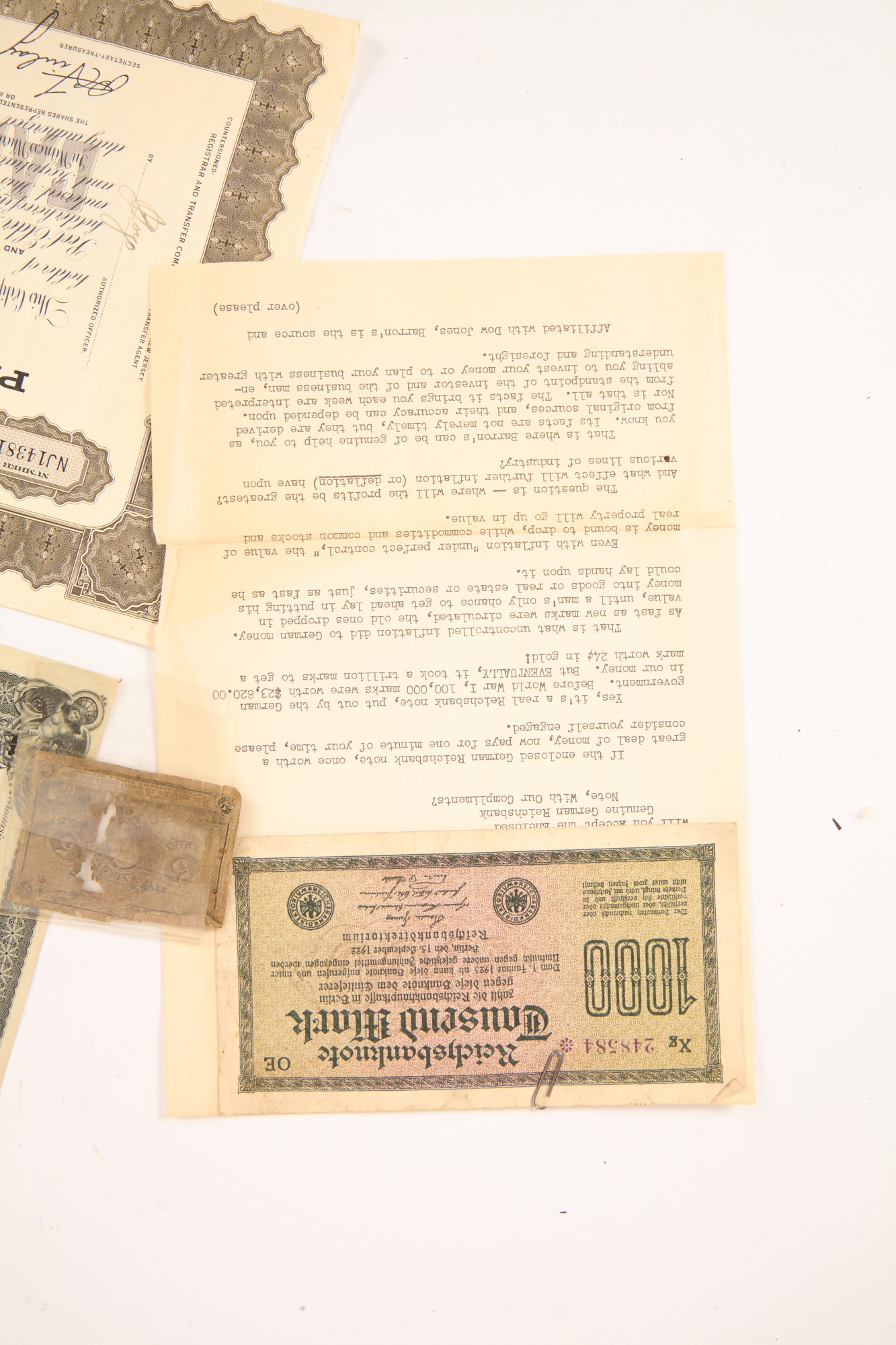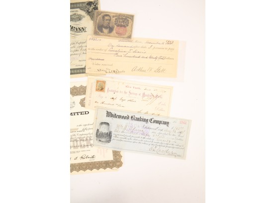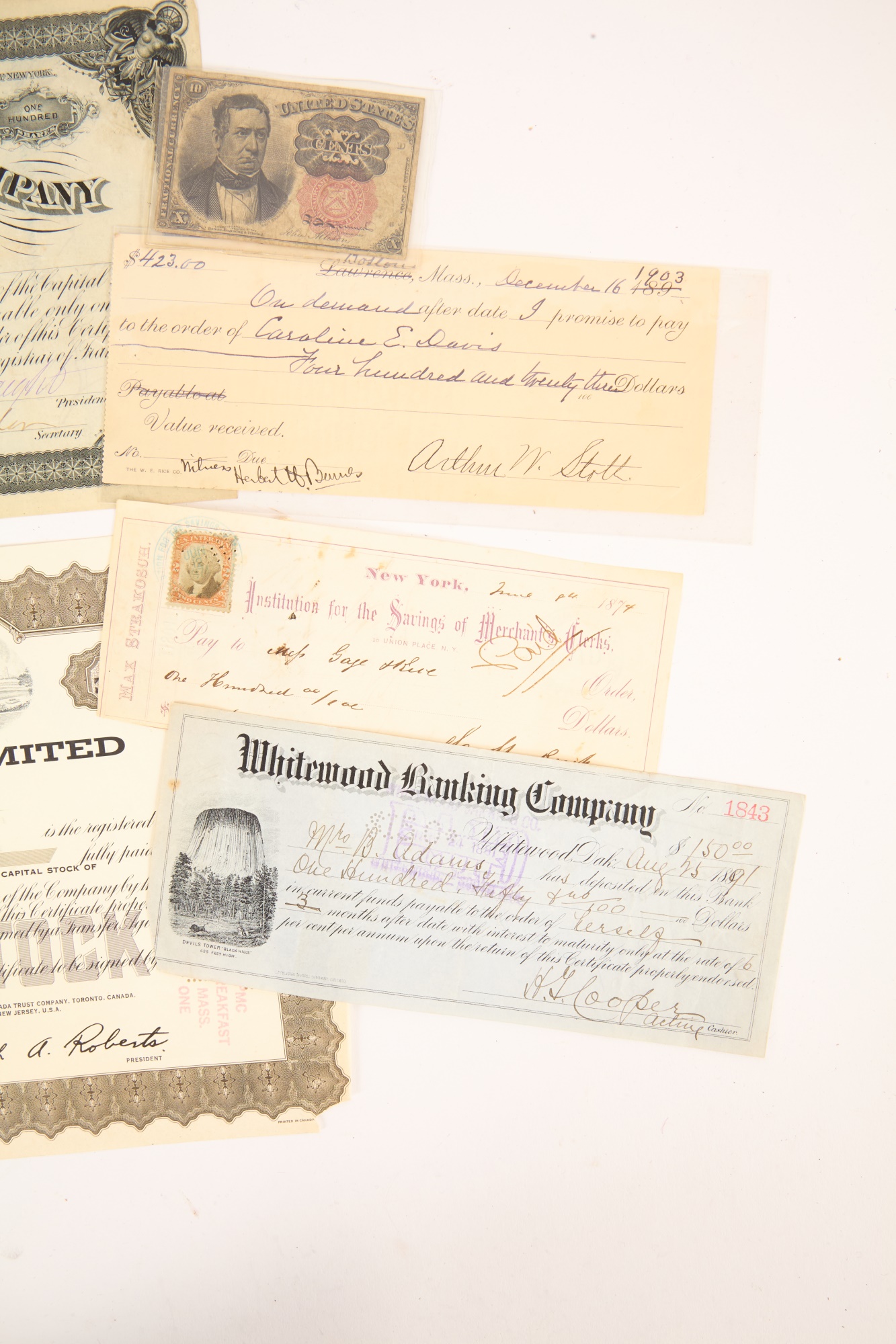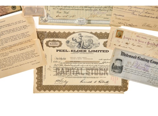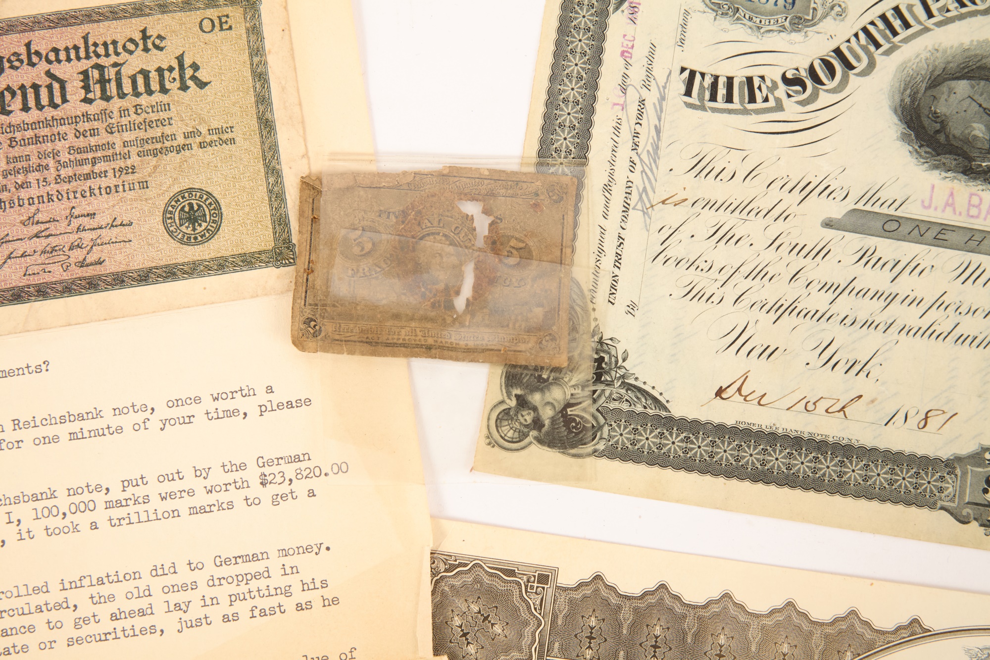 Including: 500,000 shares of 1881 South Pacific Mining Company, 100 share of 1868 Peel-Elder Limited, (3) Checks, (2) fractional currency notes and a 1922 Tausend Mark