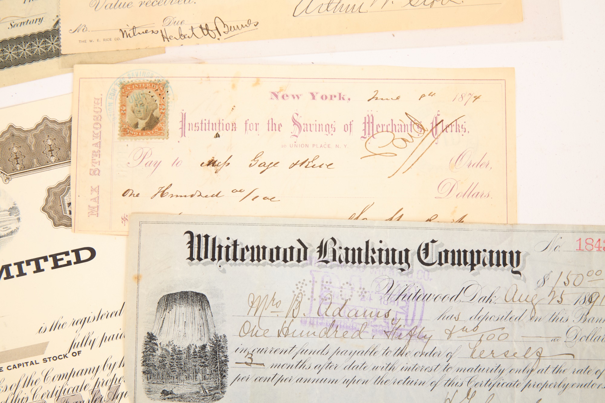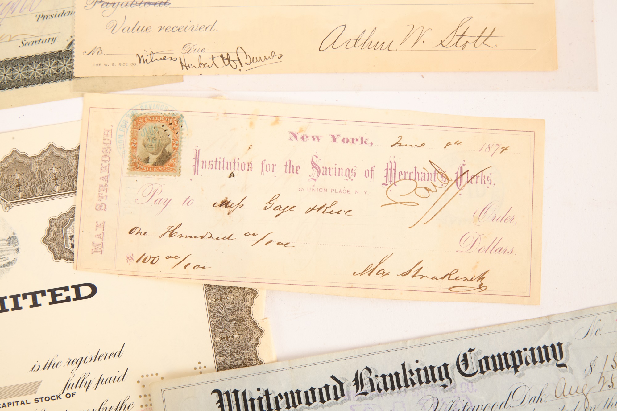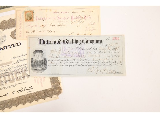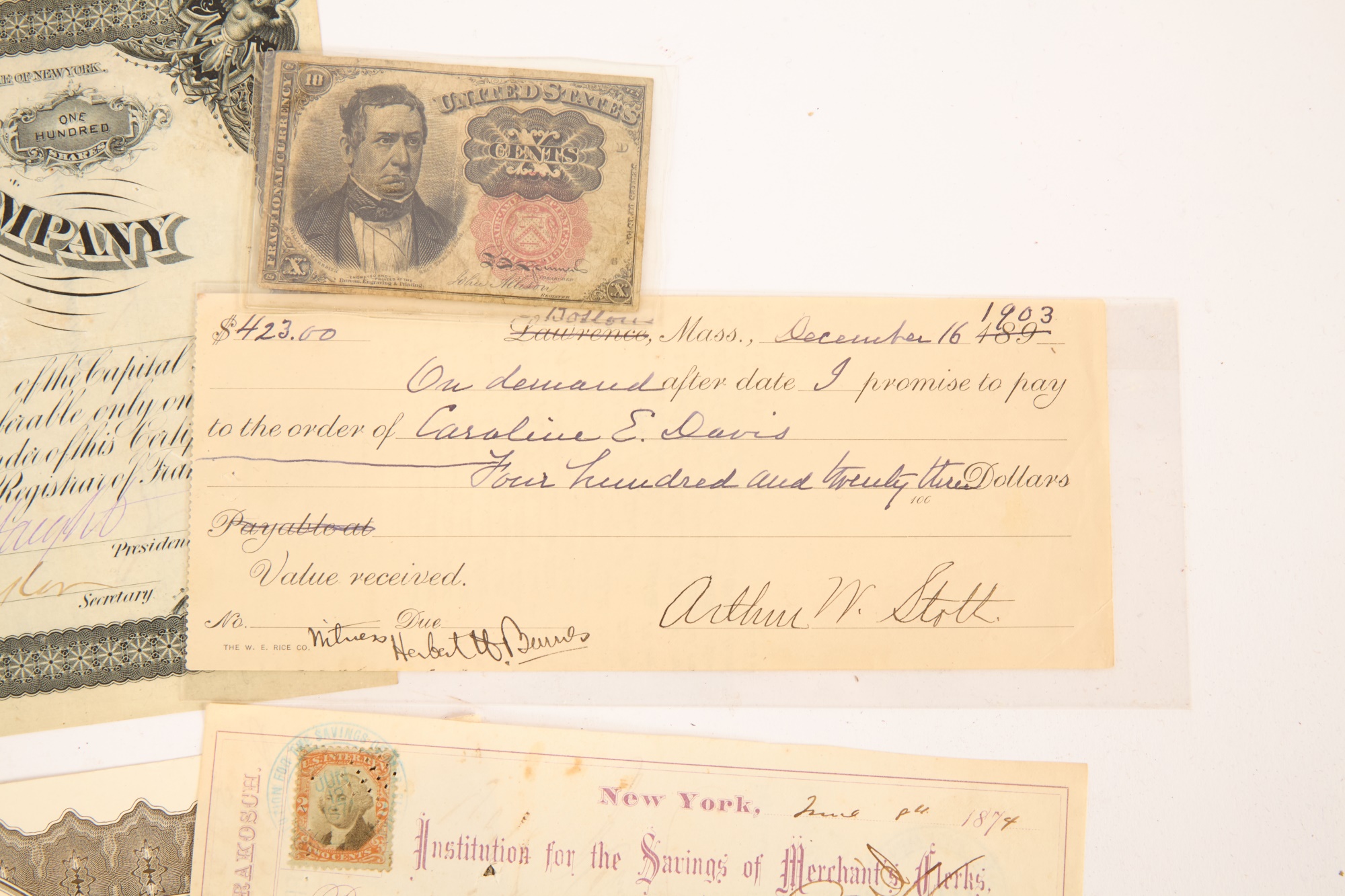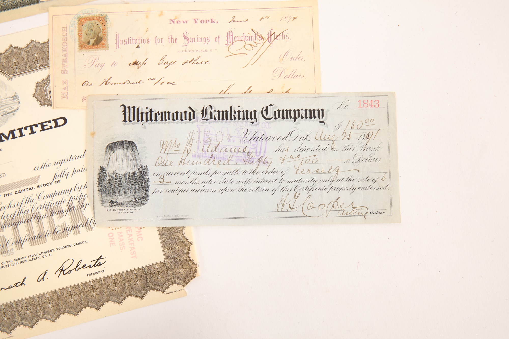 Including: 500,000 shares of 1881 South Pacific Mining Company, 100 share of 1868 Peel-Elder Limited, (3) Checks, (2) fractional currency notes and a 1922 Tausend Mark