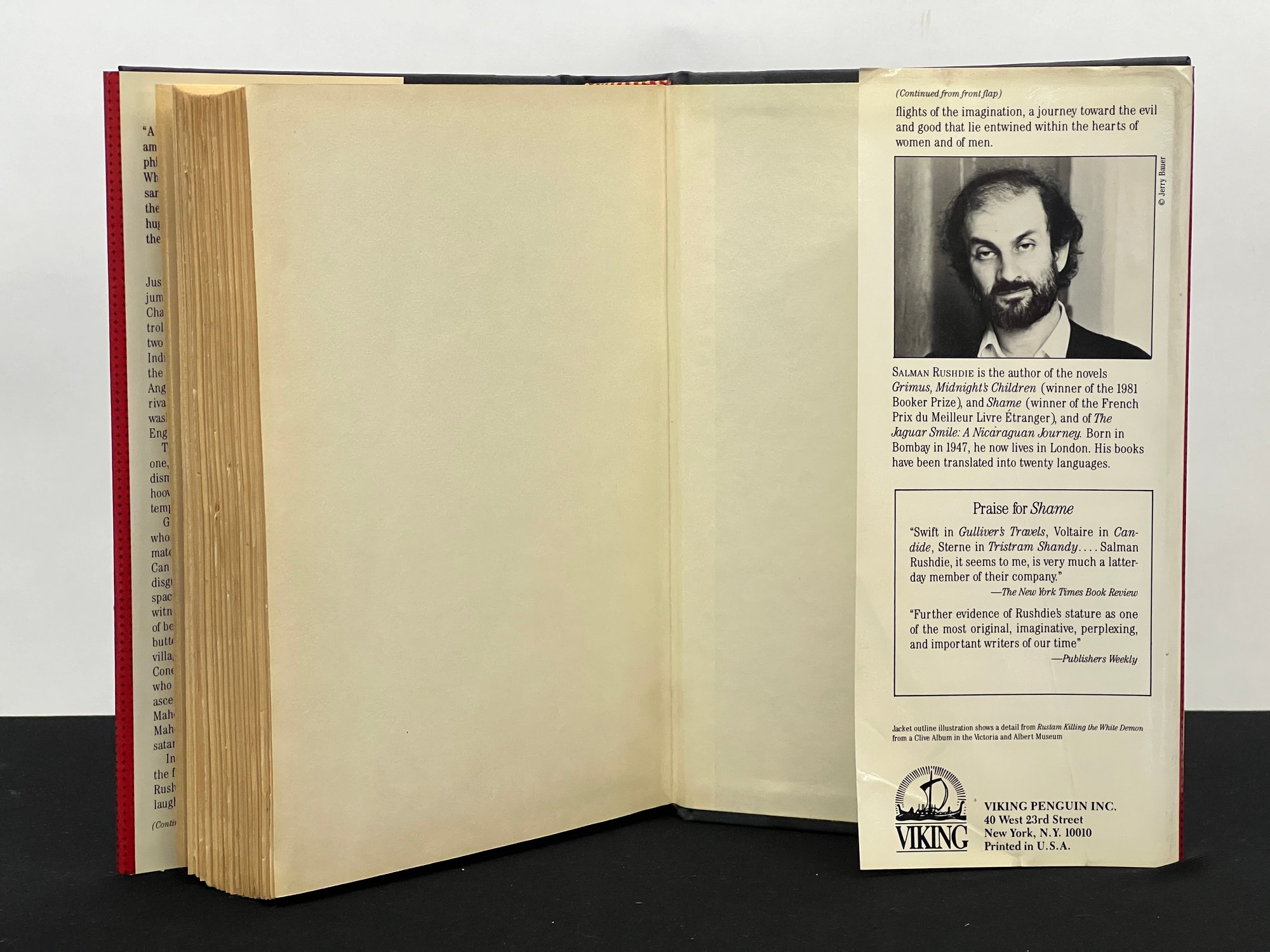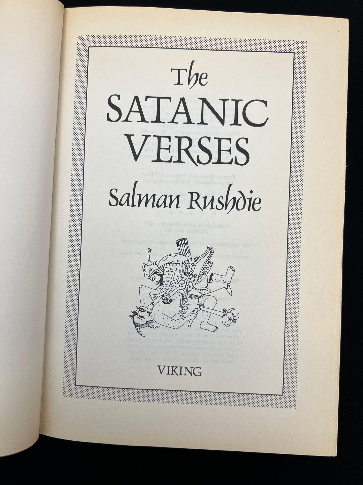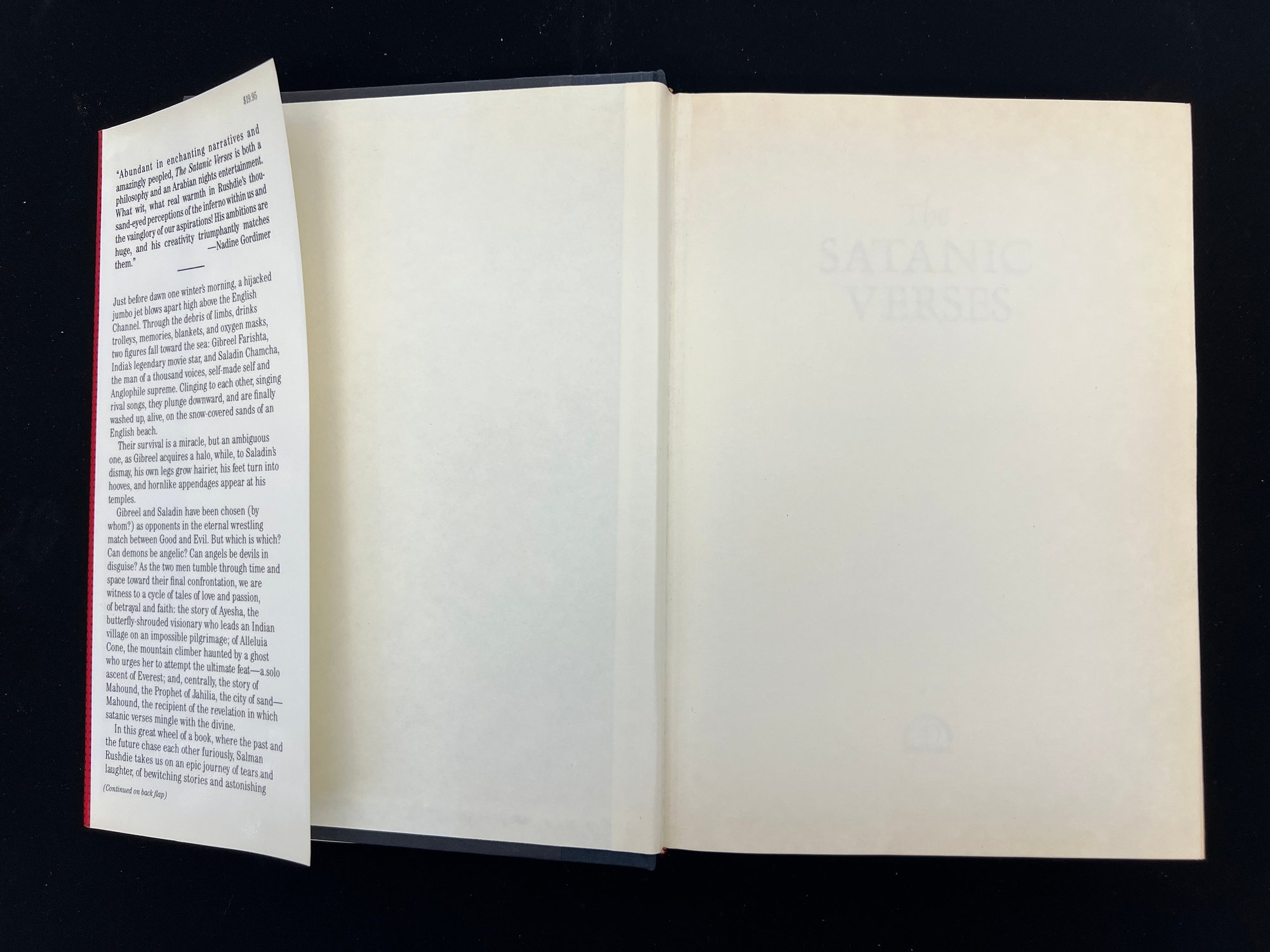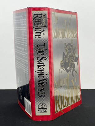 1st U.S. Edition of "The Satanic Verses" by Salman Rushdie with original dust jacket. 9 1/4 x 6 1/2 inches.