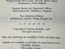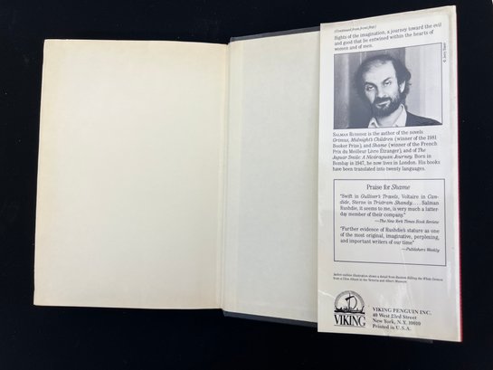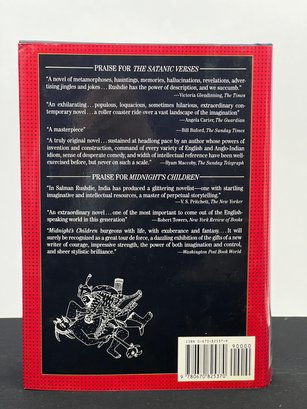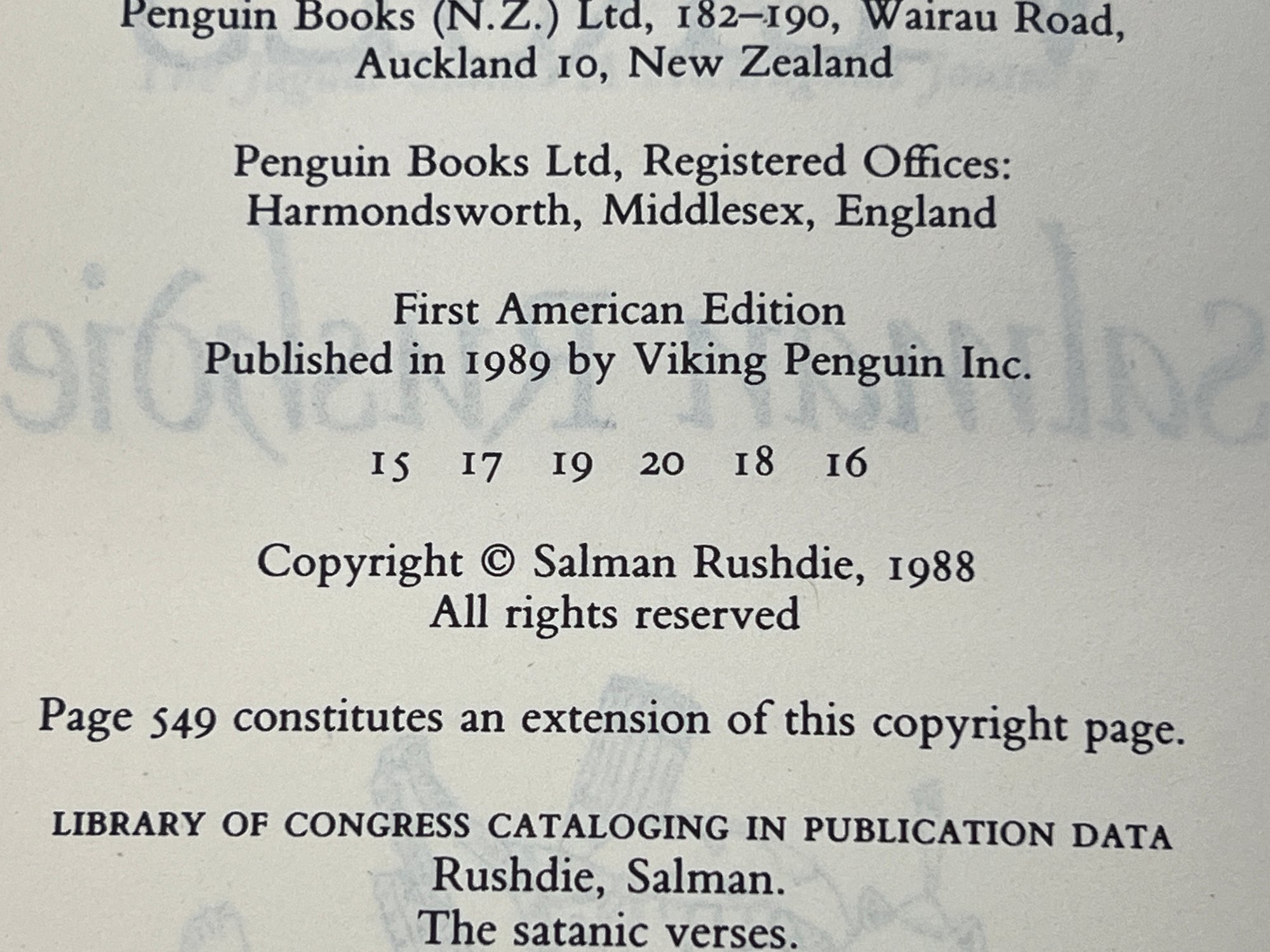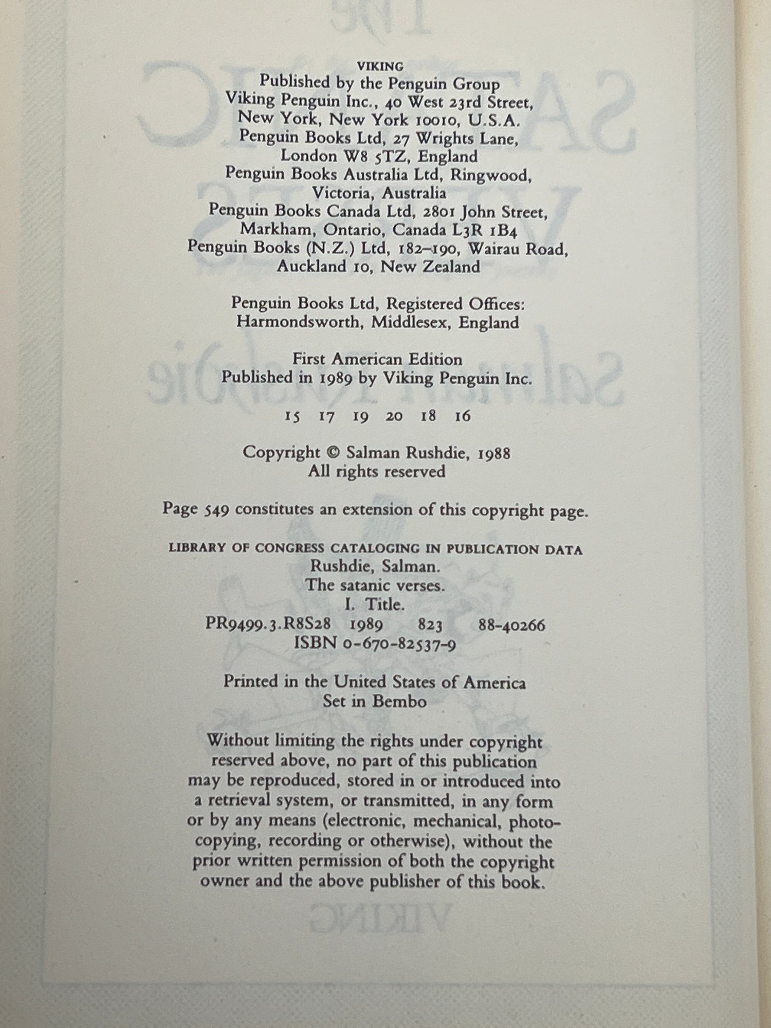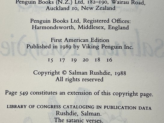 1st U.S. Edition of "The Satanic Verses" by Salman Rushdie with original dust jacket. 9 1/4 x 6 1/2 inches.