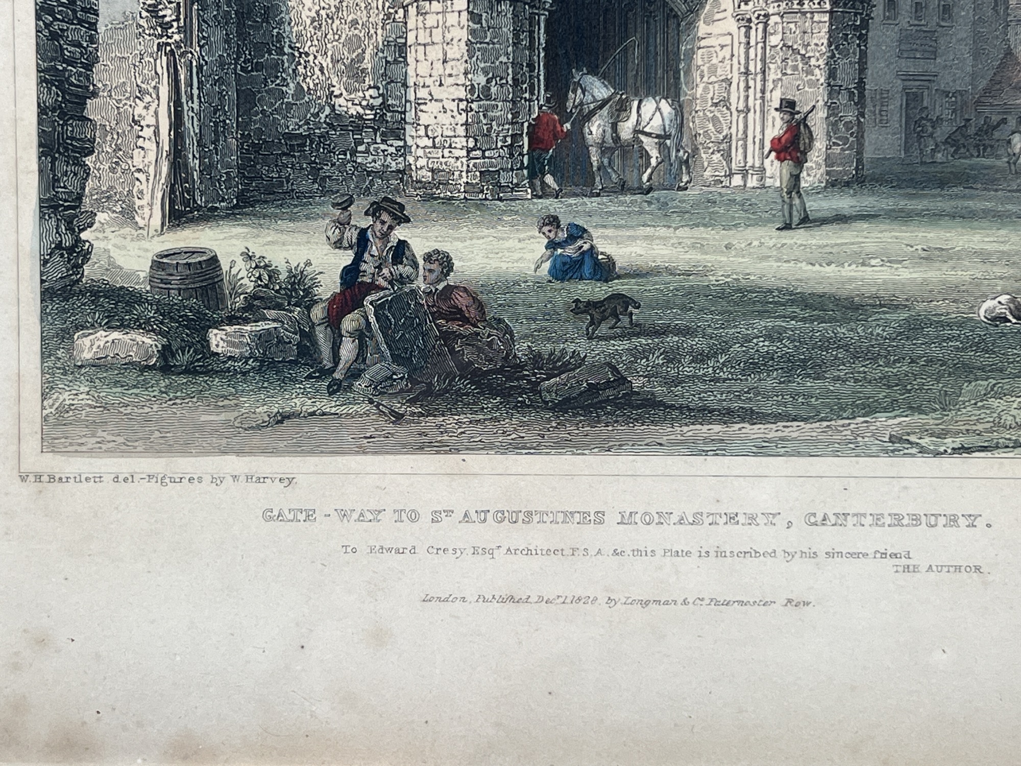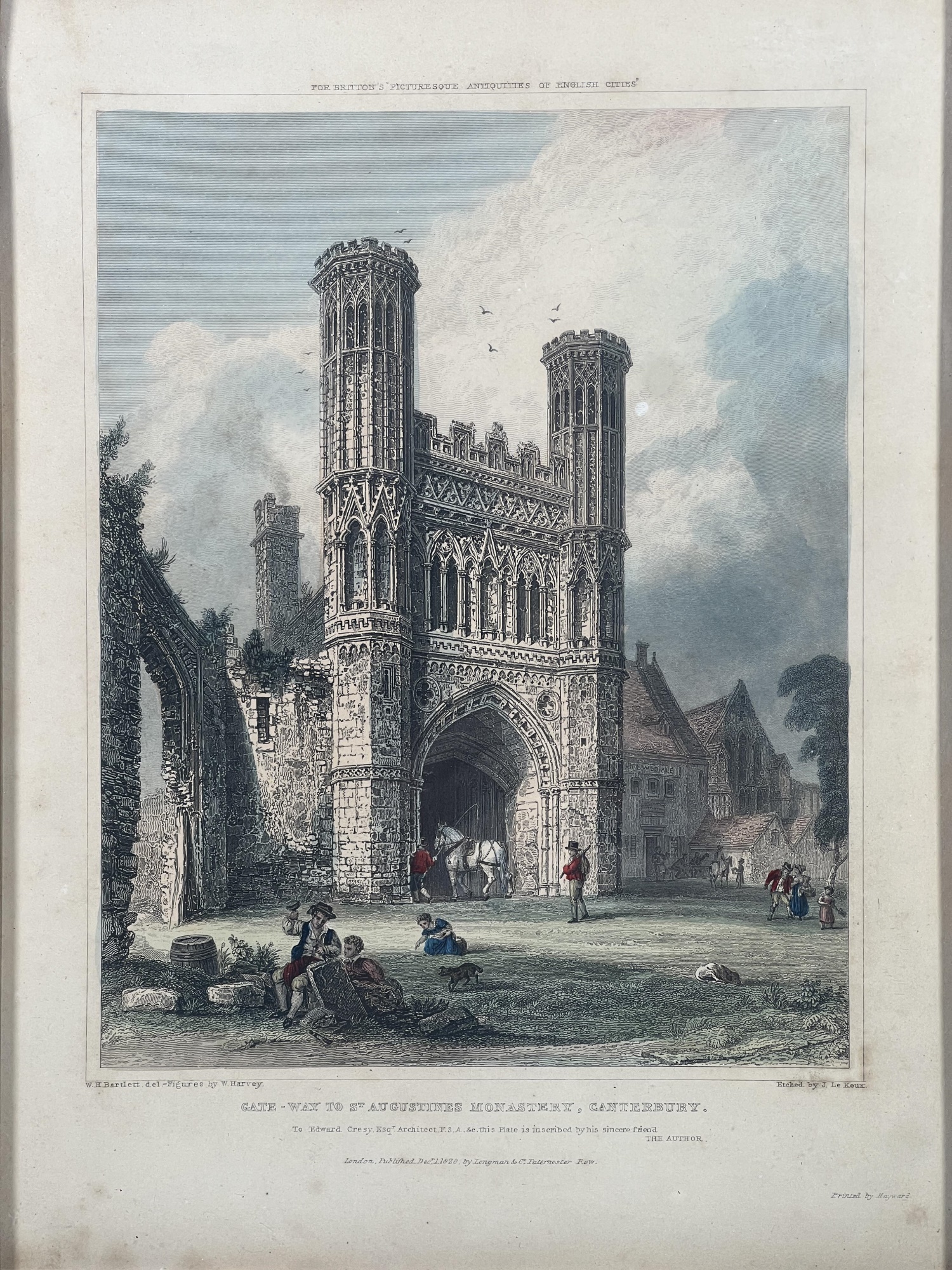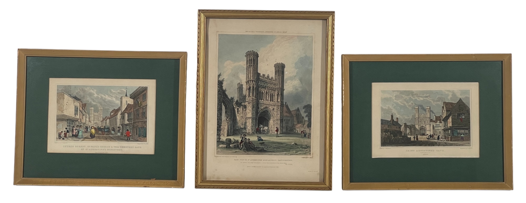 Three (19th c) colored engravings of St. Augustine's Monastery (Canterbury), various views & artists. Please see photos. 11 1/4 x 8 3/4 inches. Condition: Slight toning/fading. Temp No 8854