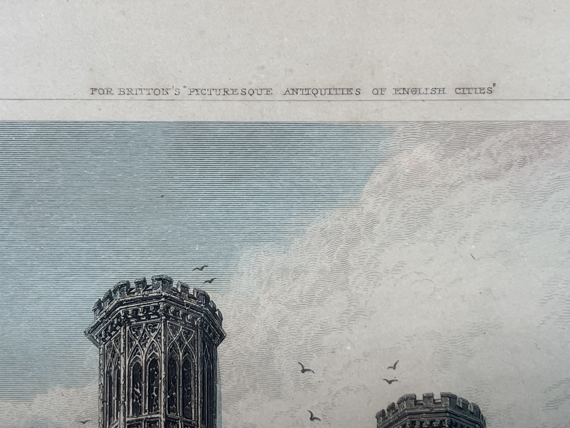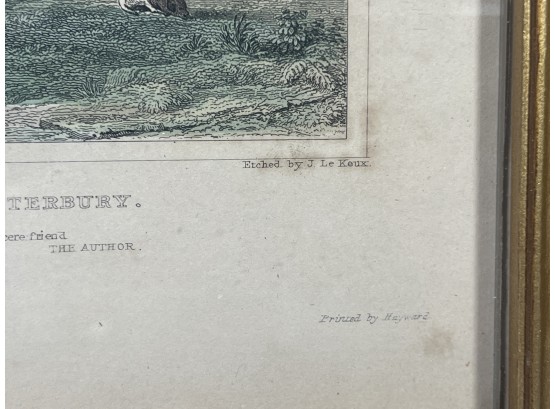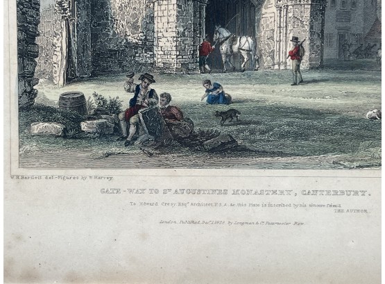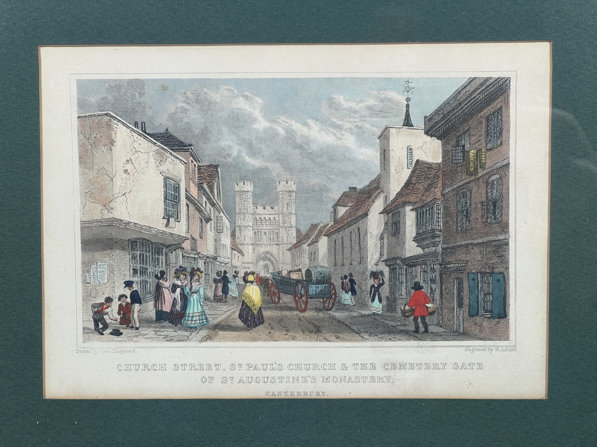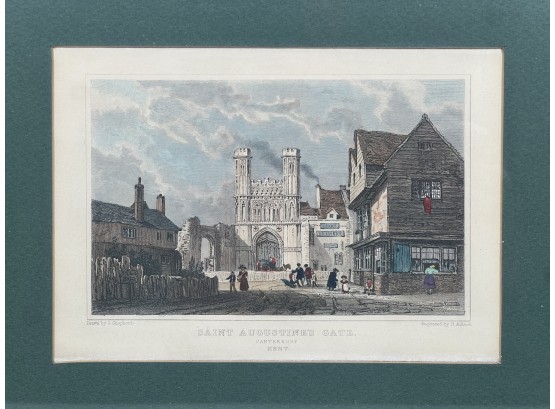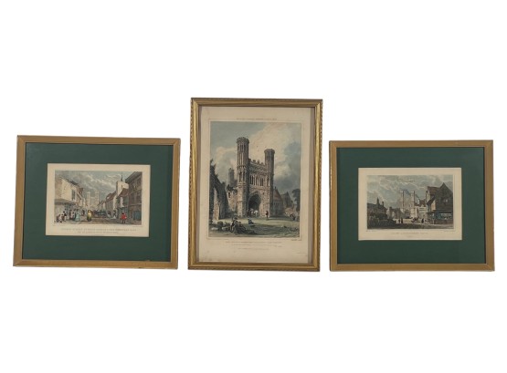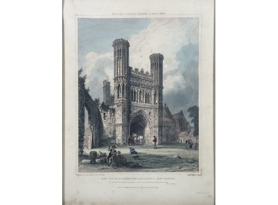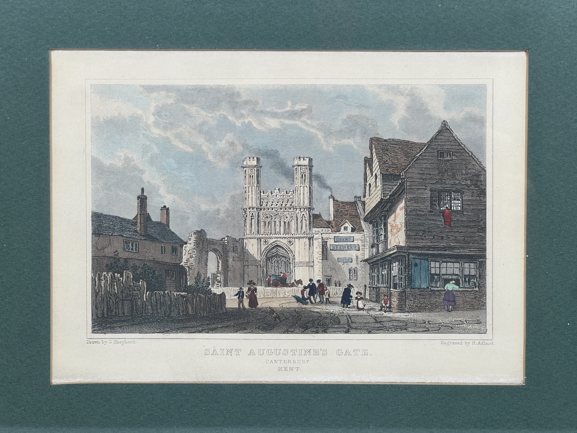 Three (19th c) colored engravings of St. Augustine's Monastery (Canterbury), various views & artists. Please see photos. 11 1/4 x 8 3/4 inches. Condition: Slight toning/fading. Temp No 8854