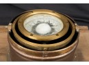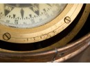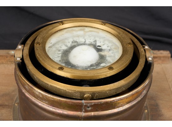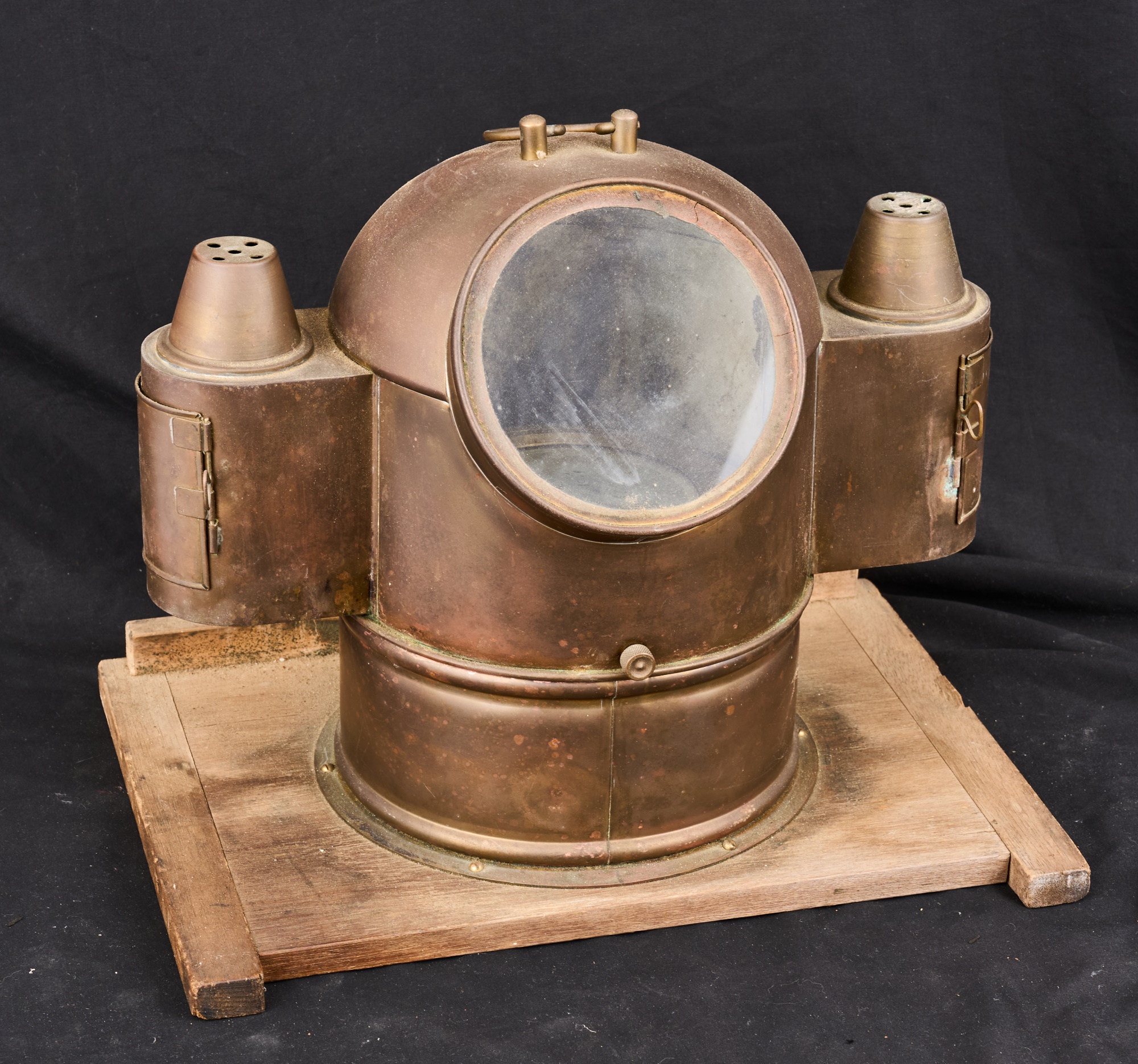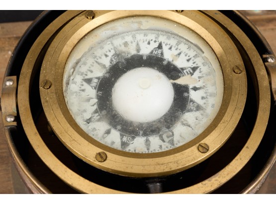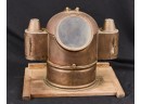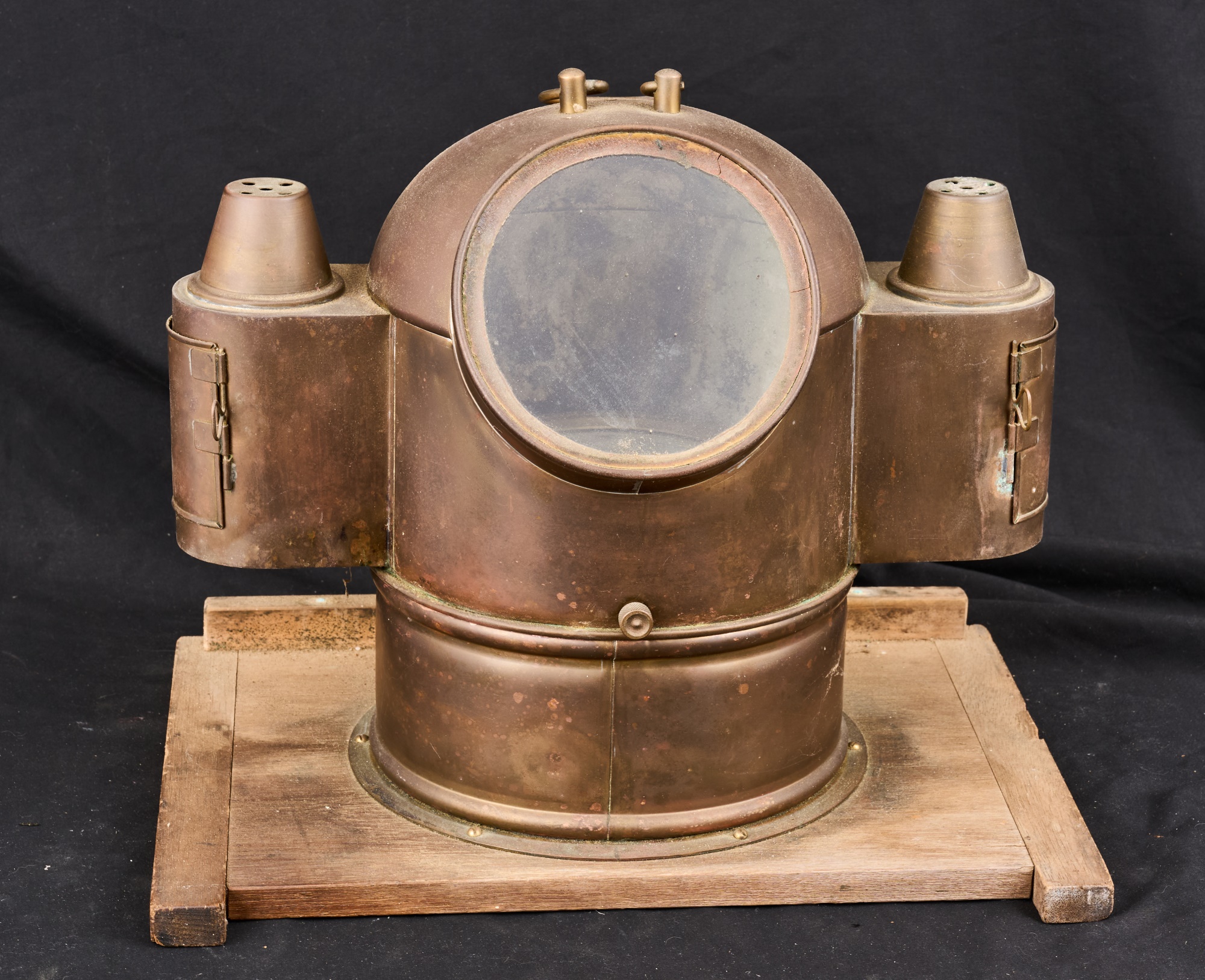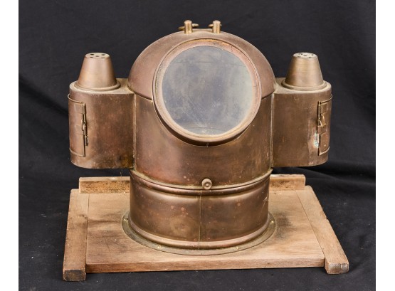 Gimbaled 4 inch wet compass is housed in diminutive brass binnacle with (2) flanking fluid lamps. 11 x 14 x 7 inches (not including wood base) Condition: Tarnish, compass beneath lens in need of cleaning