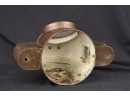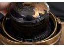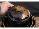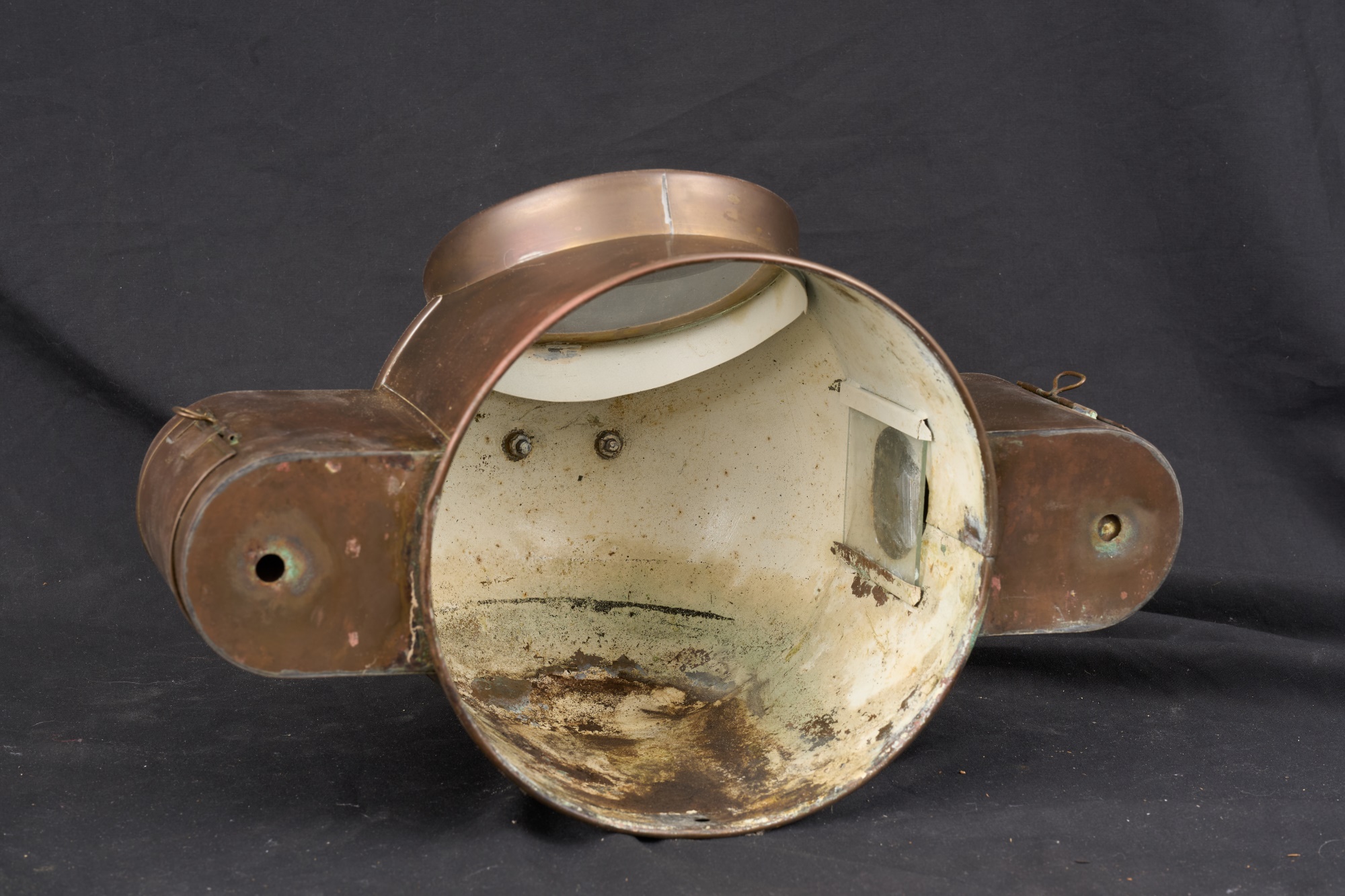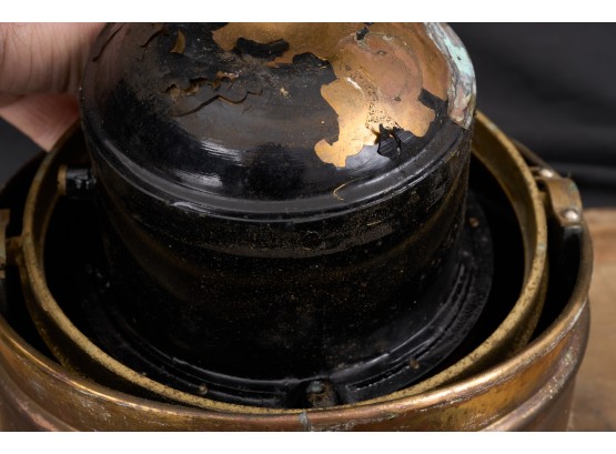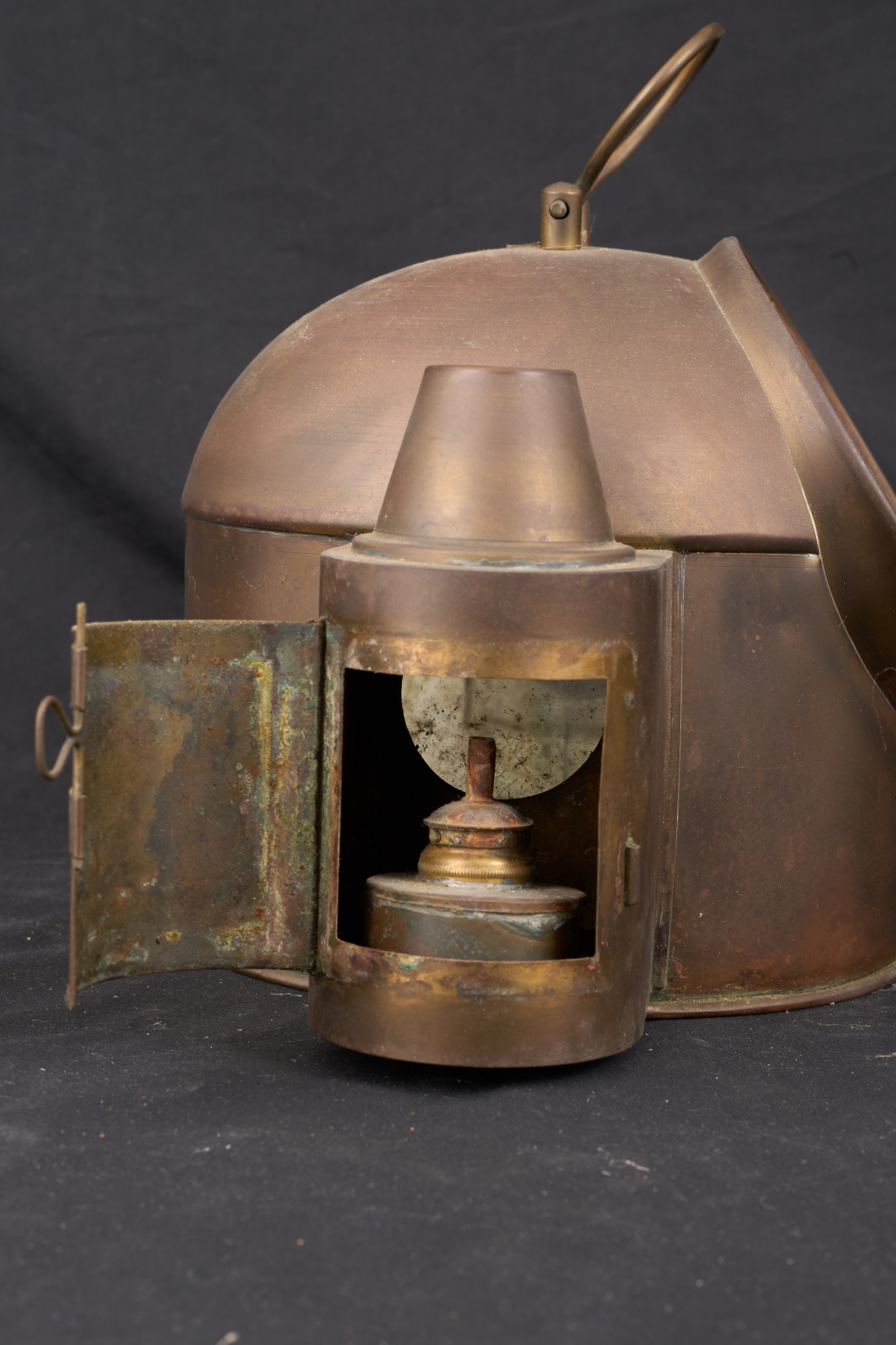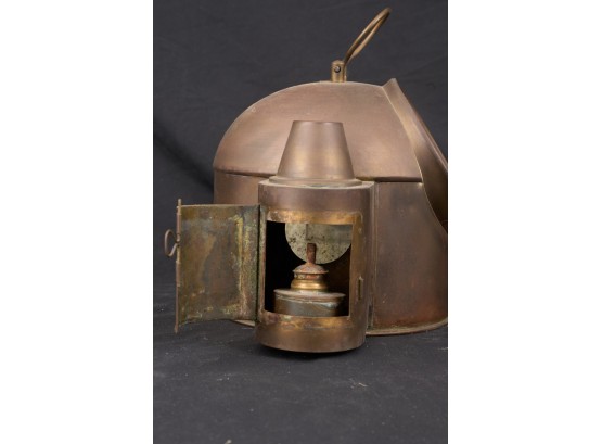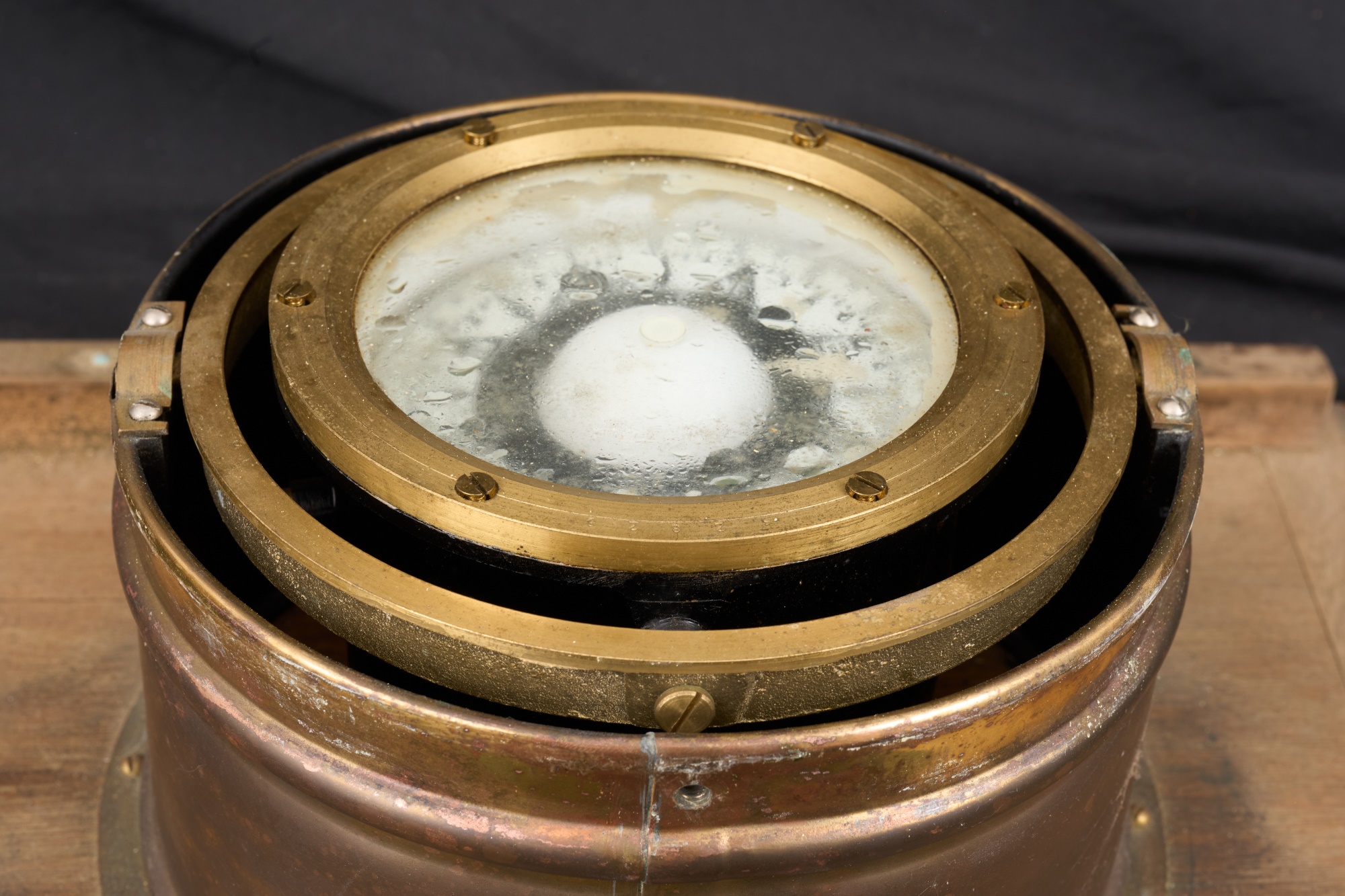Gimbaled 4 inch wet compass is housed in diminutive brass binnacle with (2) flanking fluid lamps. 11 x 14 x 7 inches (not including wood base) Condition: Tarnish, compass beneath lens in need of cleaning