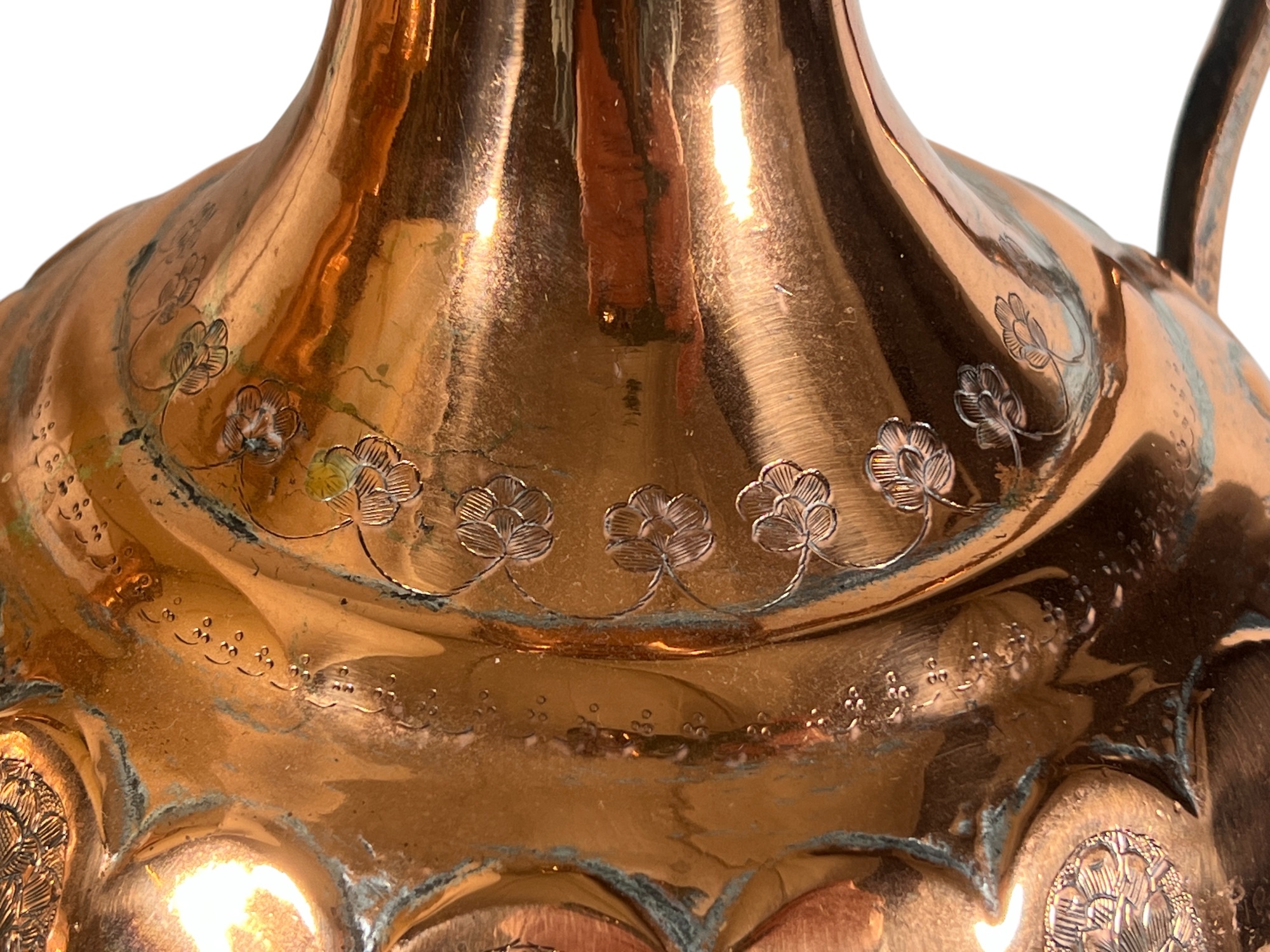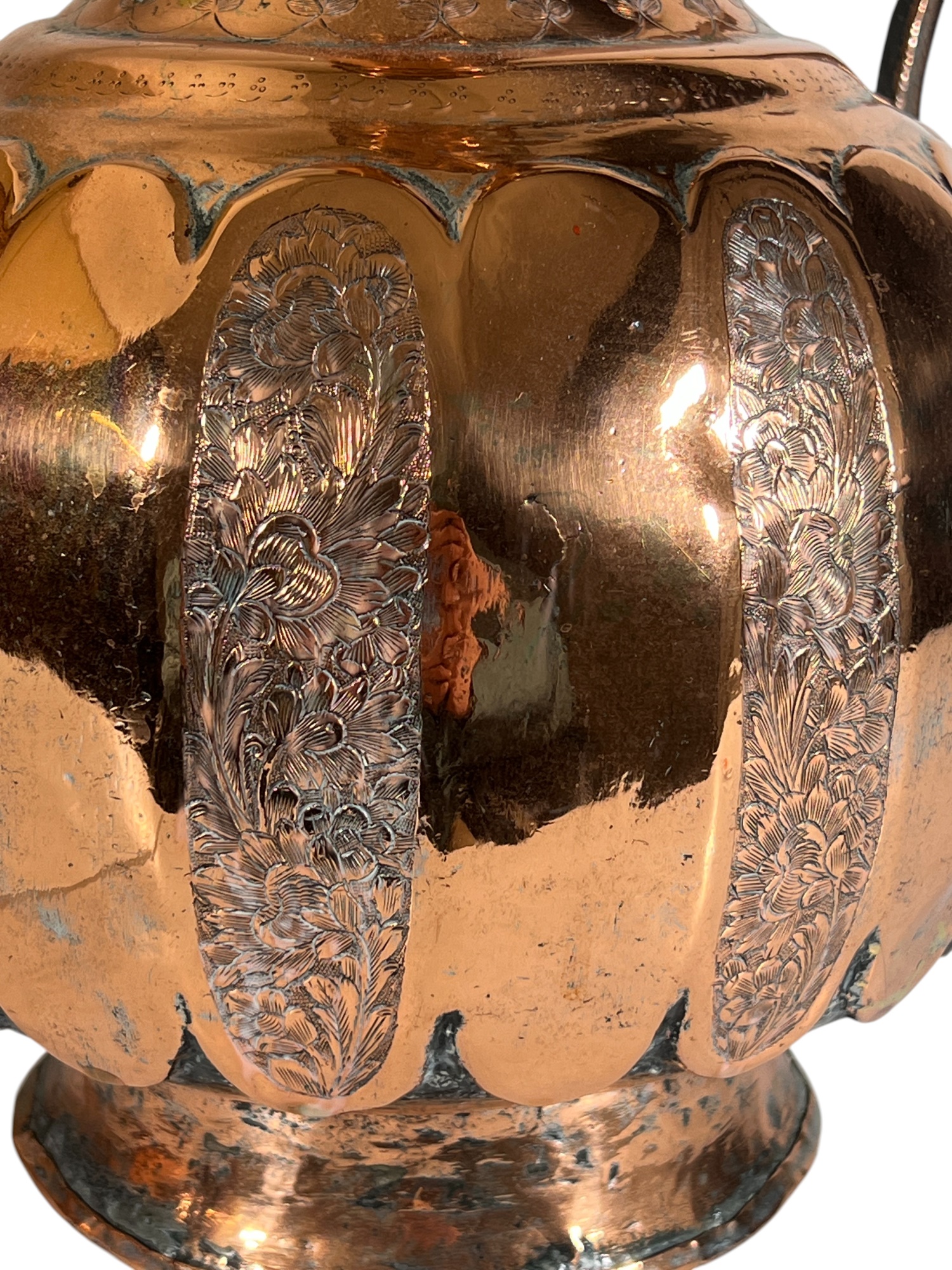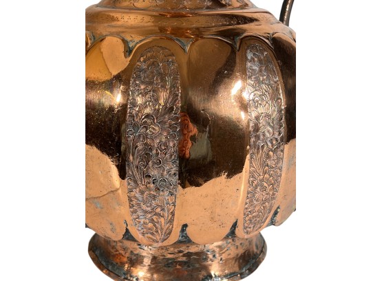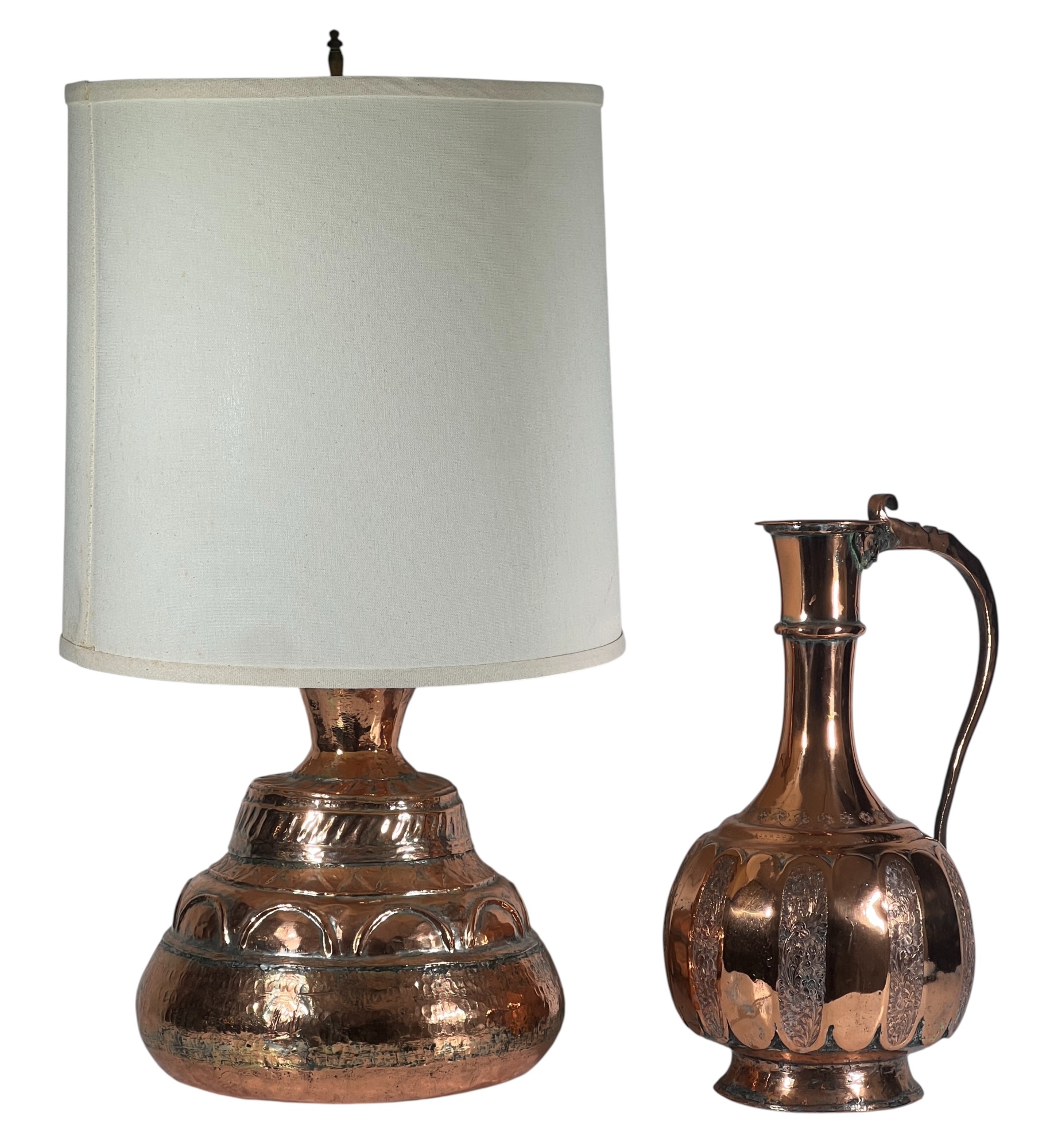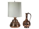 Ewer with nice floral engraved panels, vase mounted as lamp. 27 inches to finial. Condition: Good, lid may be absent from ewer. Temp No 8860