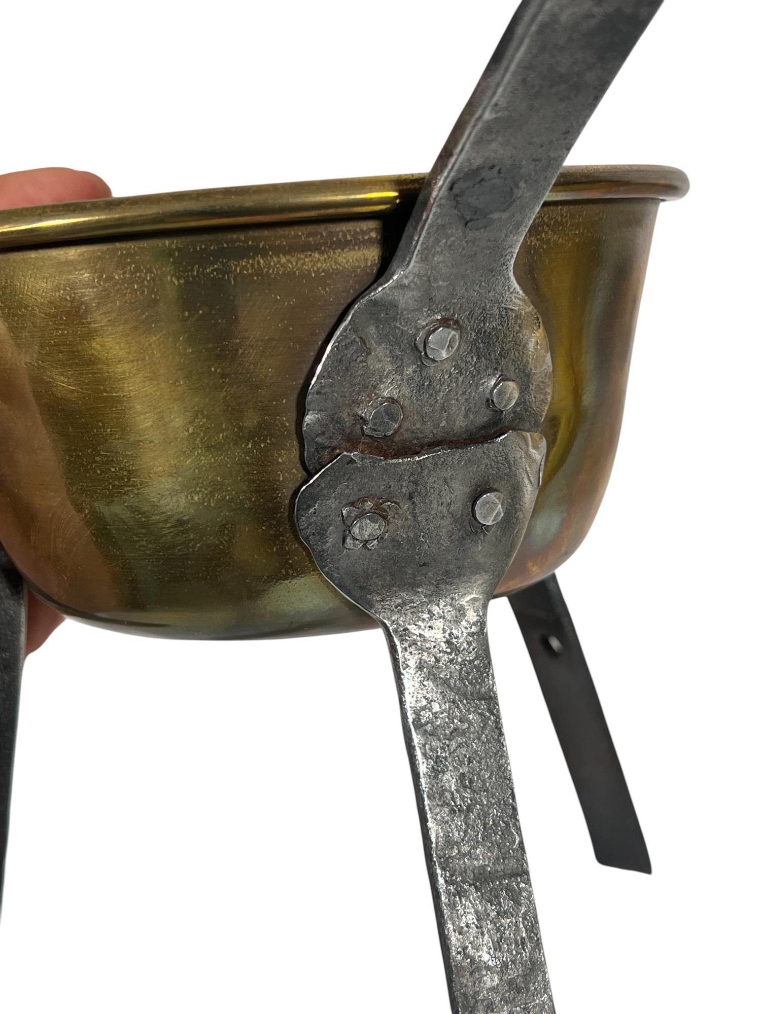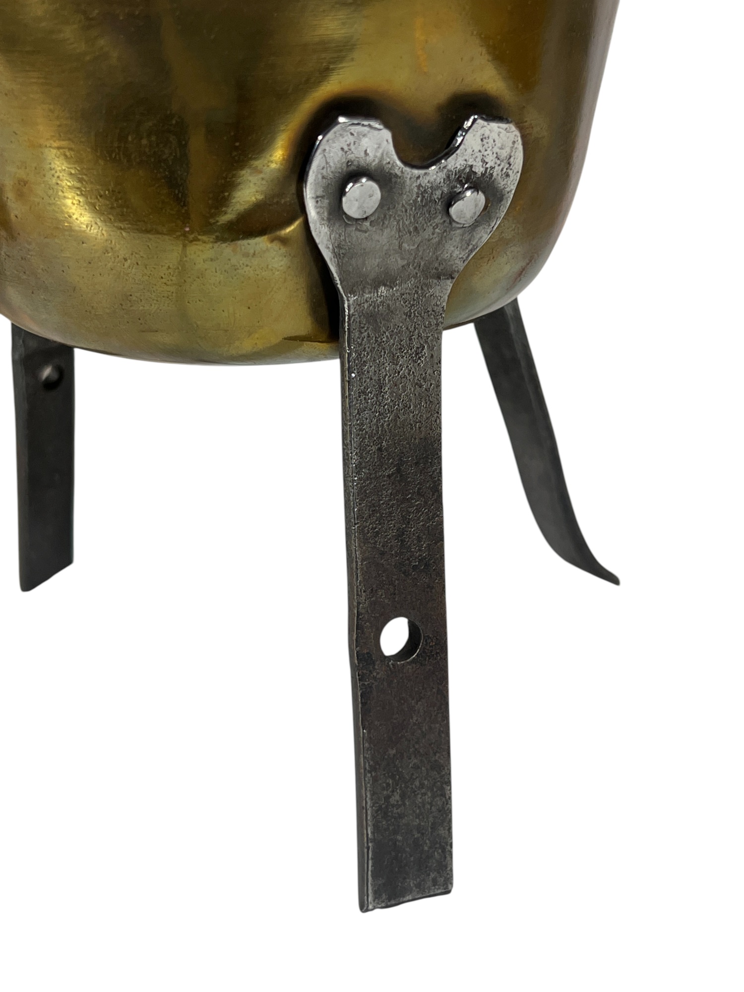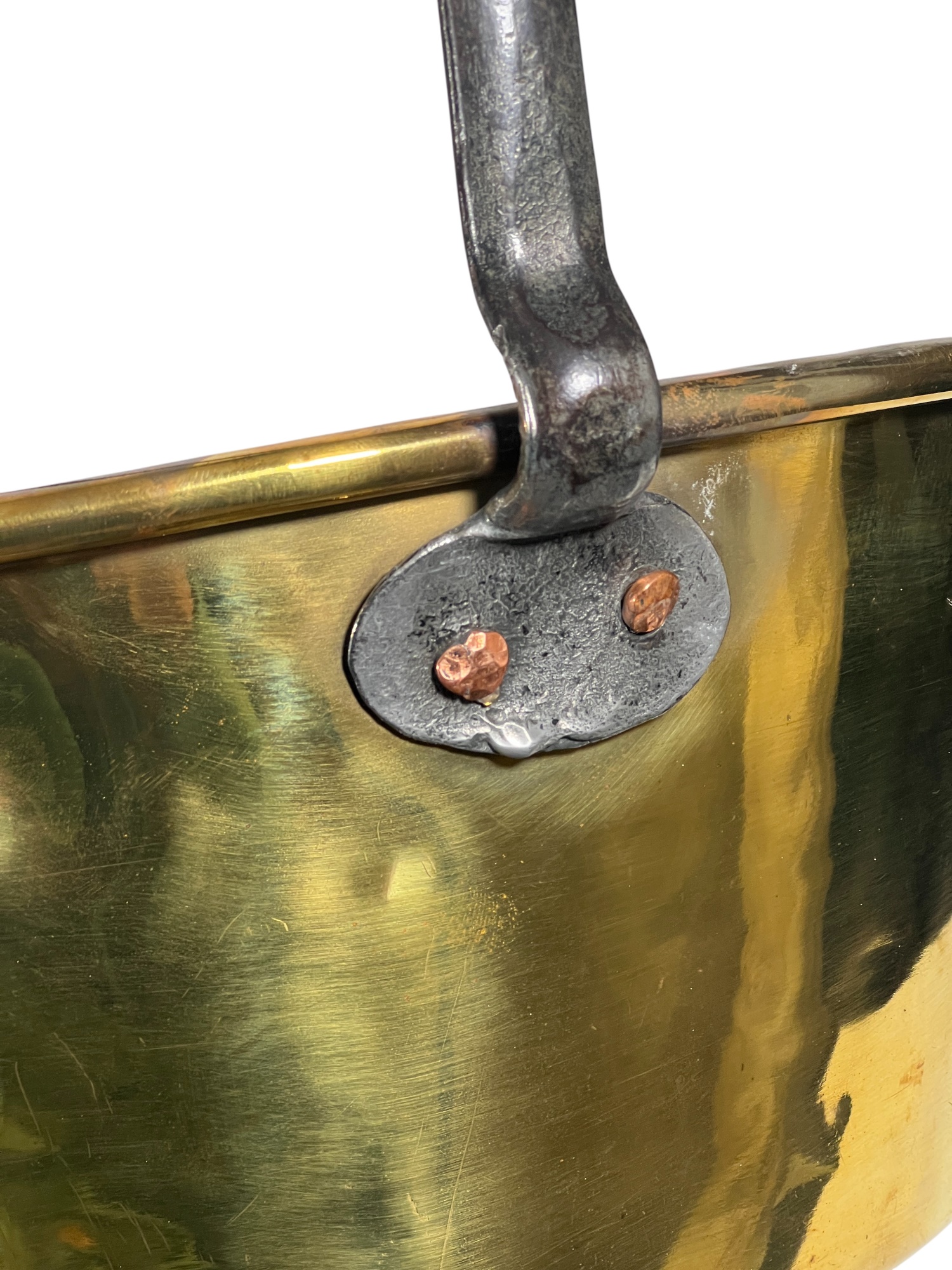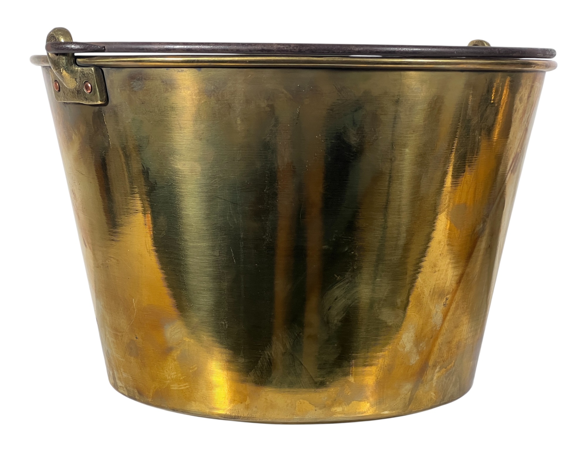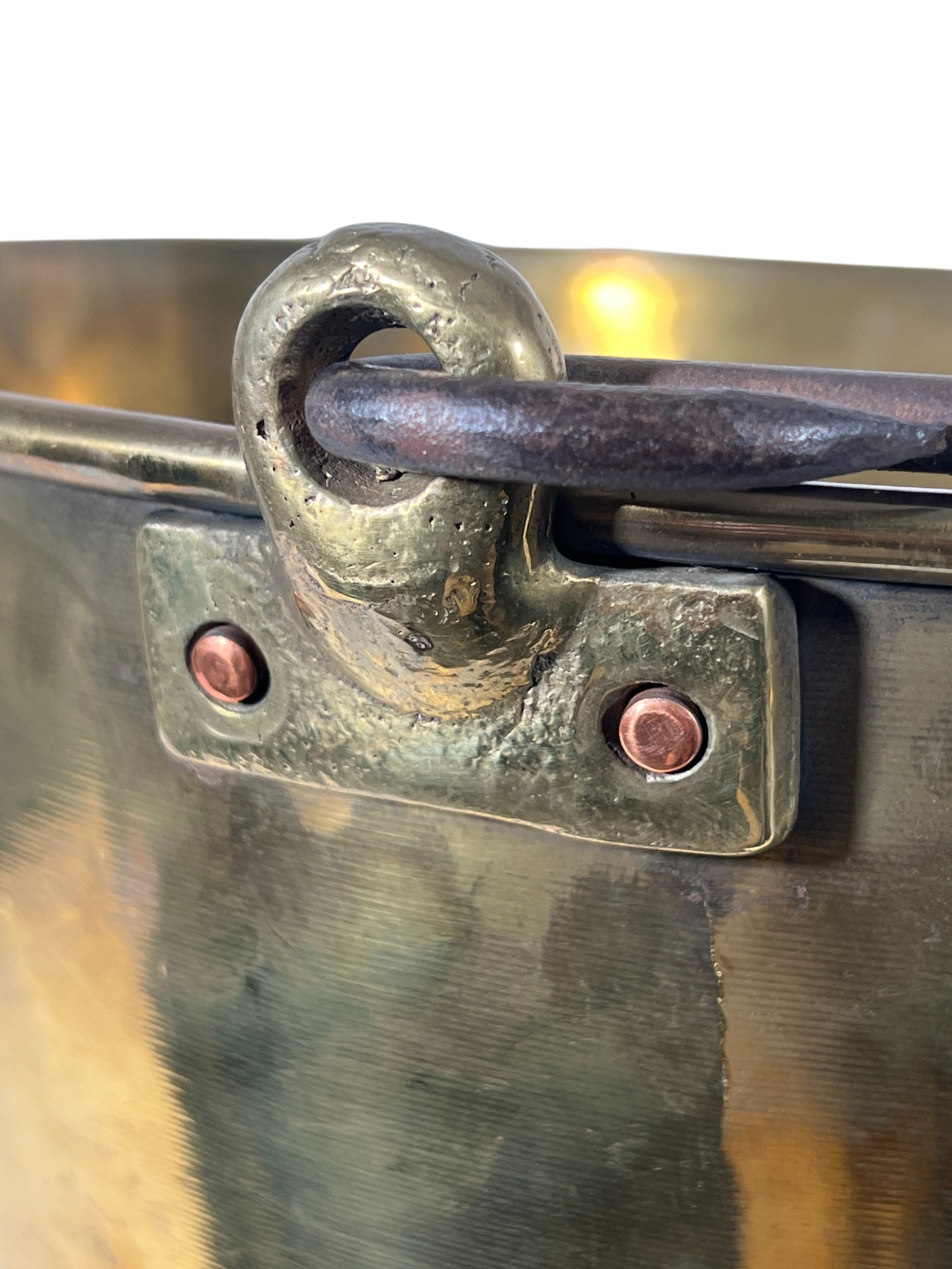 Two (19th c) brass buckets with iron handles and copper rivets along with a brass ladle with wrought iron feet & handle. 11 x 15 1/2 inches. Condition: Good. Temp No 8750