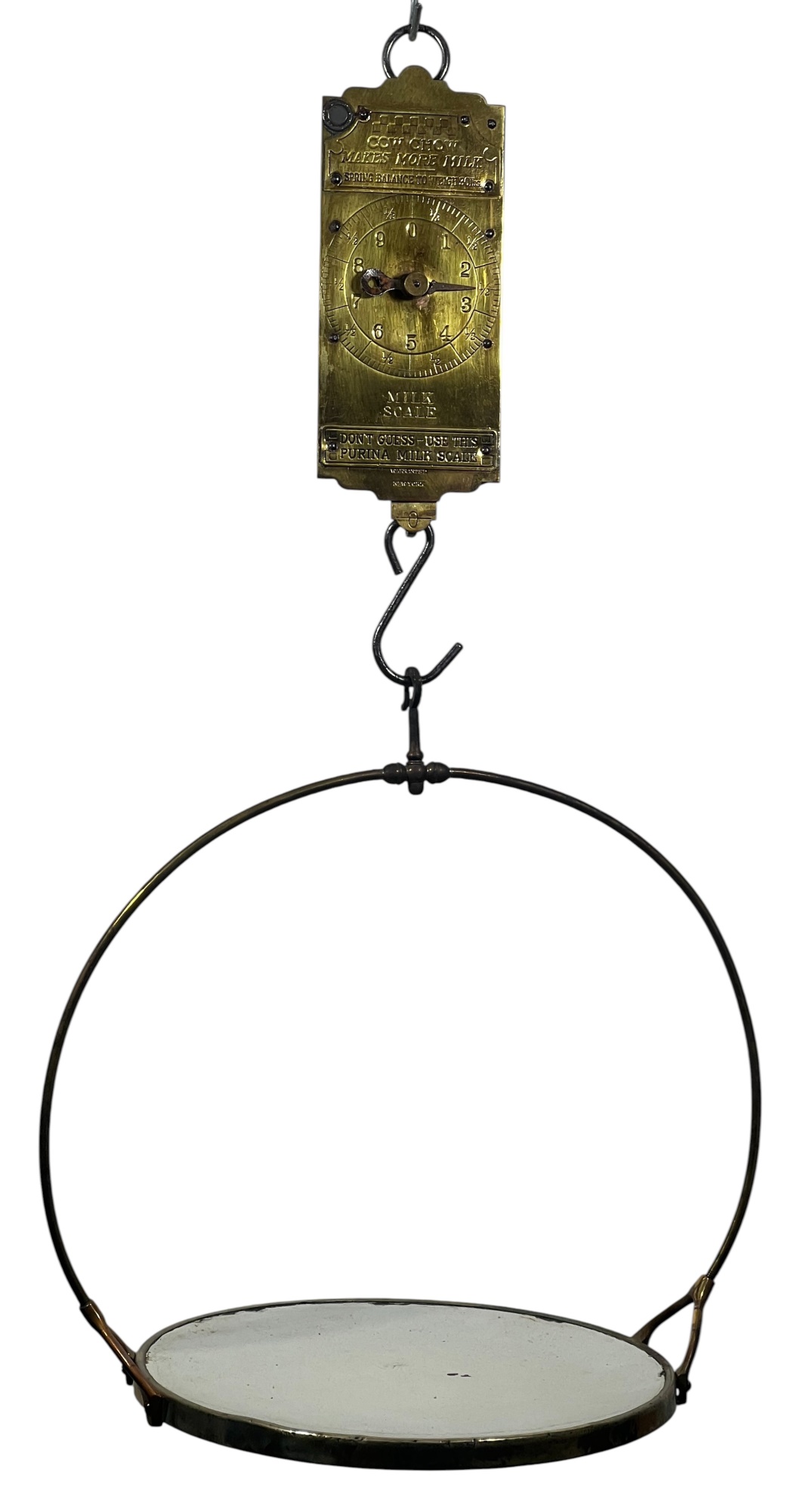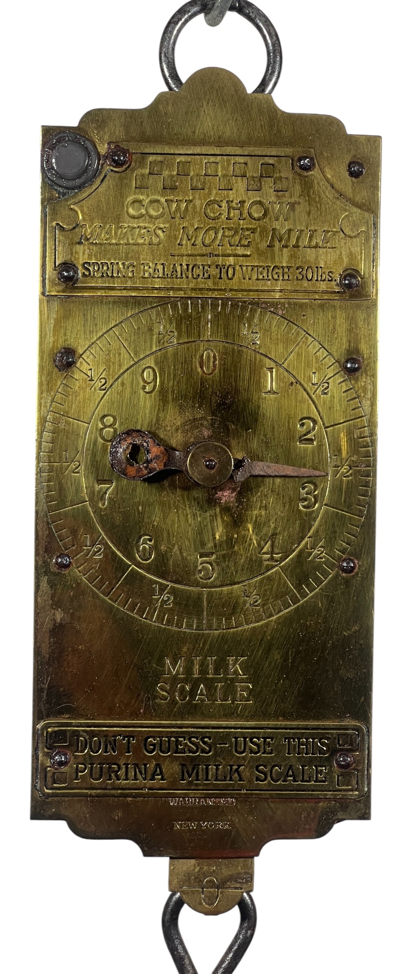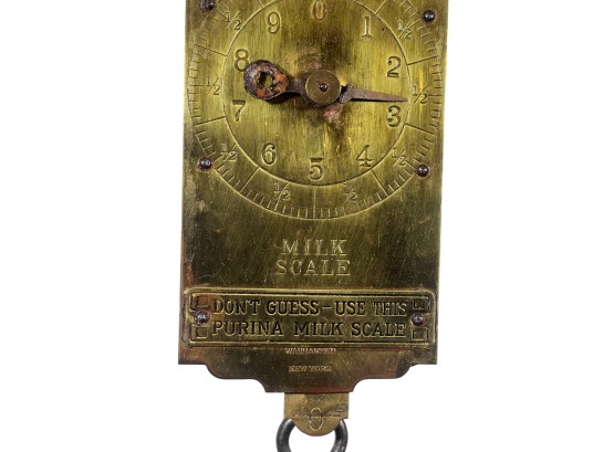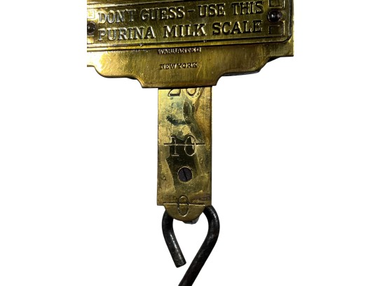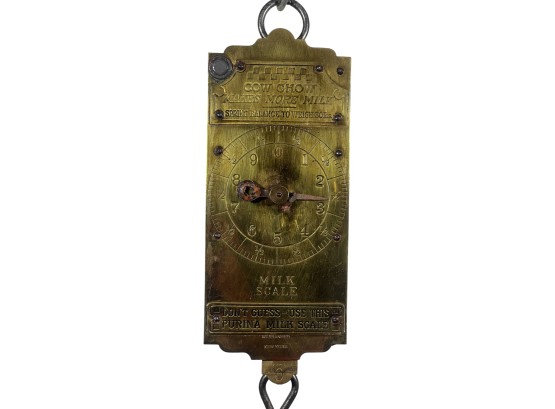 Purina "Cow Chow" brass & iron (30) pound spring scale for milk. 15 1/2 x 4 1/2 inches. Condition: Repair to marker. Temp No 8812