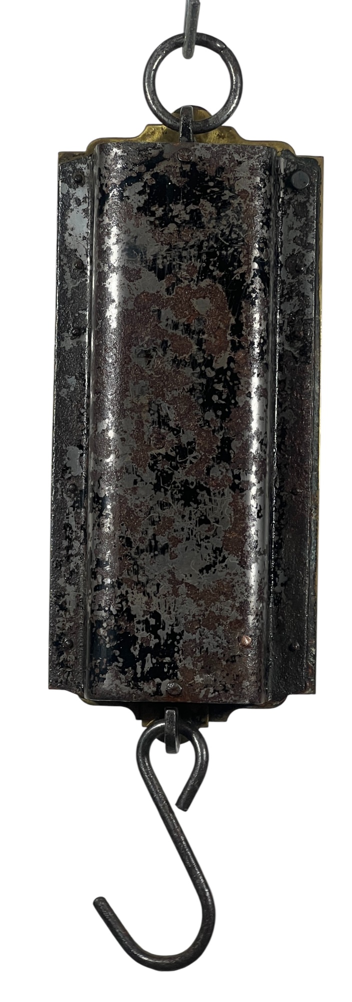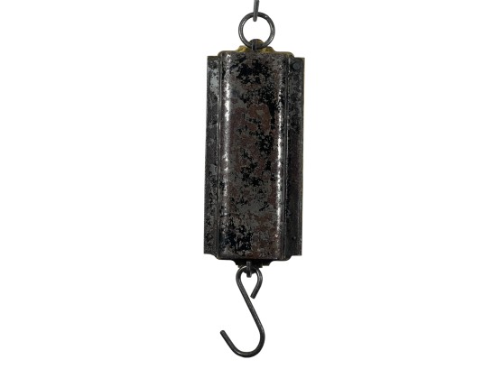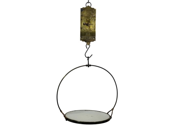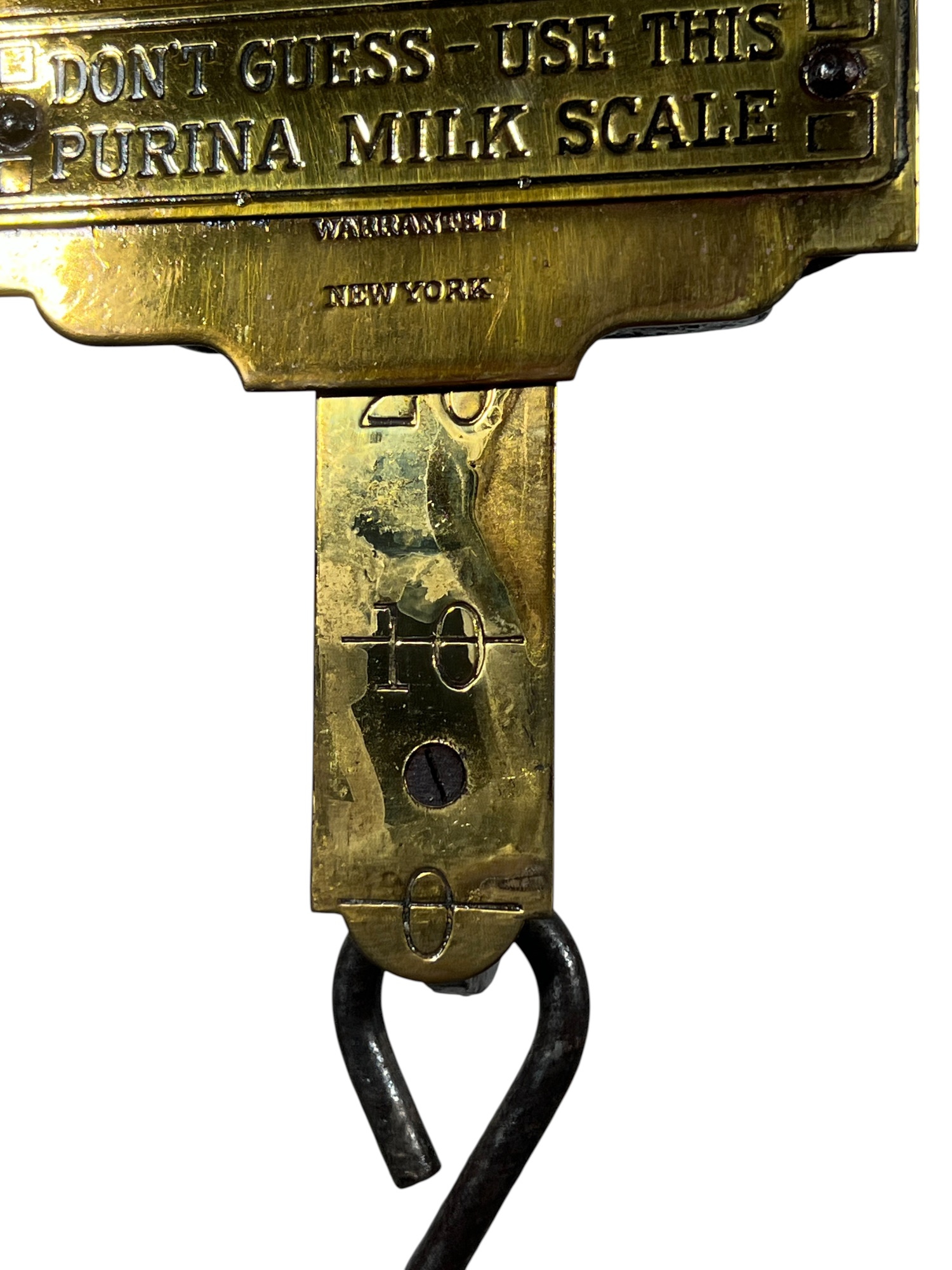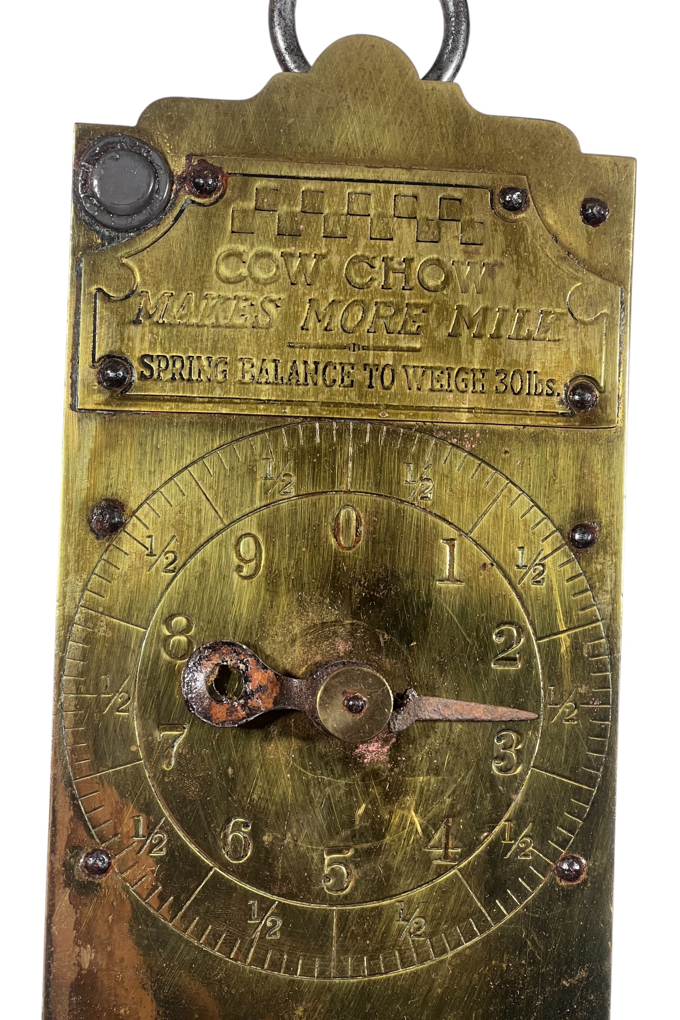 Purina "Cow Chow" brass & iron (30) pound spring scale for milk. 15 1/2 x 4 1/2 inches. Condition: Repair to marker. Temp No 8812