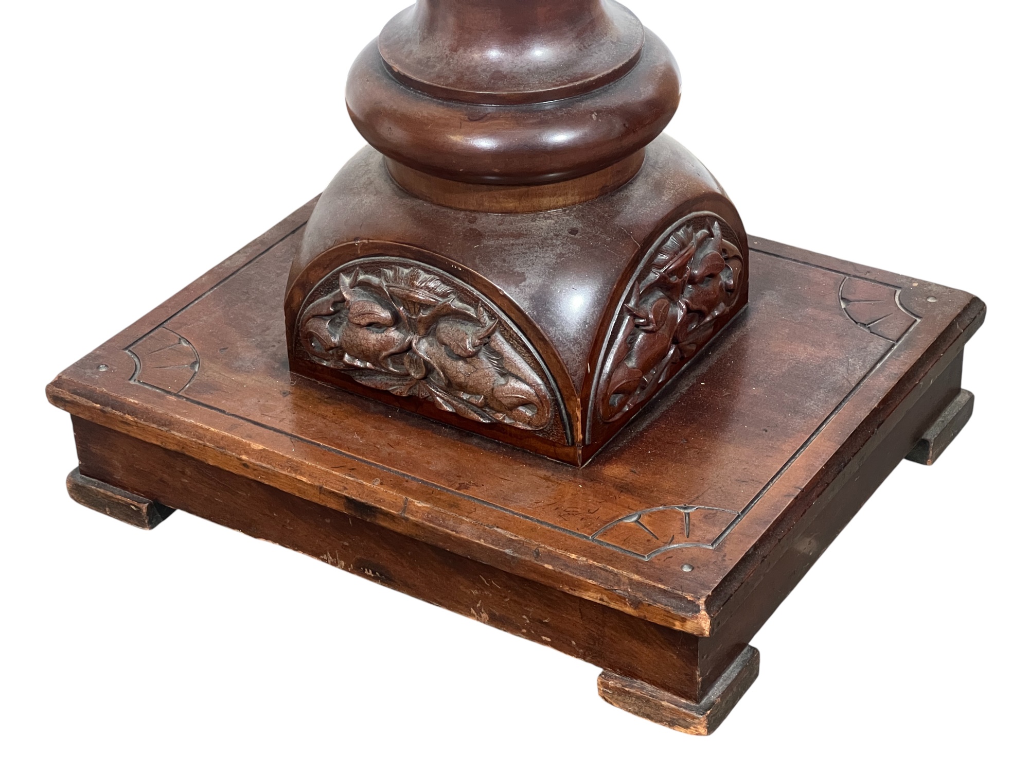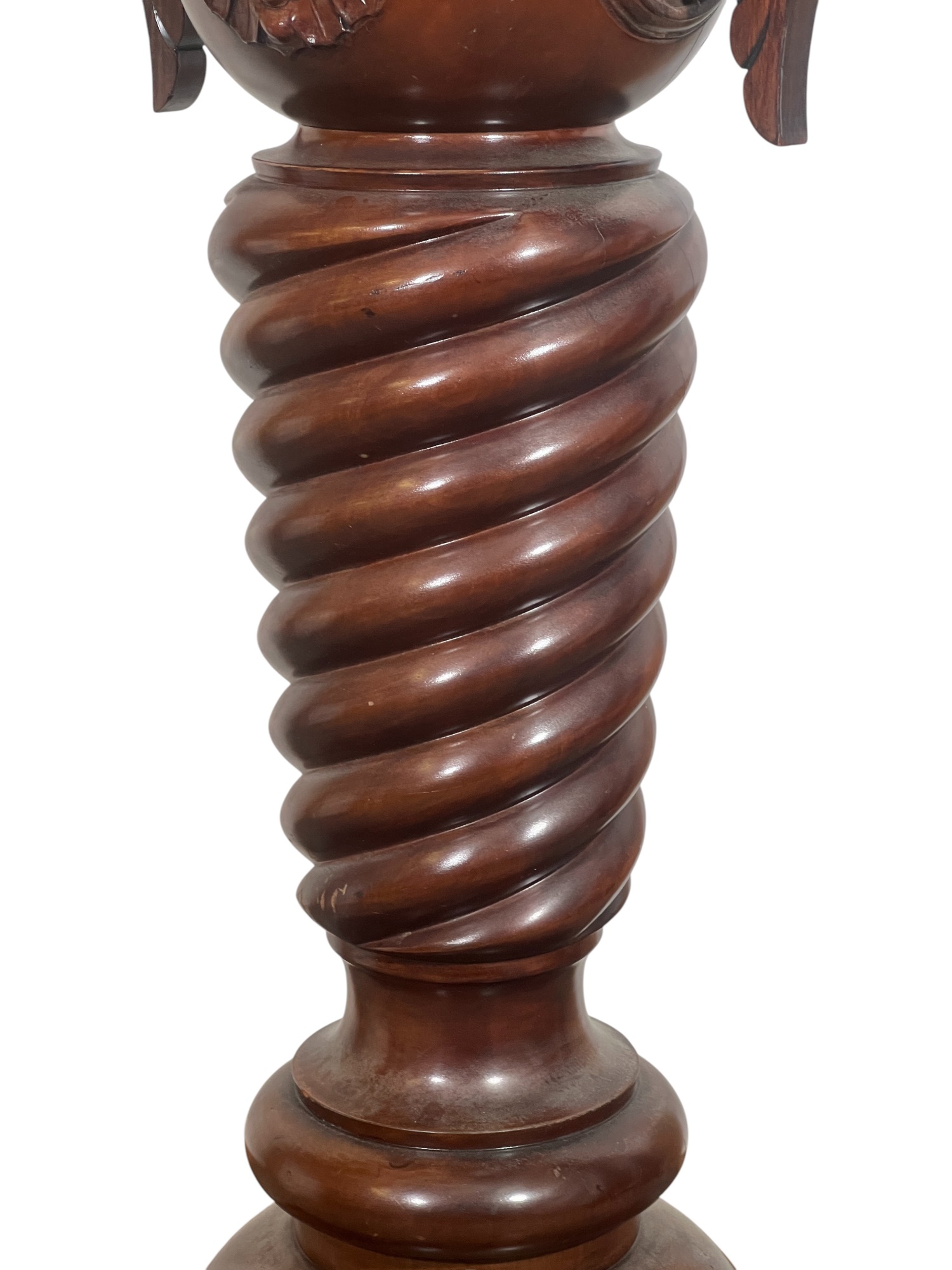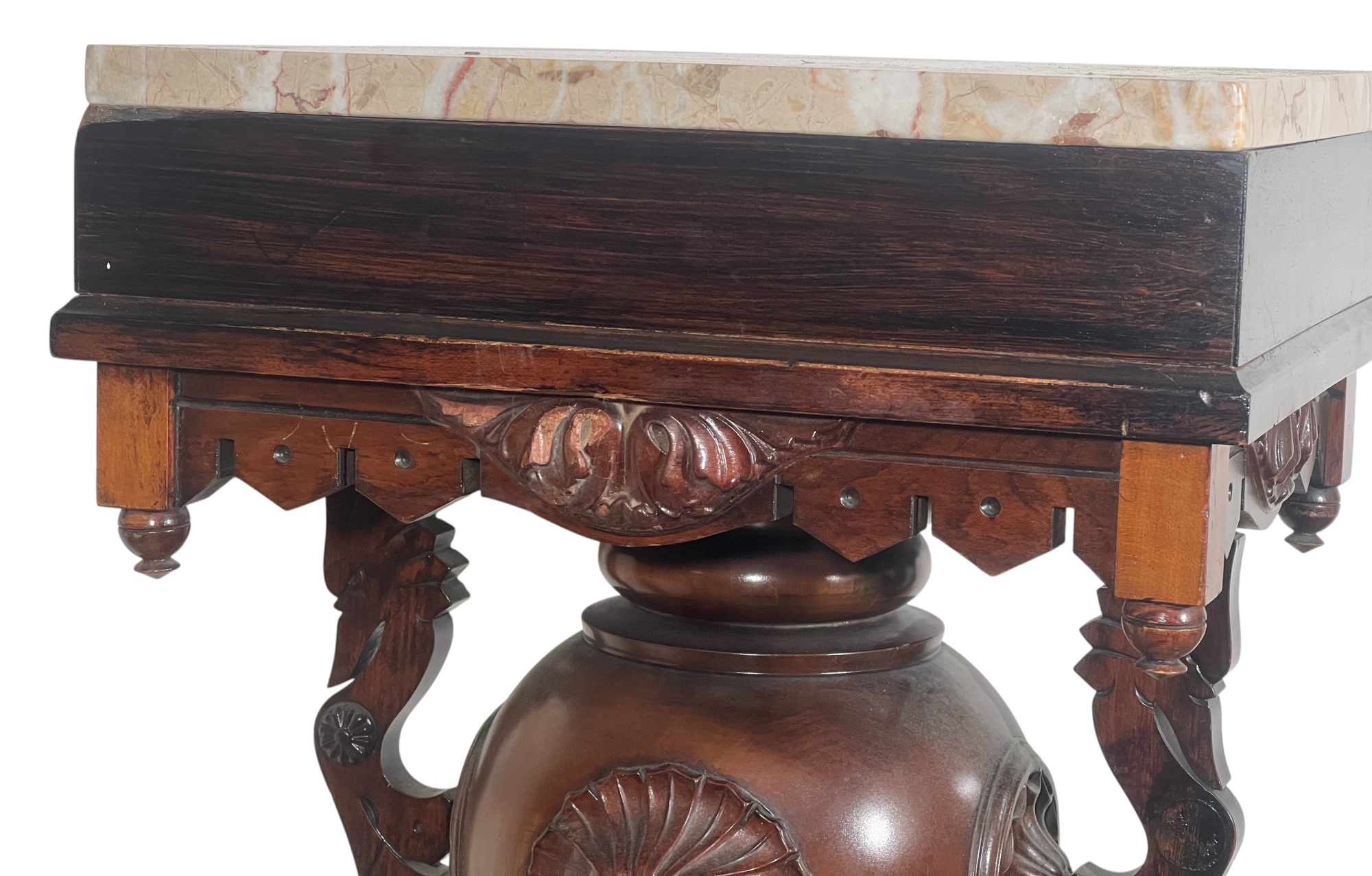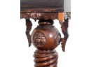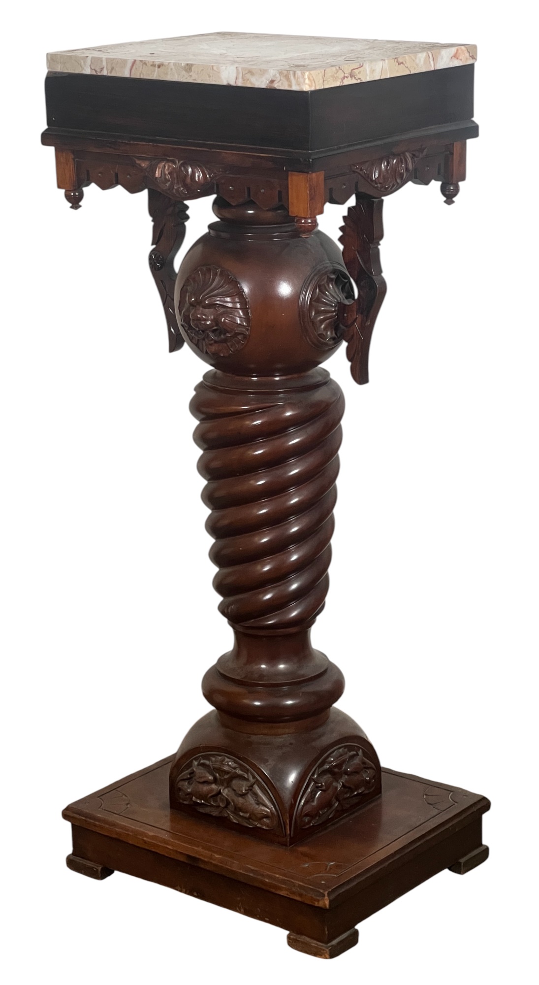 Base with carved dolphin lunettes, twist carved tapering column with globe having carved north wind roundels & heron form supports. 41 x 15 1/2 x 12 1/2 inches. Condition: Some chips to marble. Temp No 3033
