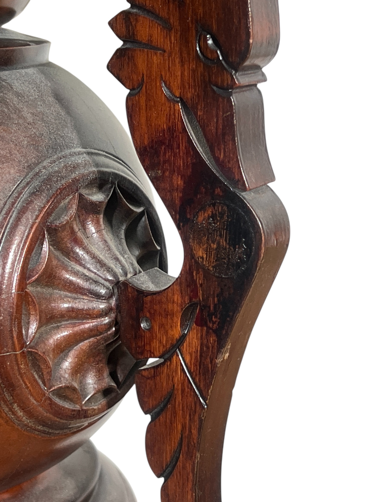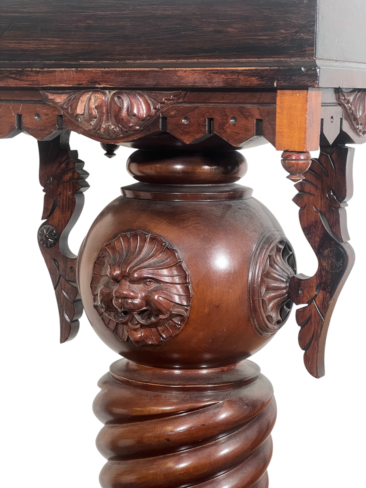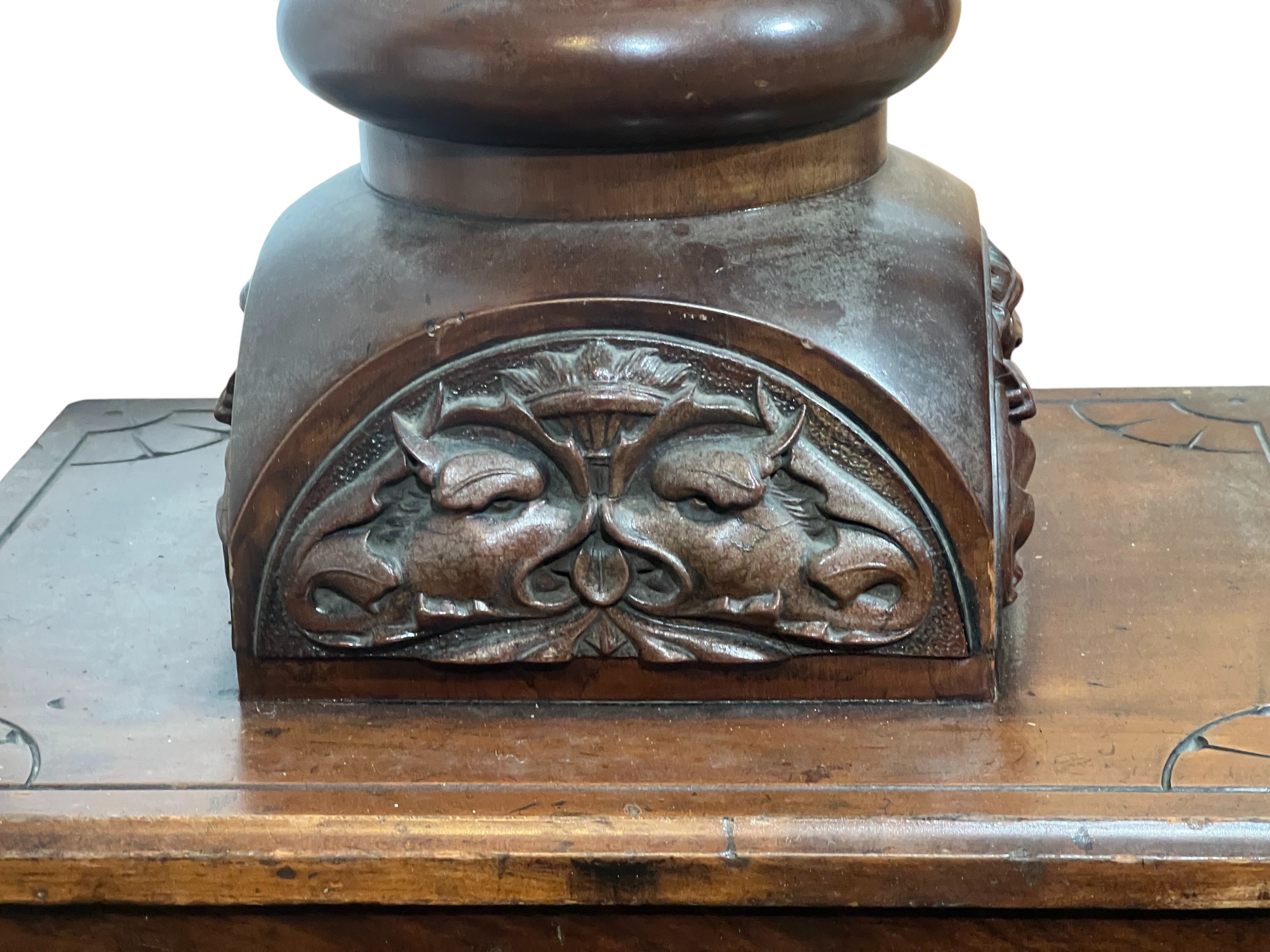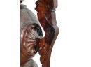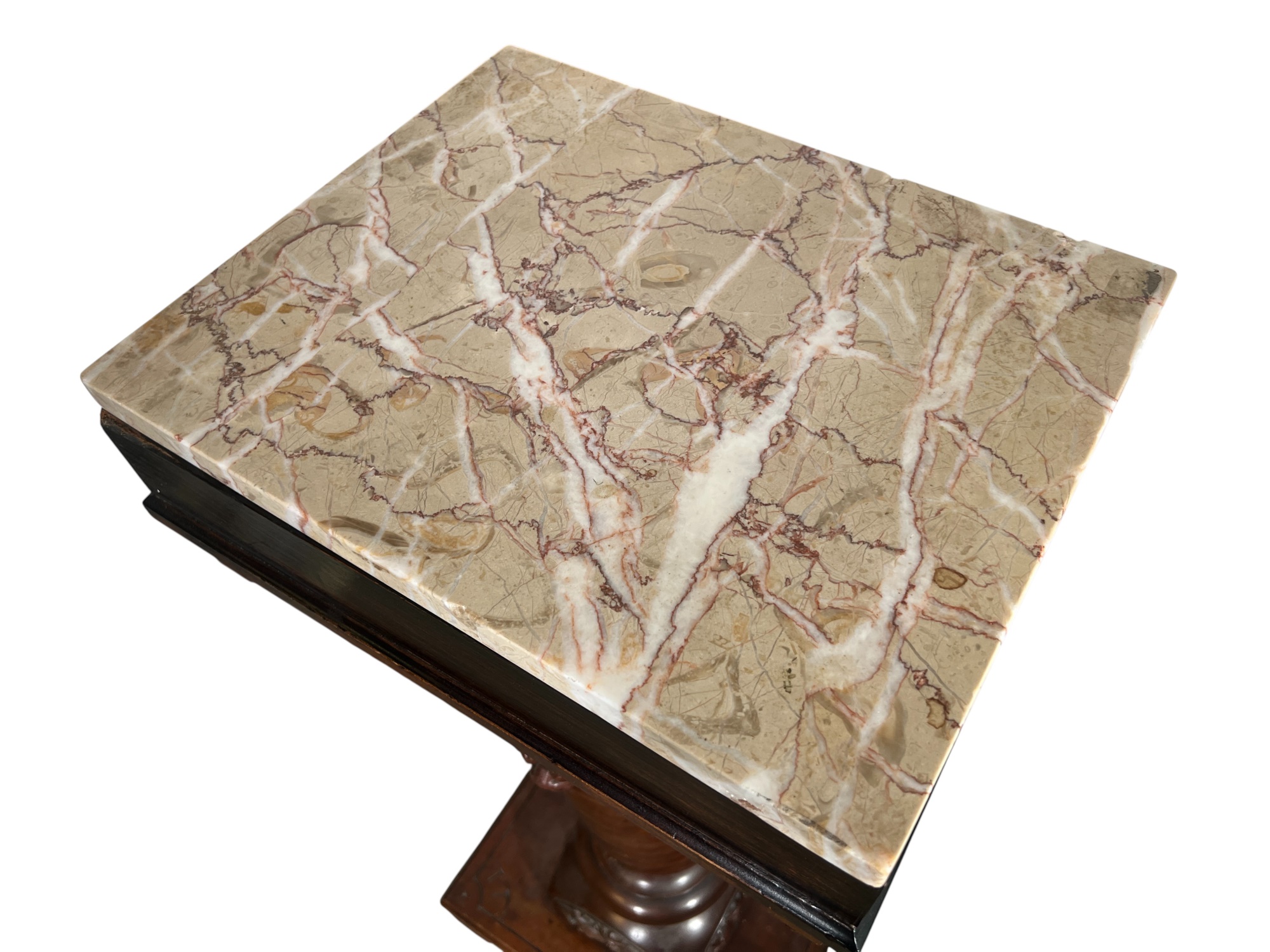 Base with carved dolphin lunettes, twist carved tapering column with globe having carved north wind roundels & heron form supports. 41 x 15 1/2 x 12 1/2 inches. Condition: Some chips to marble. Temp No 3033