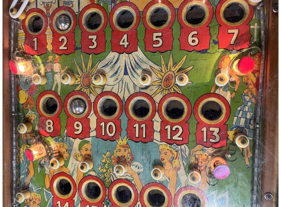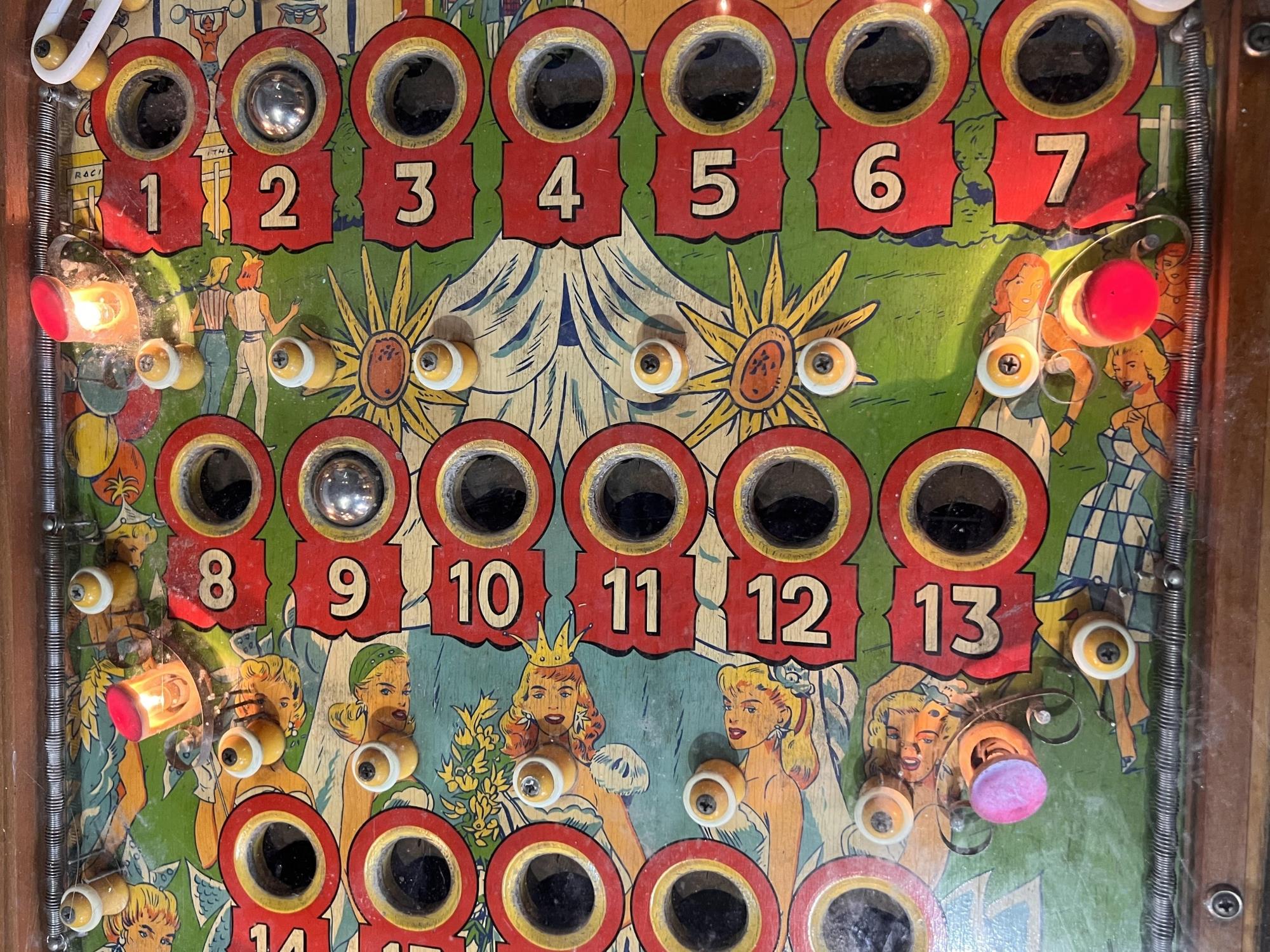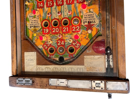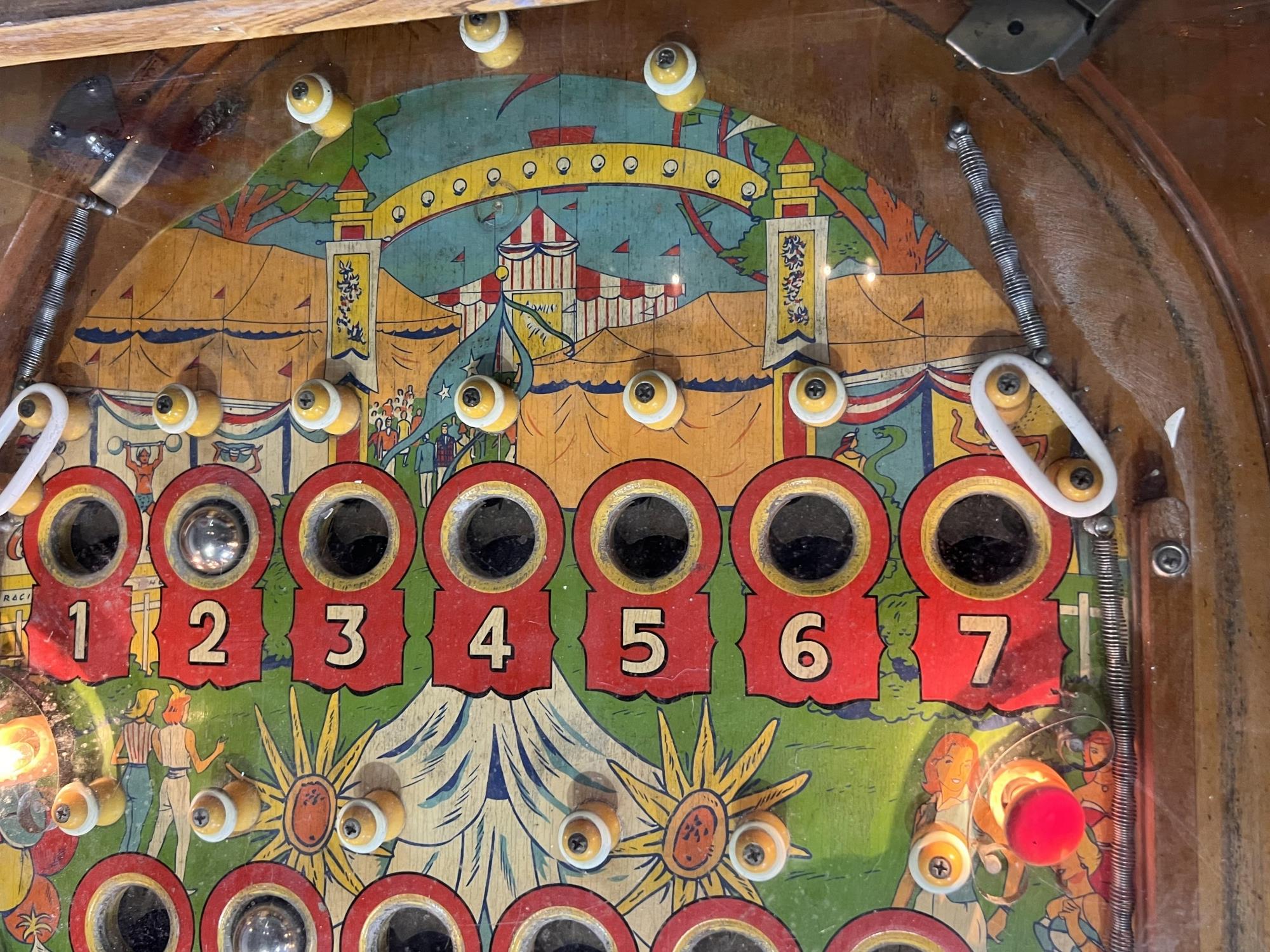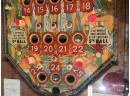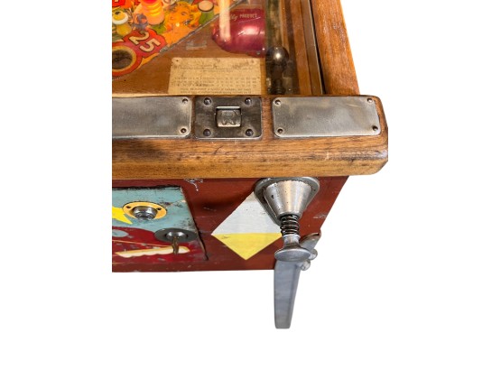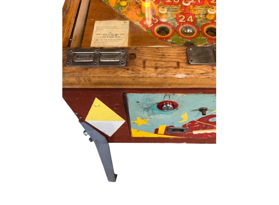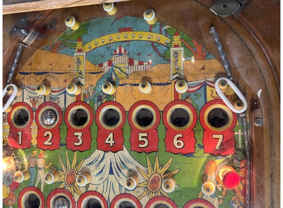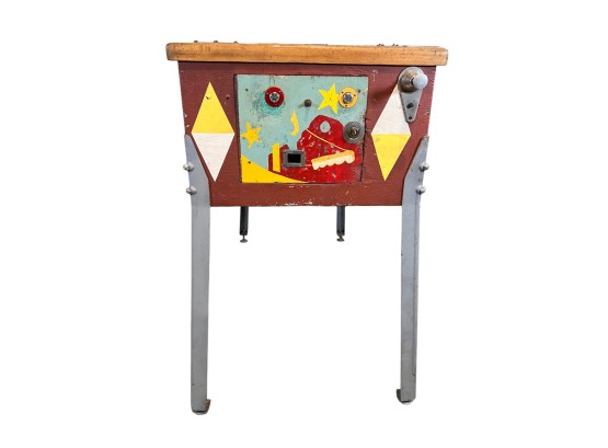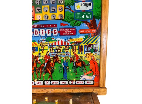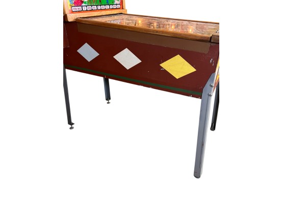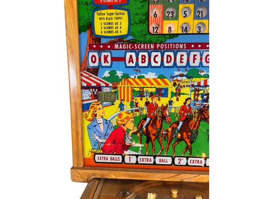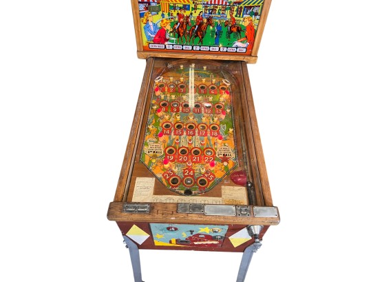 Very interesting 1950's vintage game with intricate and unique play. Wooden rails. 74 1/2" x 27 3/4" x 56" Condition: Currently working at time of cataloging. Wear to wooden case. See photos