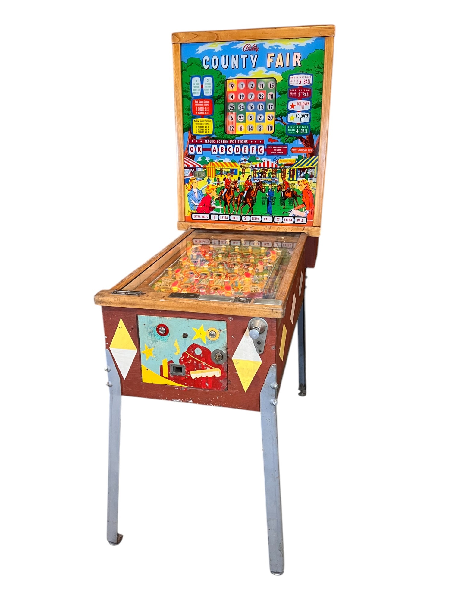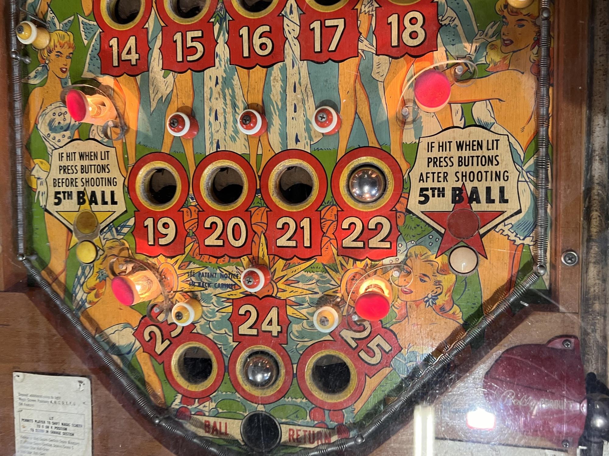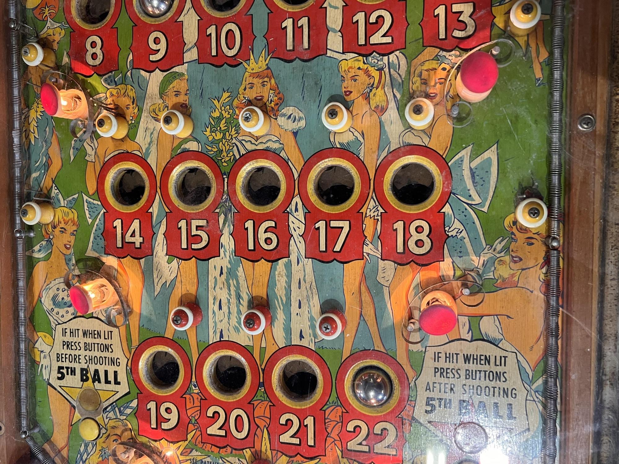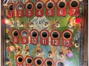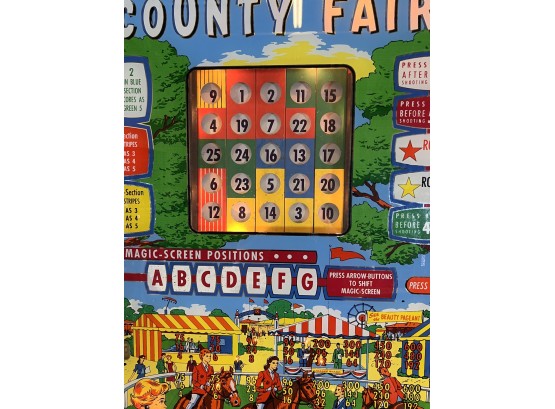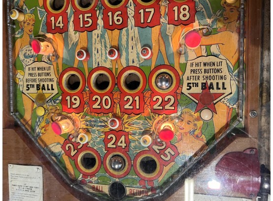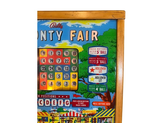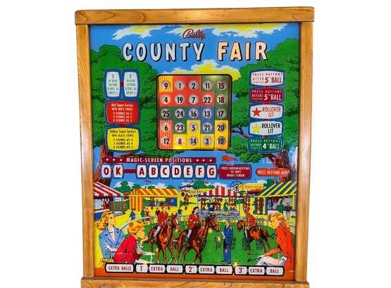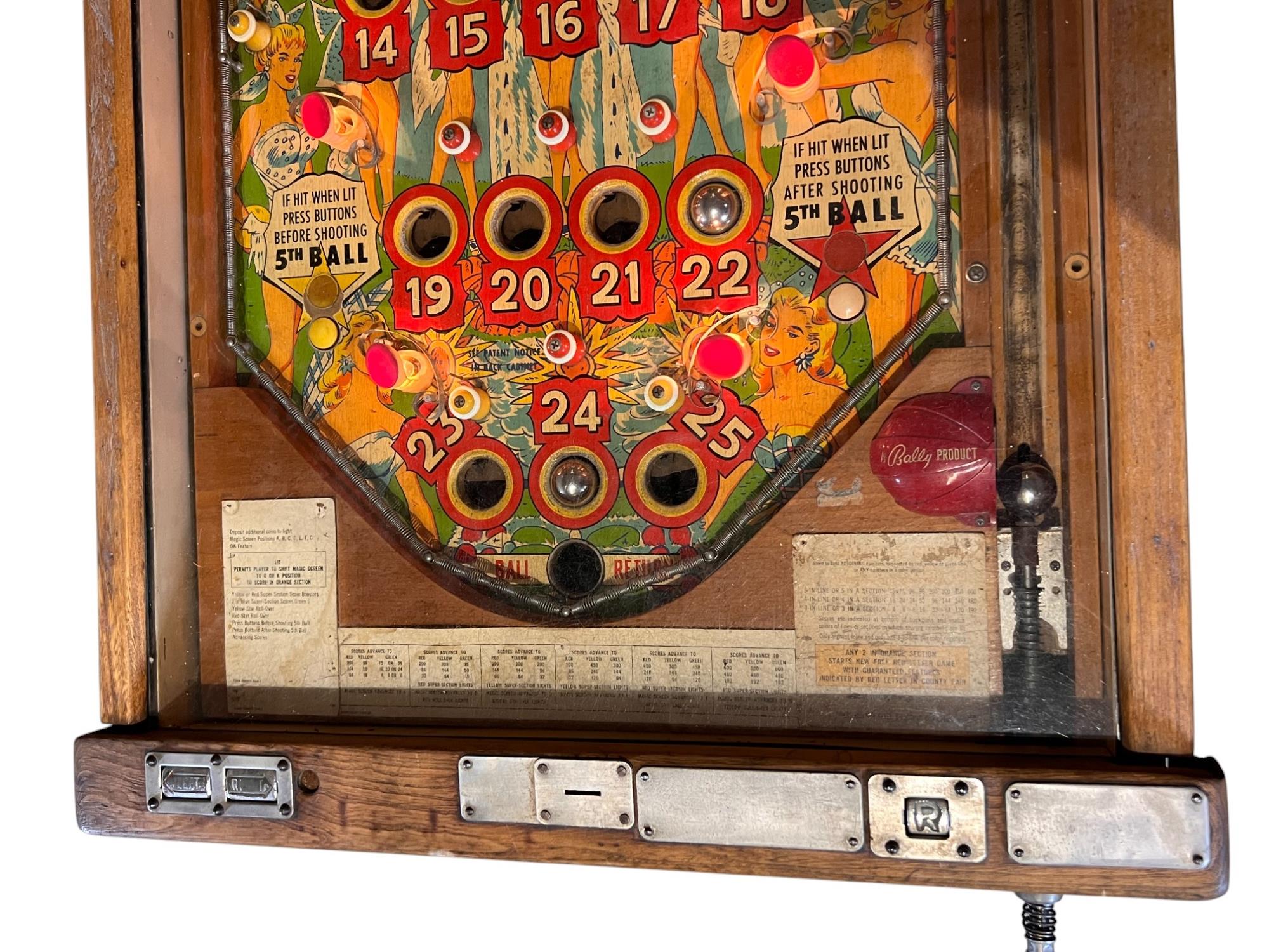 Very interesting 1950's vintage game with intricate and unique play. Wooden rails. 74 1/2" x 27 3/4" x 56" Condition: Currently working at time of cataloging. Wear to wooden case. See photos