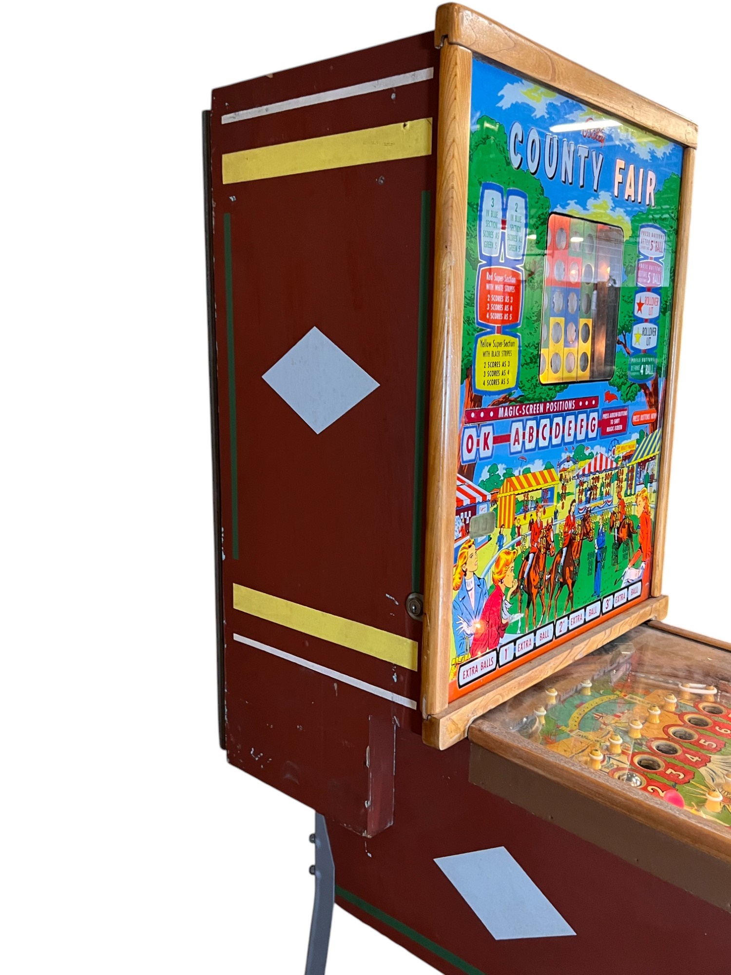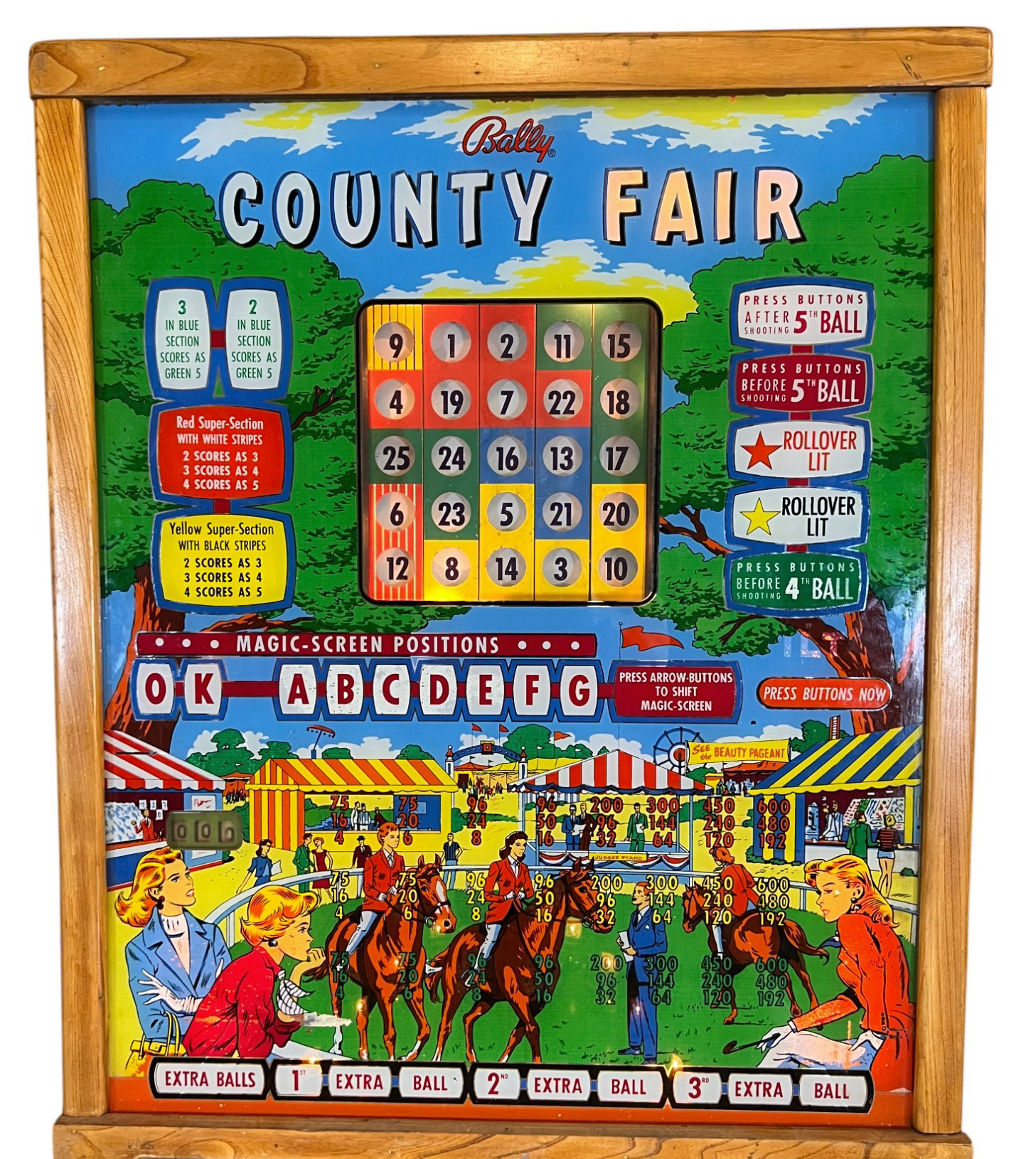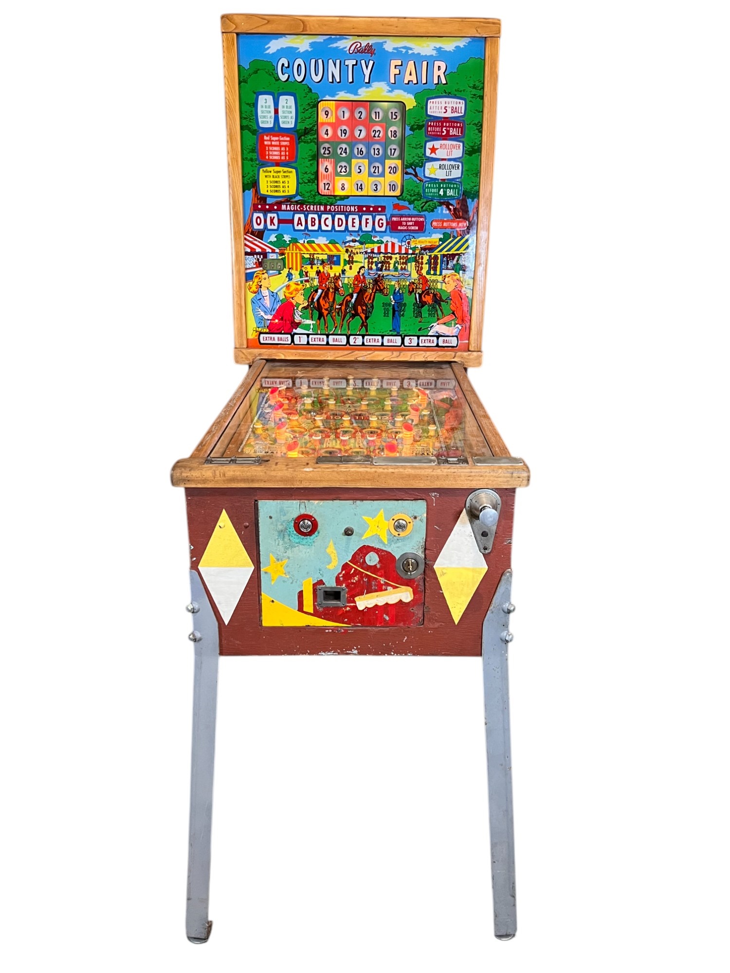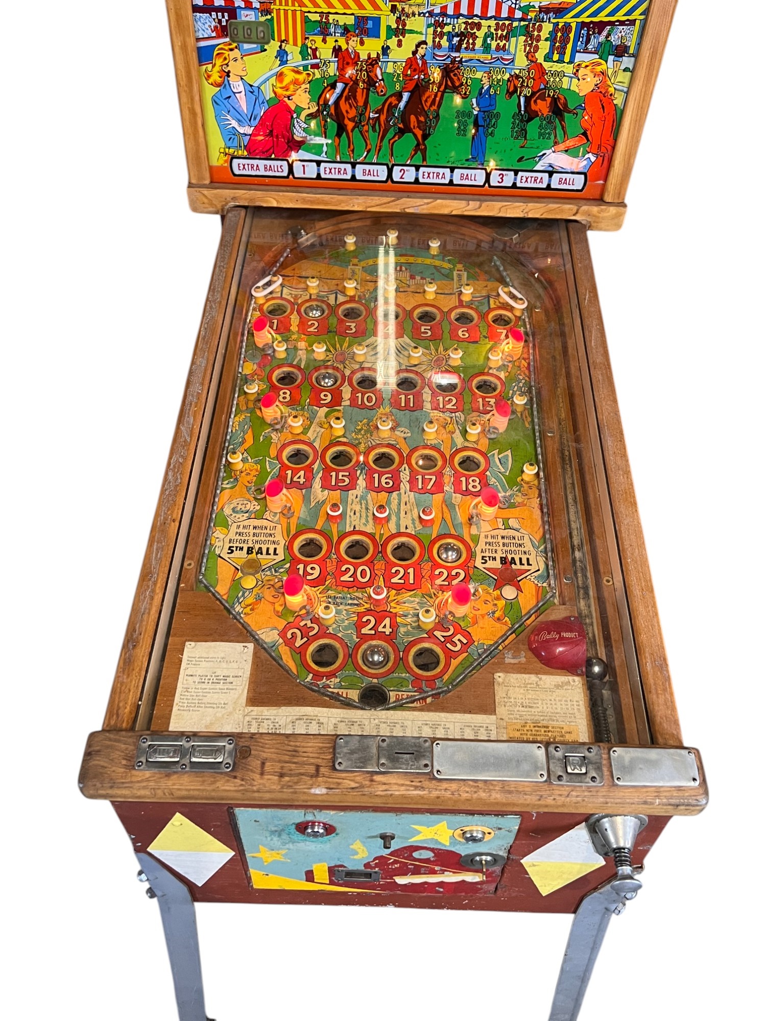 Very interesting 1950's vintage game with intricate and unique play. Wooden rails. 74 1/2" x 27 3/4" x 56" Condition: Currently working at time of cataloging. Wear to wooden case. See photos