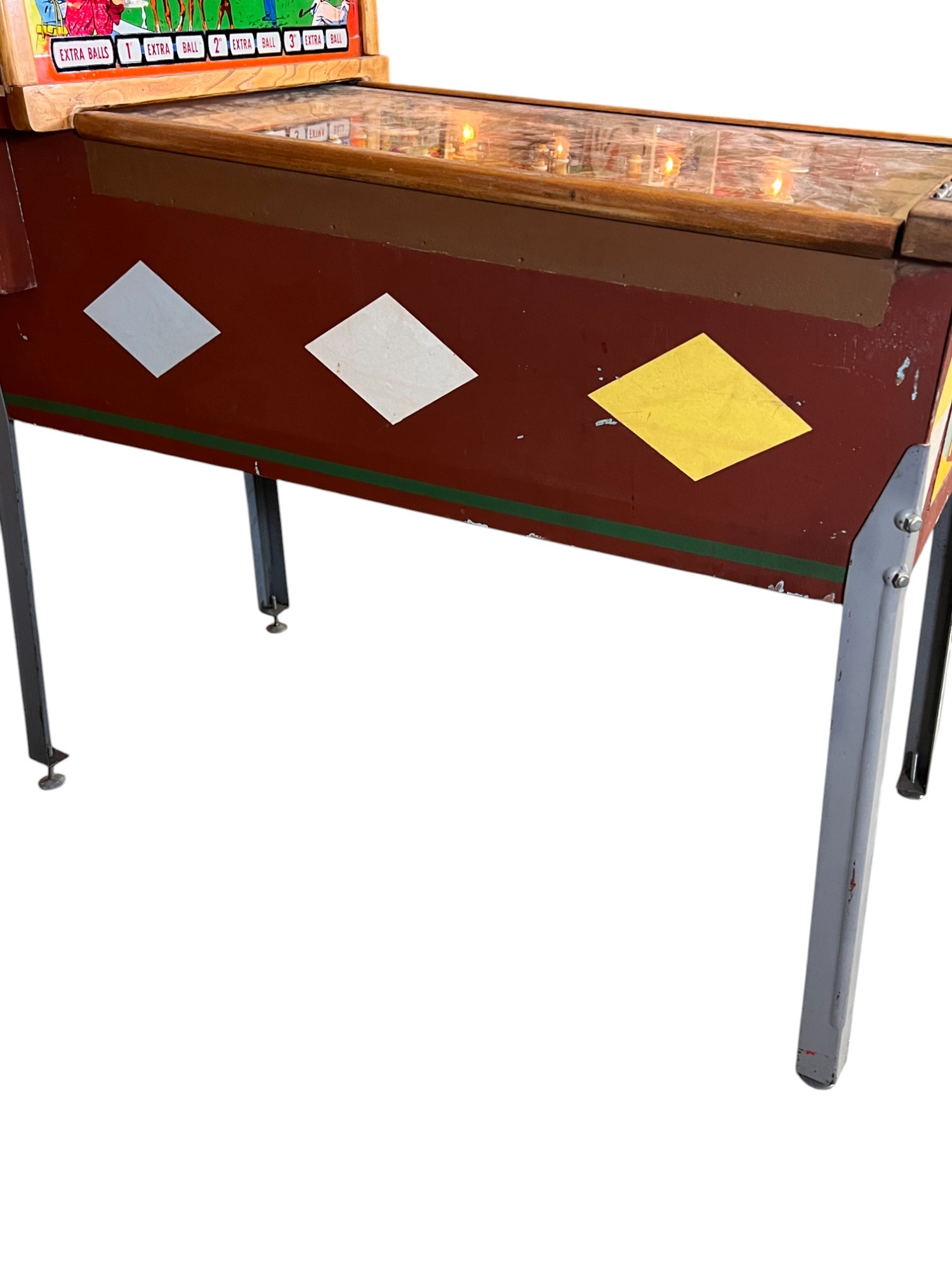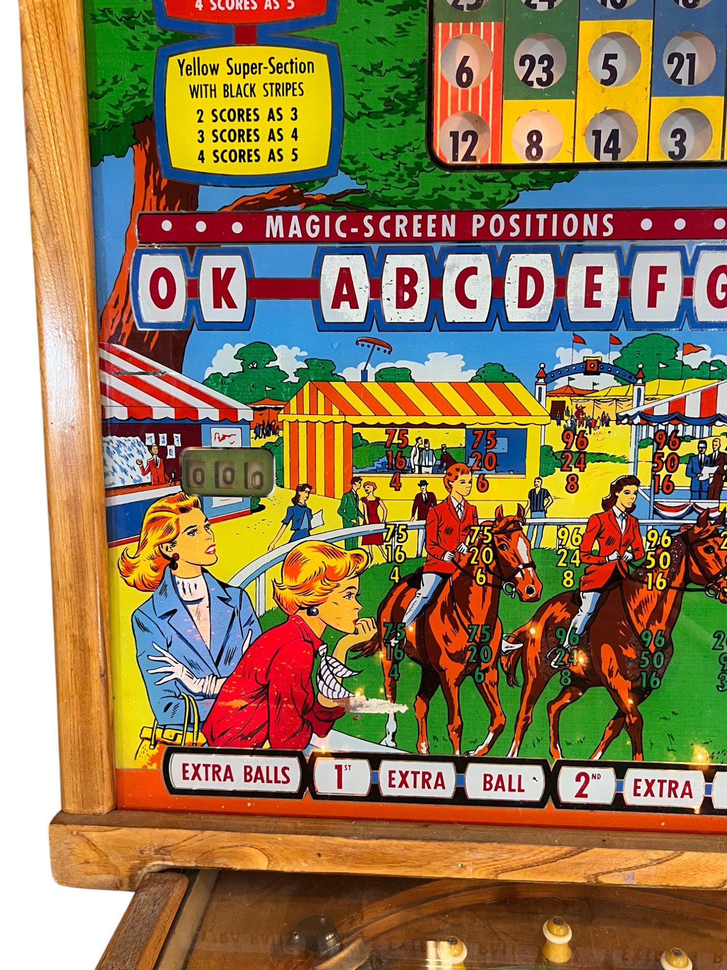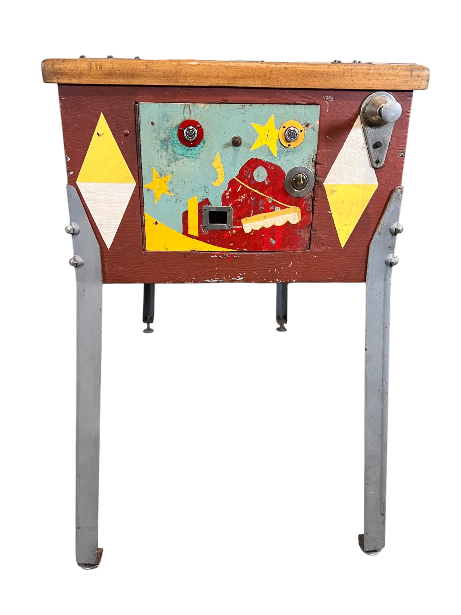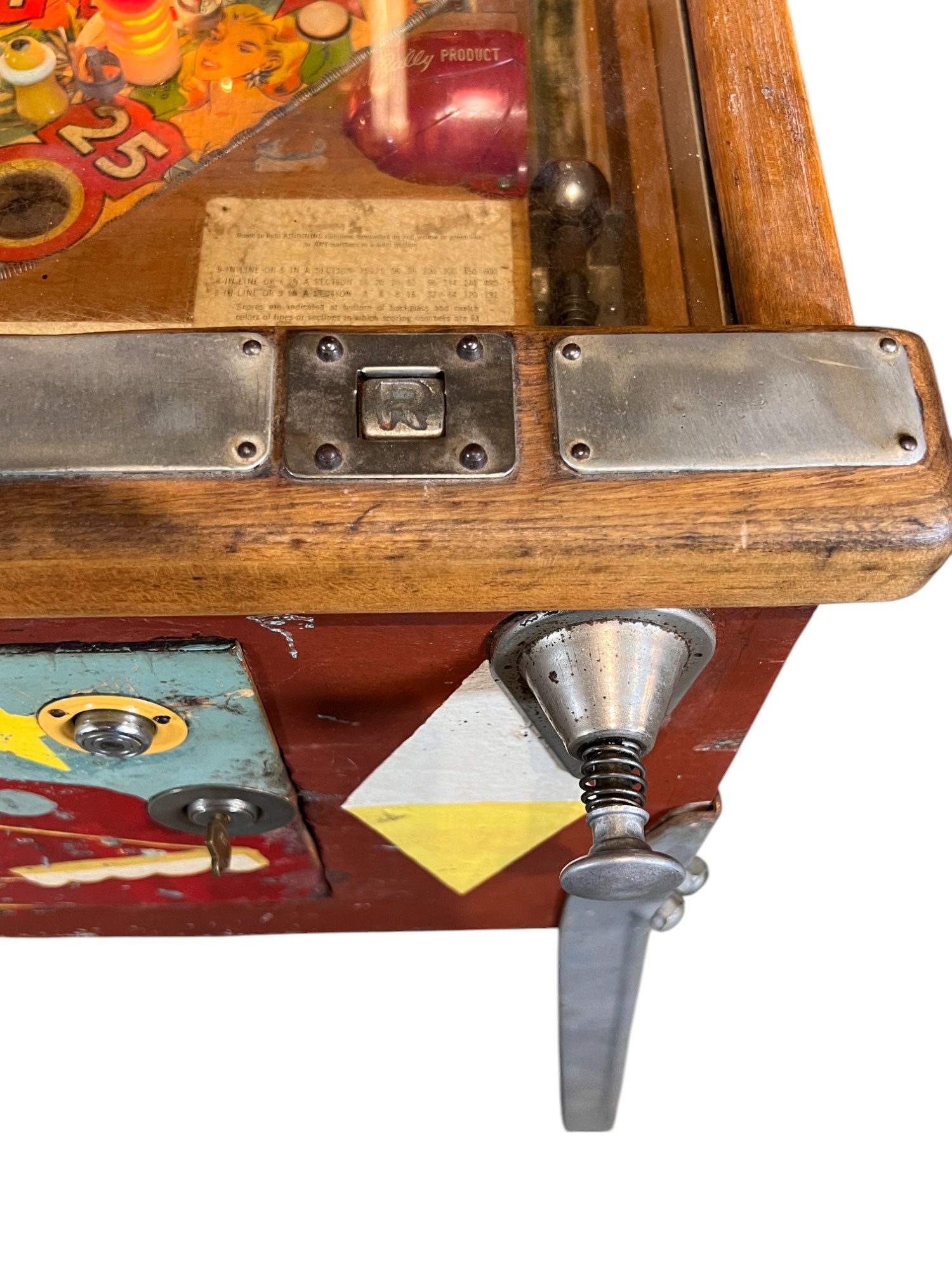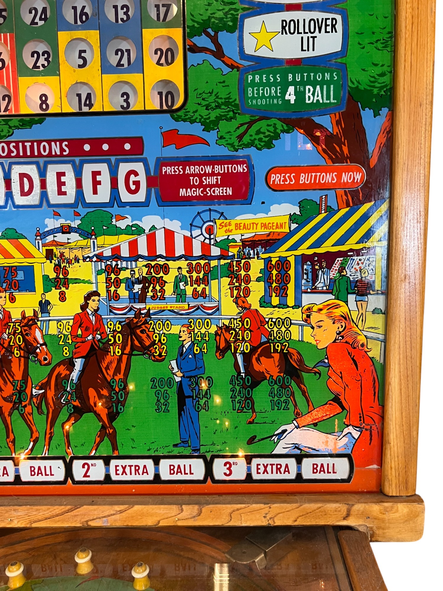 Very interesting 1950's vintage game with intricate and unique play. Wooden rails. 74 1/2" x 27 3/4" x 56" Condition: Currently working at time of cataloging. Wear to wooden case. See photos