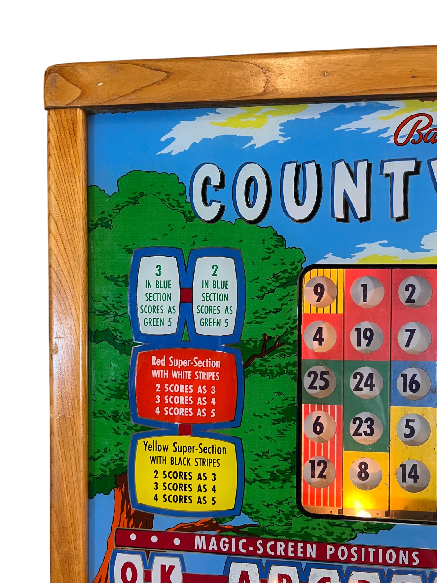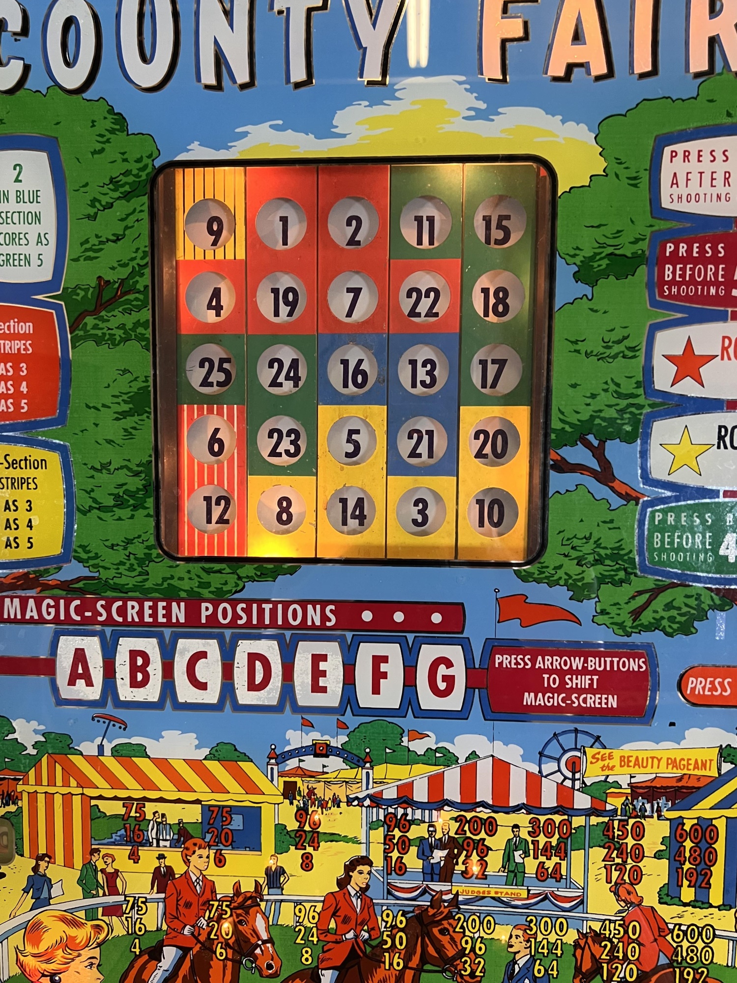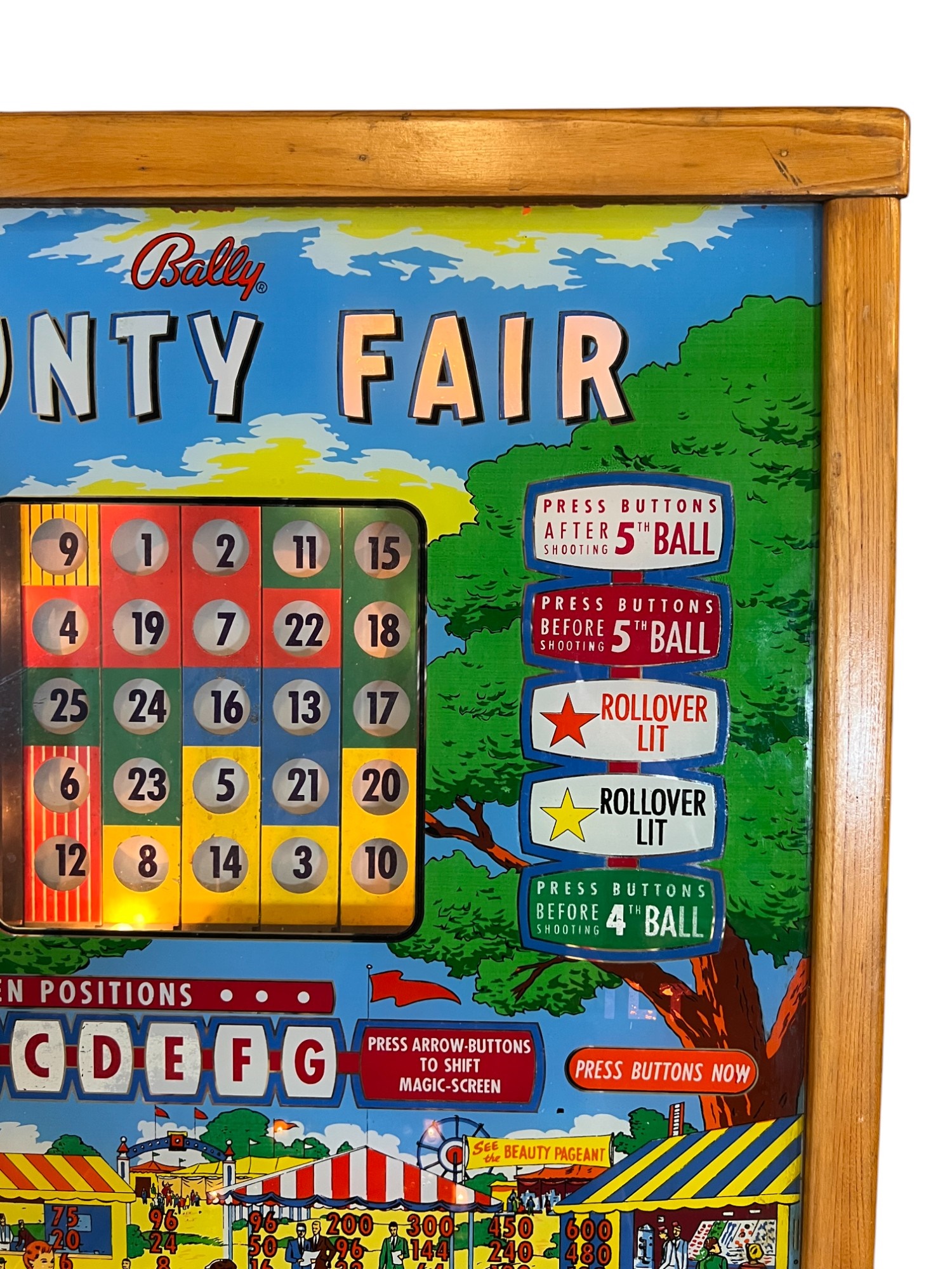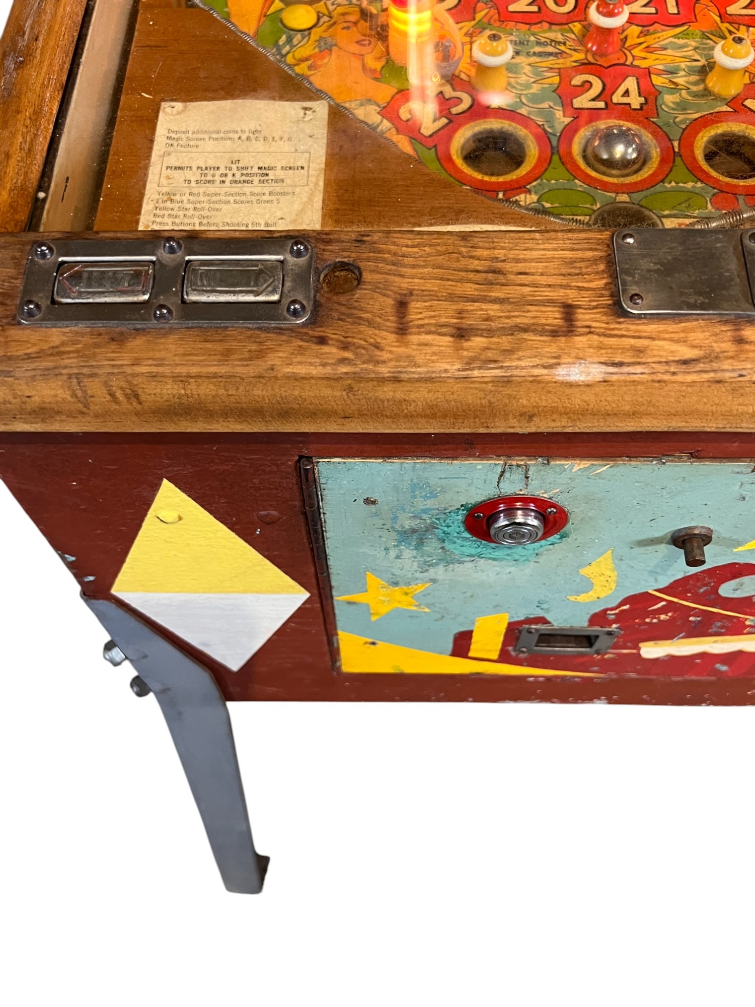 Very interesting 1950's vintage game with intricate and unique play. Wooden rails. 74 1/2" x 27 3/4" x 56" Condition: Currently working at time of cataloging. Wear to wooden case. See photos