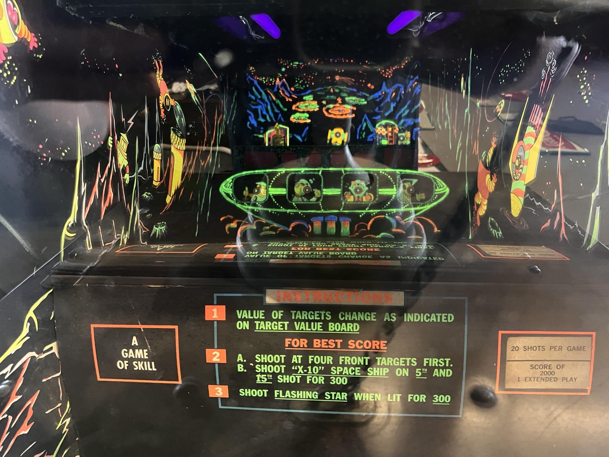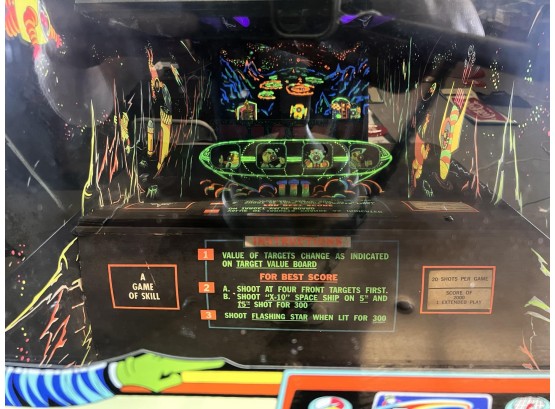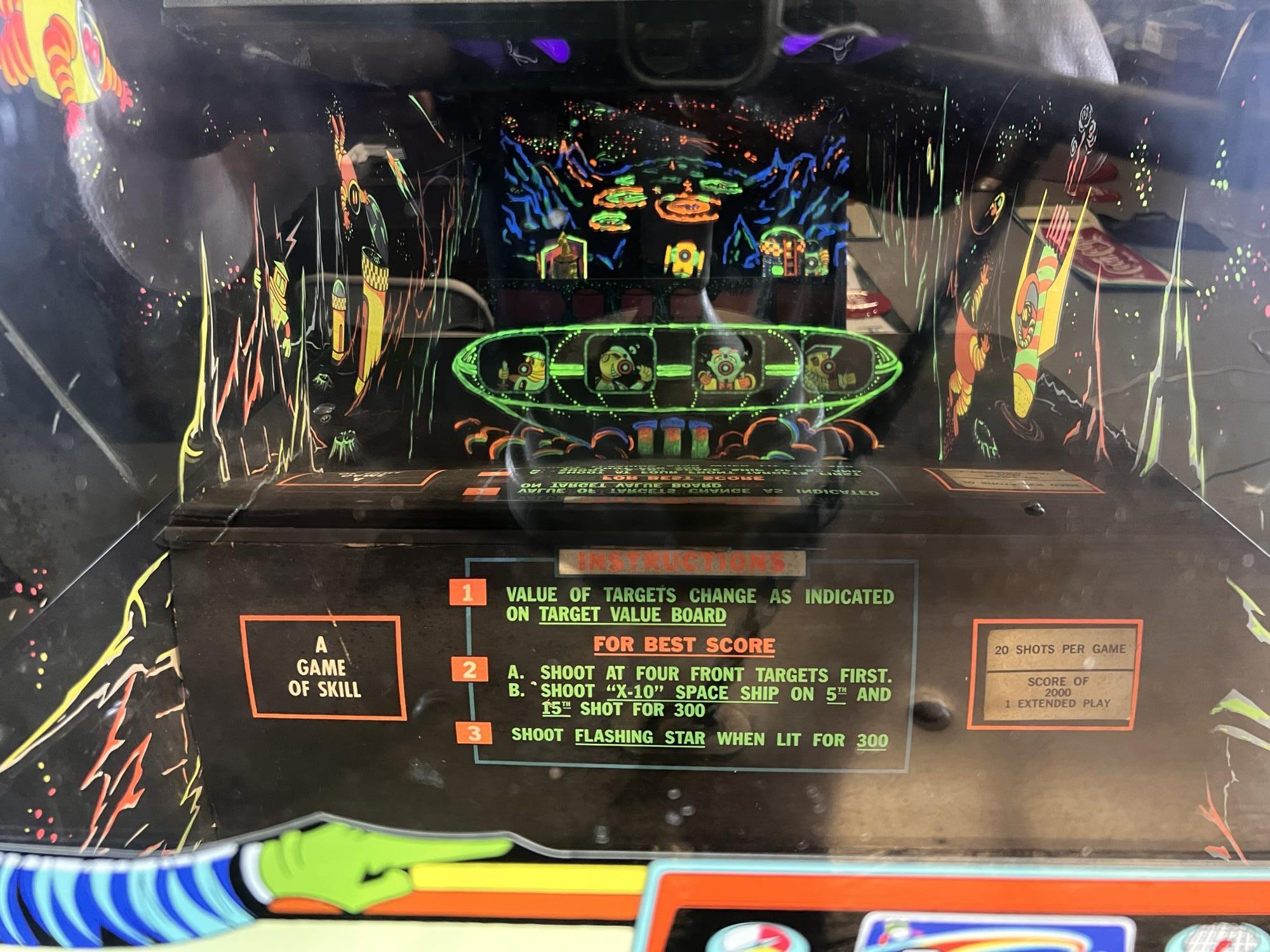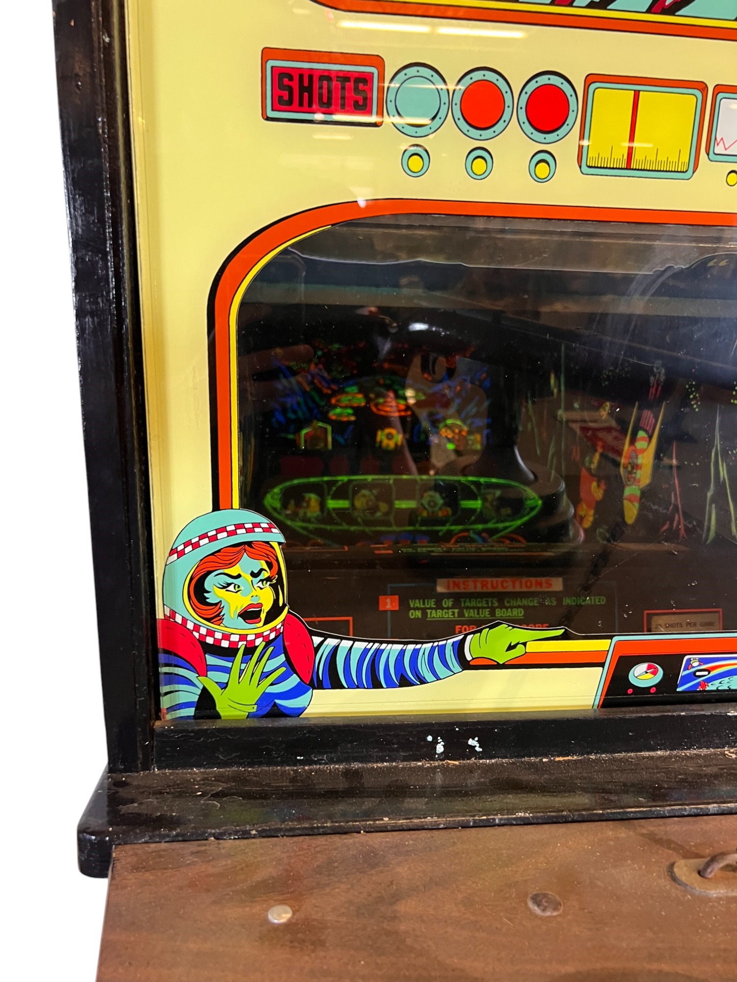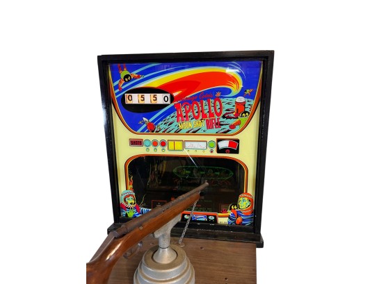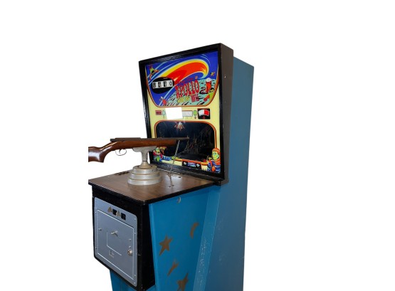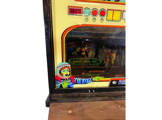 1960/70's vintage shooting game. 74" x 25 3/4" x 34" case Condition: Currently working at time of cataloging. Wear to wooden case. See photos Temp No 6763