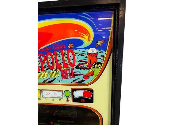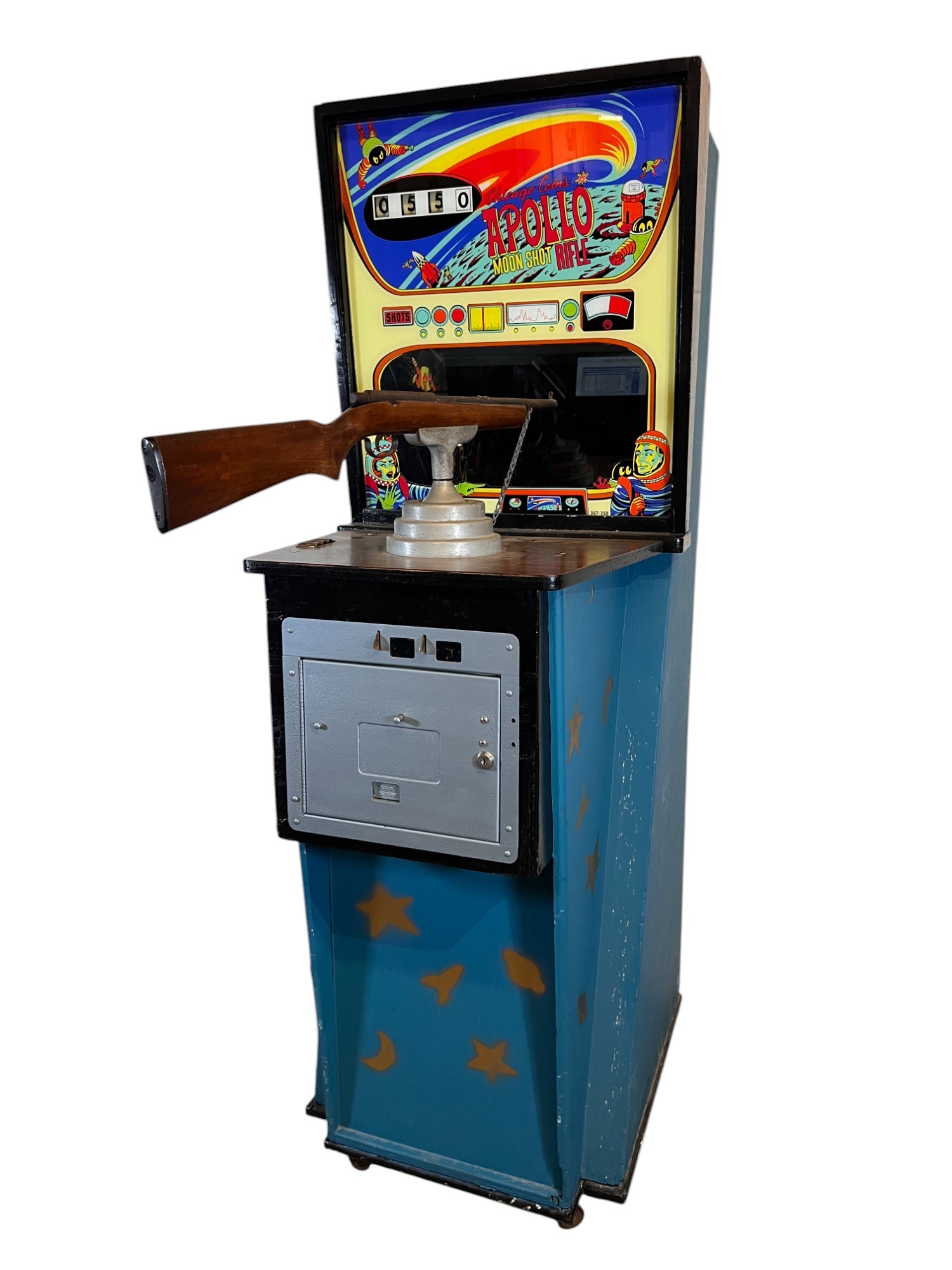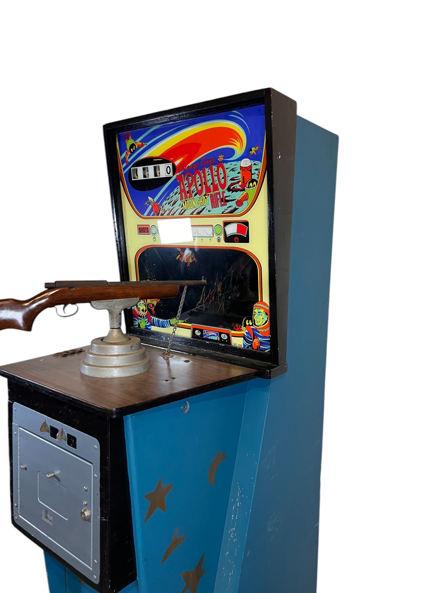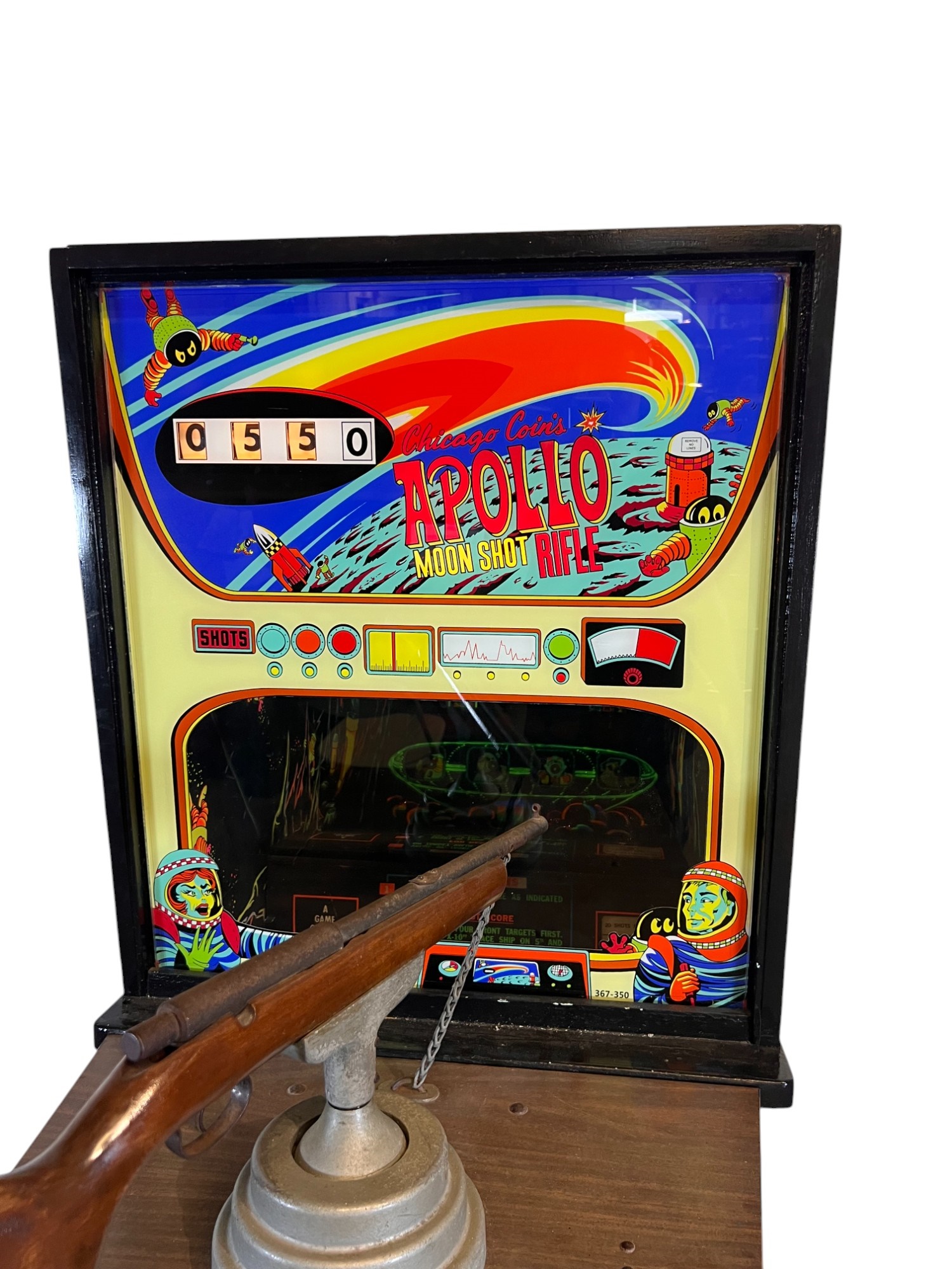 1960/70's vintage shooting game. 74" x 25 3/4" x 34" case Condition: Currently working at time of cataloging. Wear to wooden case. See photos Temp No 6763