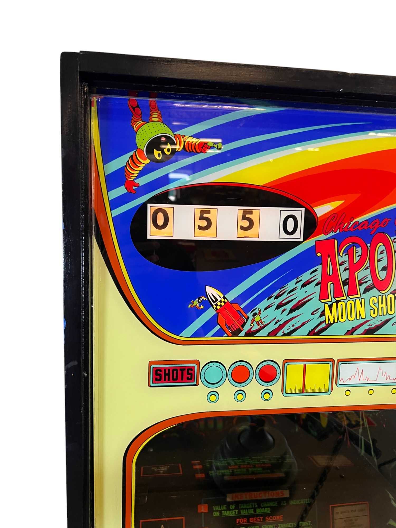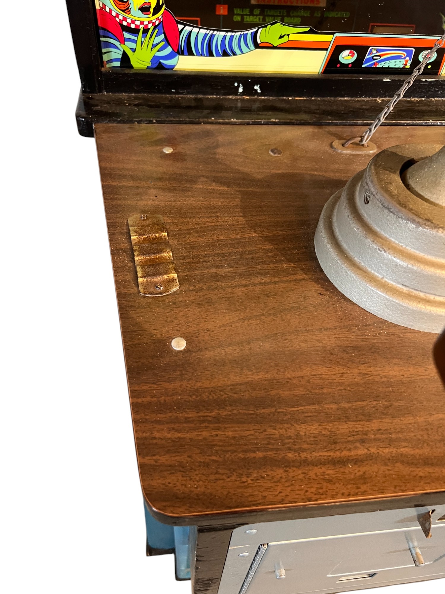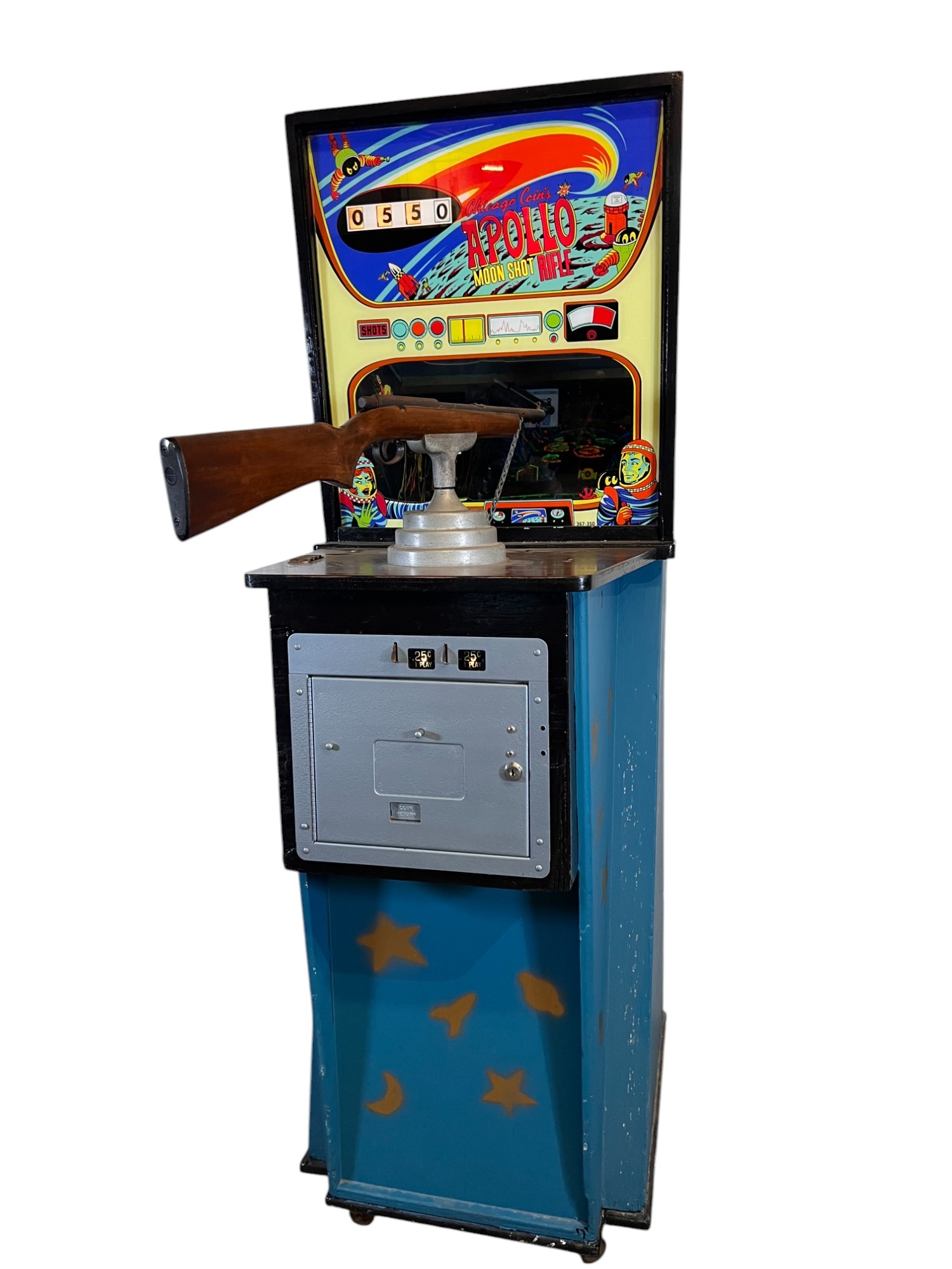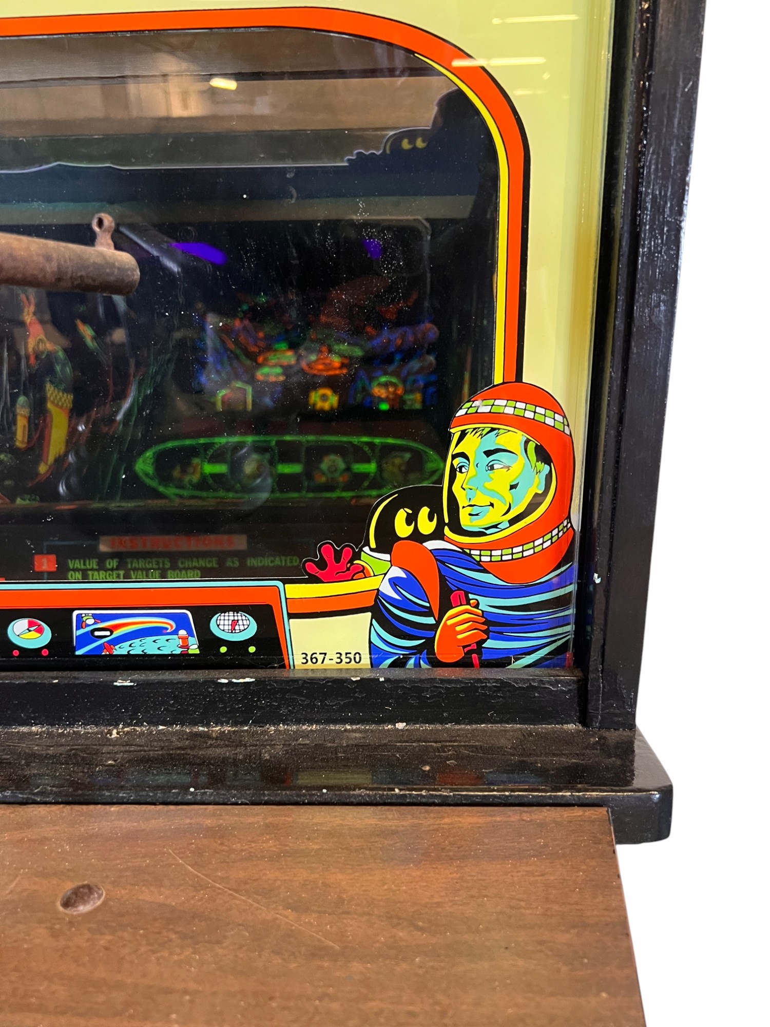 1960/70's vintage shooting game. 74" x 25 3/4" x 34" case Condition: Currently working at time of cataloging. Wear to wooden case. See photos Temp No 6763