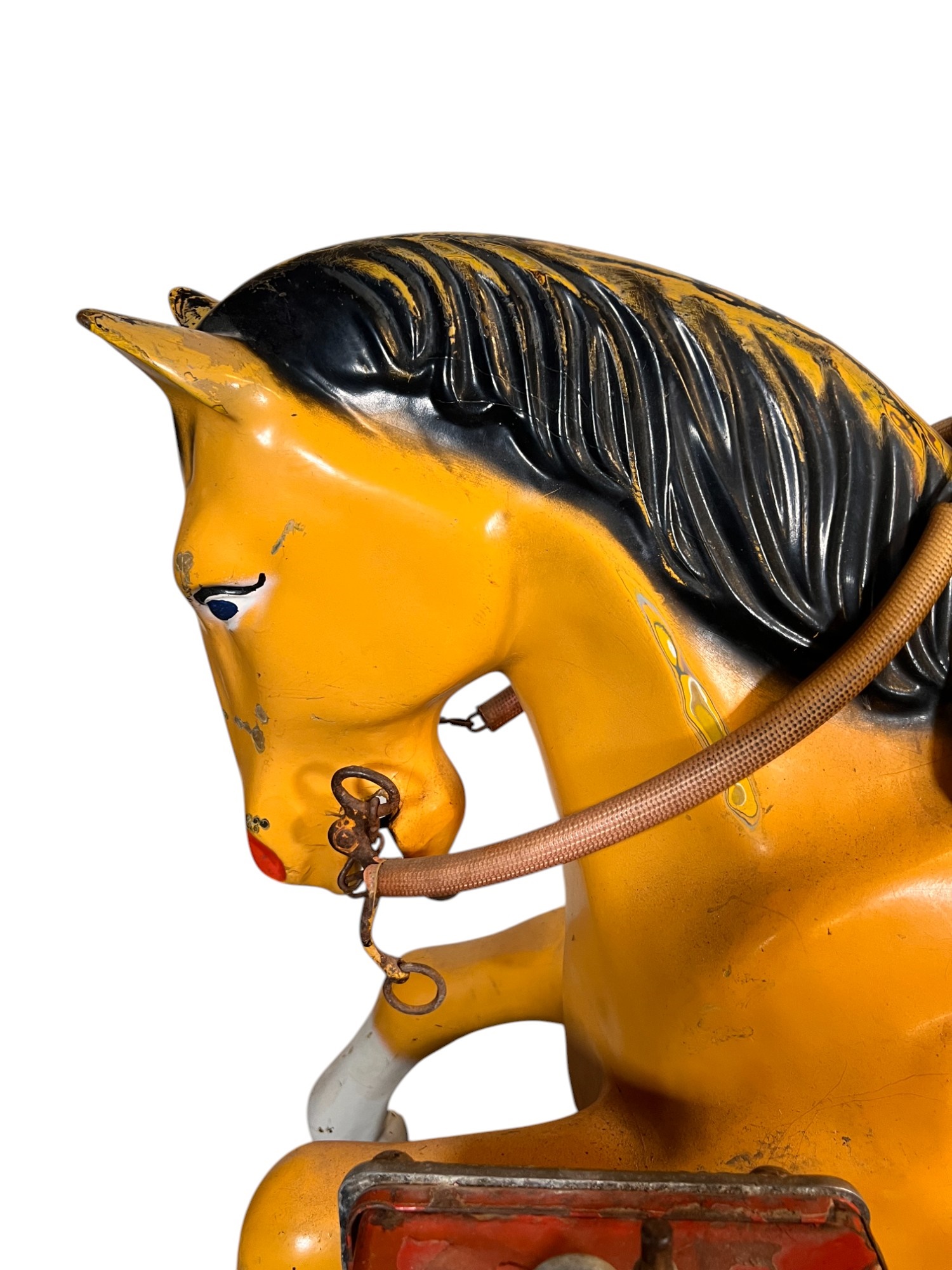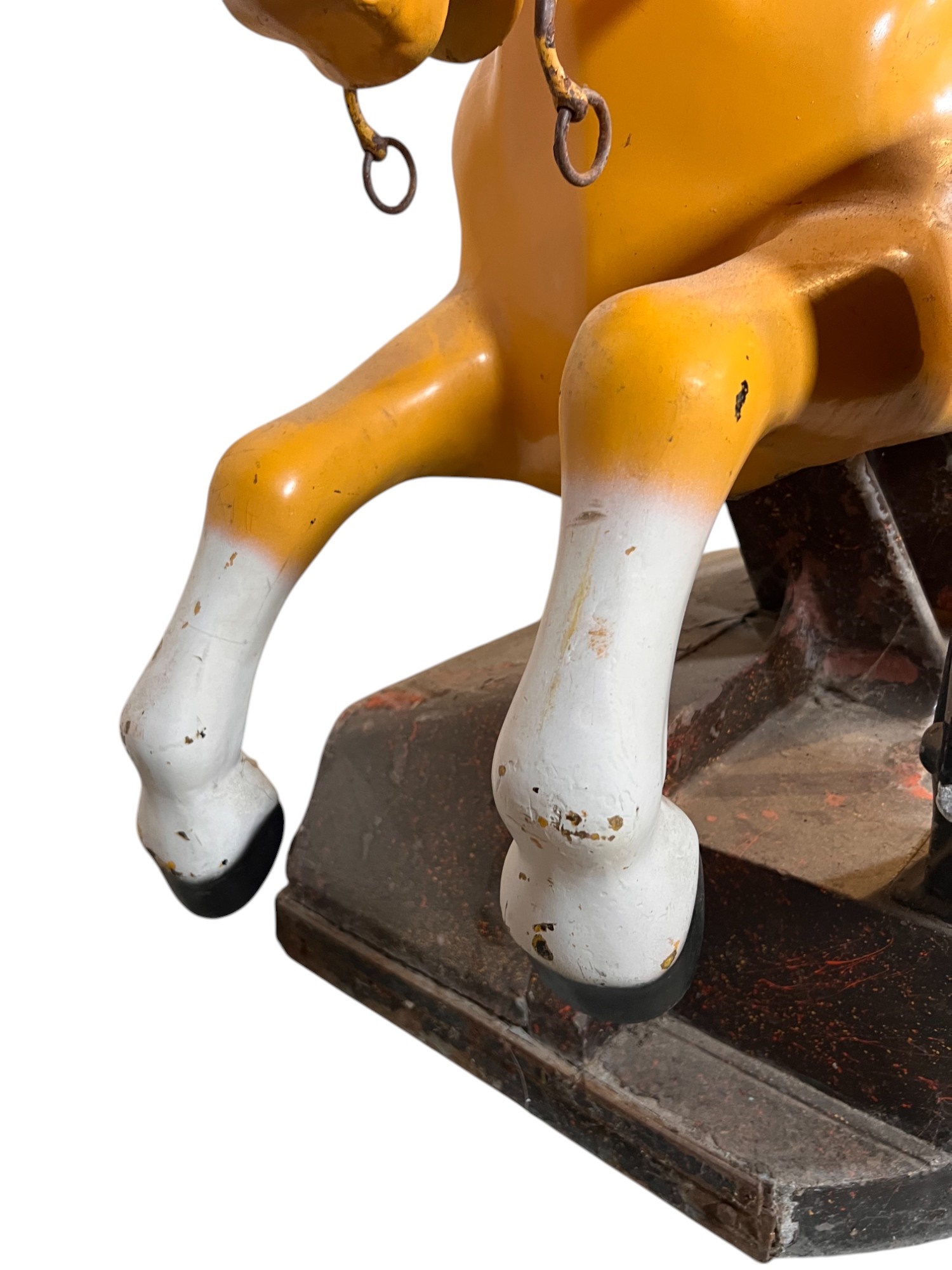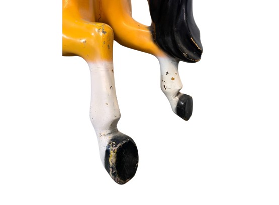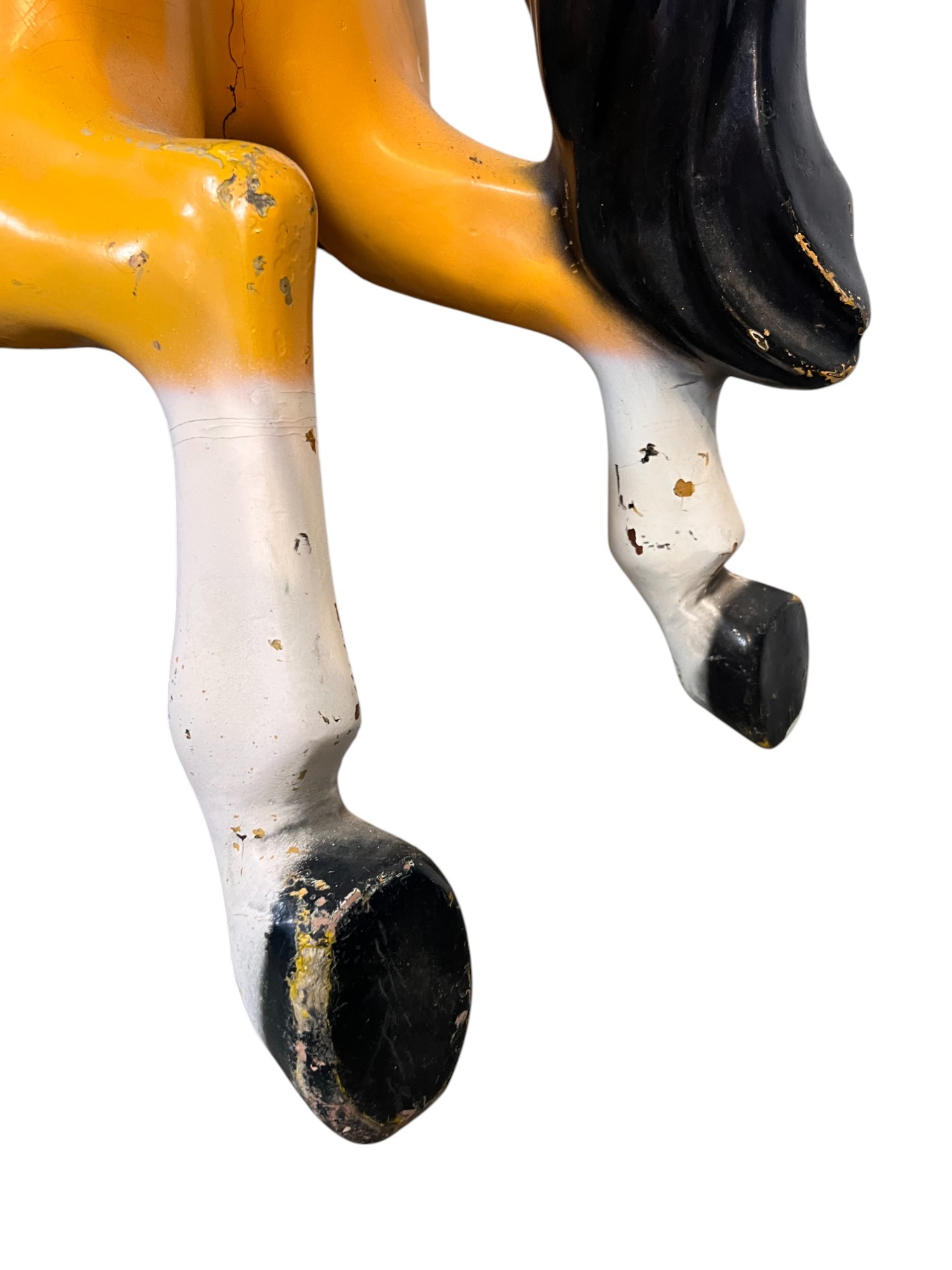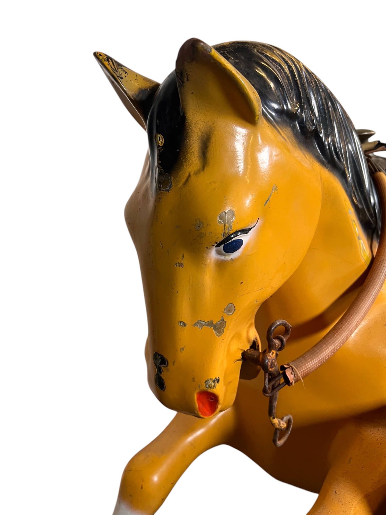 Mid century vintage fiberglass body with original leather saddle. Approx 50" long Condition: Scattered wear to surface and paint. Temp No 6764