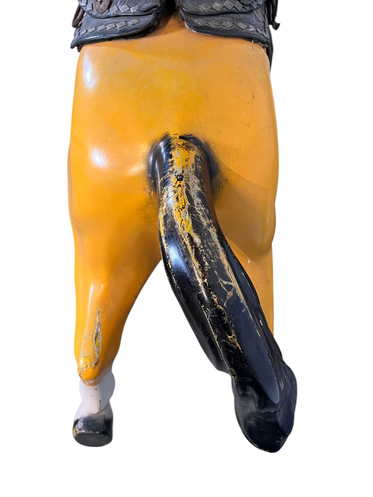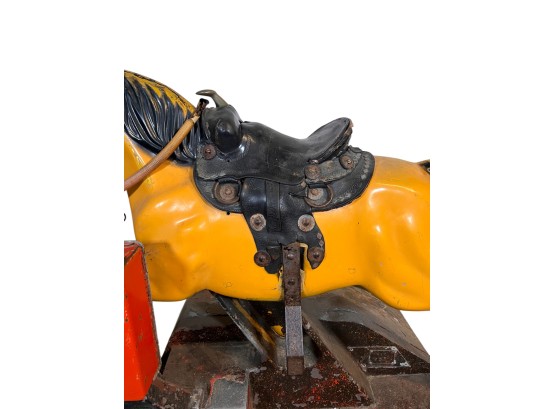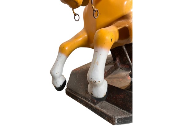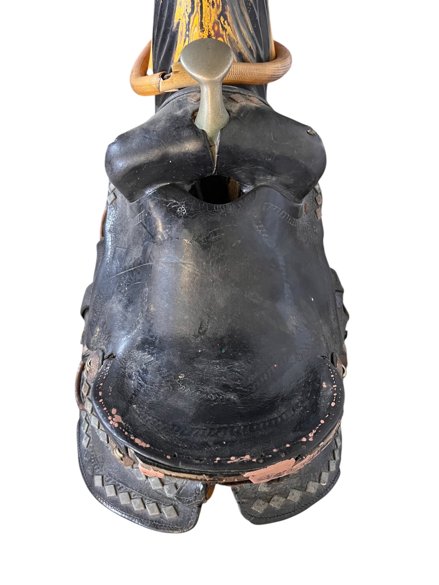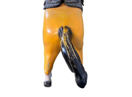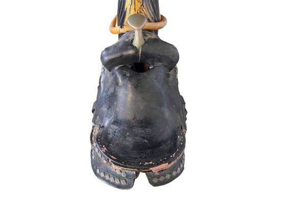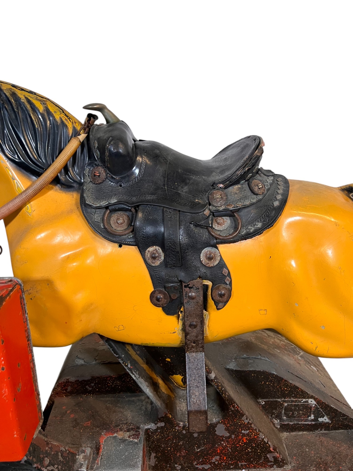 Mid century vintage fiberglass body with original leather saddle. Approx 50" long Condition: Scattered wear to surface and paint. Temp No 6764