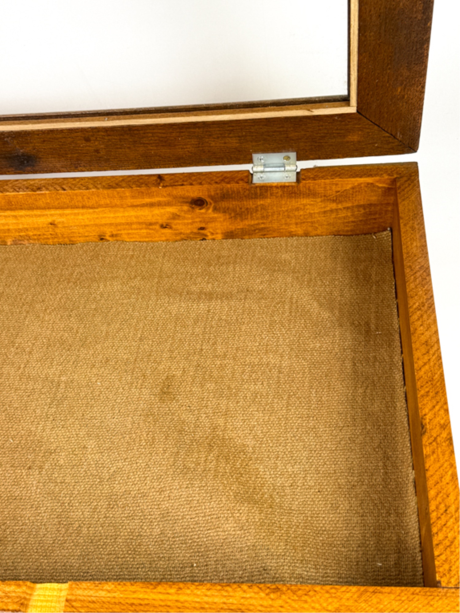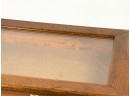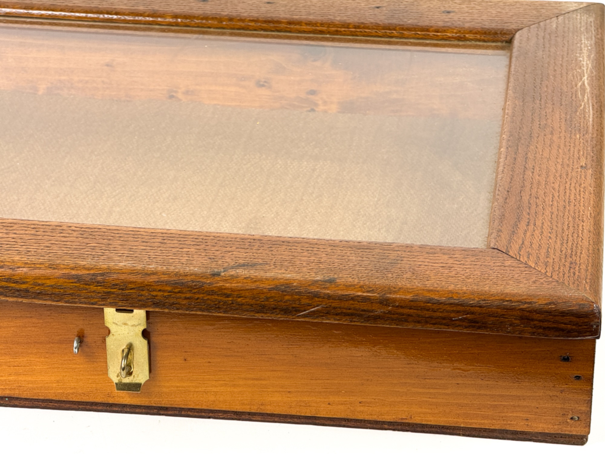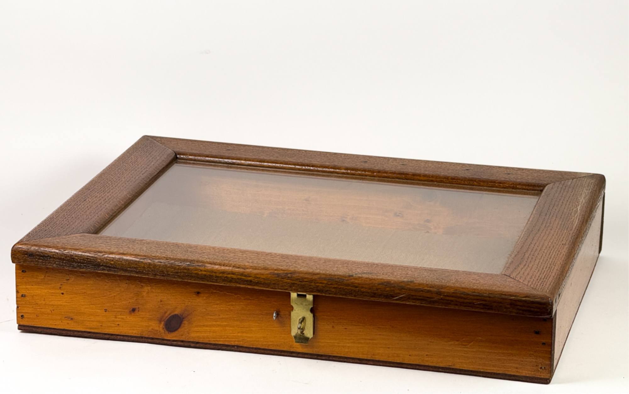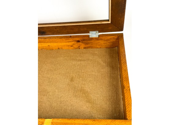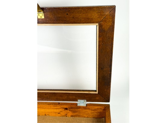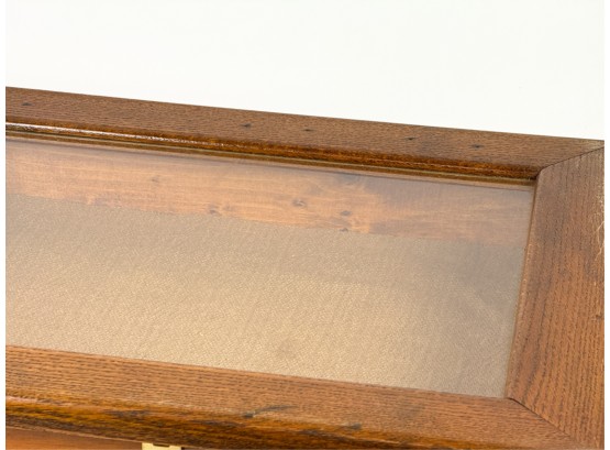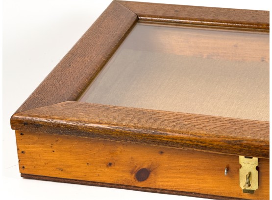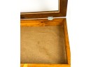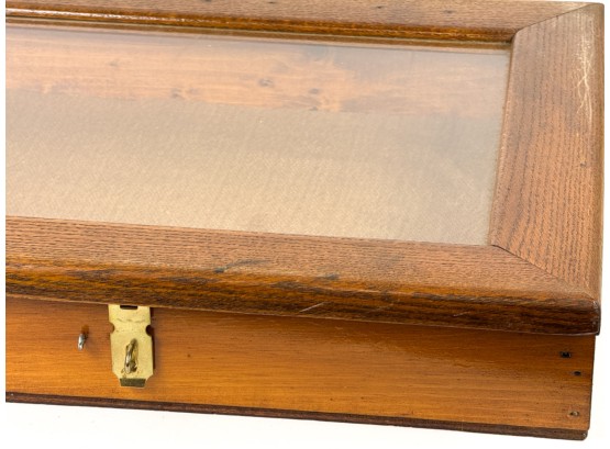 With glass top and locking mechanism. 4 x 21 x 16 inches. Condition: Good. Temp No 4240