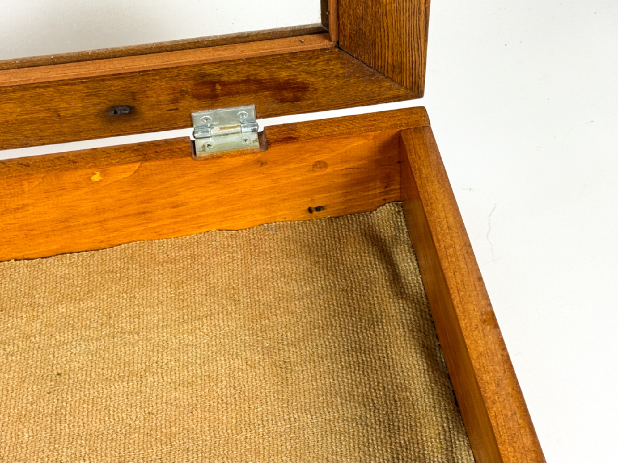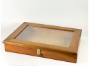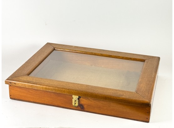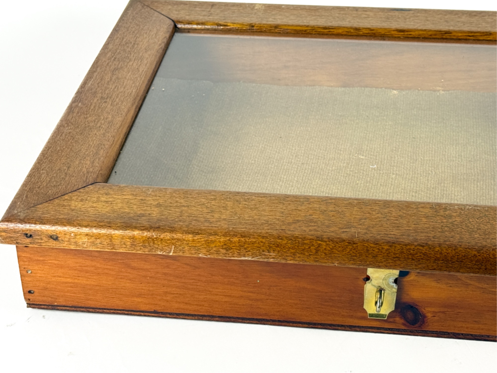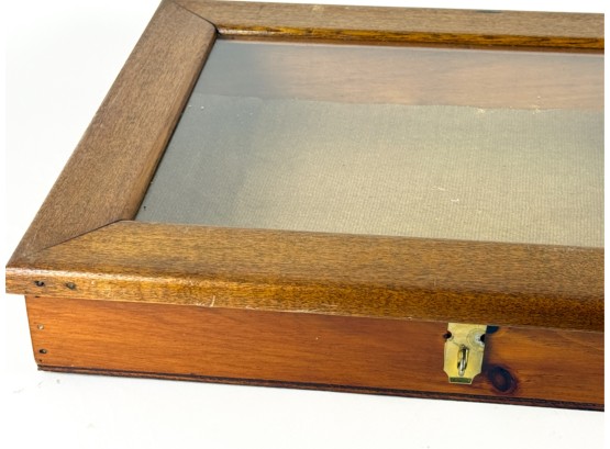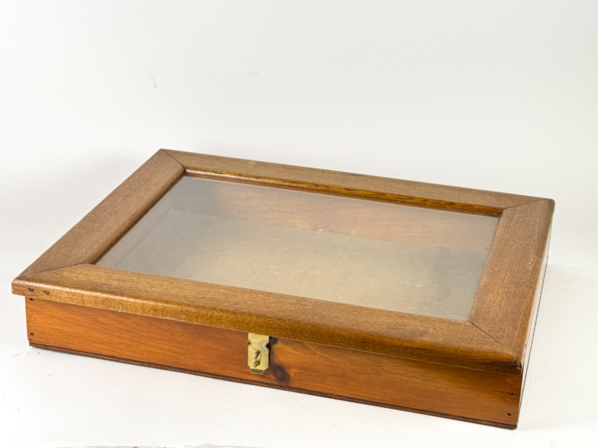 With glass top and locking mechanism. 4 x 21 x 16 inches. Condition: Good. Temp No 4241