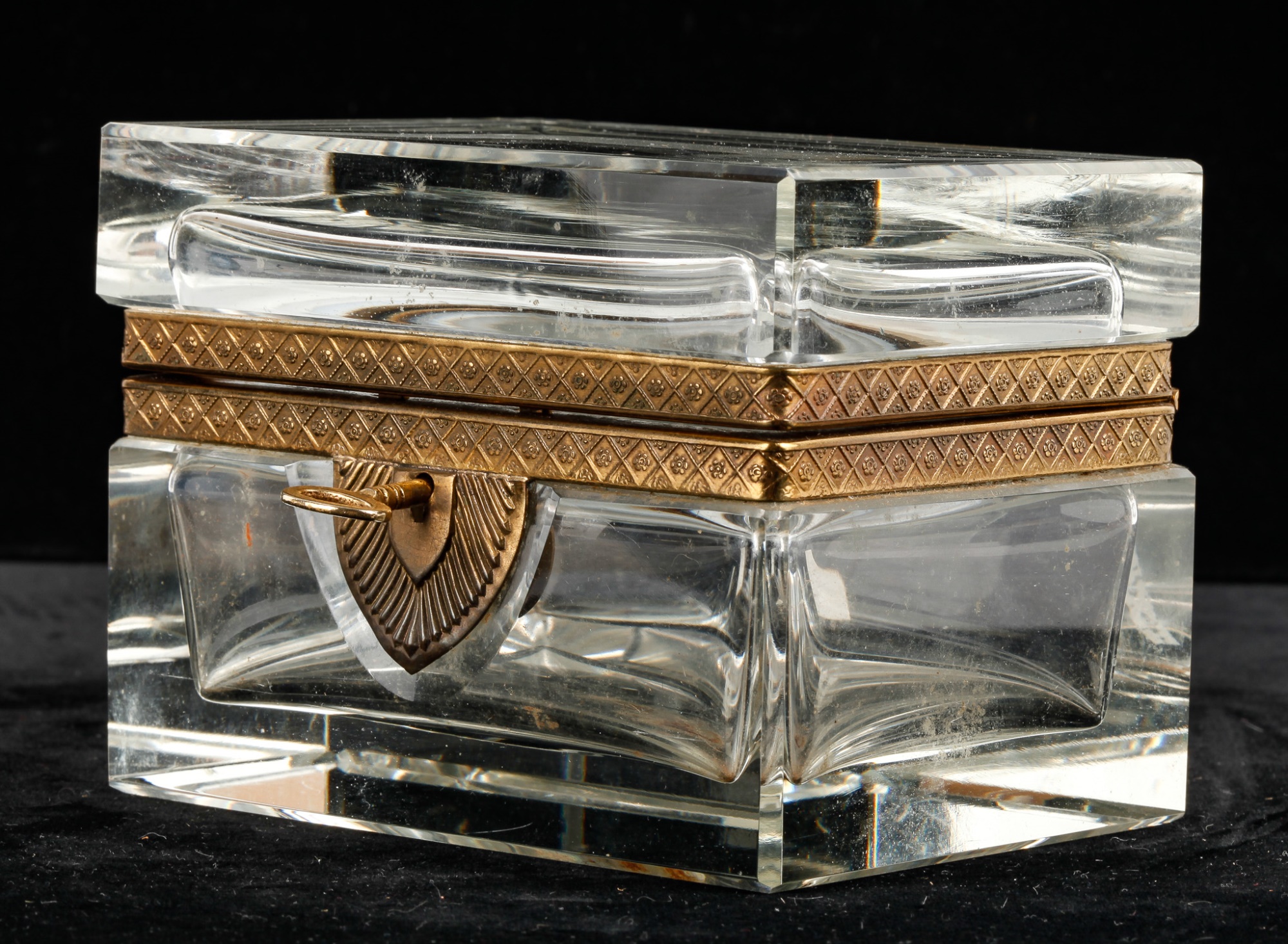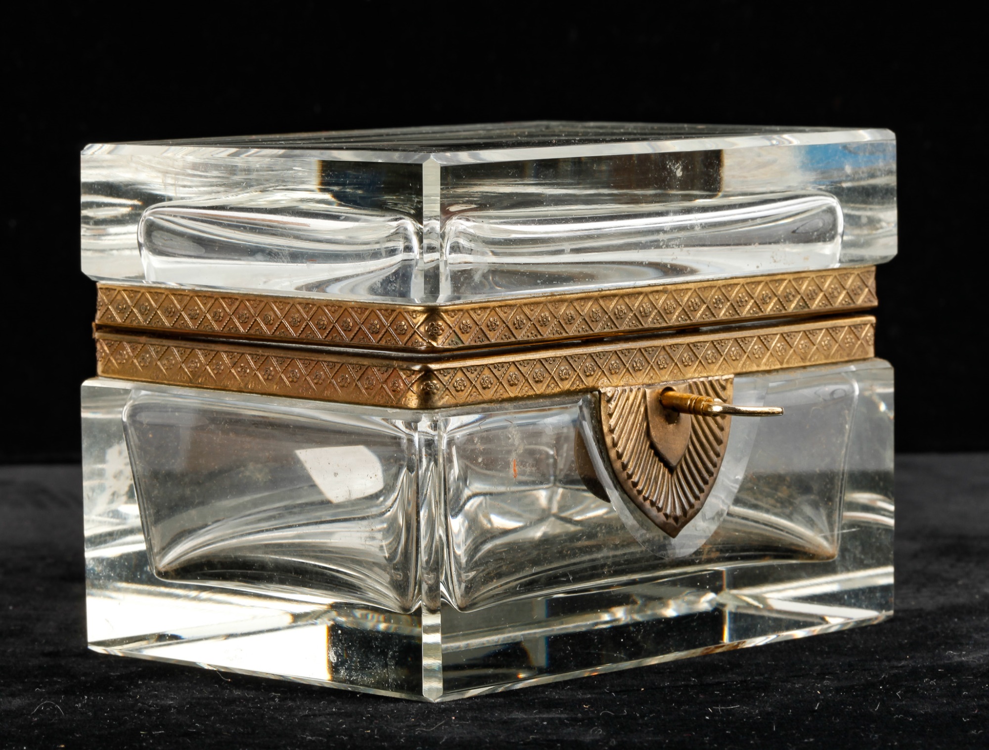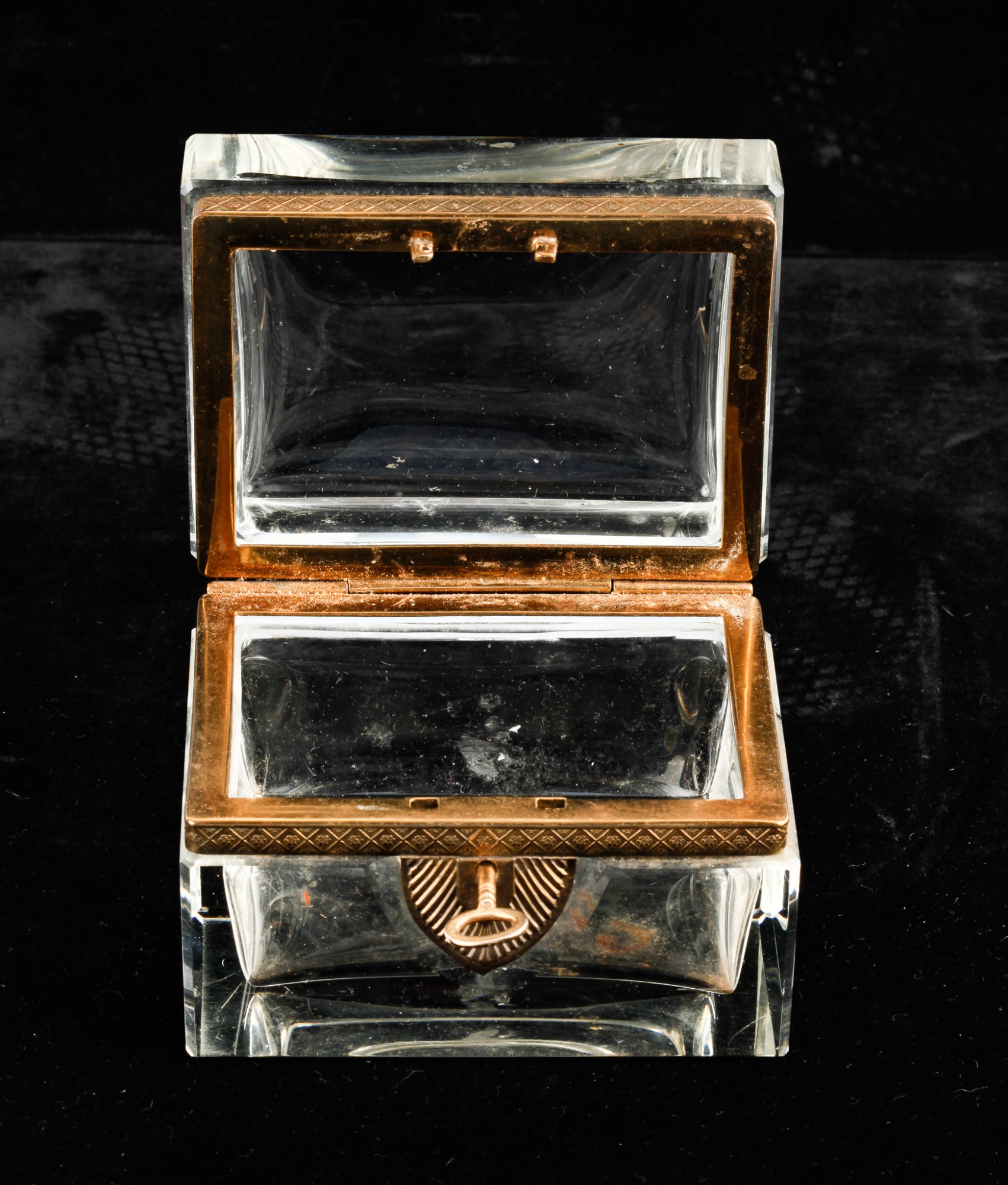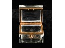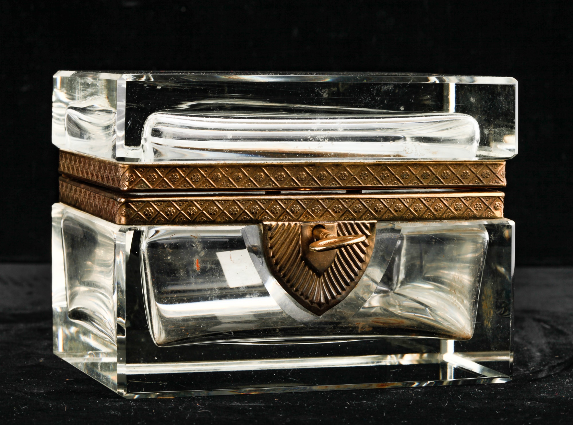 With lock and key. Unsigned. 3 1/2" x 4 3/4" x 3 1/2". Heavy