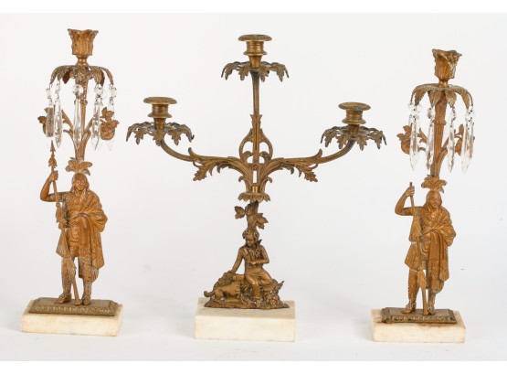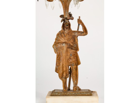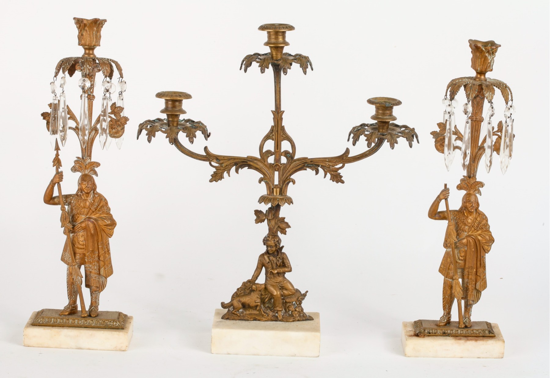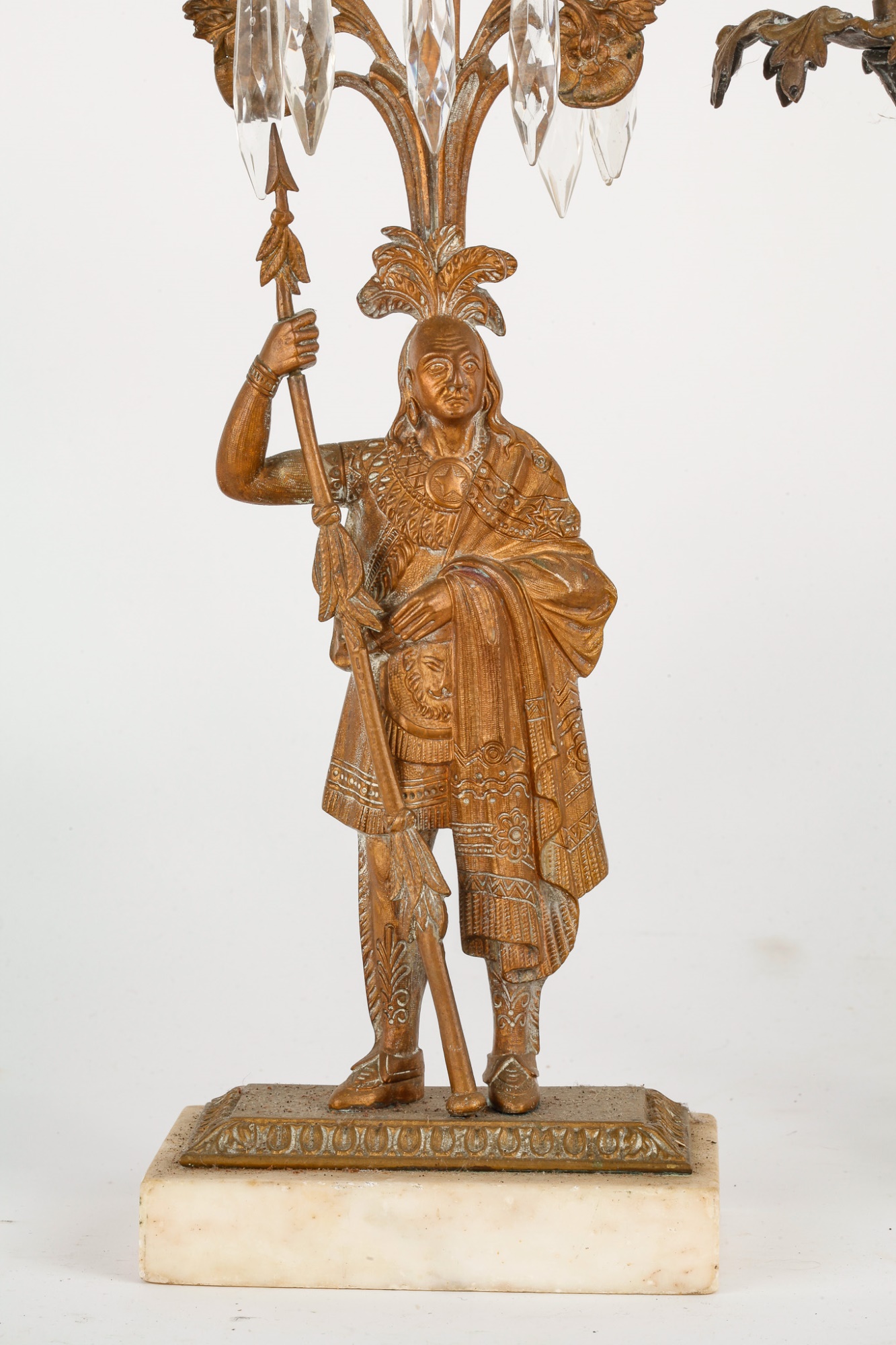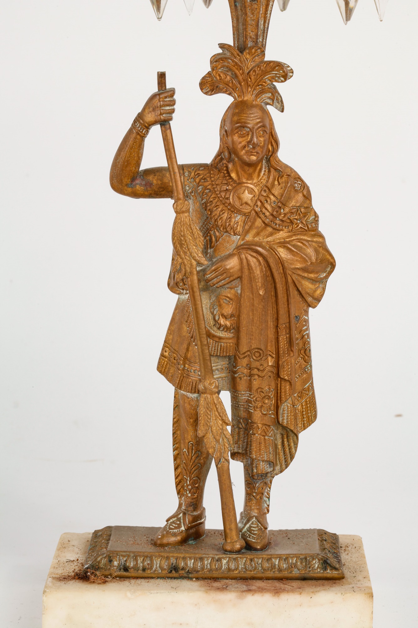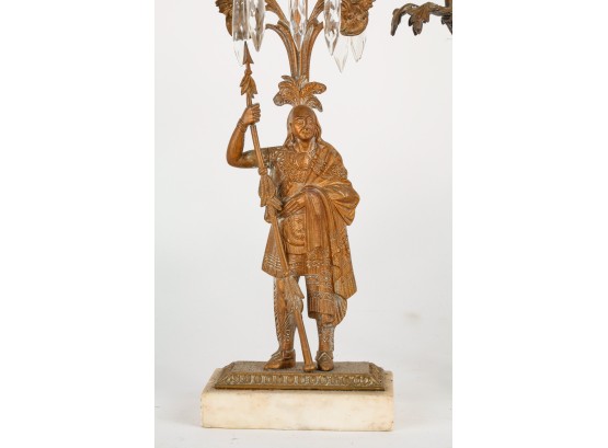 Brass/bronze Native American standing outside pair with a boy and his dog. All on marble. Some prisms present, not all. Center 18" x 15" x 4"