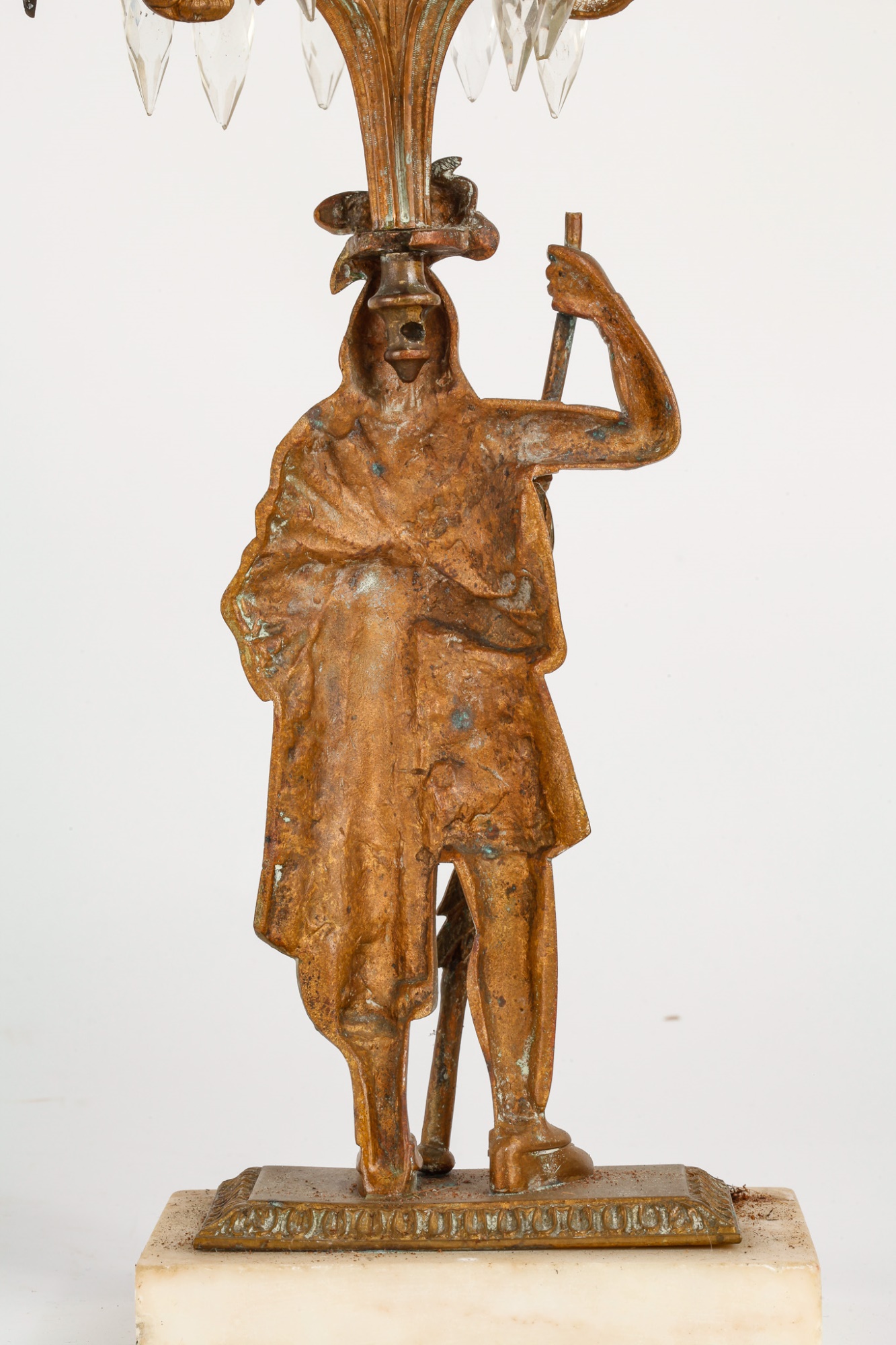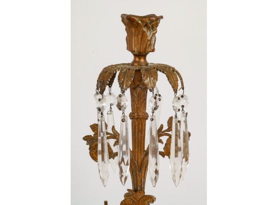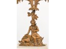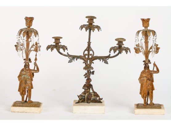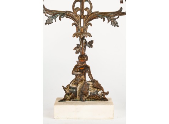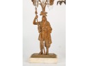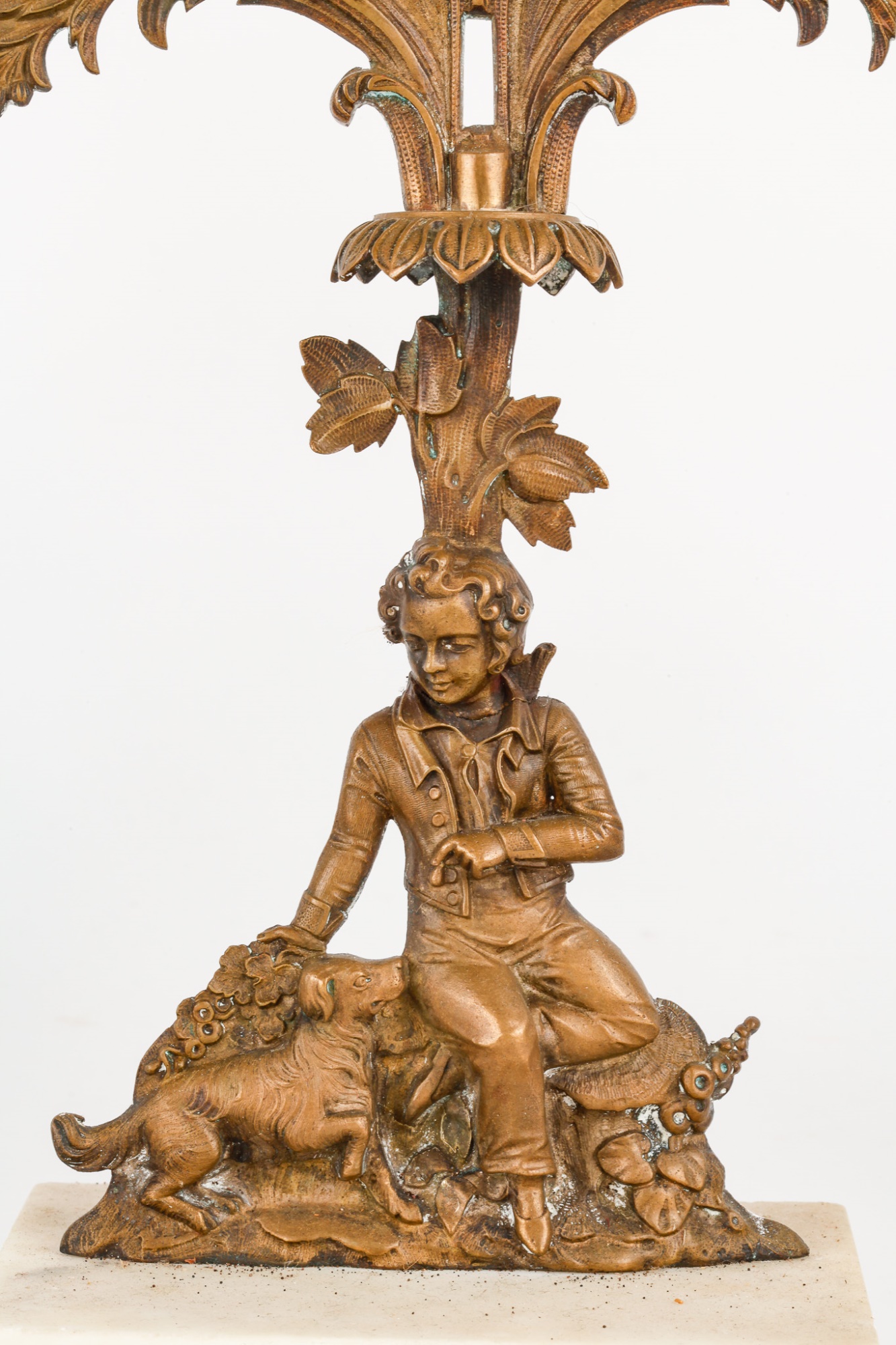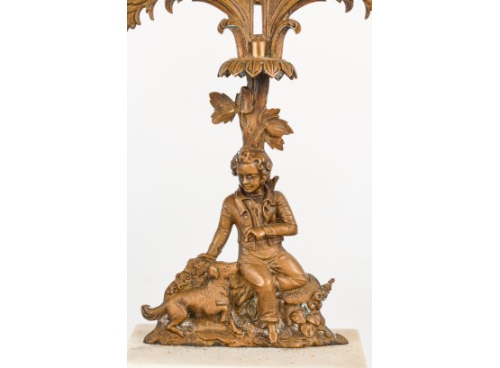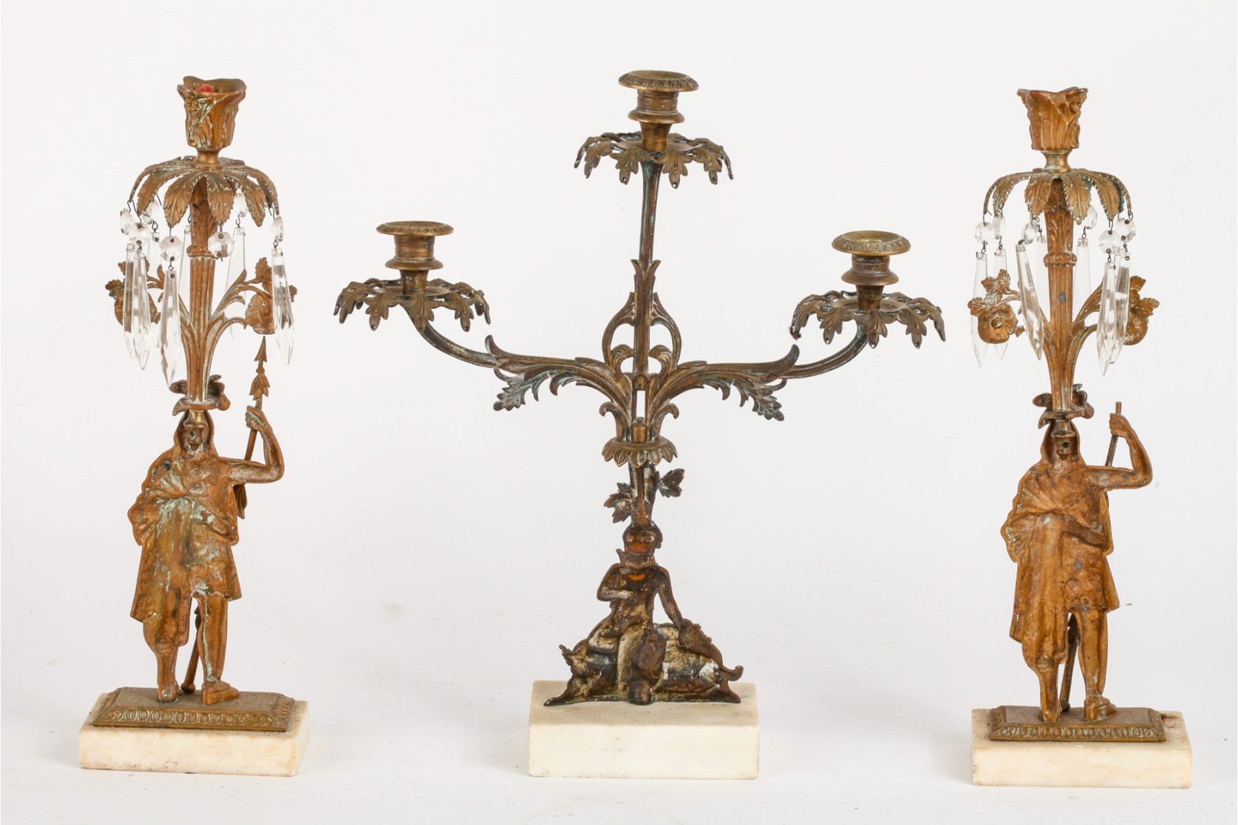 Brass/bronze Native American standing outside pair with a boy and his dog. All on marble. Some prisms present, not all. Center 18" x 15" x 4"