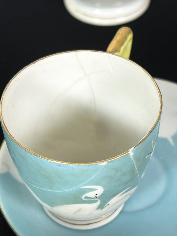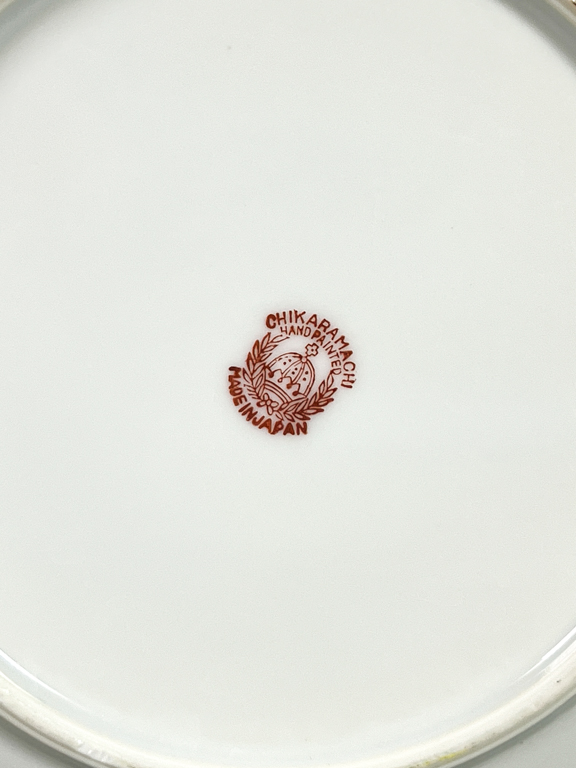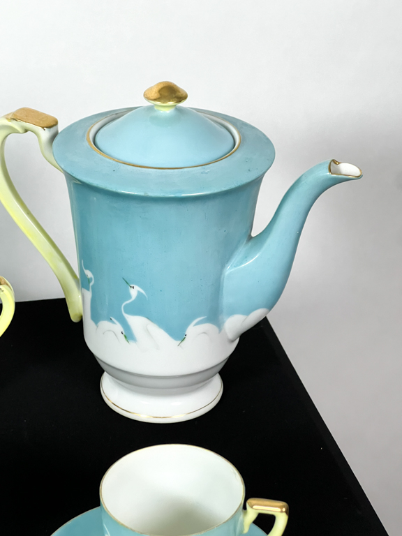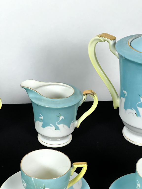 (6) Cake plates, (6) cup and saucer sets, (1) creamer, (1) sugar bowl and (1) teapot. Teapot measures 7 inches tall.