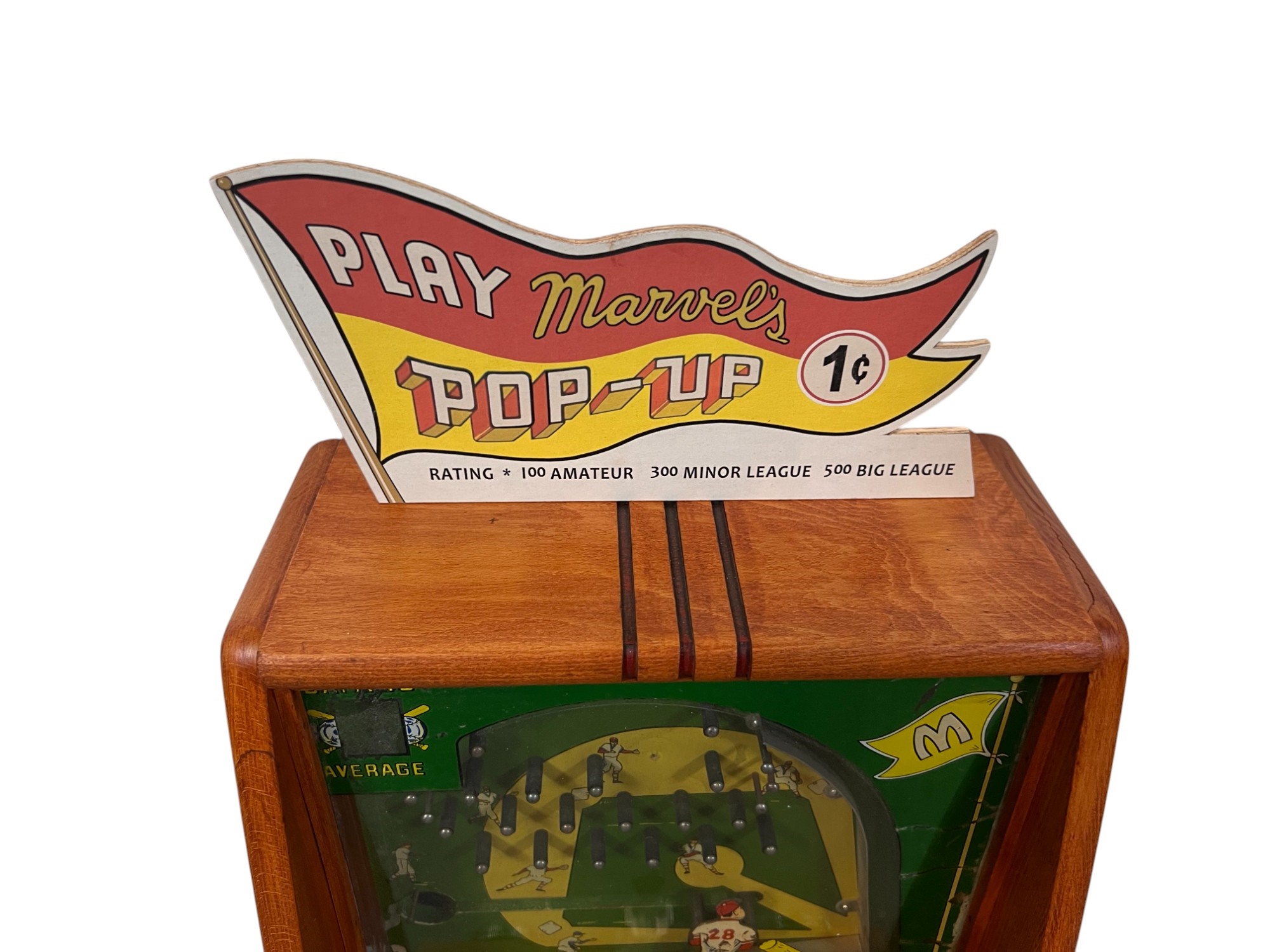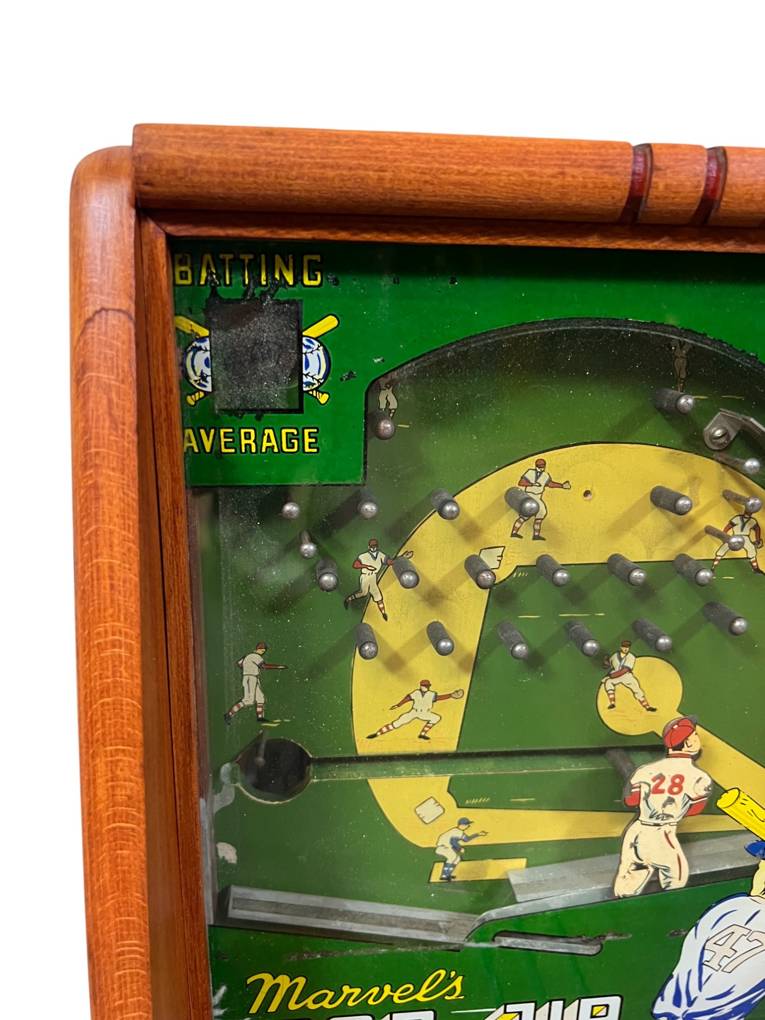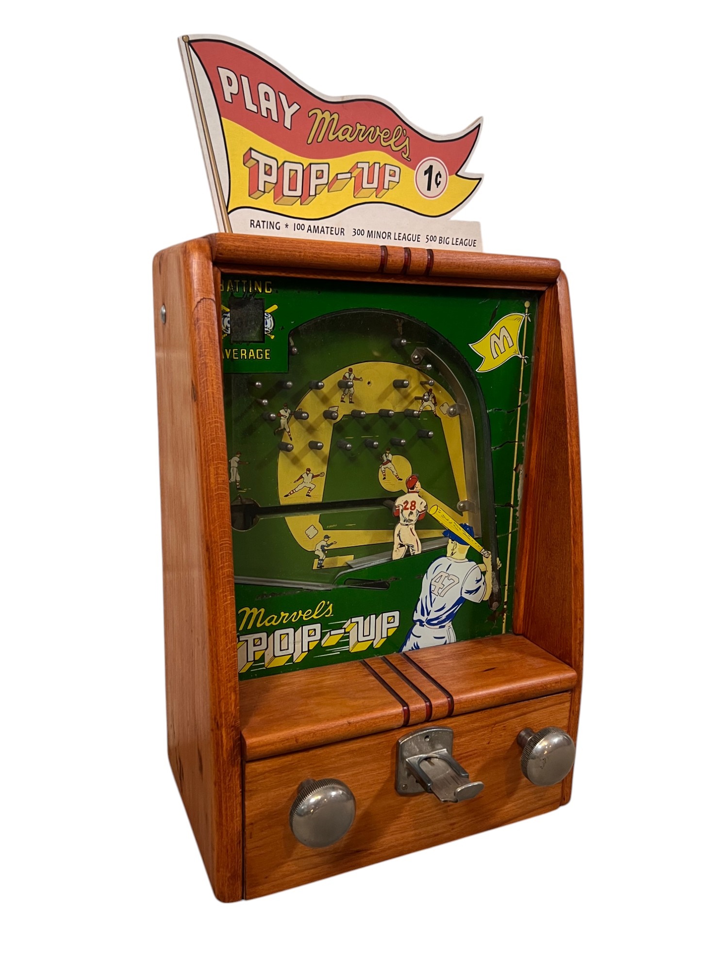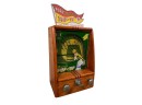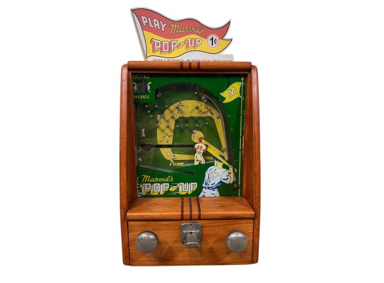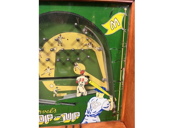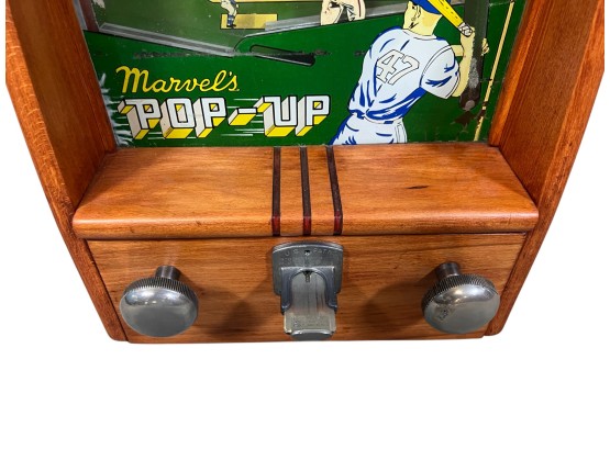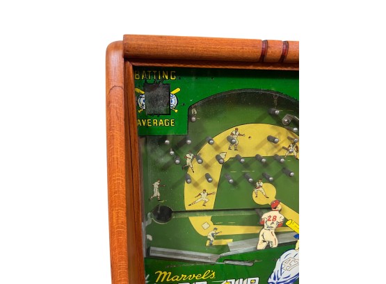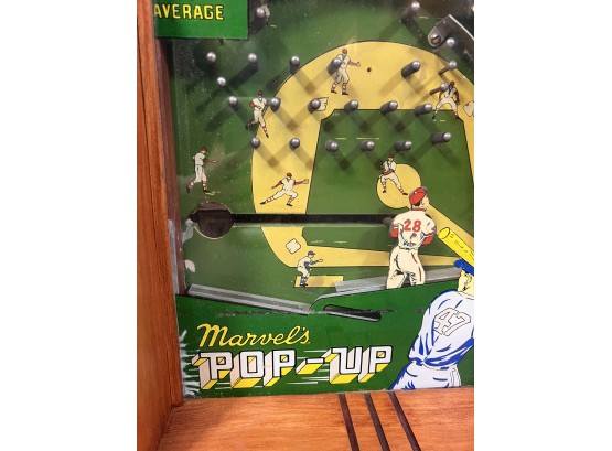 Early tabletop trade simulator baseball game. 18 1/2" x 12 1/2" x 8 1/2" case Condition: Wooden case has been refinished. Modern topper sign. See photos, key absent