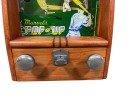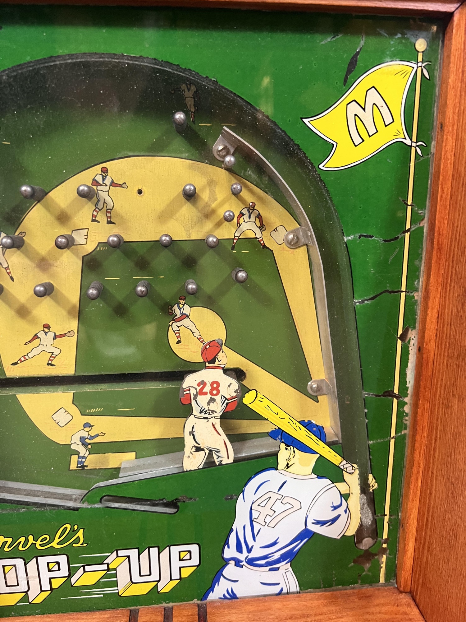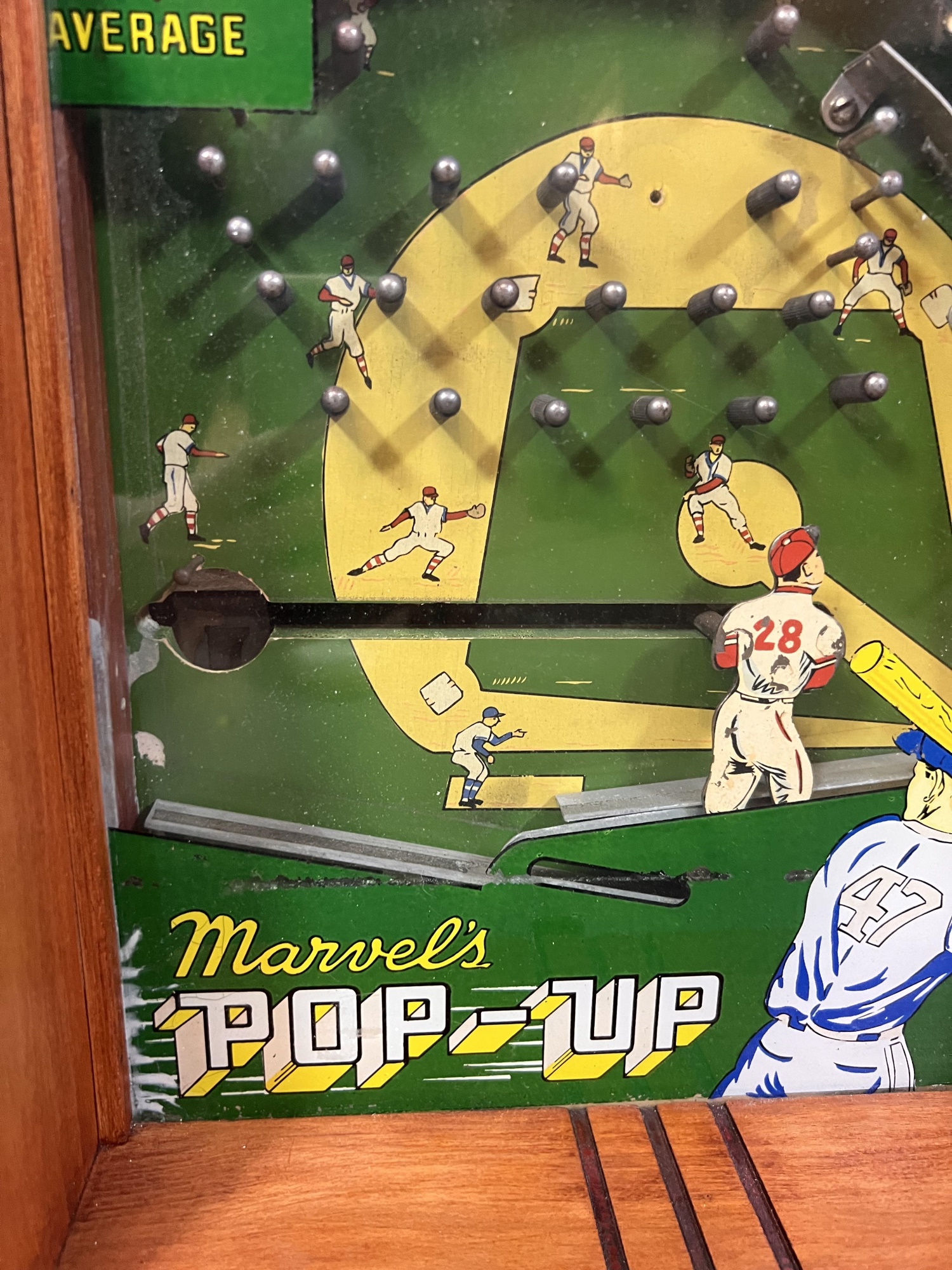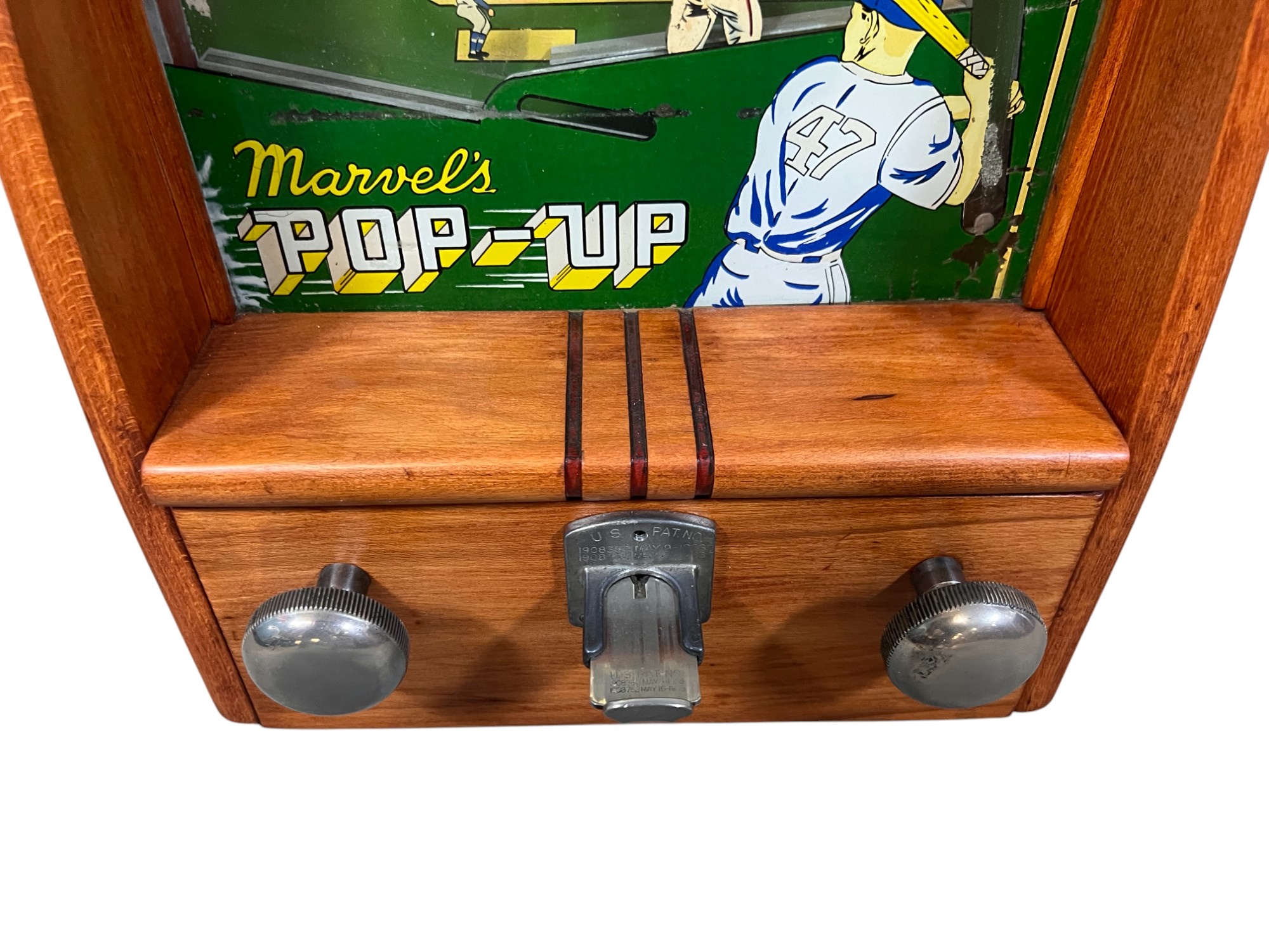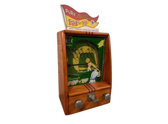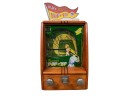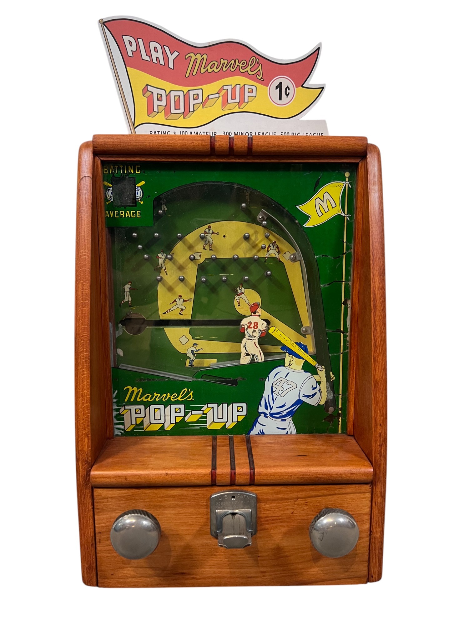 Early tabletop trade simulator baseball game. 18 1/2" x 12 1/2" x 8 1/2" case Condition: Wooden case has been refinished. Modern topper sign. See photos, key absent