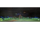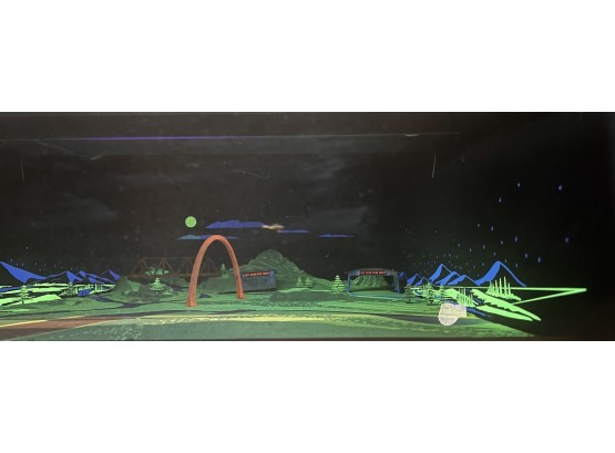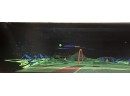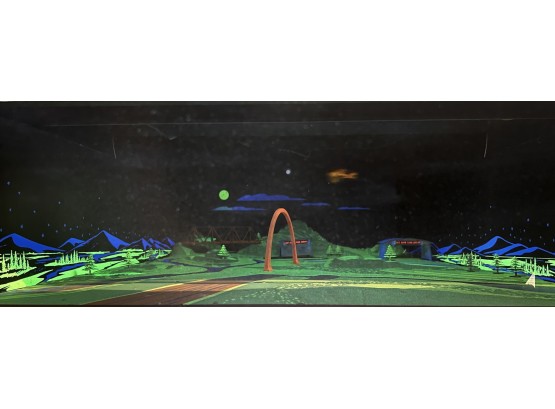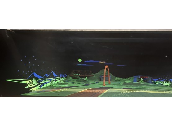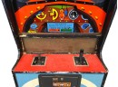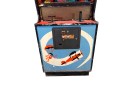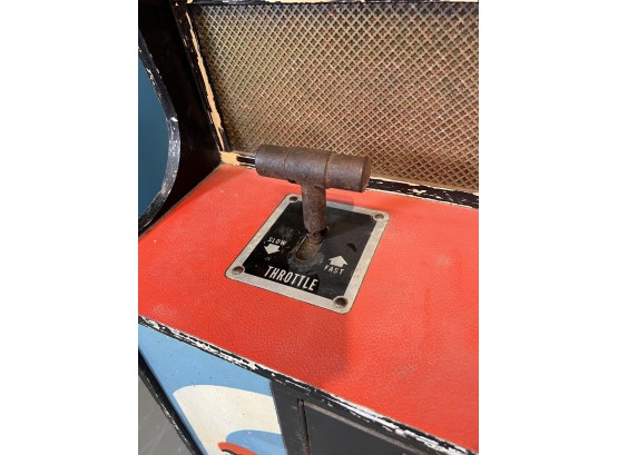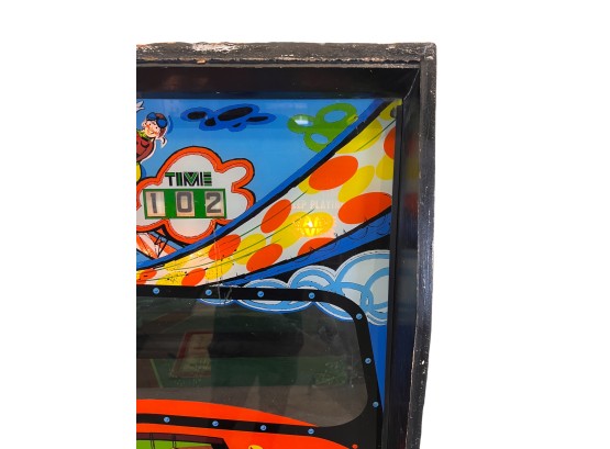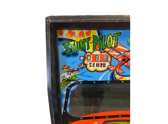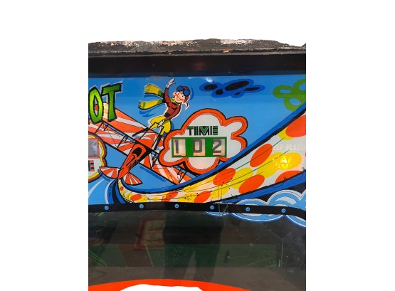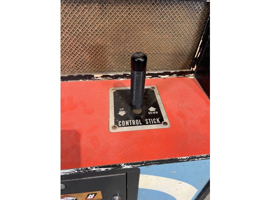 1970's vintage joystick game where players are required to navigate a biplane through obstacles. 71 3/4" x 30" x 33 1/4" Condition: Currently working at time of cataloging. Wear to wooden case. See photos, key absent