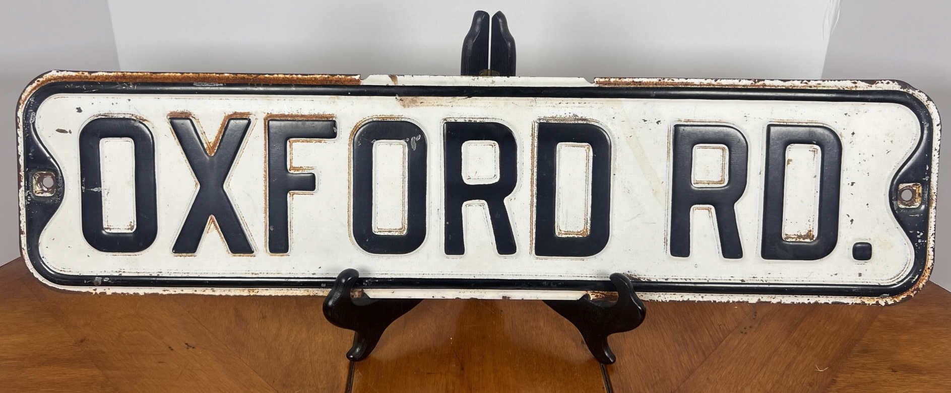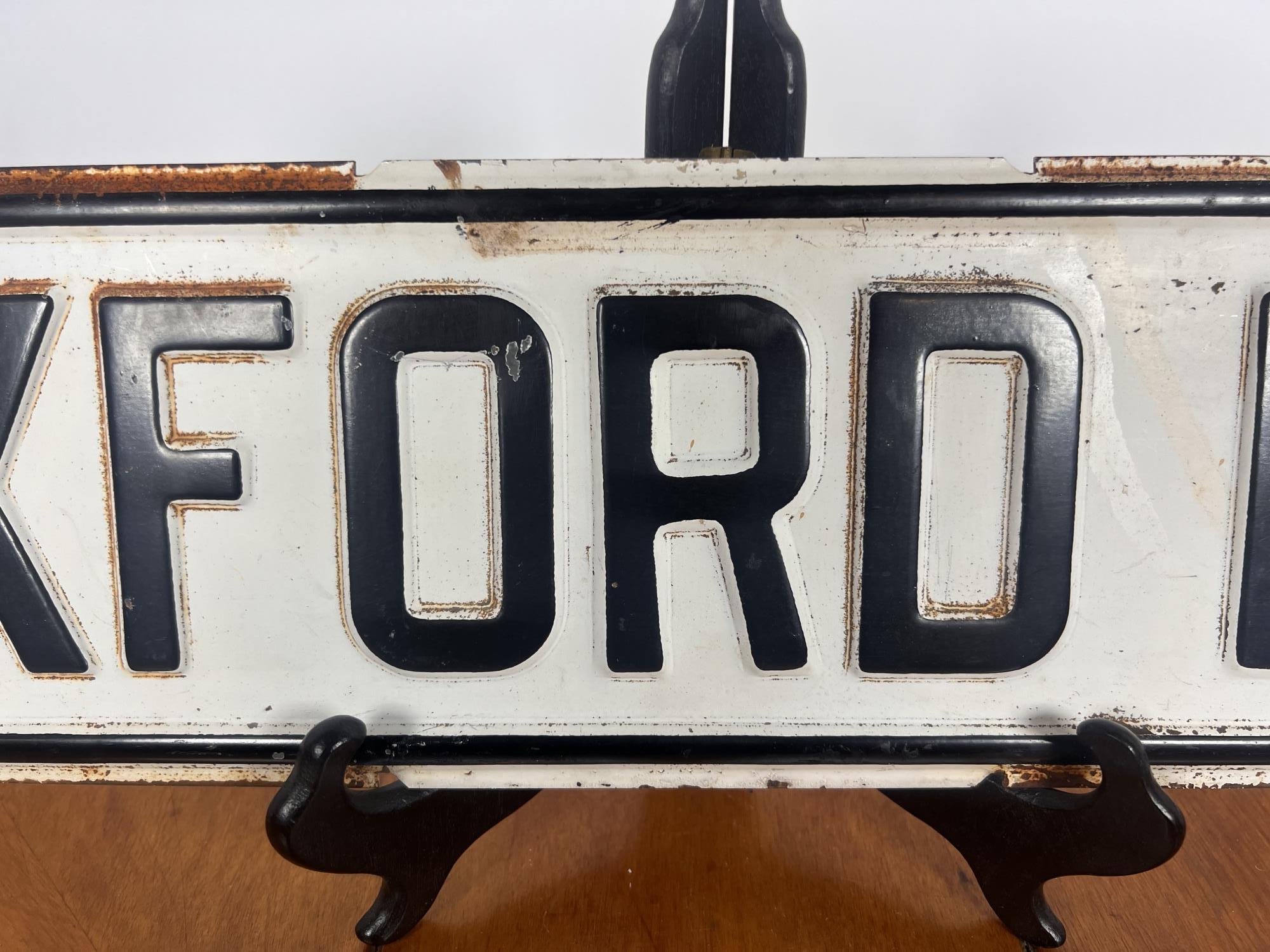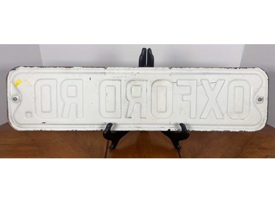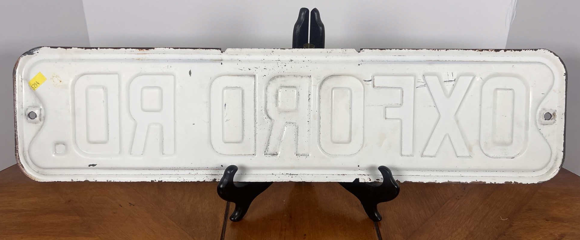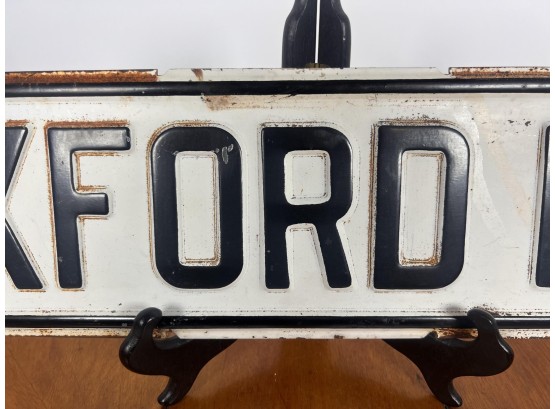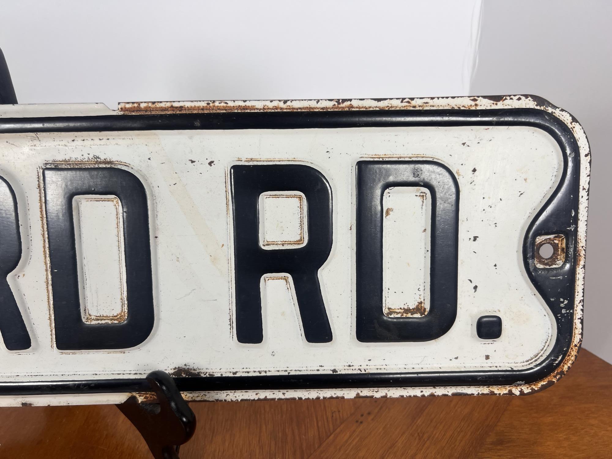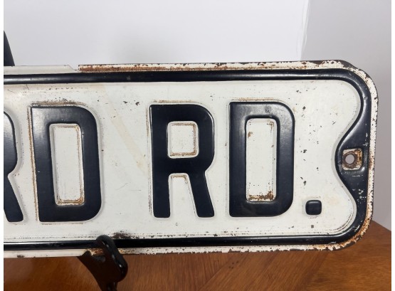 Painted iron one sided street sign. 5 7/8" x 23 7/8" Condition: Surface rust, paint loss, minor dents. See photos Temp No 6420