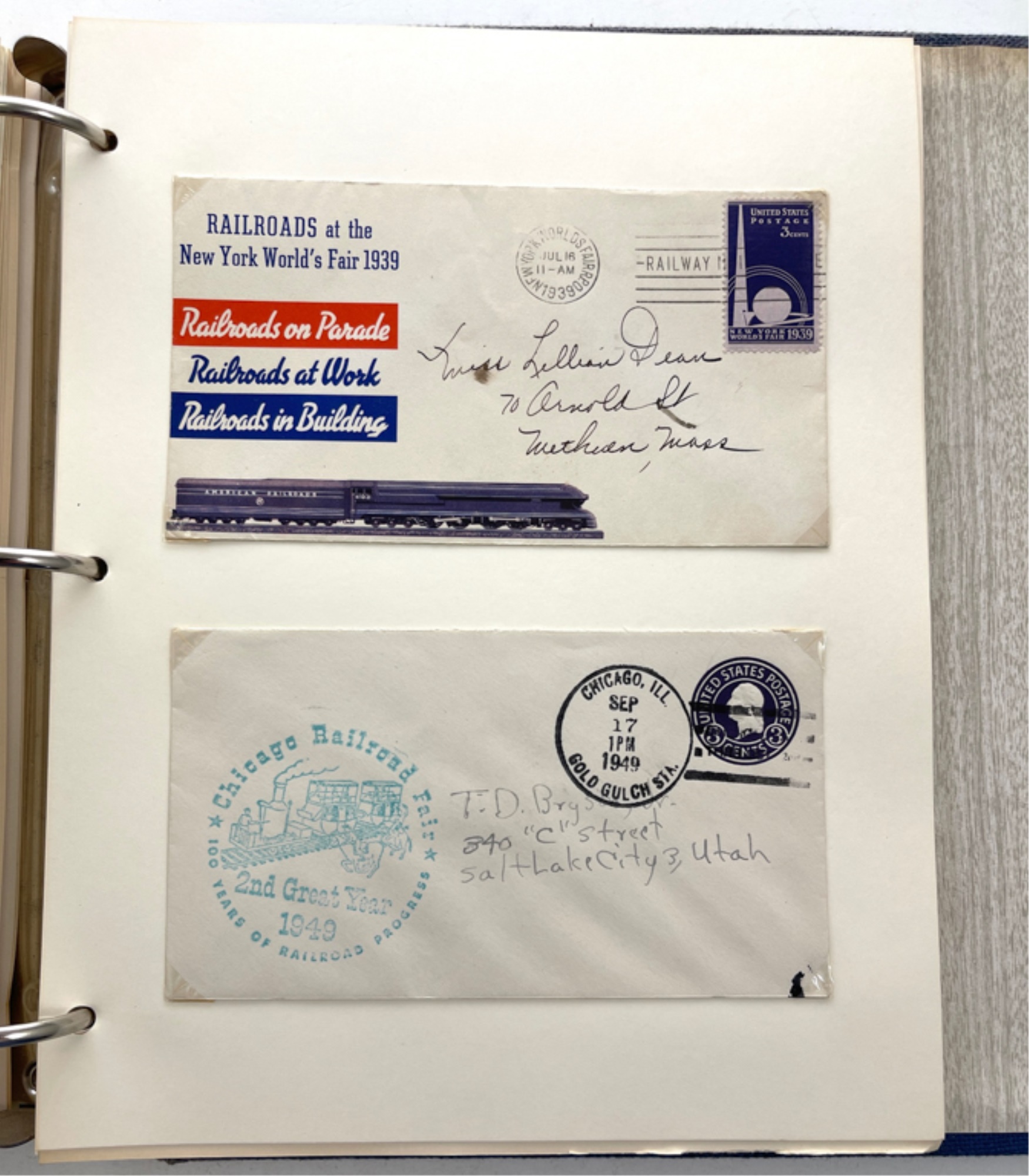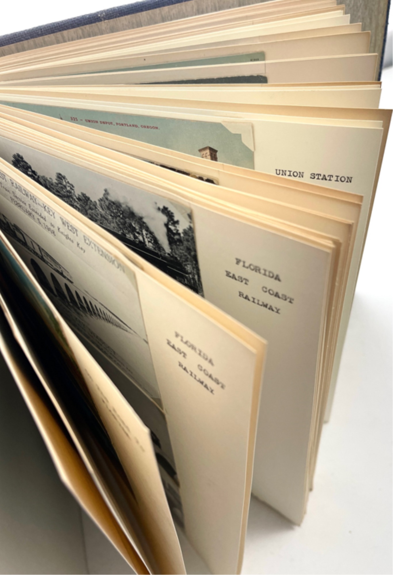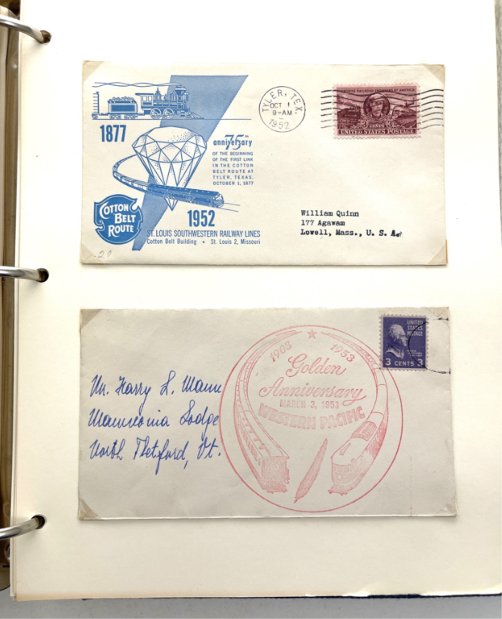 Contains (114) postcards, (17) first day covers. 11 1/2" x 10 1/2" x 2 1/2"