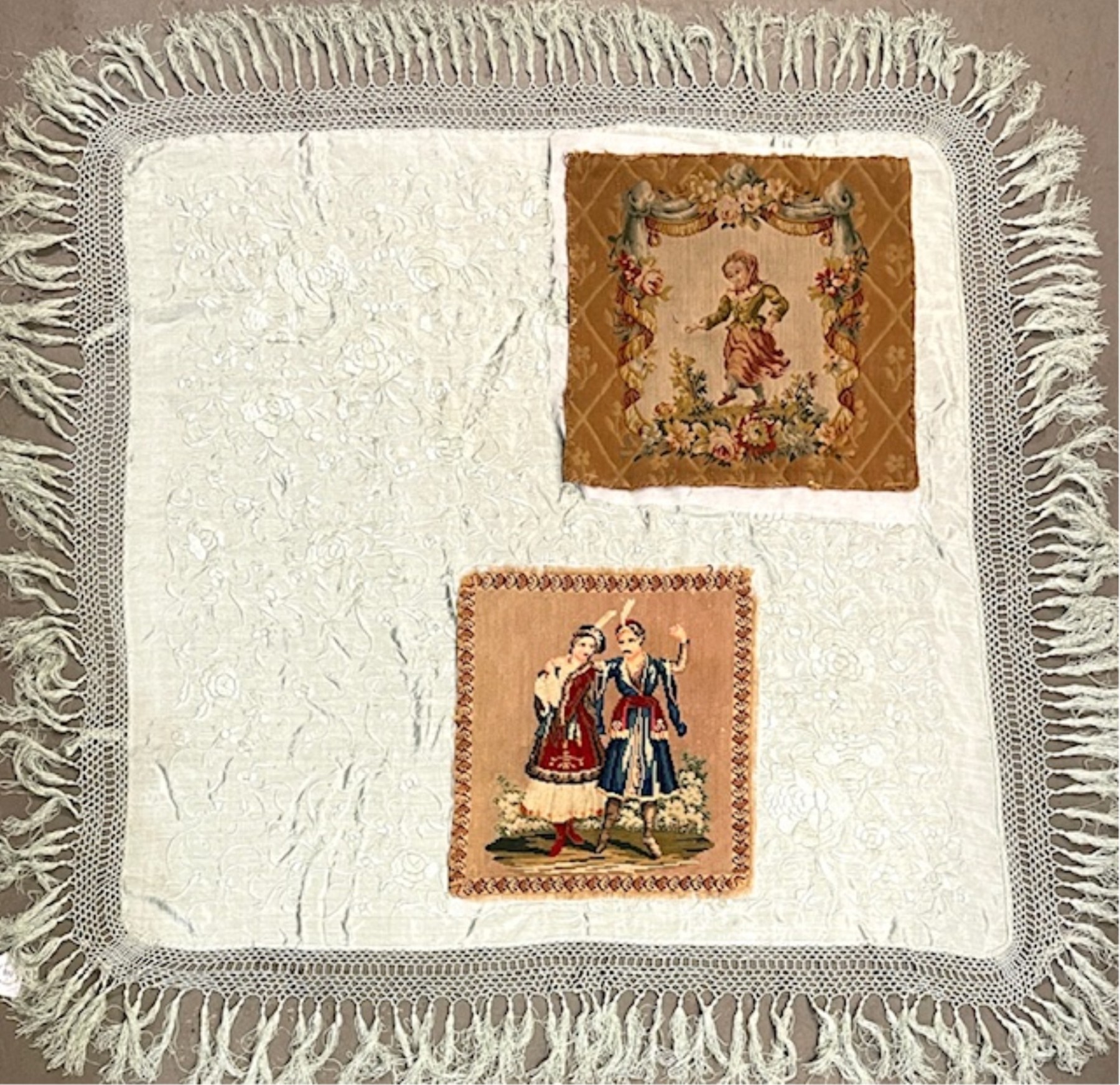 Shawl 34" square plus fringe. Largest needlework 13 1/2" square