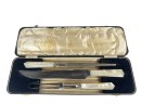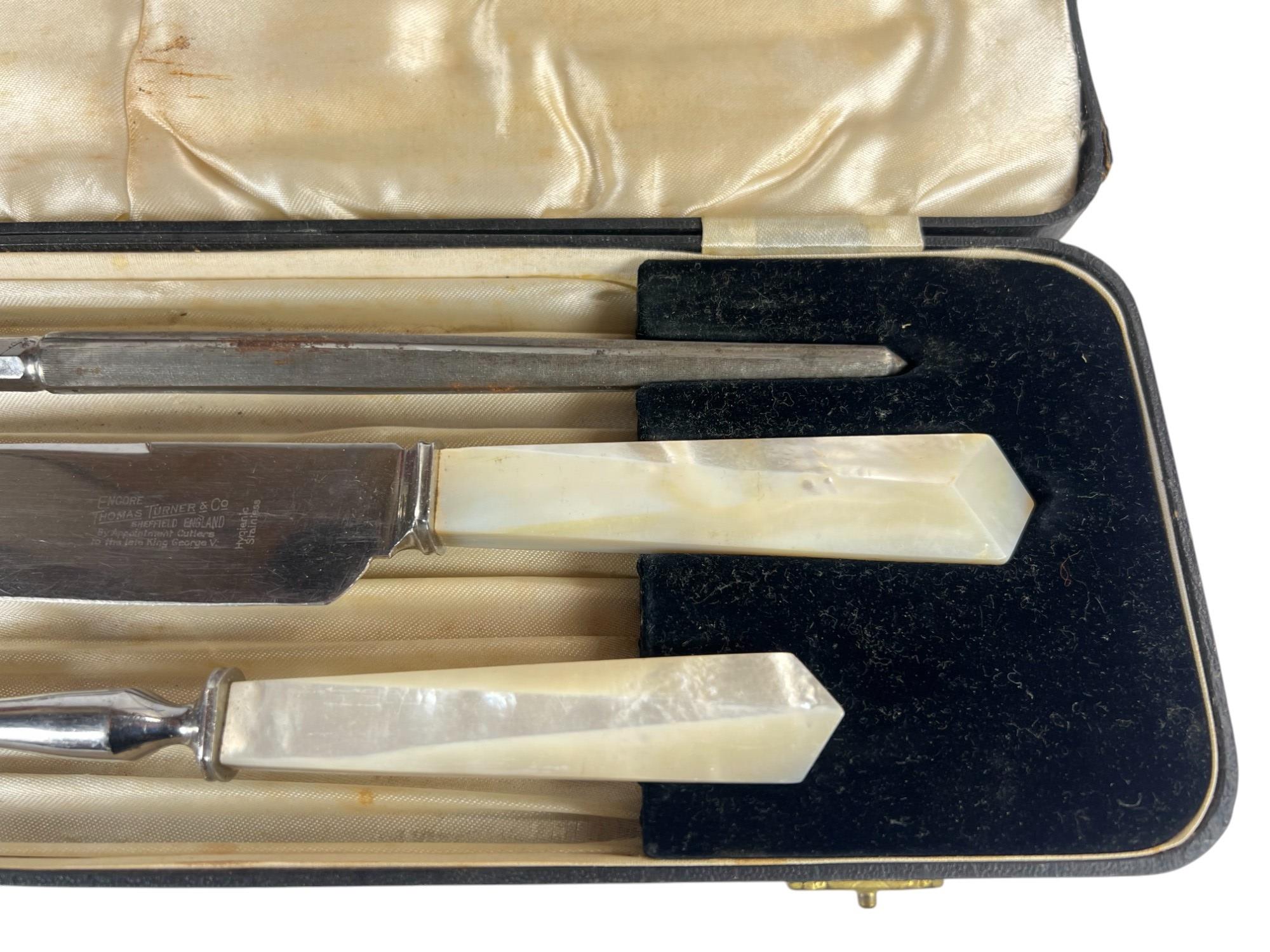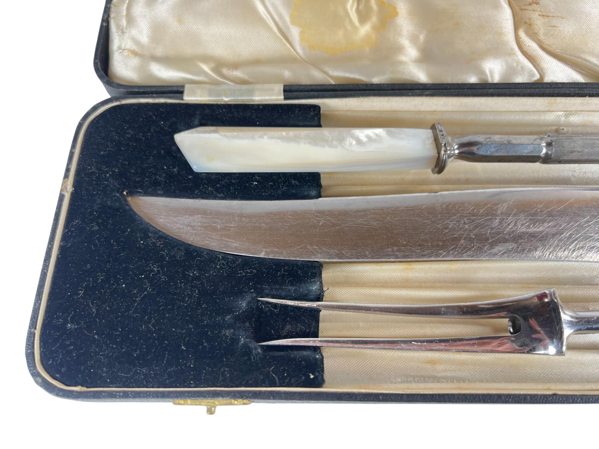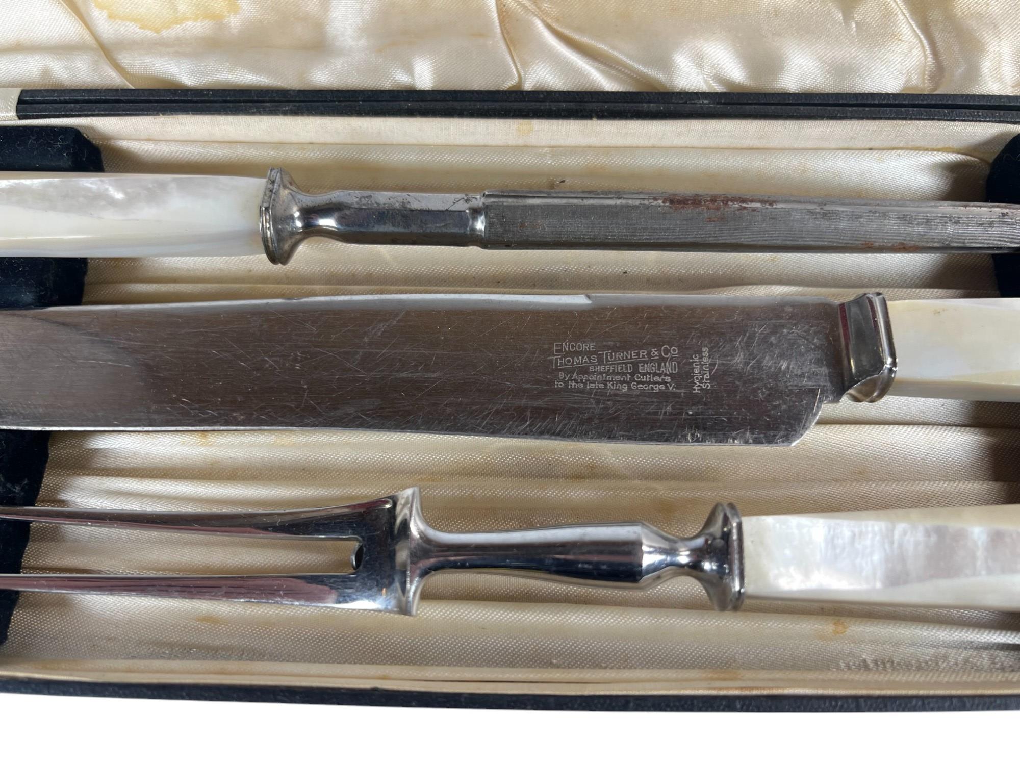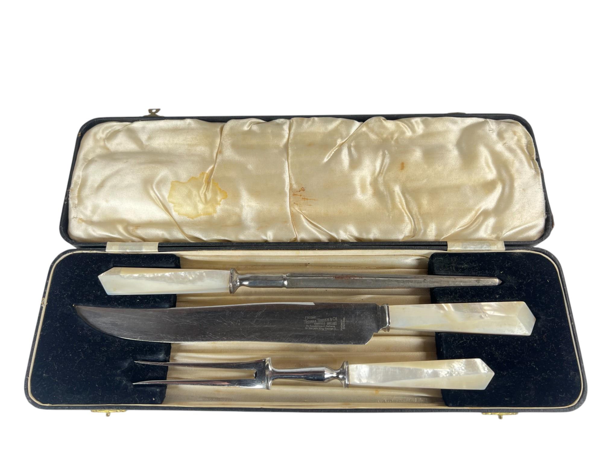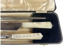 Stainless steel with mother of pearl handles in original fitted case. Carving knife 13 1/2" long Condition: Good, used , Some oxidation to sharpener. Staining to padded interior of case Temp No 6415