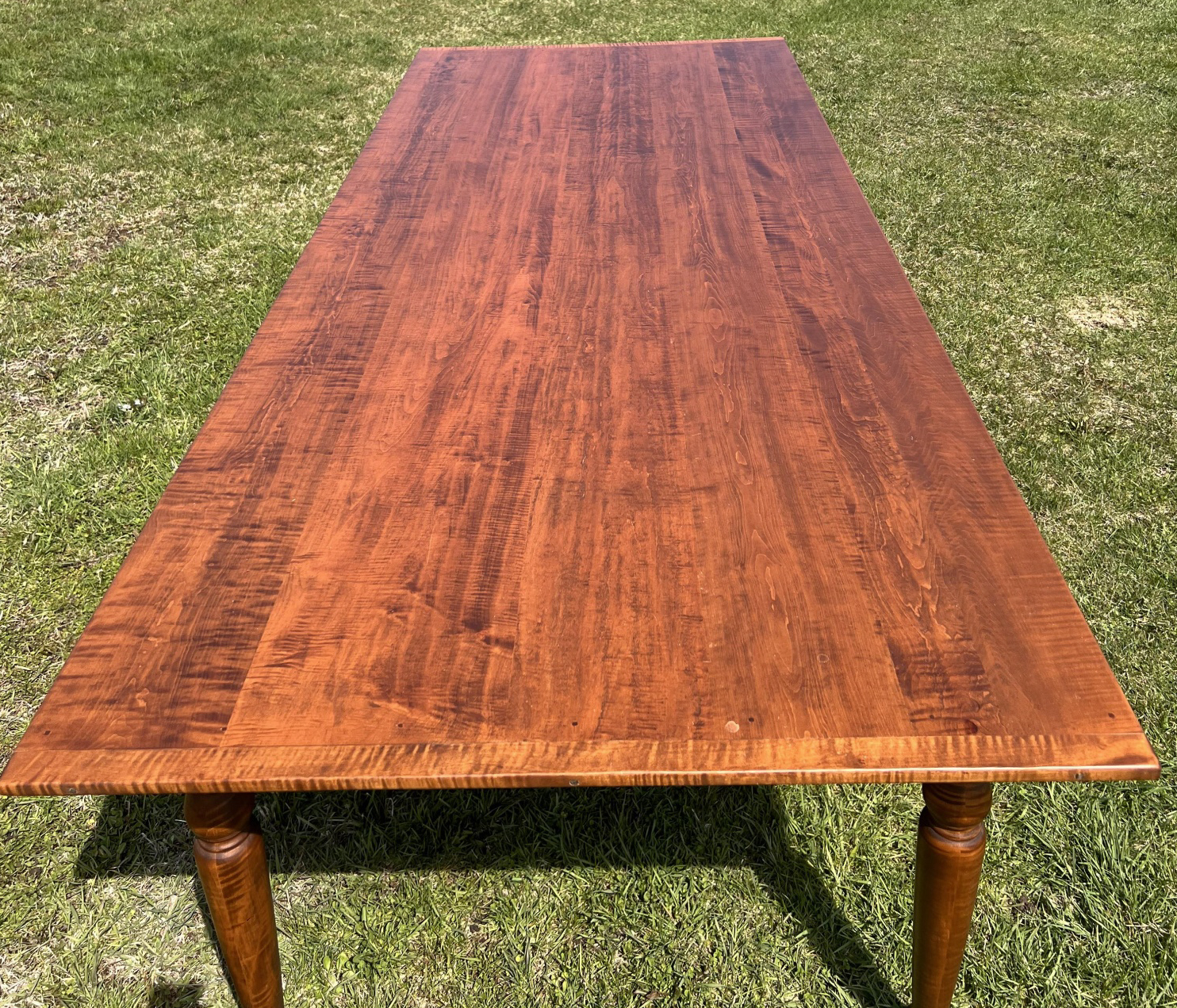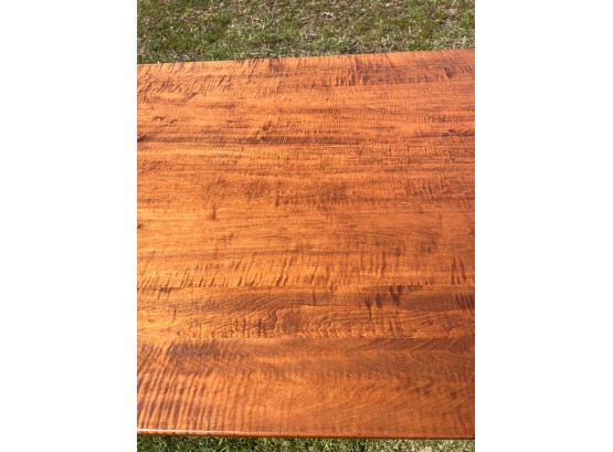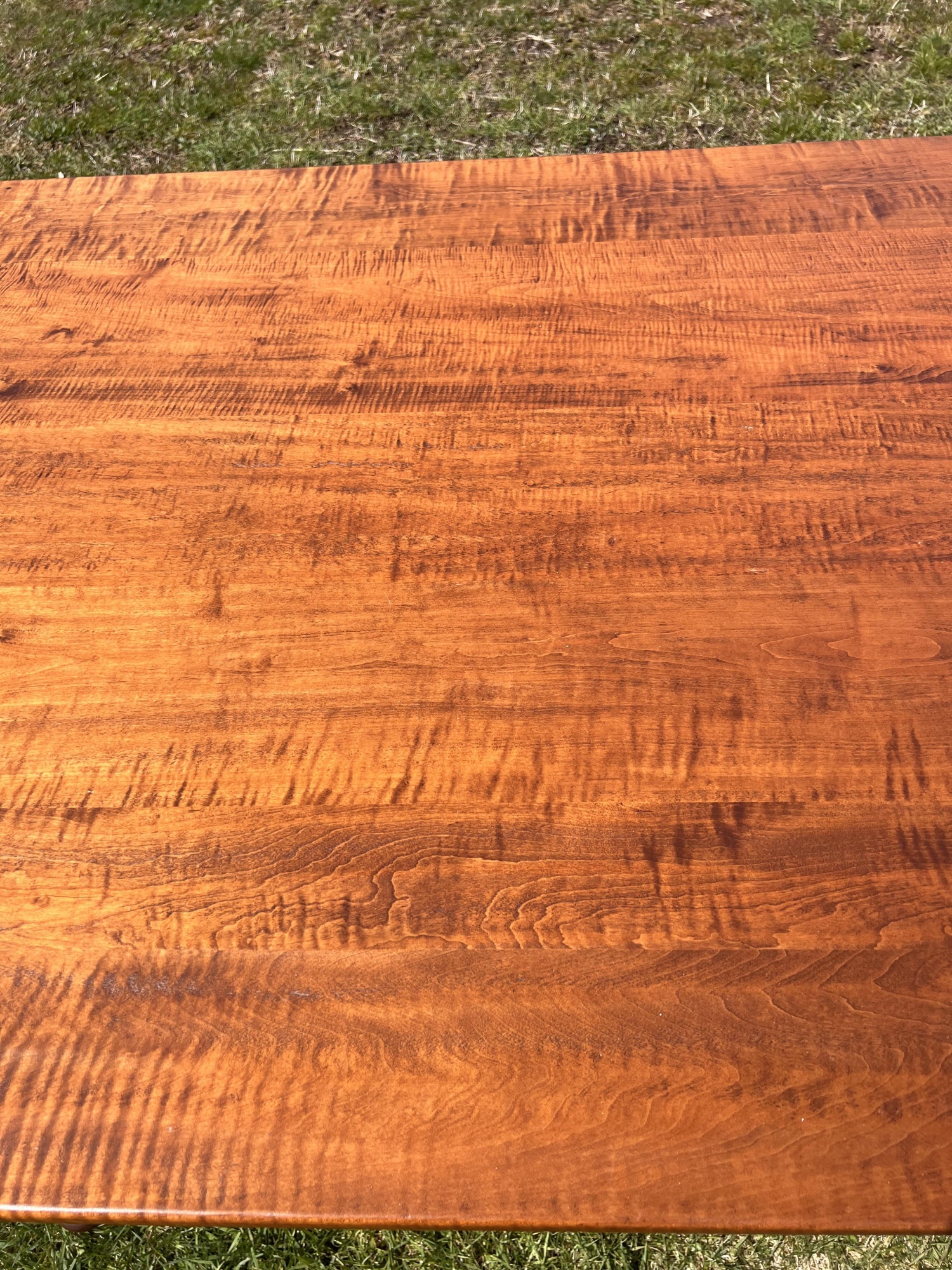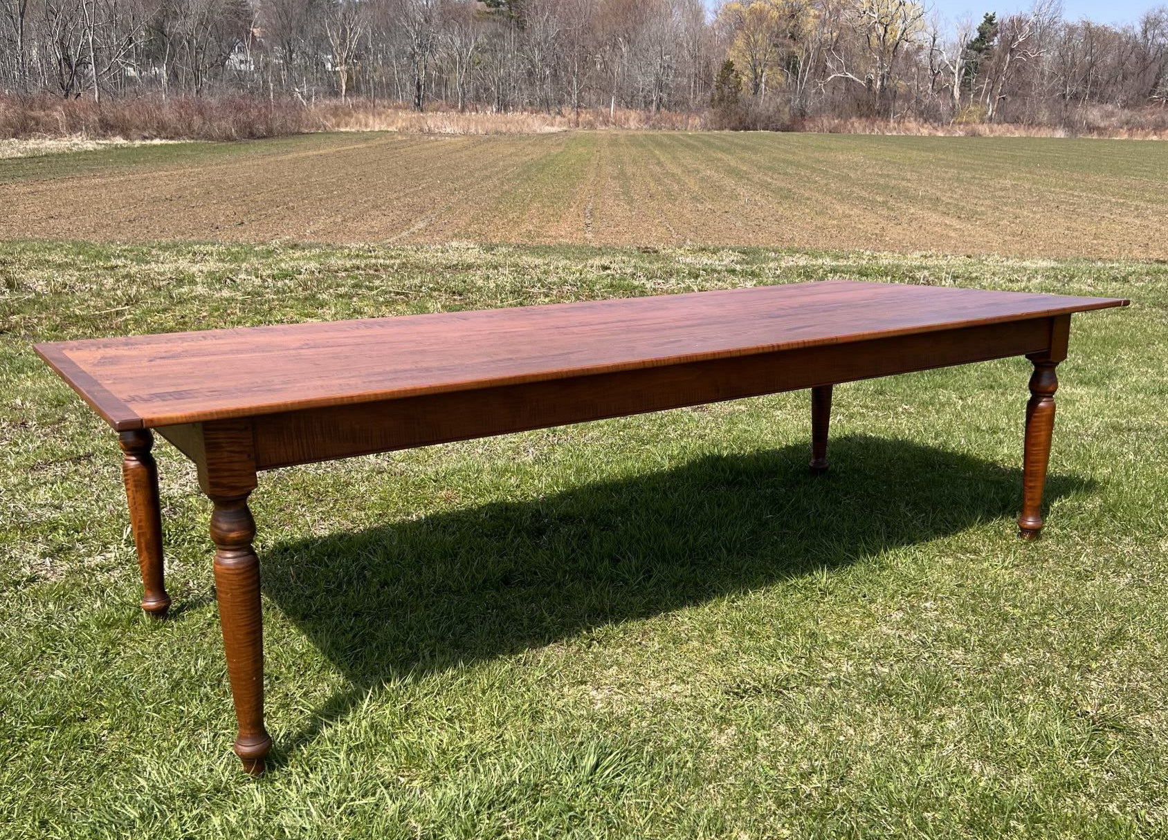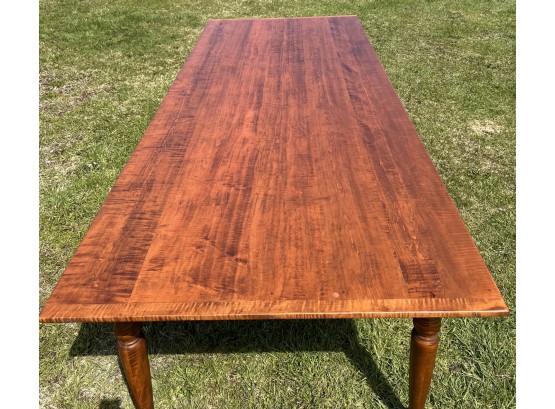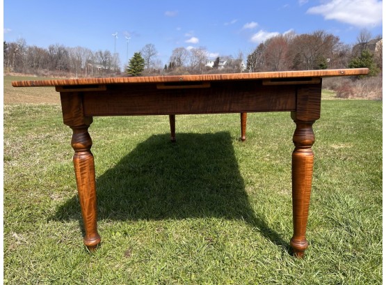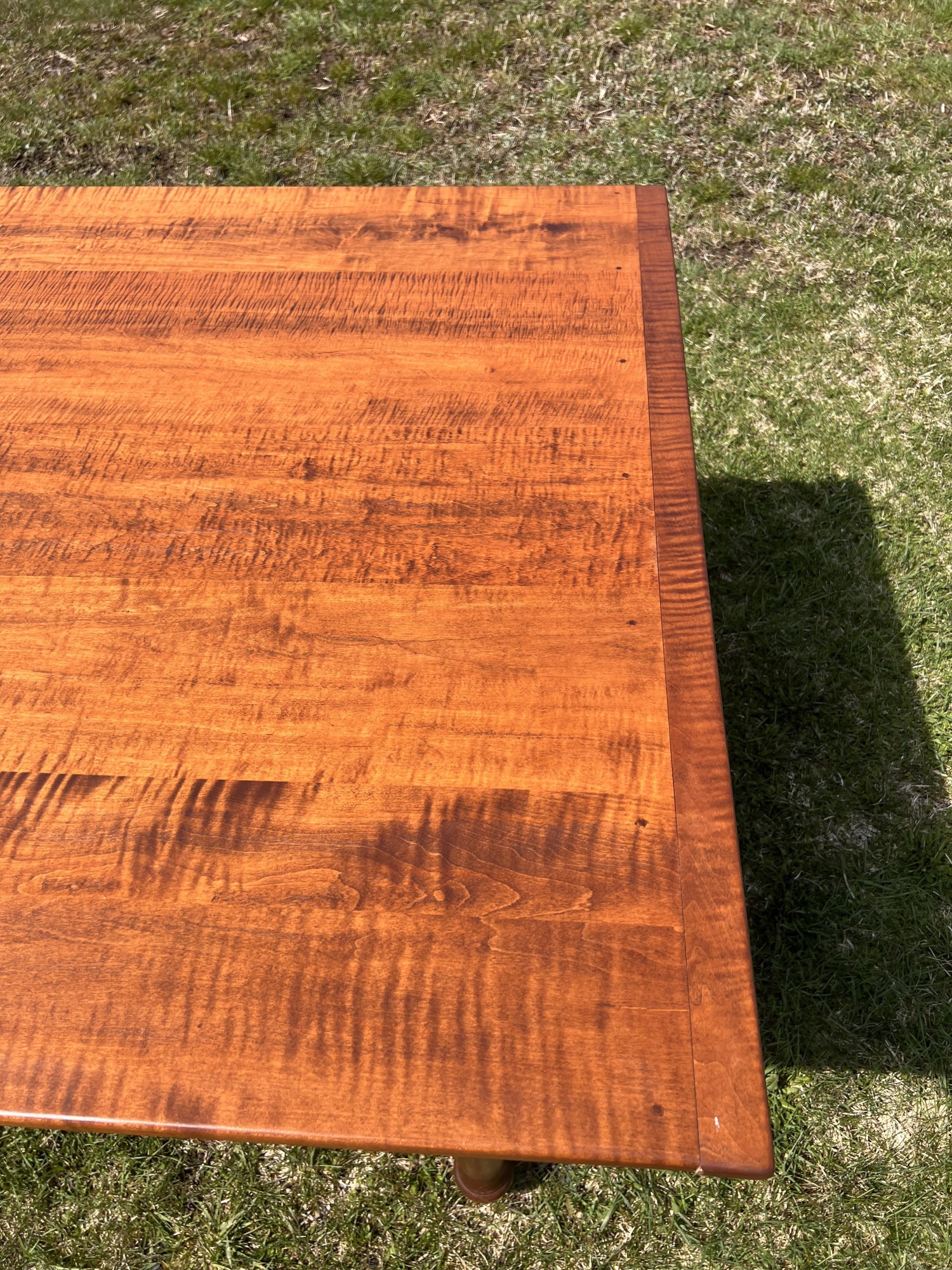 Large tiger maple table with breadboard ends. Warren Chair Works mark on underside. 29 1/2" x 108" x 44" Condition: Wear to surface from use. Leaves absent Temp No 6536