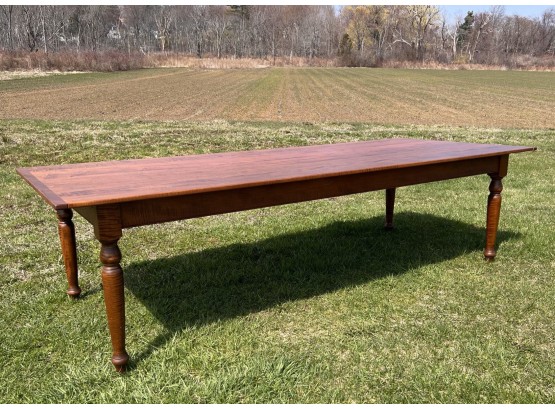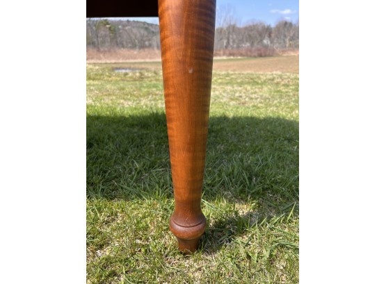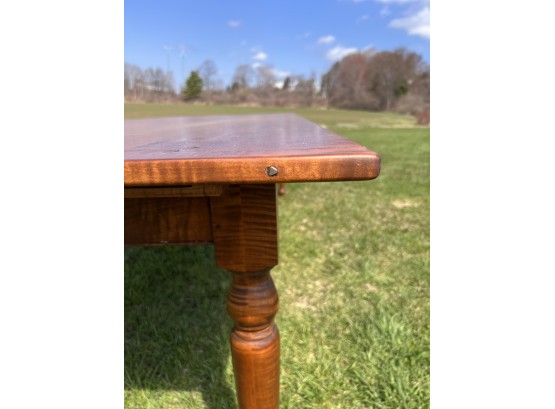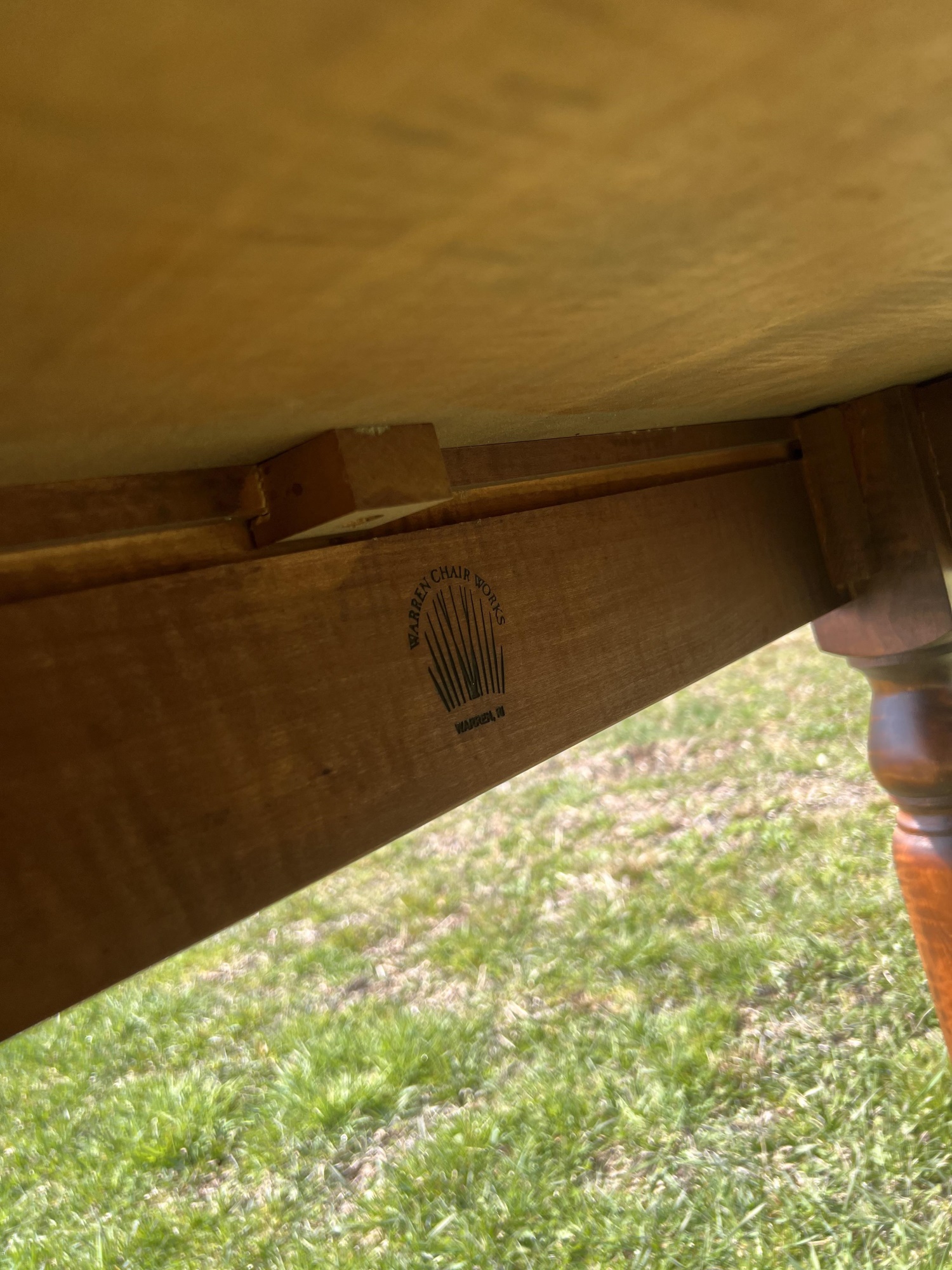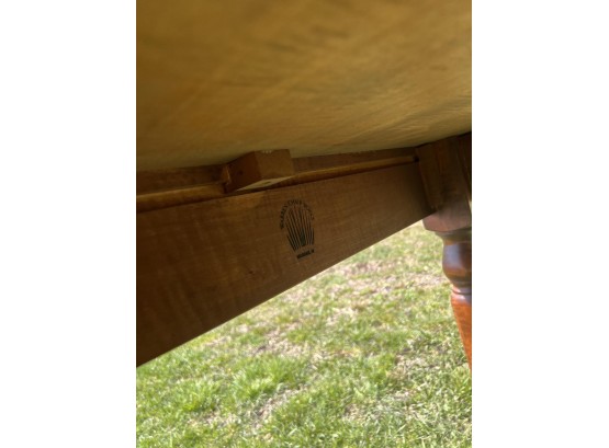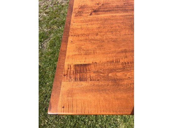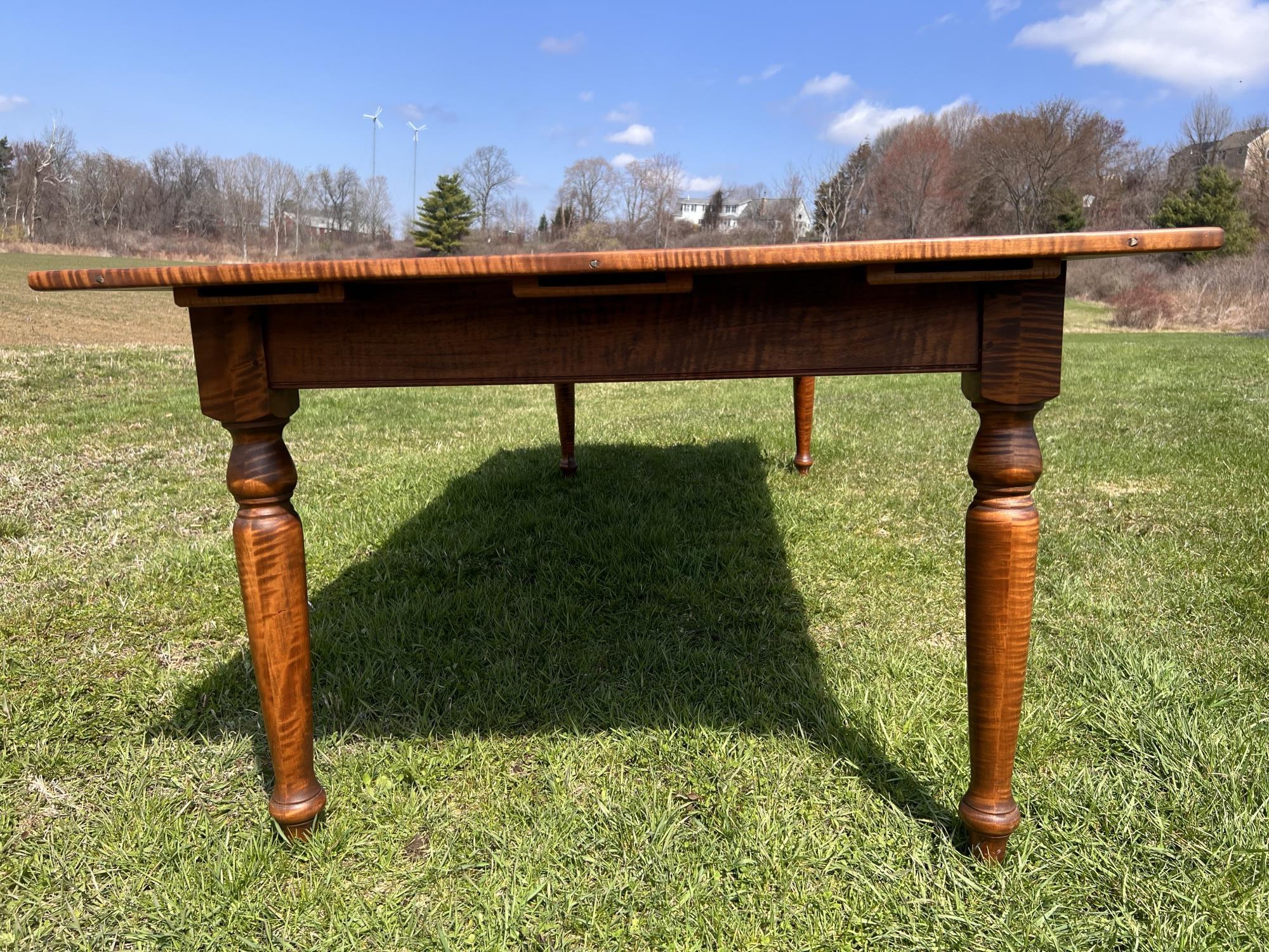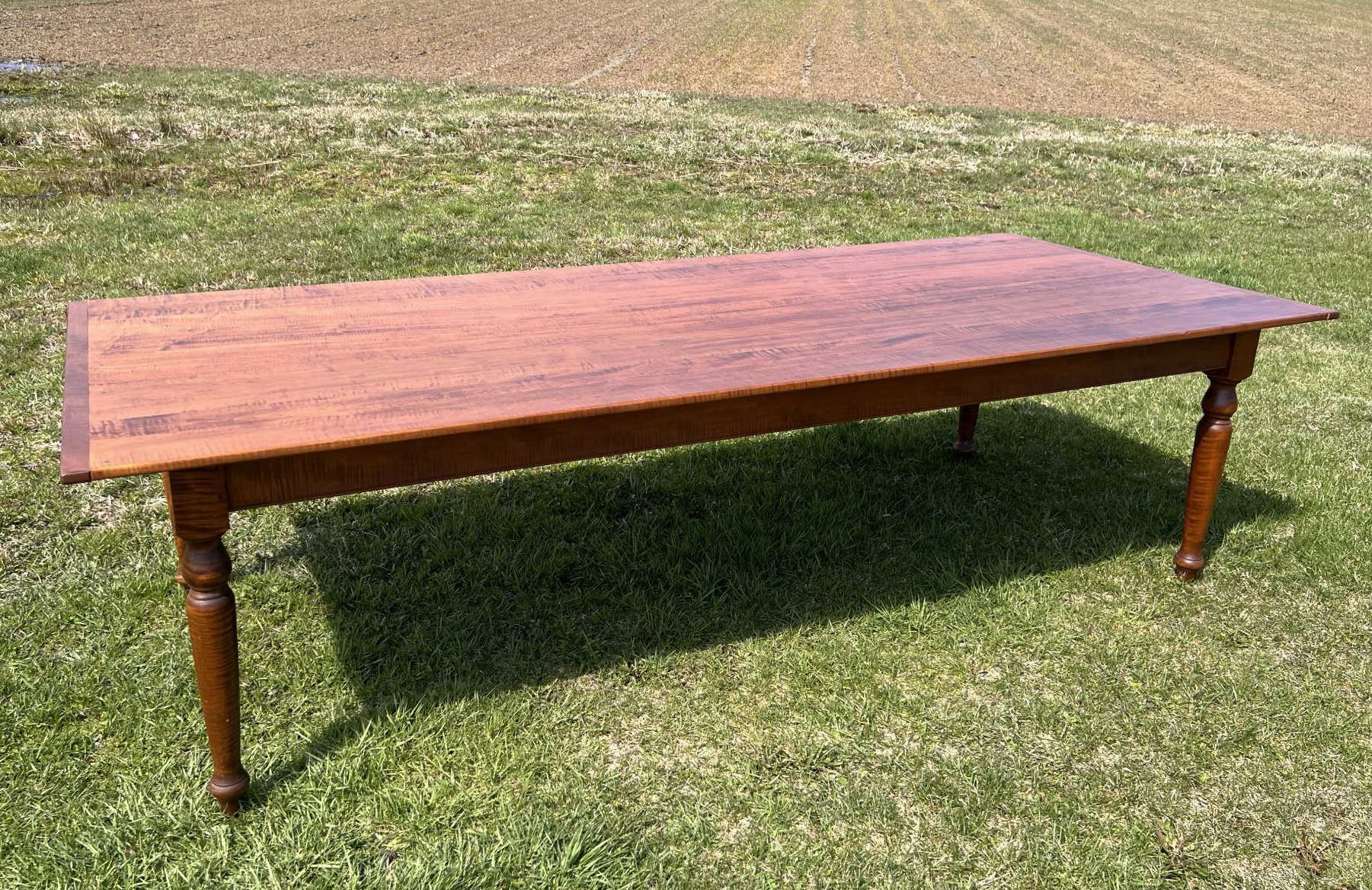 Large tiger maple table with breadboard ends. Warren Chair Works mark on underside. 29 1/2" x 108" x 44" Condition: Wear to surface from use. Leaves absent Temp No 6536