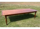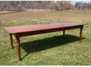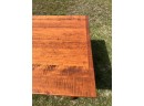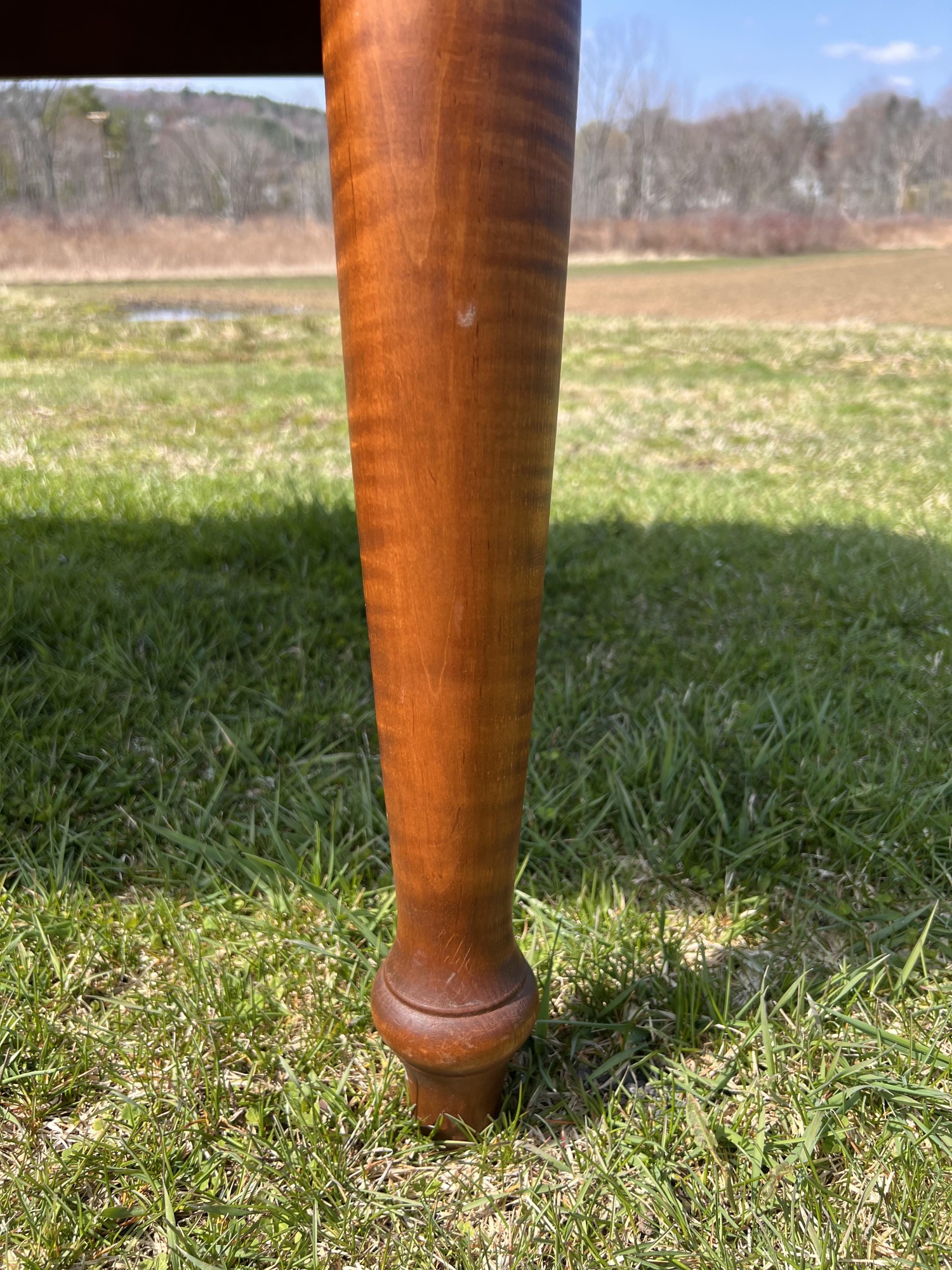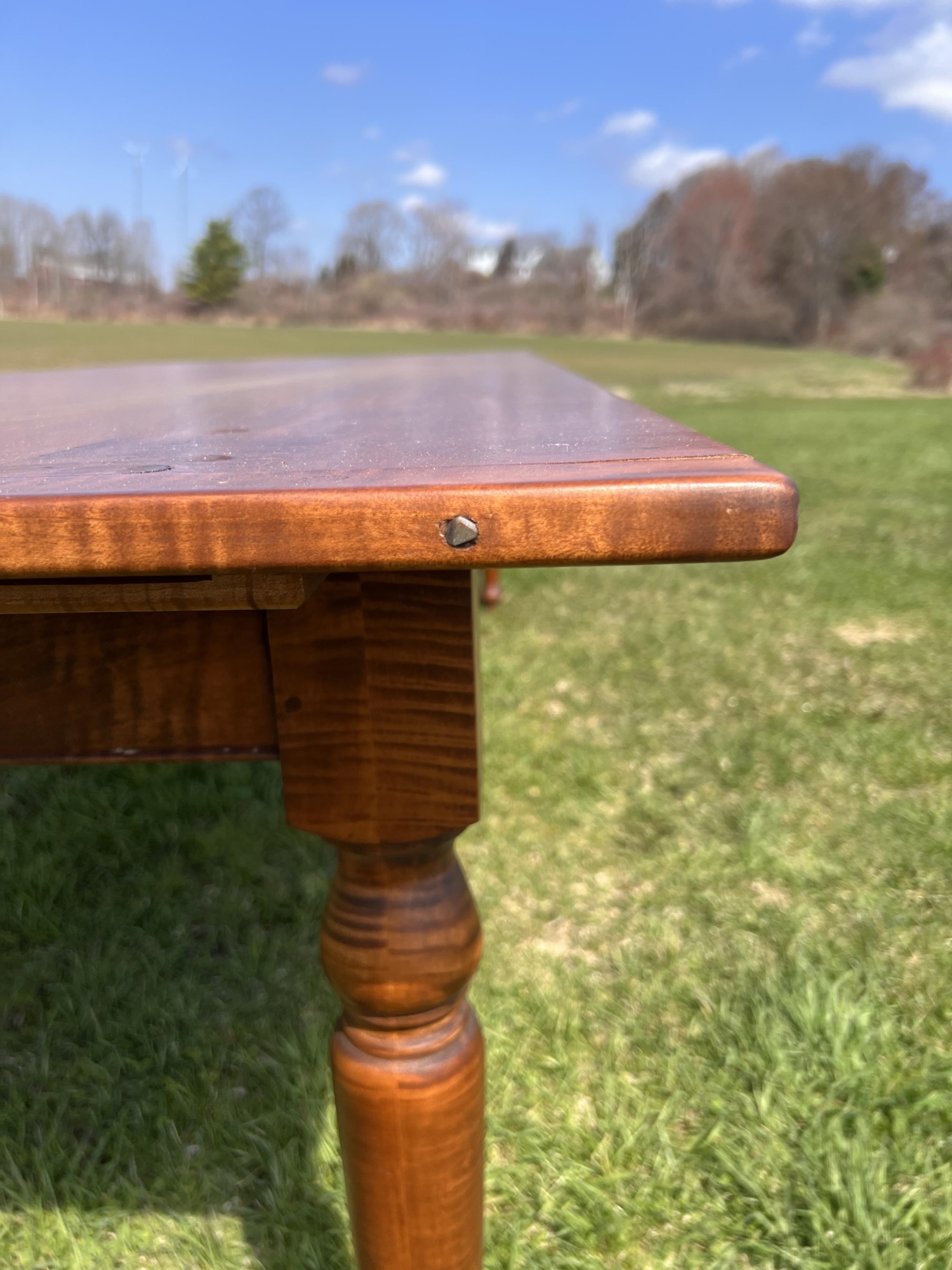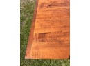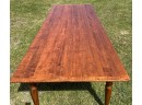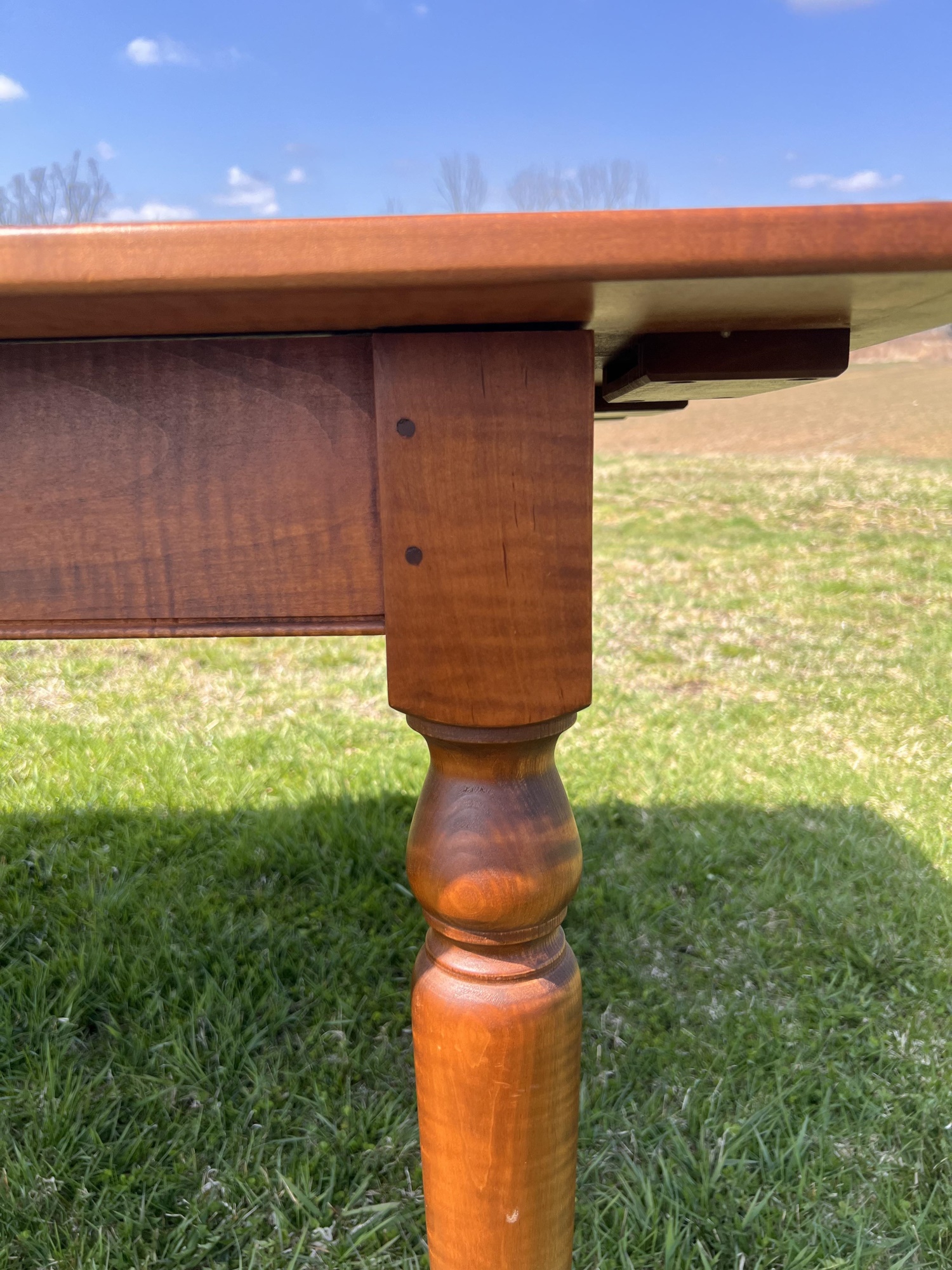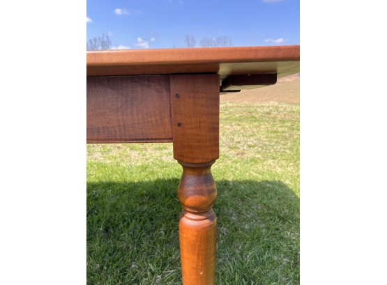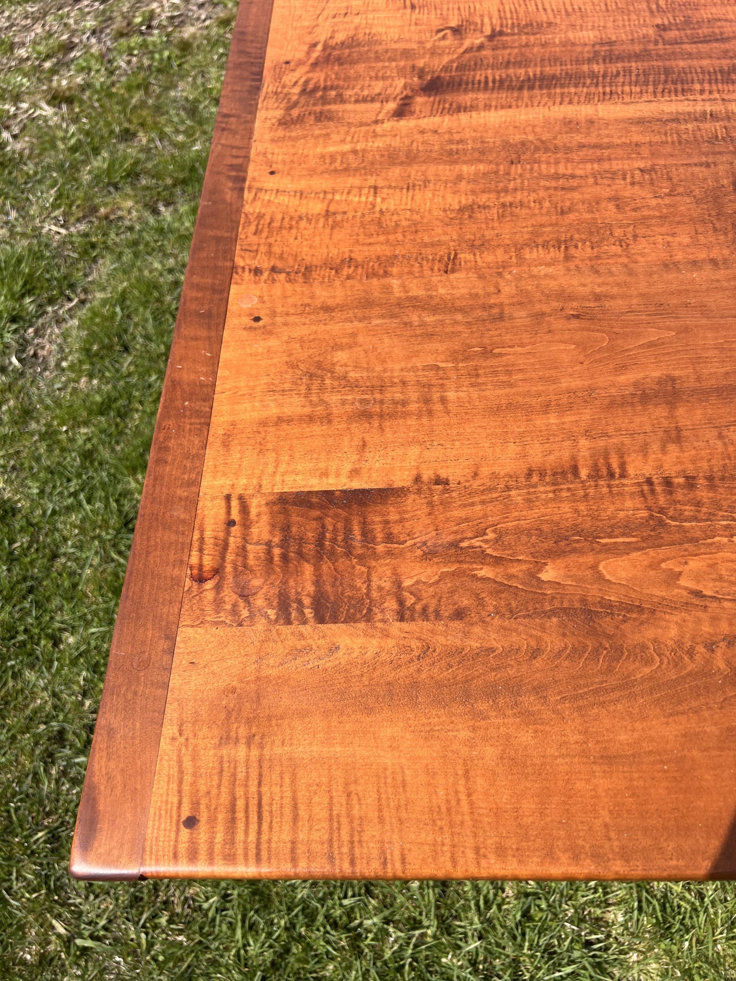 Large tiger maple table with breadboard ends. Warren Chair Works mark on underside. 29 1/2" x 108" x 44" Condition: Wear to surface from use. Leaves absent Temp No 6536