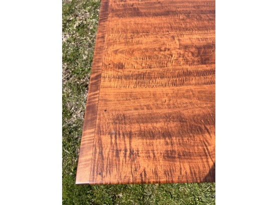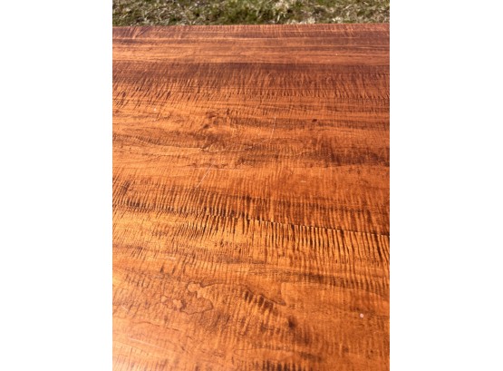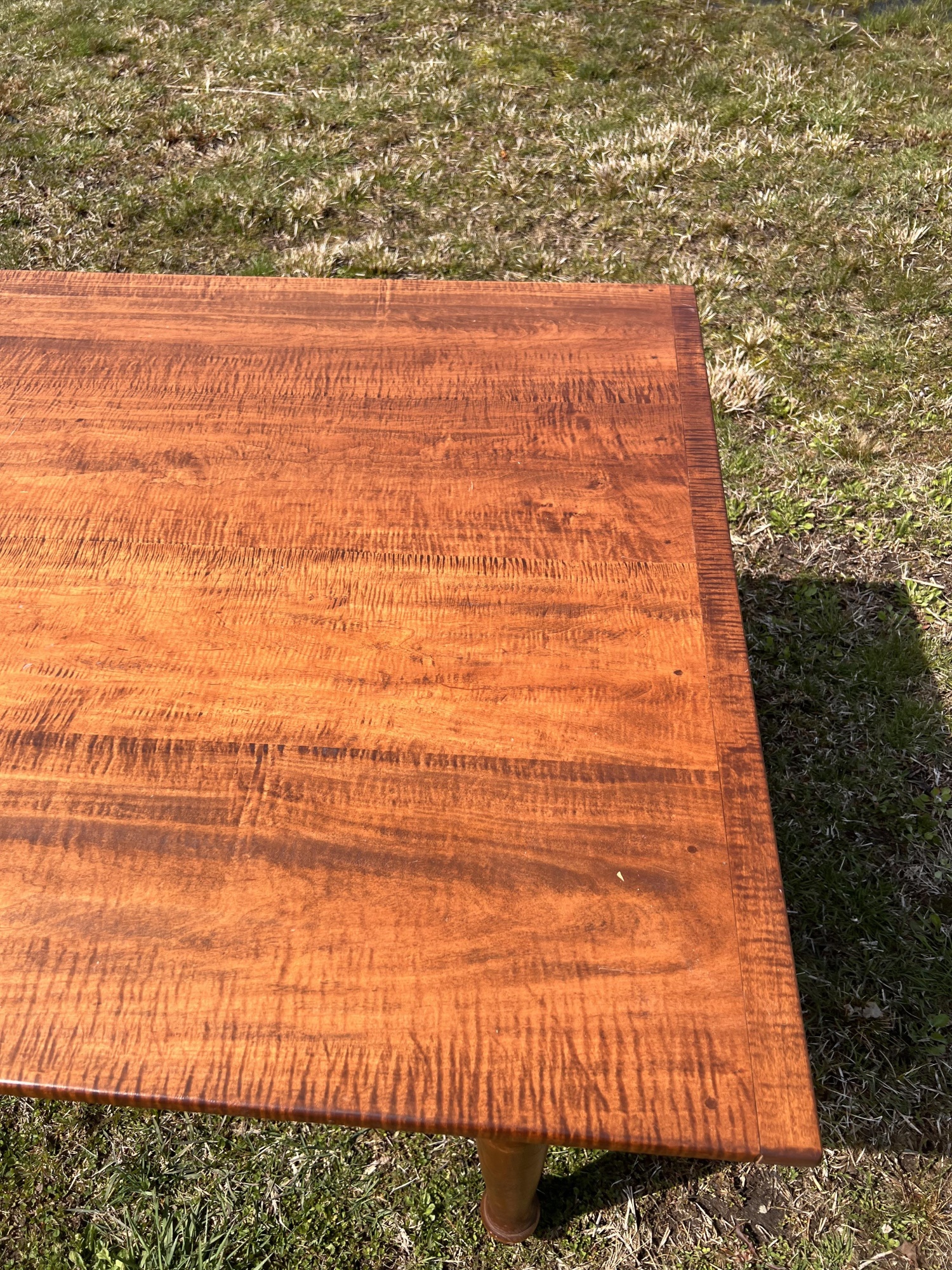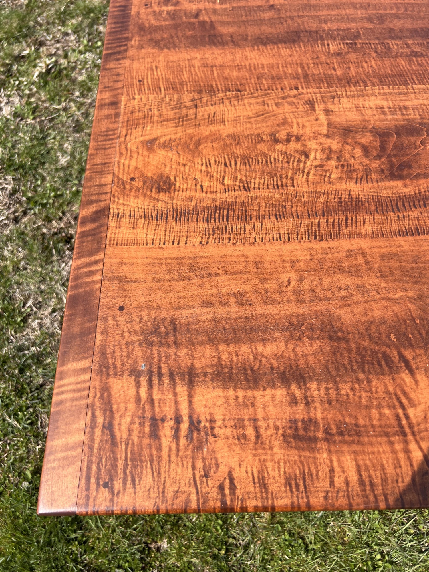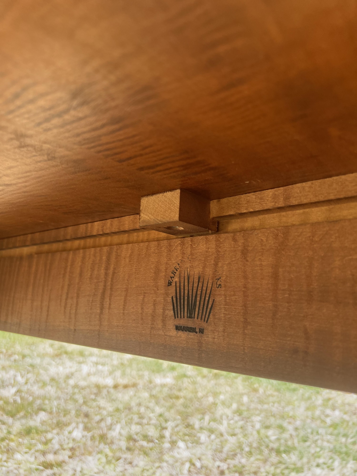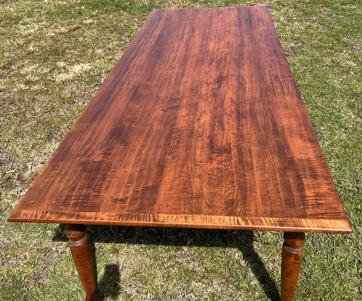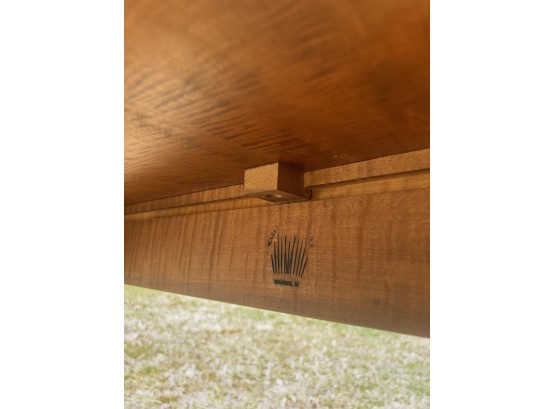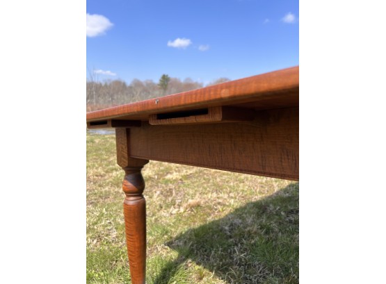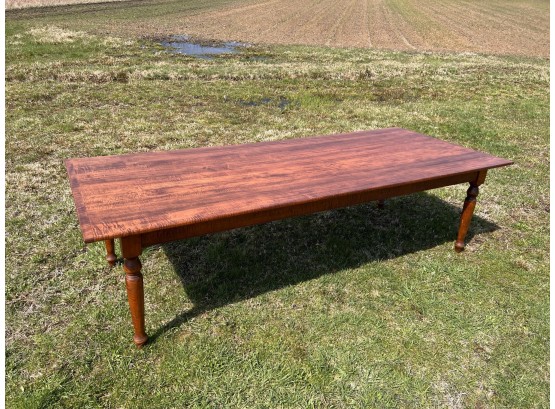 Large tiger maple table with breadboard ends. Warren Chair Works mark on underside. 29 1/2" x 108" x 44" Condition: Wear to surface from use. Leaves absent Temp No 6537