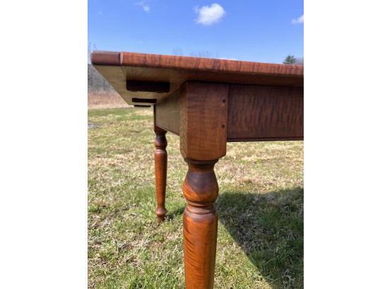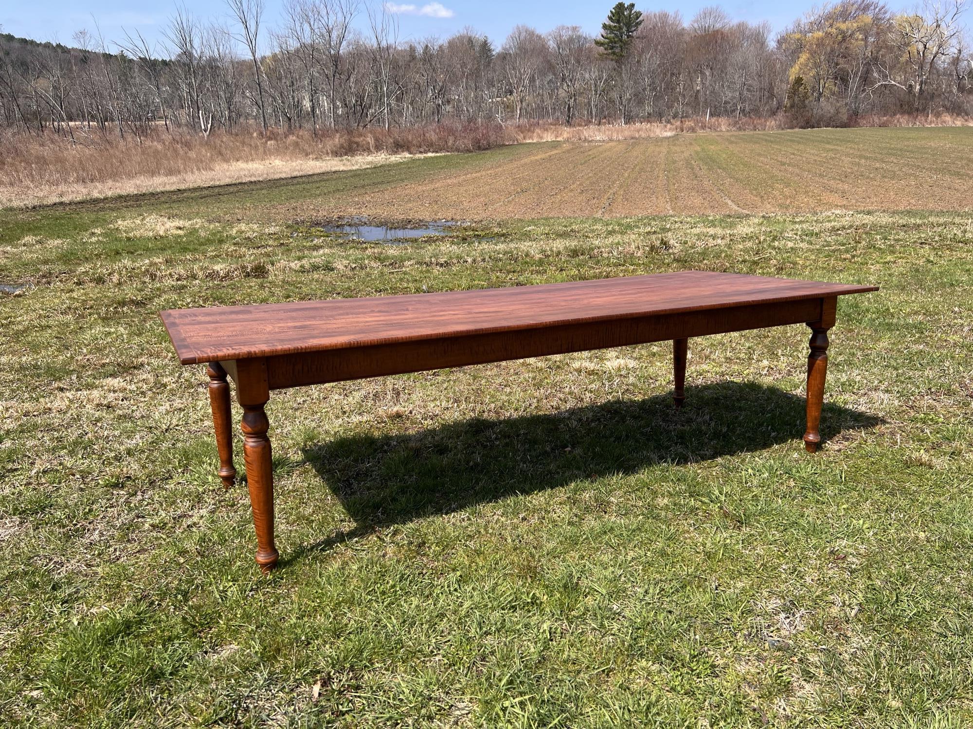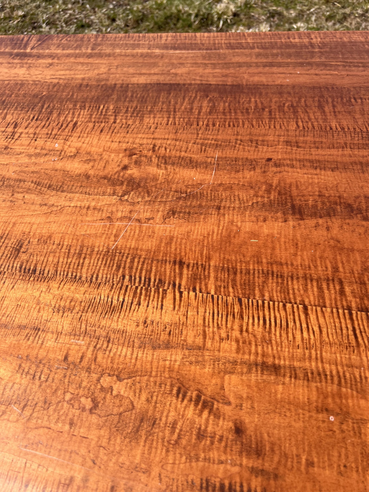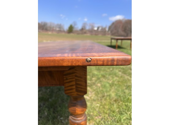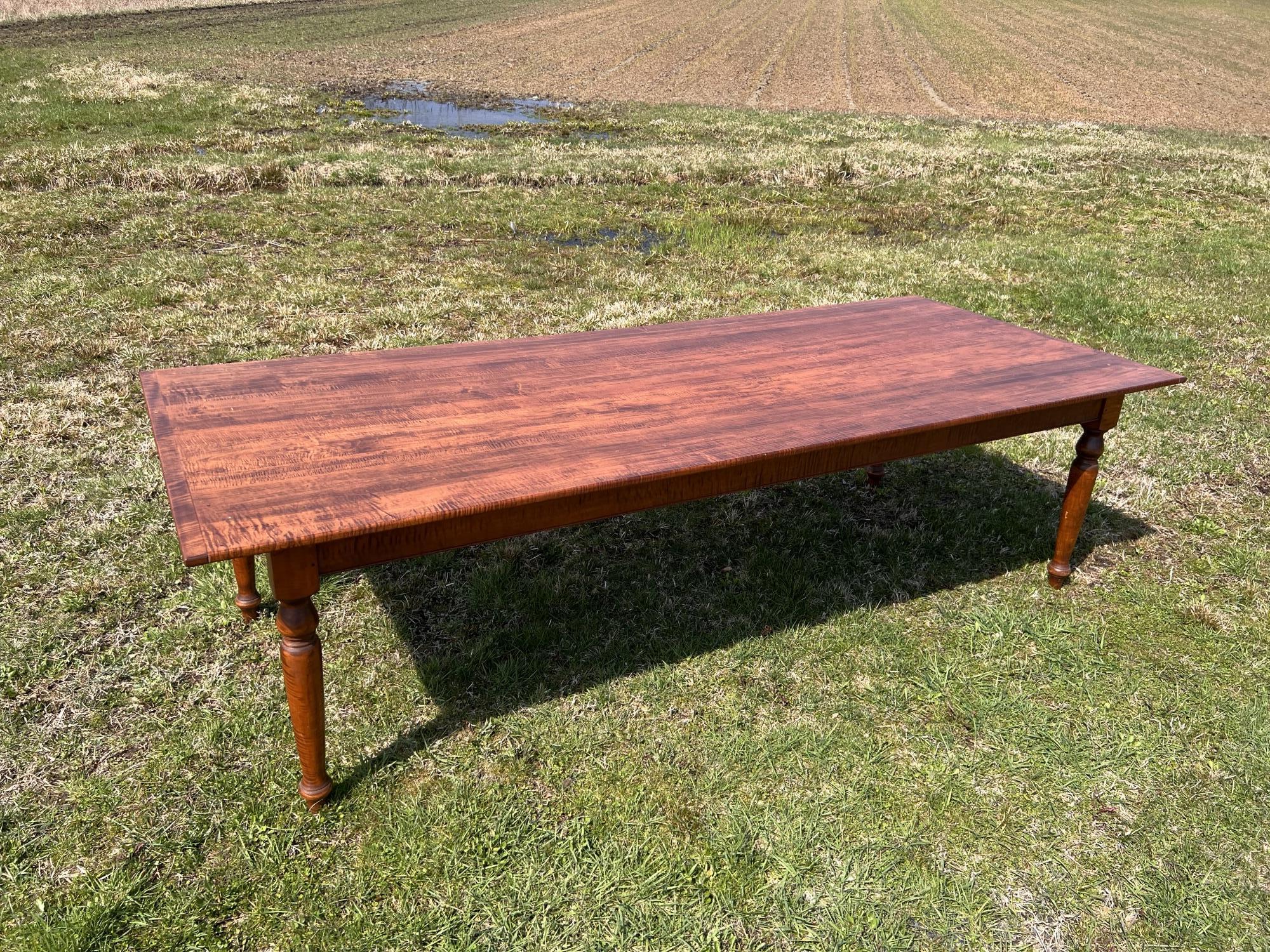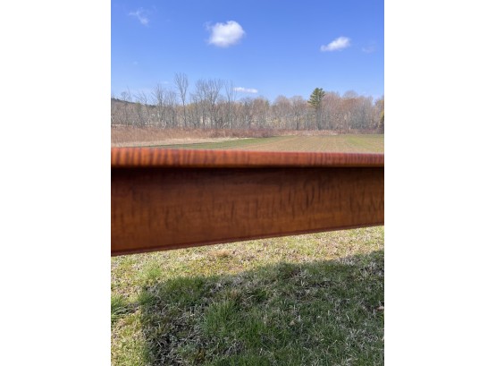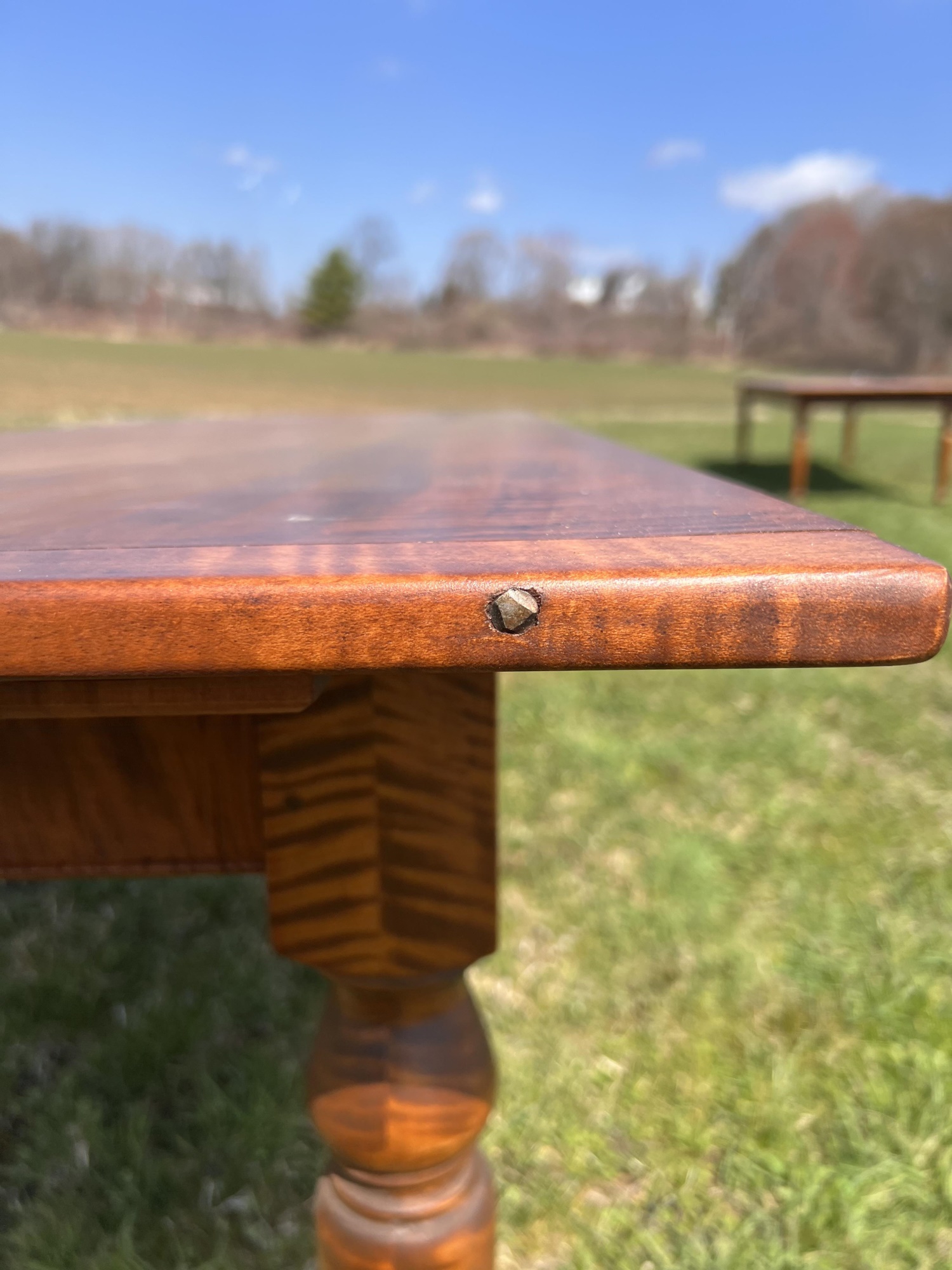 Large tiger maple table with breadboard ends. Warren Chair Works mark on underside. 29 1/2" x 108" x 44" Condition: Wear to surface from use. Leaves absent Temp No 6537