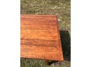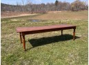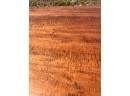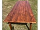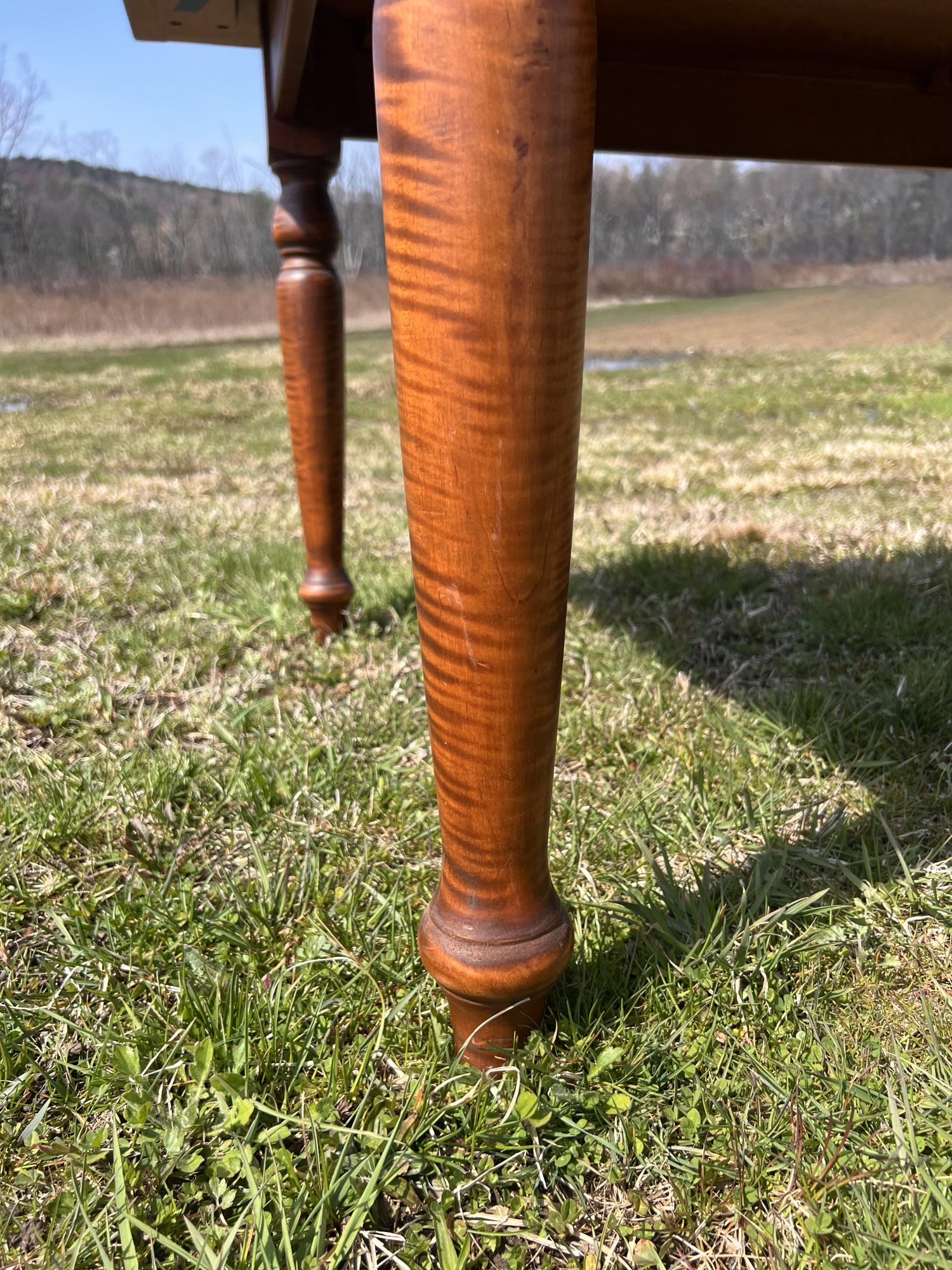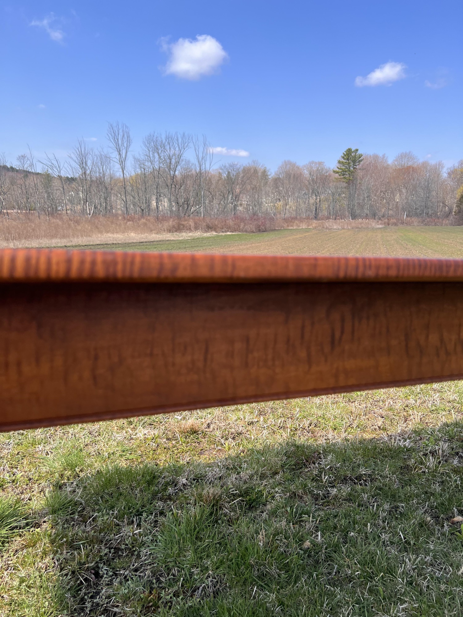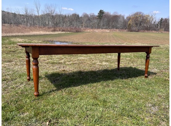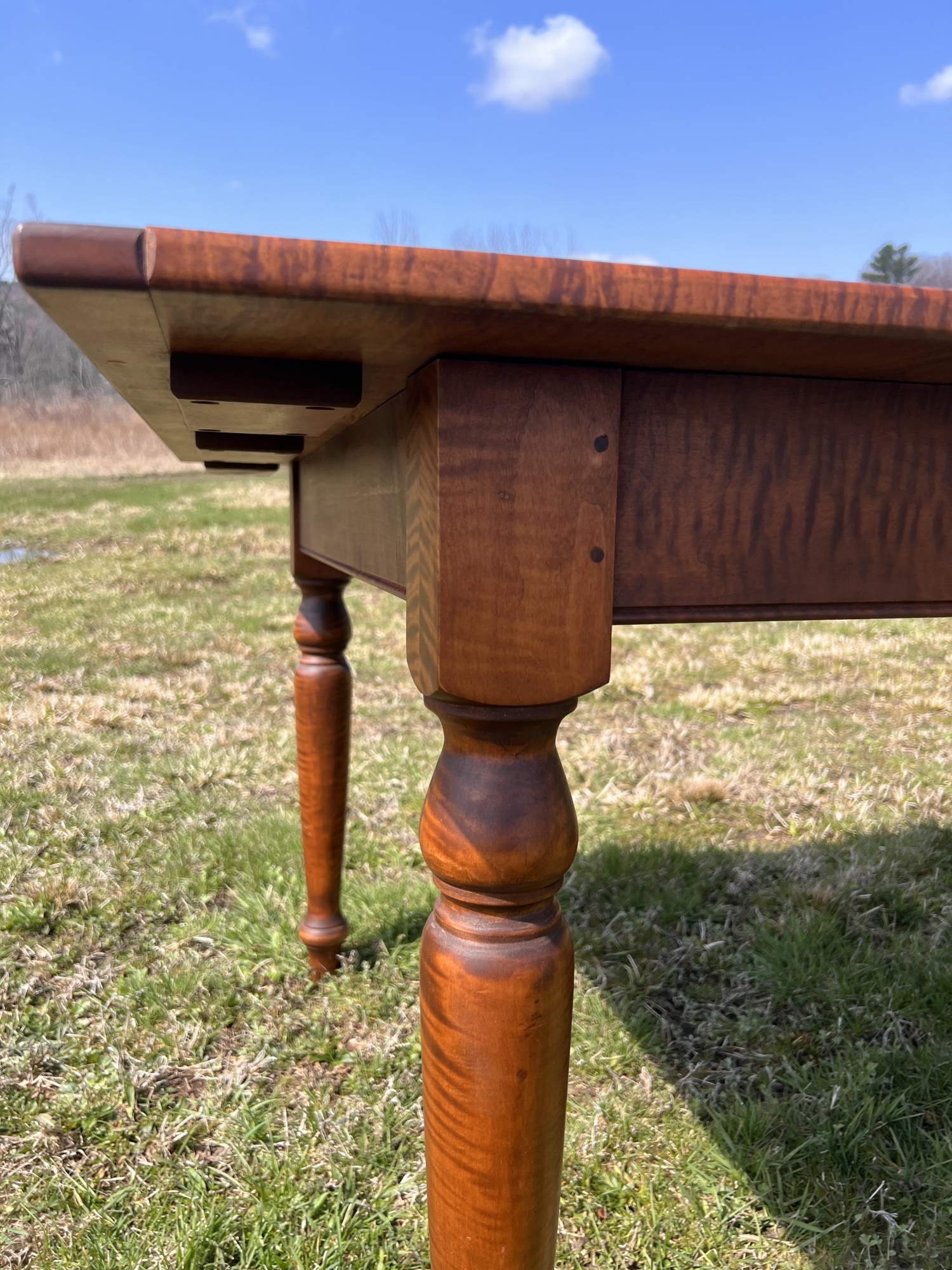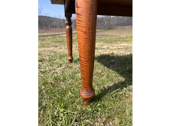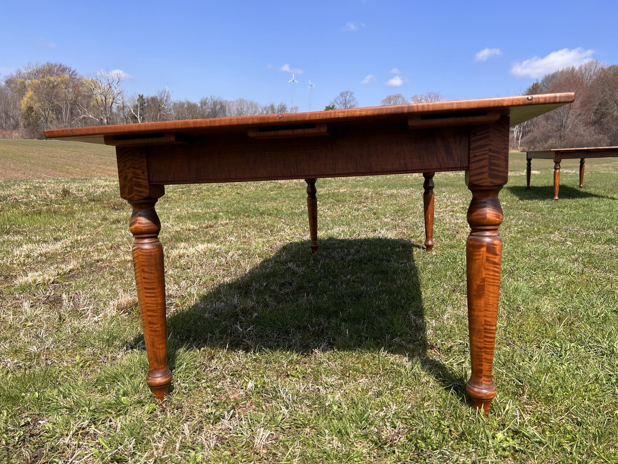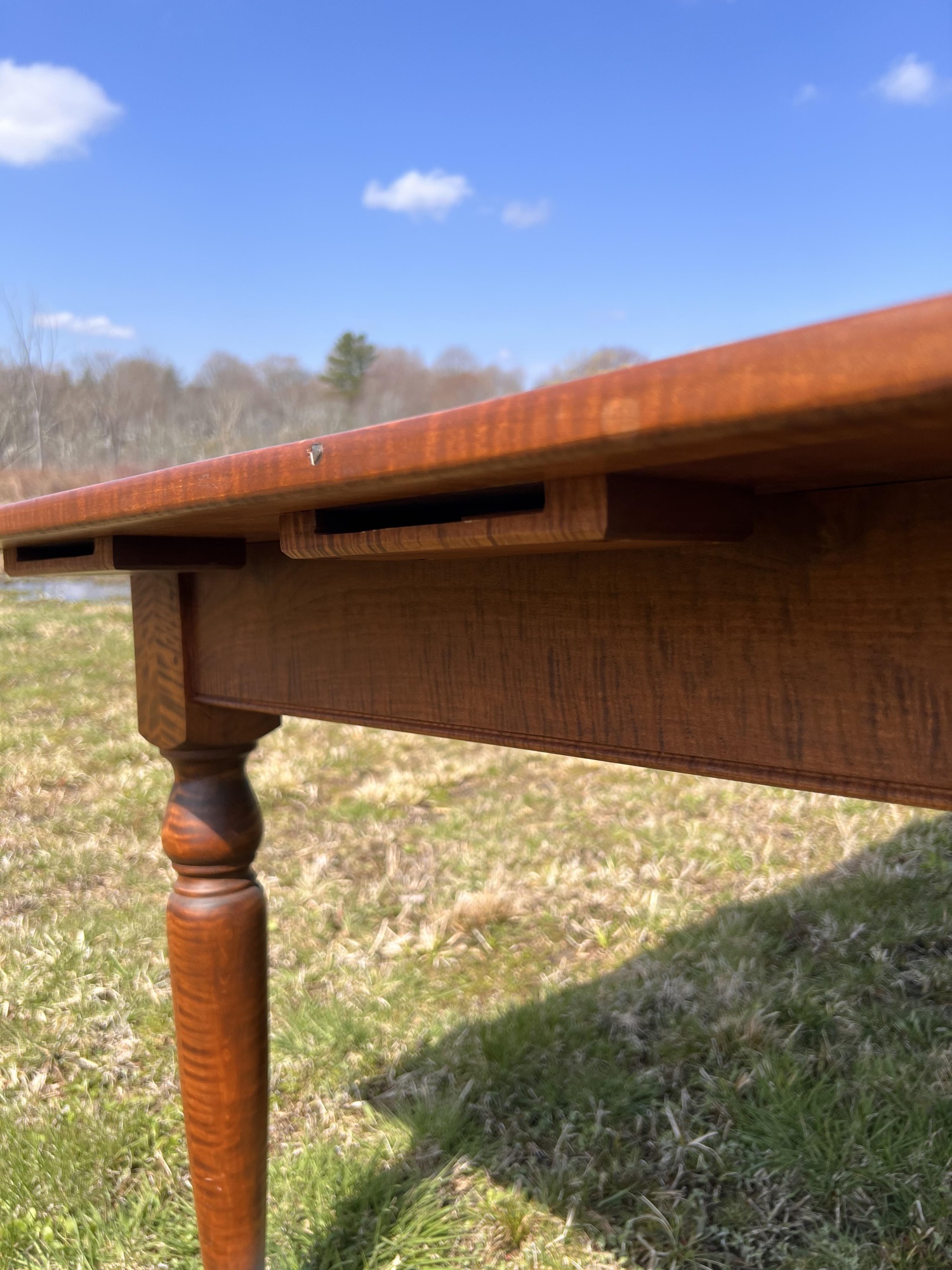 Large tiger maple table with breadboard ends. Warren Chair Works mark on underside. 29 1/2" x 108" x 44" Condition: Wear to surface from use. Leaves absent Temp No 6537