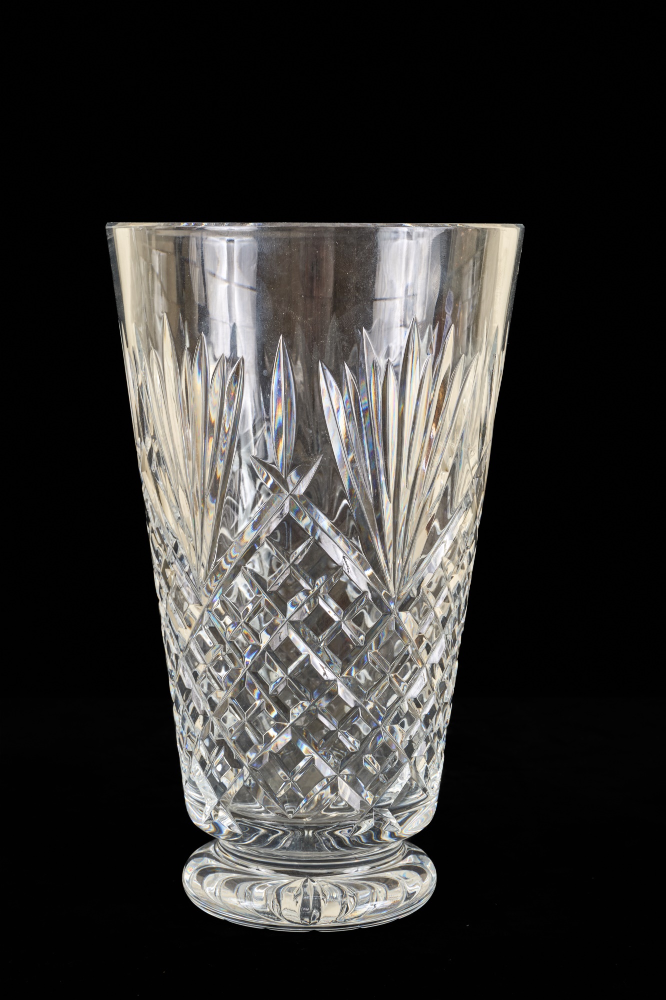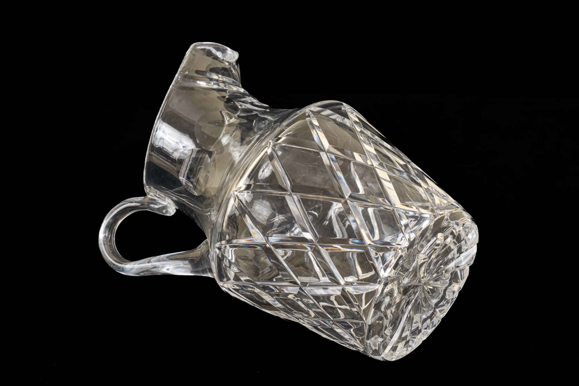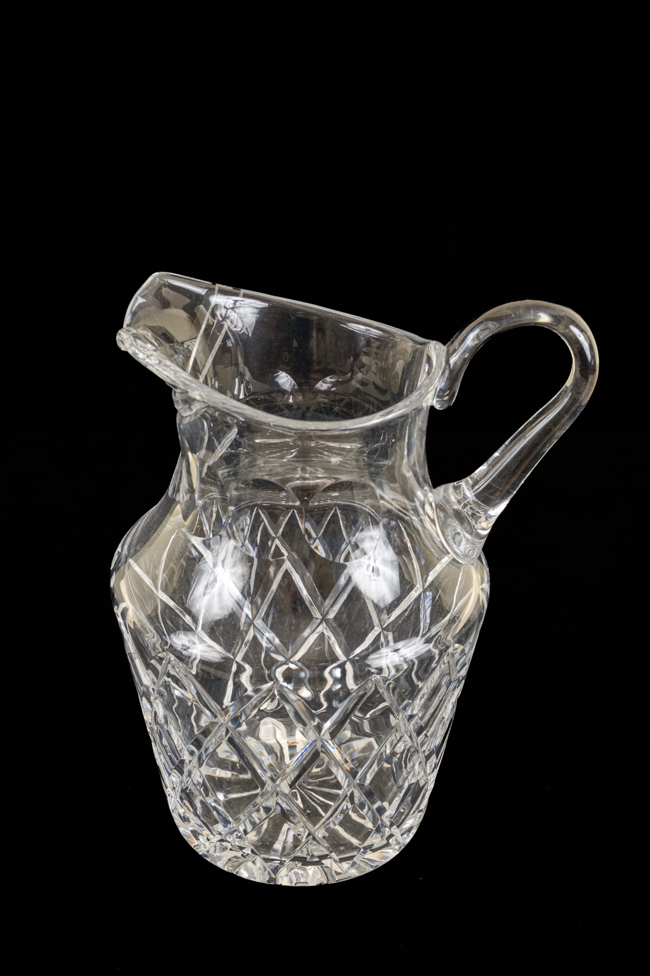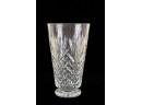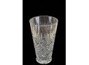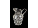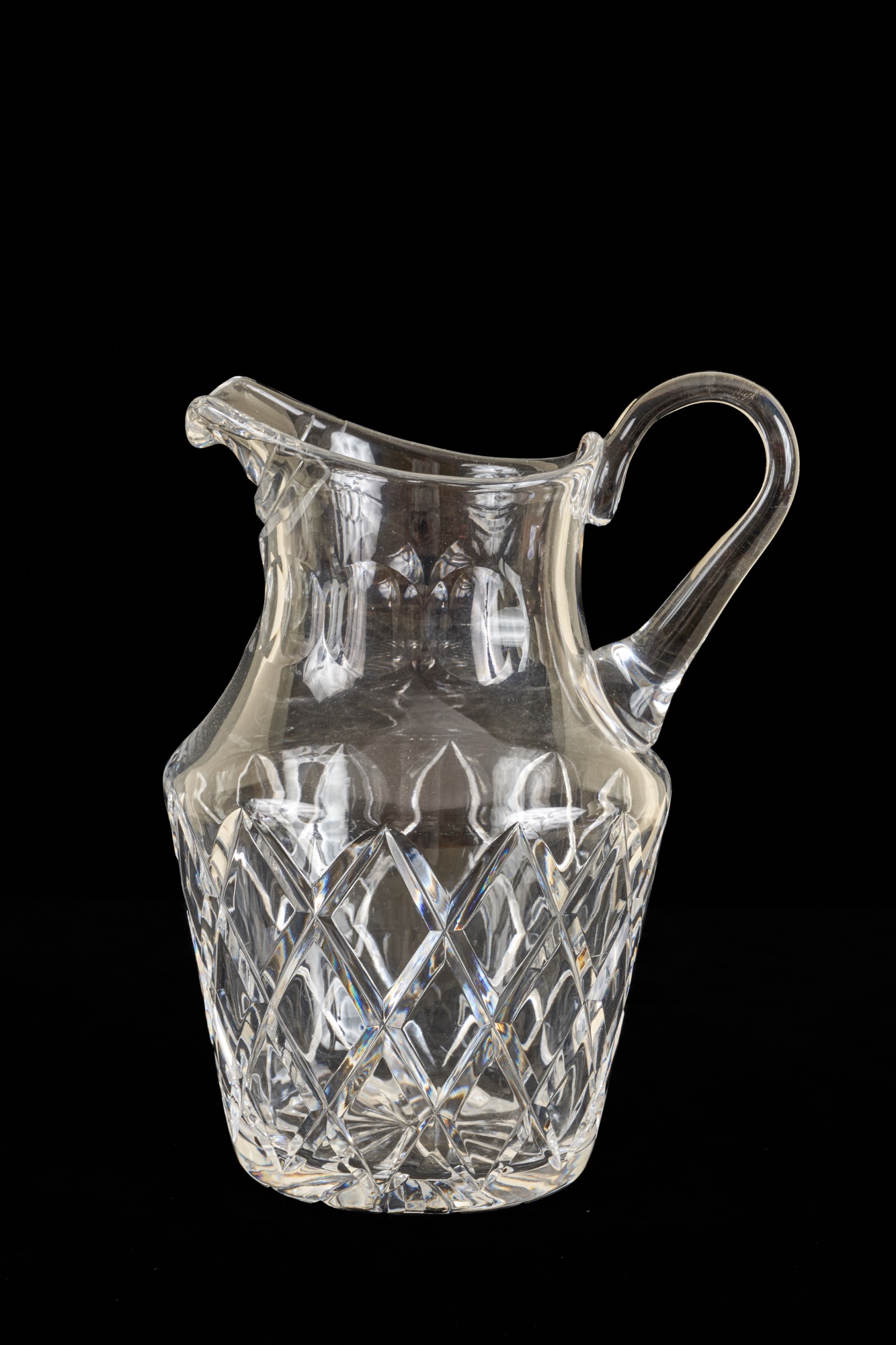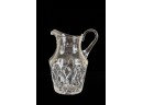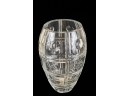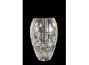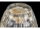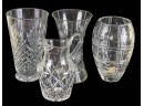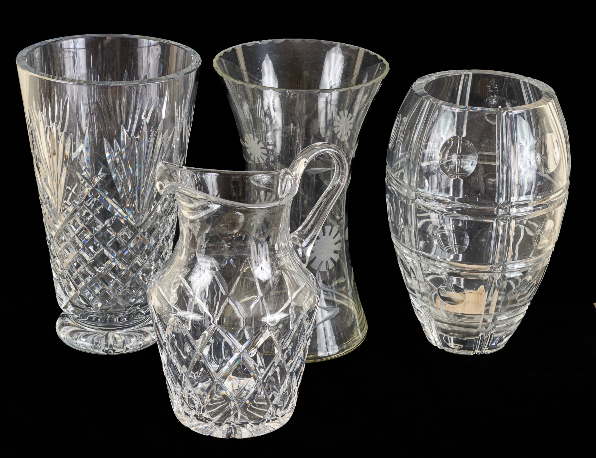 And a crystal pitcher and second vase (unmarked) 10, 9.25 and 8.75 inches. Together with a mid-century glass vase etched with stylized fish and suns. 10 inches