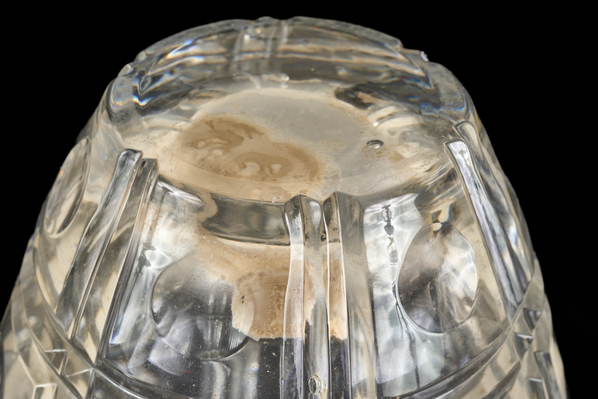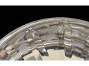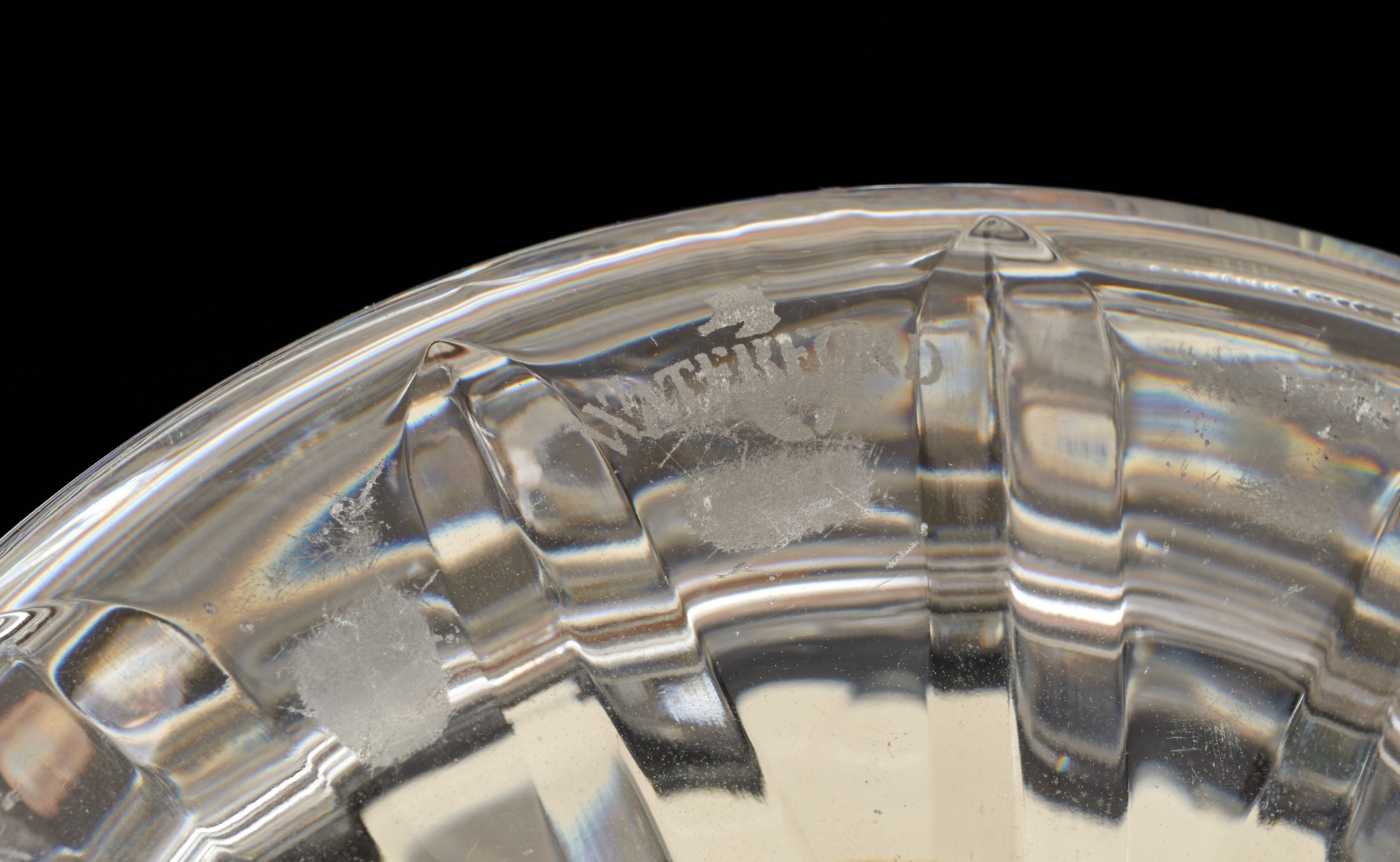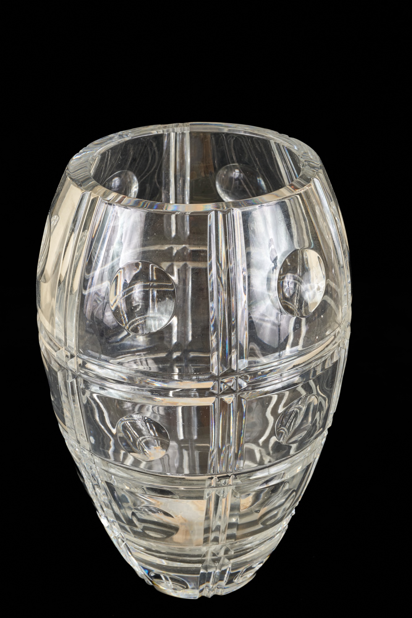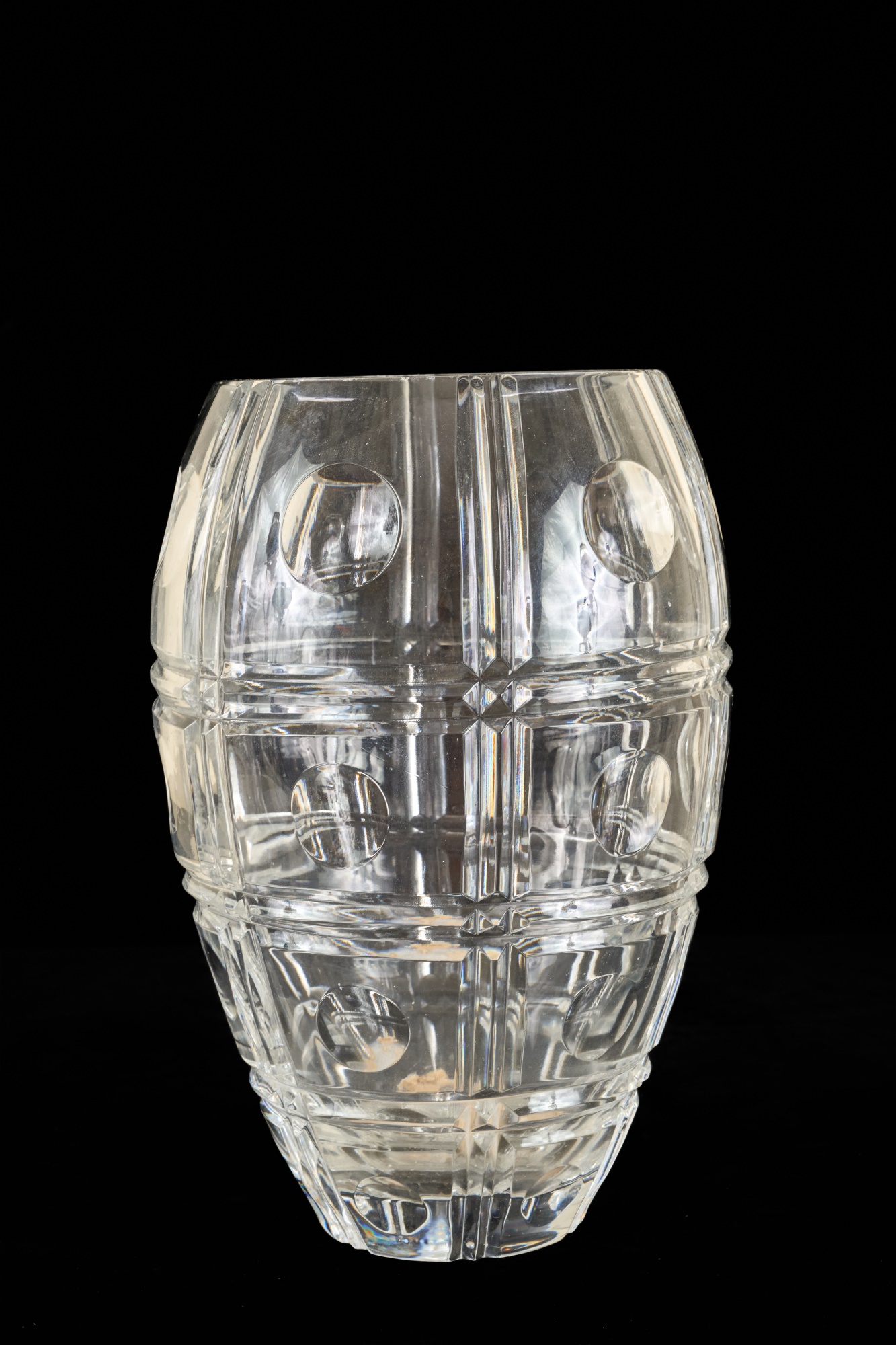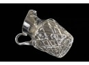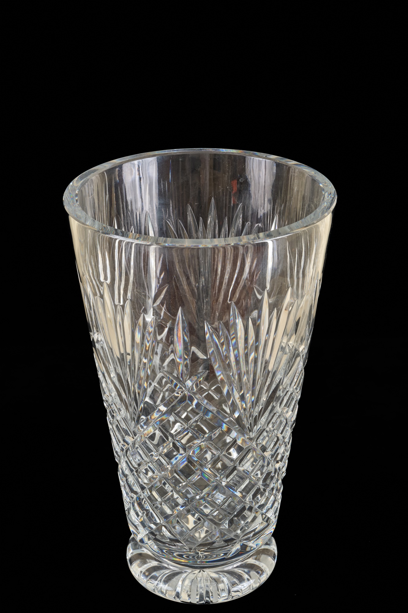 And a crystal pitcher and second vase (unmarked) 10, 9.25 and 8.75 inches. Together with a mid-century glass vase etched with stylized fish and suns. 10 inches